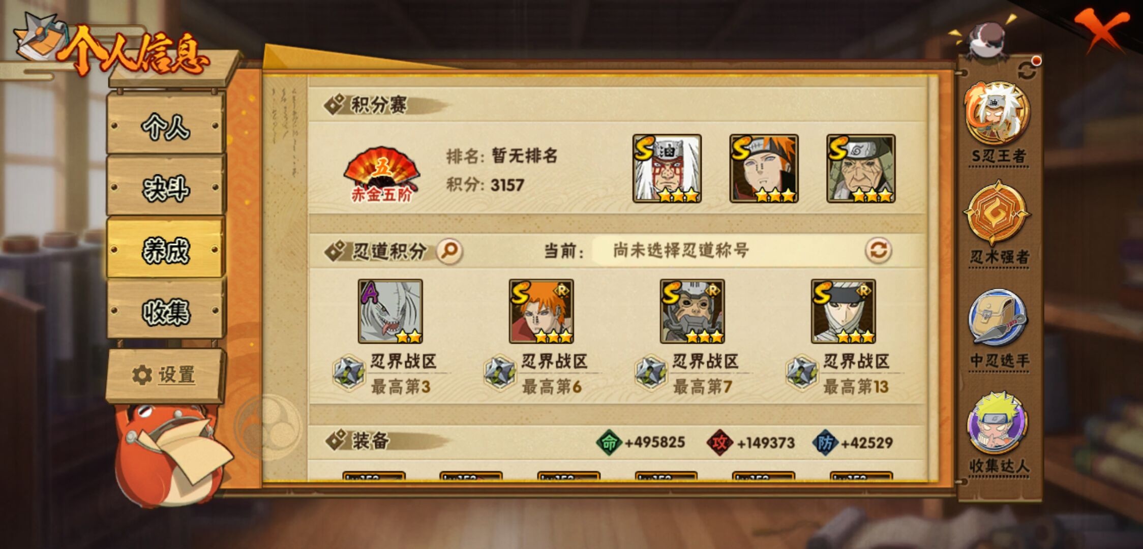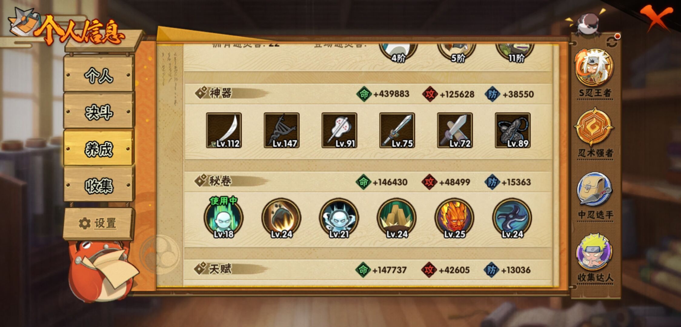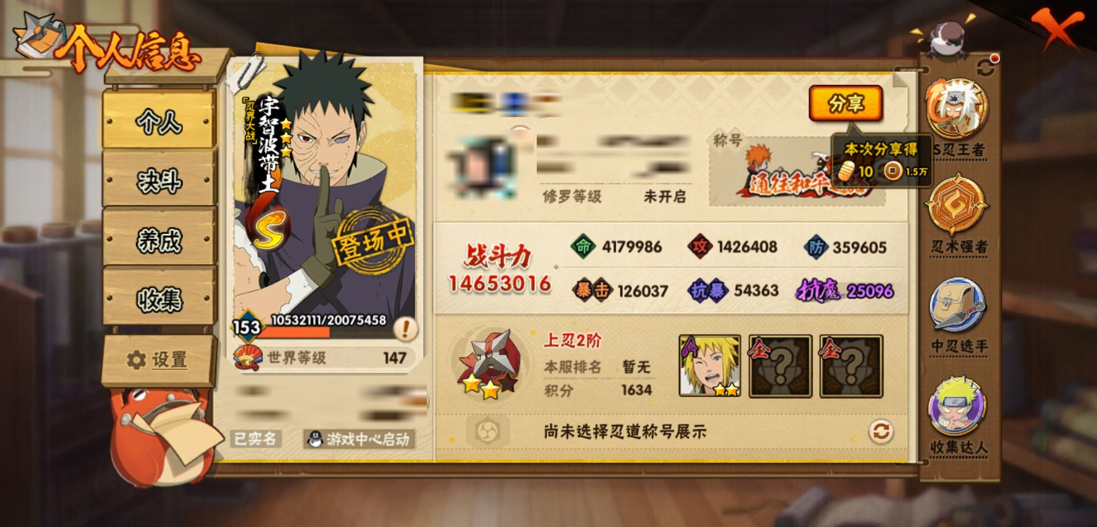 【火影忍者】【lyhy11066】战斗力:1465w;段位:上忍2阶;本服排名:299;vip:v13级;s忍:39个;a忍:52个;通灵兽:22个,s忍:秽土转生解宇智波斑|白面具宇智波斑|忍界大战宇智波带土|须佐能乎旗木卡卡西|秽土转生千手扉间|超佩恩天道|天道佩恩|秽土转生千手柱间|秽土转生宇智波鼬|永恒万花筒宇智波佐助|仙人模式自来也|忍界大战艾|舞之豪杰自来也|大蛇丸(普通) 4星|纲手(普通) 4星|百豪纲手|波风水门 4星|秽土转生波风水门|千手扉间(普通)|千手柱间(普通)|秽土转生宇智波斑|宇智波斑(普通)|须佐能乎宇智波鼬 4星|神秘面具男(普通)|秽土转生长门|秽土转生半藏|秽土转生金角银角|二代目土影无|二代目水影鬼灯幻月|三代目雷影艾|四代目雷影艾|仙人模式药师兜|死门迈特凯|忍界大战春野樱|九喇嘛连结漩涡鸣人|猿飞日斩(普通)|秽土转生猿飞日斩|自来也(普通)|暴怒第六尾漩涡鸣人__a忍:忍界大战李洛克|忍界大战日向宁次|四代目土影黑土|木叶上忍猿飞木叶丸|青年长门|秽土转生迪达拉|宇智波止水(普通)|忍界大战奇拉比|青年波风水门|青年艾|漂泊武士千手扉间|鲛肌融合干柿鬼鲛|忍界大战旗木卡卡西|漂泊武士桃地再不斩|近松十人卫千代|晓创生蝎|半蛇斗篷药师兜|须佐能乎宇智波佐助|九尾查克拉漩涡鸣人|暴怒宇智波带土|晓大蛇丸 3星|百豪春野樱|忍界大战秋道丁次|忍界大战我爱罗|新春限定波风水门|疾风传咒印宇智波佐助|新春限定宇智波鼬|奇拉比(普通)|万花筒写轮眼宇智波佐助|五代目水影照美冥|五代目雷影达鲁伊|绝|死司凭血飞段 3星|角都(普通)|地怨虞角都|疾风传我爱罗 4星|迪达拉(普通)|飞段(普通) 4星|小南(普通)|仙人模式漩涡鸣人 3星|万花筒写轮眼旗木卡卡西|迈特凯(普通) 5星|宇智波鼬(普通)|干柿鬼鲛(普通) 5星|蝎(普通) 5星|绯流琥蝎|猿飞阿斯玛(普通) 5星|桃式显现漩涡博人|六代目水影长十郎|不动|宇智波泉奈|羁绊神农__通灵兽:忍犬(普通)|蓝蛇|蛤蟆吉|忍龟|镰鼬|猿魔|蛞蝓(普通)|山椒鱼|蜃|蛤蟆仙人|鲛鲨|蛤蟆健|乌鸦(普通)|熊猫|蛤蟆龙|蛤蟆广|二尾又旅|砂之守鹤|梦貘|怒鬼无臂|鹰|蜘蛛