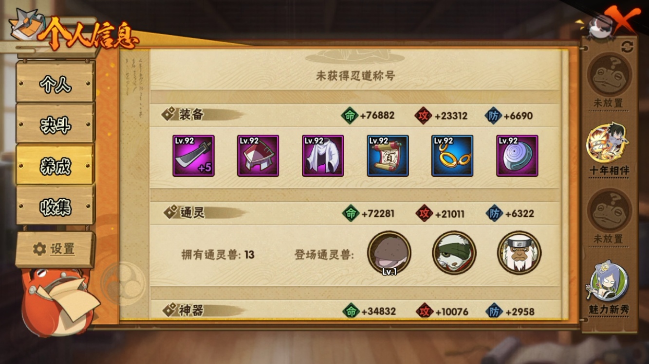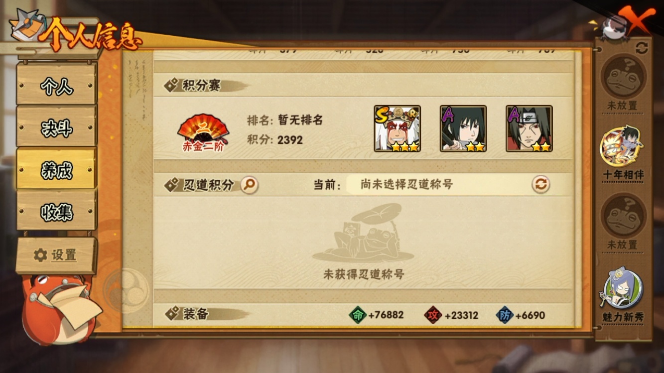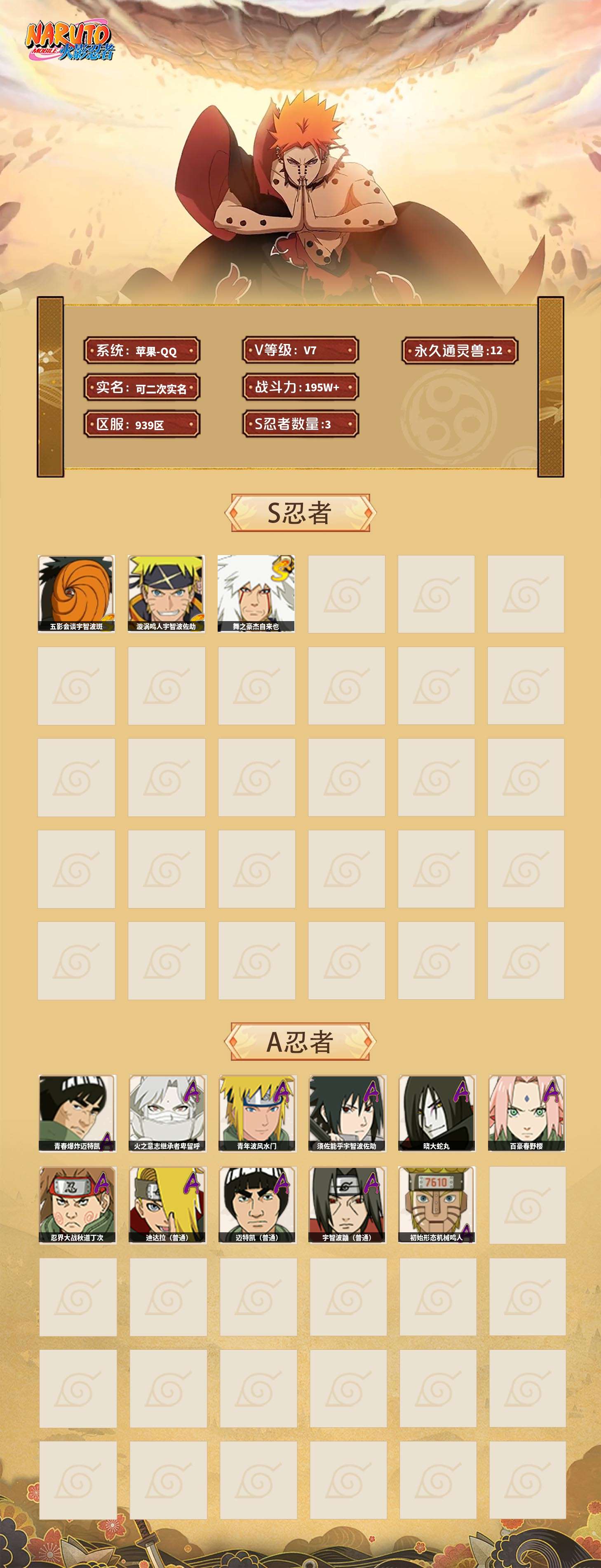 【火影忍者】【lyhy11073】战斗力:195w;段位:上忍1阶;本服排名:1060;vip:v7级;s忍:3个;a忍:11个;通灵兽:12个,s忍:五影会谈宇智波斑|漩涡鸣人宇智波佐助|舞之豪杰自来也__a忍:青春爆炸迈特凯|火之意志继承者卑留呼|青年波风水门|须佐能乎宇智波佐助|晓大蛇丸|百豪春野樱|忍界大战秋道丁次|迪达拉(普通)|迈特凯(普通)|宇智波鼬(普通)|初始形态机械鸣人__通灵兽:忍犬(普通)|蓝蛇|蛤蟆吉|砂之守鹤|忍龟|镰鼬|猿魔|山椒鱼|蜃|蛤蟆仙人|熊猫|鲛鲨