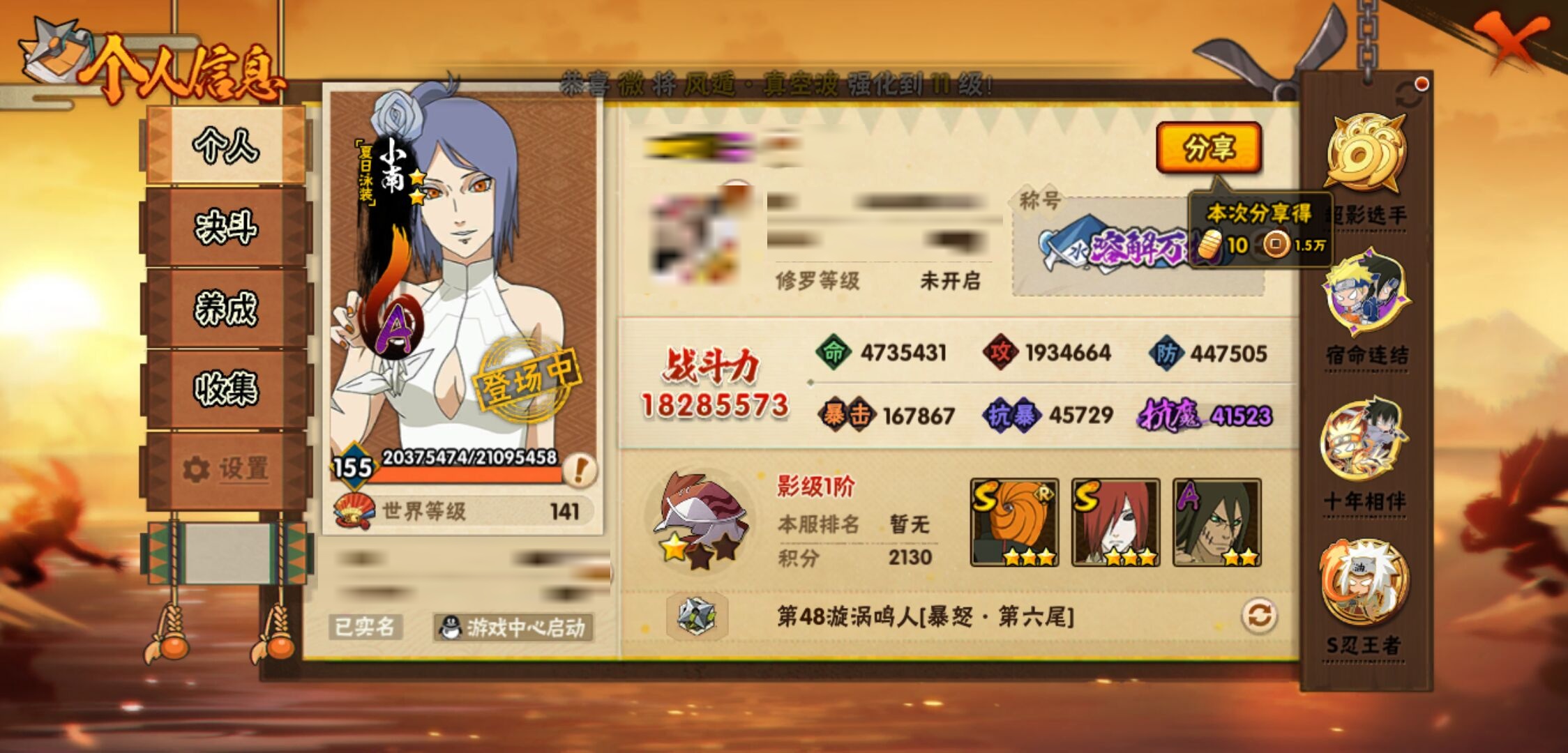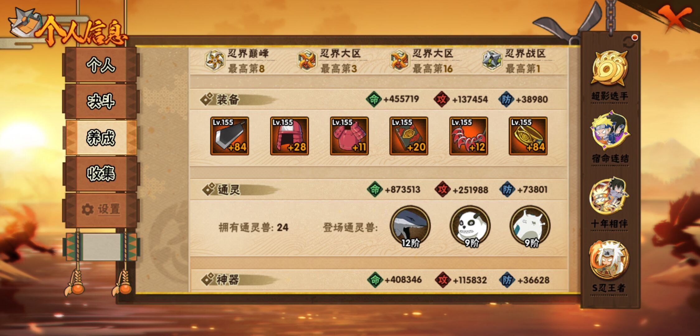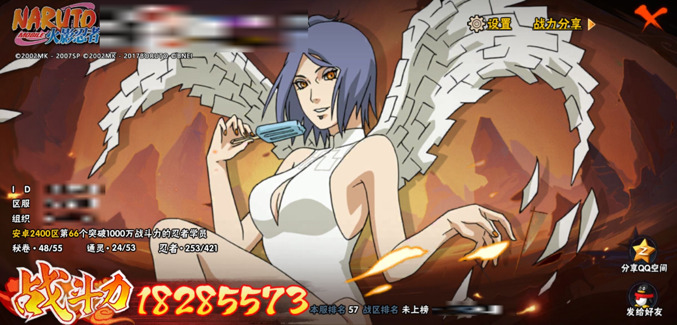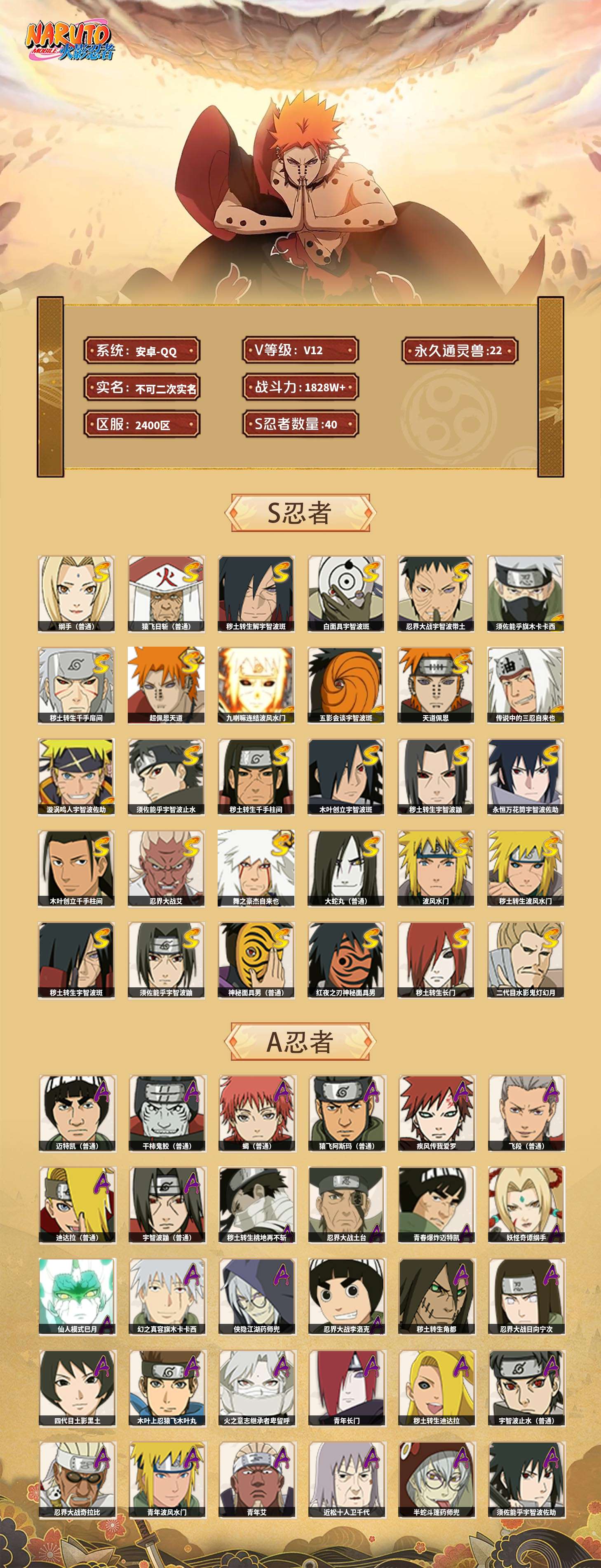 【火影忍者】【lyhy11083】战斗力:1828w;段位:影级1阶;本服排名:57;vip:v12级;s忍:40个;a忍:56个;通灵兽:22个,s忍:秽土转生解宇智波斑|白面具宇智波斑|忍界大战宇智波带土|须佐能乎旗木卡卡西|秽土转生千手扉间|超佩恩天道|九喇嘛连结波风水门|五影会谈宇智波斑|天道佩恩|传说中的三忍自来也|漩涡鸣人宇智波佐助|须佐能乎宇智波止水|秽土转生千手柱间|木叶创立宇智波斑|秽土转生宇智波鼬|永恒万花筒宇智波佐助|木叶创立千手柱间|忍界大战艾|舞之豪杰自来也|大蛇丸(普通)|纲手(普通) 5星|波风水门|秽土转生波风水门|秽土转生宇智波斑|须佐能乎宇智波鼬|神秘面具男(普通)|红夜之刃神秘面具男|秽土转生长门|二代目水影鬼灯幻月|四代目雷影艾|仙人模式药师兜|忍界大战大野木|忍界大战春野樱|九喇嘛连结漩涡鸣人|博人传大筒木金式|大筒木桃式|猿飞日斩(普通) 4星|秽土转生猿飞日斩|自来也(普通)|暴怒第六尾漩涡鸣人__a忍:青春爆炸迈特凯|妖怪奇谭纲手|仙人模式巳月|幻之真容旗木卡卡西|侠隐江湖药师兜|忍界大战李洛克|秽土转生角都|忍界大战日向宁次|四代目土影黑土|木叶上忍猿飞木叶丸|火之意志继承者卑留呼|青年长门|秽土转生迪达拉|宇智波止水(普通)|忍界大战奇拉比|青年波风水门|青年艾|近松十人卫千代|半蛇斗篷药师兜|须佐能乎宇智波佐助|九尾查克拉漩涡鸣人|恶灵之影飞段|暴怒宇智波带土|晓大蛇丸|百豪春野樱|忍界大战秋道丁次|忍界大战我爱罗|新春限定波风水门|夏日泳装小南|新春限定宇智波鼬|奇拉比(普通)|万花筒写轮眼宇智波佐助|五代目水影照美冥|五代目雷影达鲁伊|死司凭血飞段|疾风传我爱罗 4星|迪达拉(普通) 3星|飞段(普通) 4星|小南(普通)|漂泊浪客小南|仙人模式漩涡鸣人|迈特凯(普通) 5星|宇智波鼬(普通) 3星|夏日限定宇智波鼬|干柿鬼鲛(普通) 5星|秽土转生桃地再不斩 3星|蝎(普通) 5星|绯流琥蝎|猿飞阿斯玛(普通) 5星|桃式显现漩涡博人|六代目水影长十郎|不动|宇智波泉奈|羁绊神农|忍界大战土台 3星|初始形态机械鸣人__通灵兽:忍犬(普通)|蓝蛇|砂之守鹤|蛤蟆吉|忍龟|镰鼬|猿魔|山椒鱼|熊猫|蜃|蛤蟆仙人|鲛鲨|蛞蝓(普通)|蛤蟆健|乌鸦(普通)|蛤蟆龙|蛤蟆广|梦貘|怒鬼爪|鹰|蜘蛛|乌鸦夏日限定