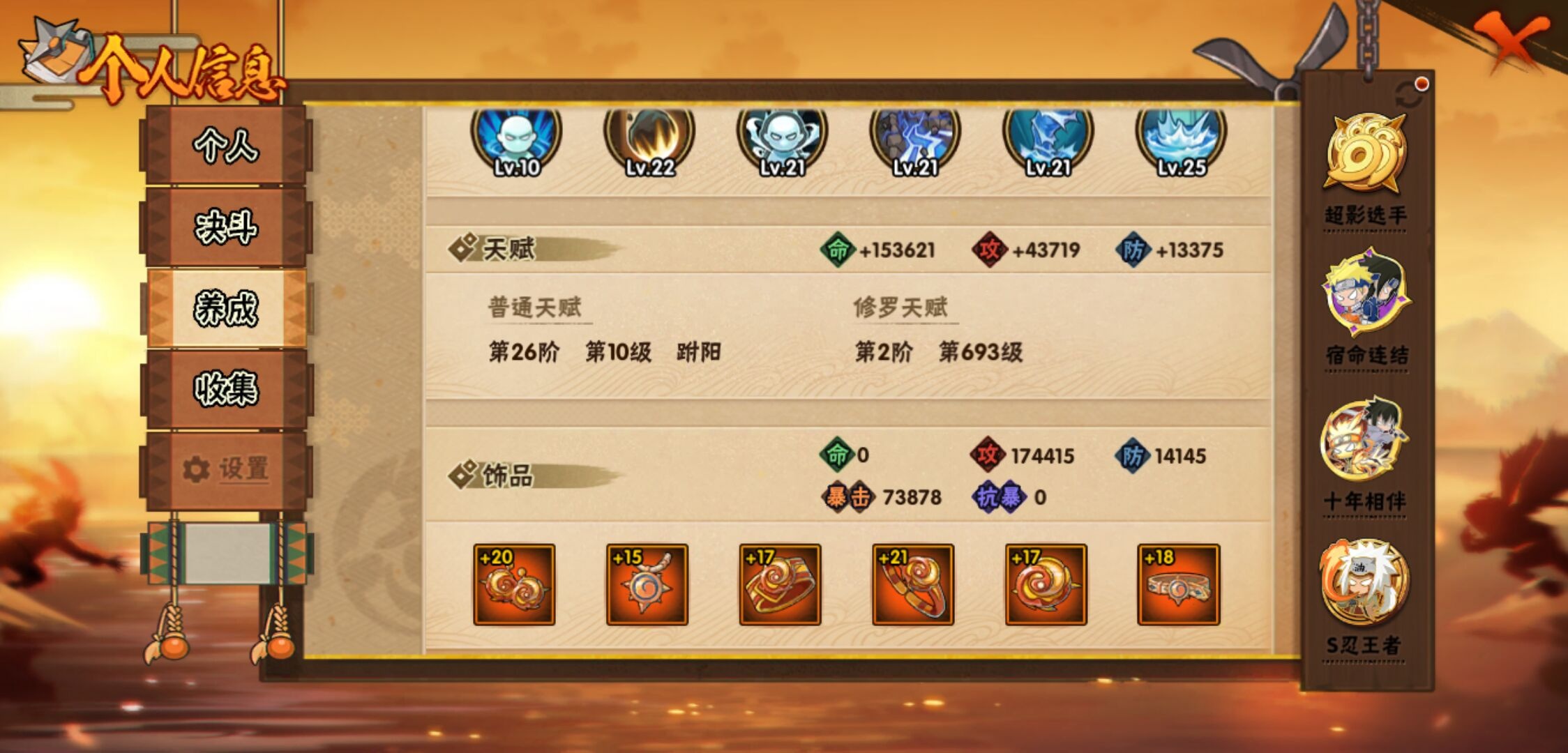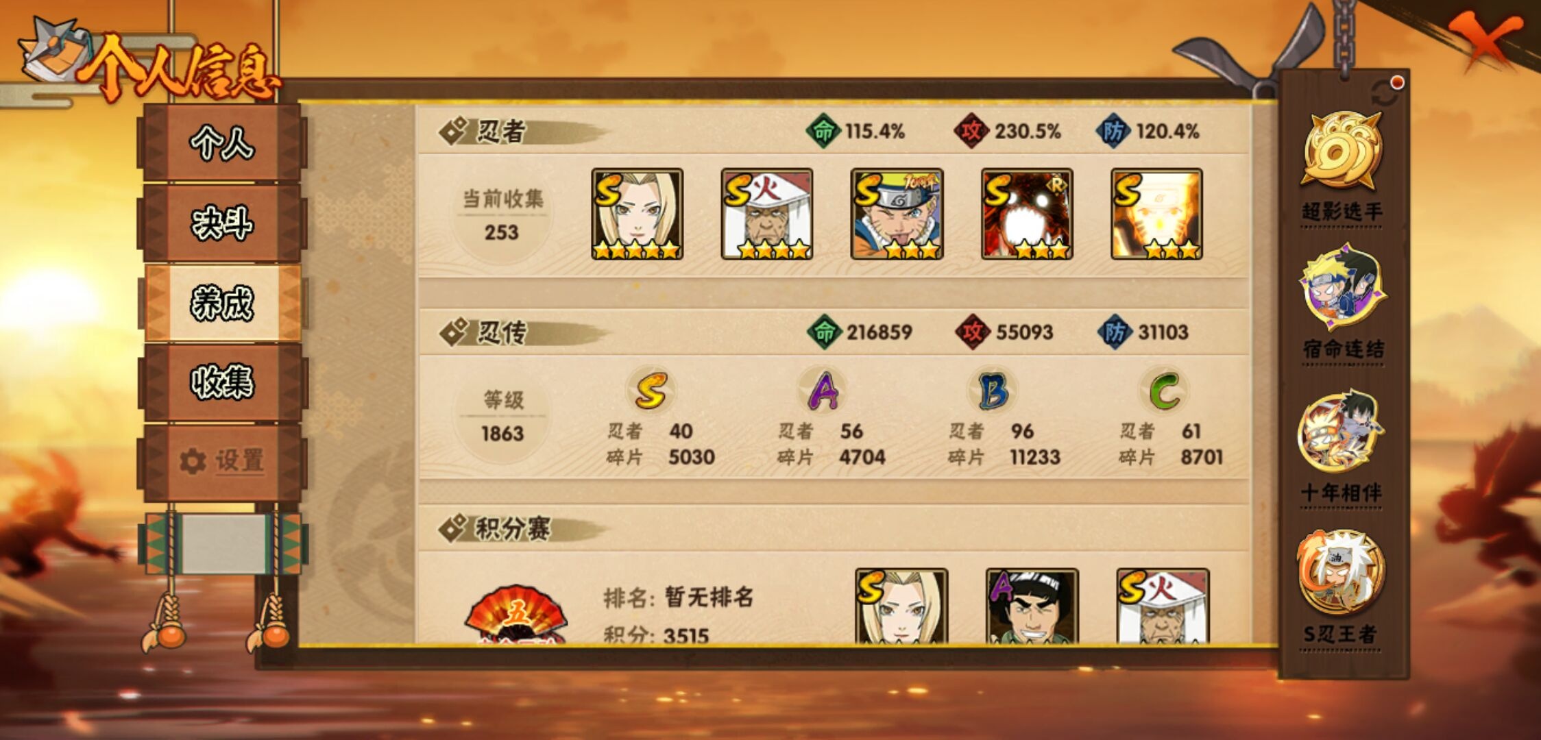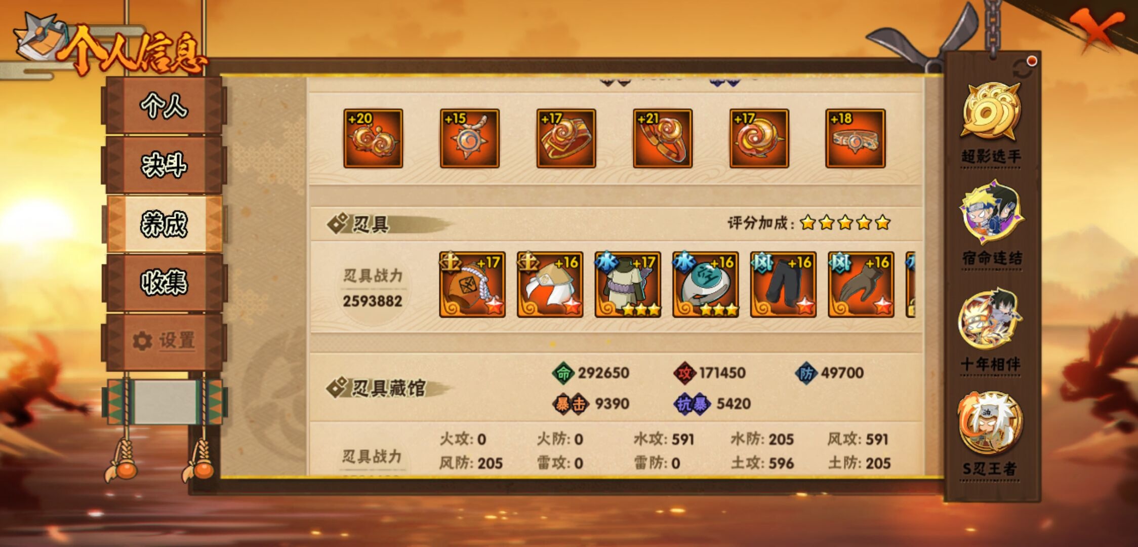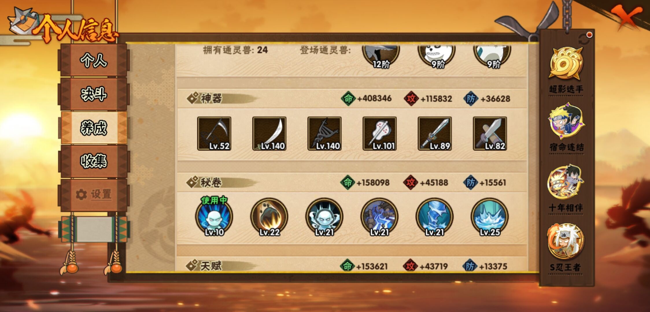 【火影忍者】【lyhy11083】战斗力:1828w;段位:影级1阶;本服排名:57;vip:v12级;s忍:40个;a忍:56个;通灵兽:22个,s忍:秽土转生解宇智波斑|白面具宇智波斑|忍界大战宇智波带土|须佐能乎旗木卡卡西|秽土转生千手扉间|超佩恩天道|九喇嘛连结波风水门|五影会谈宇智波斑|天道佩恩|传说中的三忍自来也|漩涡鸣人宇智波佐助|须佐能乎宇智波止水|秽土转生千手柱间|木叶创立宇智波斑|秽土转生宇智波鼬|永恒万花筒宇智波佐助|木叶创立千手柱间|忍界大战艾|舞之豪杰自来也|大蛇丸(普通)|纲手(普通) 5星|波风水门|秽土转生波风水门|秽土转生宇智波斑|须佐能乎宇智波鼬|神秘面具男(普通)|红夜之刃神秘面具男|秽土转生长门|二代目水影鬼灯幻月|四代目雷影艾|仙人模式药师兜|忍界大战大野木|忍界大战春野樱|九喇嘛连结漩涡鸣人|博人传大筒木金式|大筒木桃式|猿飞日斩(普通) 4星|秽土转生猿飞日斩|自来也(普通)|暴怒第六尾漩涡鸣人__a忍:青春爆炸迈特凯|妖怪奇谭纲手|仙人模式巳月|幻之真容旗木卡卡西|侠隐江湖药师兜|忍界大战李洛克|秽土转生角都|忍界大战日向宁次|四代目土影黑土|木叶上忍猿飞木叶丸|火之意志继承者卑留呼|青年长门|秽土转生迪达拉|宇智波止水(普通)|忍界大战奇拉比|青年波风水门|青年艾|近松十人卫千代|半蛇斗篷药师兜|须佐能乎宇智波佐助|九尾查克拉漩涡鸣人|恶灵之影飞段|暴怒宇智波带土|晓大蛇丸|百豪春野樱|忍界大战秋道丁次|忍界大战我爱罗|新春限定波风水门|夏日泳装小南|新春限定宇智波鼬|奇拉比(普通)|万花筒写轮眼宇智波佐助|五代目水影照美冥|五代目雷影达鲁伊|死司凭血飞段|疾风传我爱罗 4星|迪达拉(普通) 3星|飞段(普通) 4星|小南(普通)|漂泊浪客小南|仙人模式漩涡鸣人|迈特凯(普通) 5星|宇智波鼬(普通) 3星|夏日限定宇智波鼬|干柿鬼鲛(普通) 5星|秽土转生桃地再不斩 3星|蝎(普通) 5星|绯流琥蝎|猿飞阿斯玛(普通) 5星|桃式显现漩涡博人|六代目水影长十郎|不动|宇智波泉奈|羁绊神农|忍界大战土台 3星|初始形态机械鸣人__通灵兽:忍犬(普通)|蓝蛇|砂之守鹤|蛤蟆吉|忍龟|镰鼬|猿魔|山椒鱼|熊猫|蜃|蛤蟆仙人|鲛鲨|蛞蝓(普通)|蛤蟆健|乌鸦(普通)|蛤蟆龙|蛤蟆广|梦貘|怒鬼爪|鹰|蜘蛛|乌鸦夏日限定