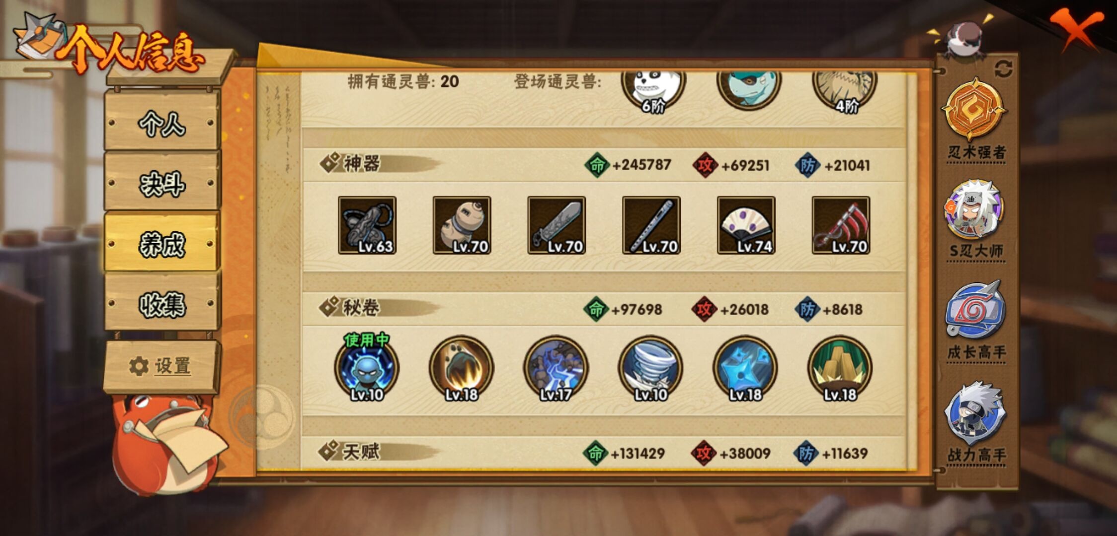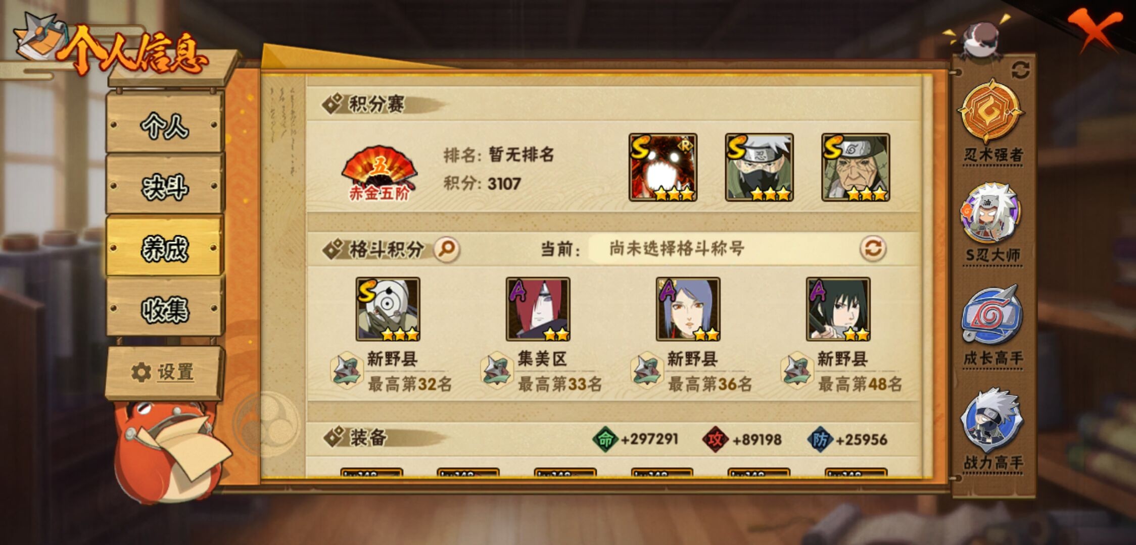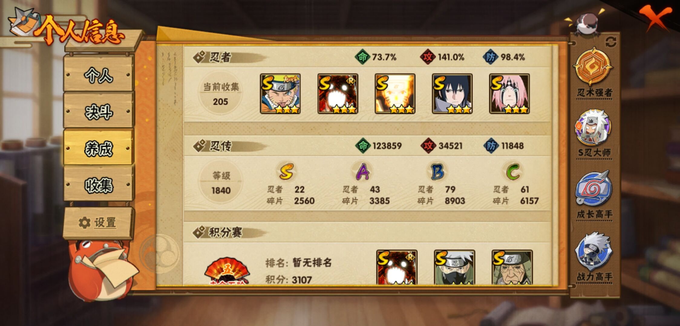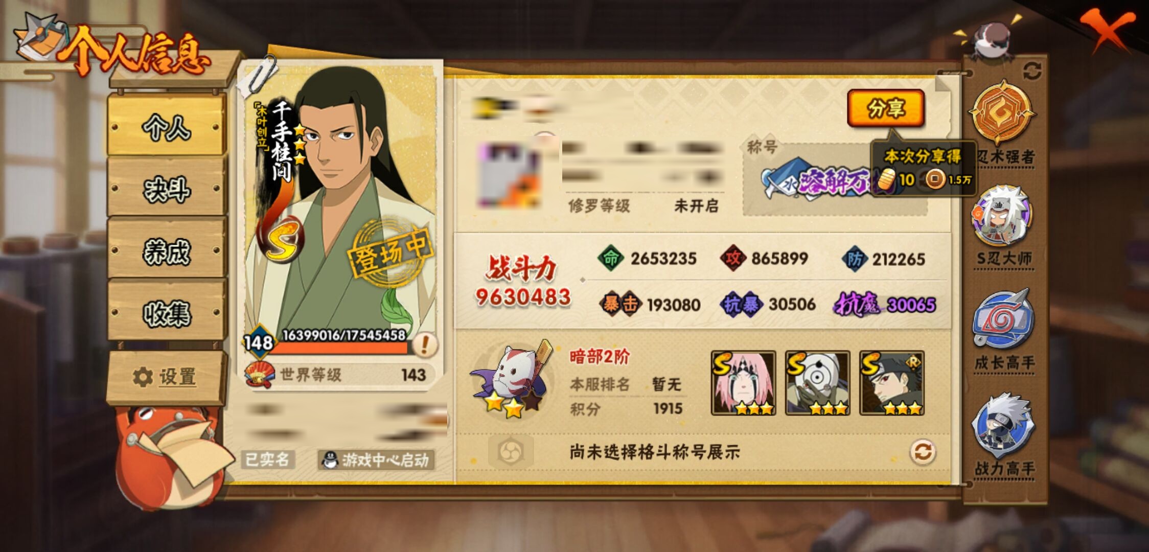 【火影忍者】【lyhy11092】战斗力:963w;段位:暗部2阶;本服排名:496;vip:v11级;s忍:22个;a忍:43个;通灵兽:18个,s忍:秽土转生解宇智波斑|白面具宇智波斑|须佐能乎旗木卡卡西|九喇嘛连结波风水门|五影会谈宇智波斑|天道佩恩|传说中的三忍自来也|漩涡鸣人宇智波佐助|须佐能乎宇智波止水|永恒万花筒宇智波佐助|最终章大筒木舍人|木叶创立千手柱间|忍界大战艾|舞之豪杰自来也|纲手(普通)|波风水门|须佐能乎宇智波鼬|忍界大战春野樱|九喇嘛连结漩涡鸣人|大筒木桃式|秽土转生猿飞日斩|暴怒第六尾漩涡鸣人__a忍:青春爆炸迈特凯|侠隐江湖宇智波佐助|幻之真容旗木卡卡西|忍界大战李洛克|秽土转生角都|忍界大战日向宁次|四代目土影黑土|青年长门|秽土转生迪达拉|新春限定宇智波止水|青年三船|青年波风水门|漂泊武士桃地再不斩|近松十人卫千代|夏日泳装照美冥|须佐能乎宇智波佐助|九尾查克拉漩涡鸣人|新春限定小南|晓大蛇丸|新春限定宇智波鼬|奇拉比(普通)|万花筒写轮眼宇智波佐助|死司凭血飞段|疾风传我爱罗 3星|迪达拉(普通)|飞段(普通) 3星|仙人模式漩涡鸣人|迈特凯(普通) 5星|宇智波鼬(普通)|干柿鬼鲛(普通) 5星|秽土转生桃地再不斩|绯流琥蝎|蝎(普通)|猿飞阿斯玛(普通) 5星|桃式显现漩涡博人|最终章日向雏田|六代目水影长十郎|不缘|不动|宇智波泉奈|羁绊神农|忍界大战土台|初始形态机械鸣人__通灵兽:忍犬(普通)|蓝蛇|蛤蟆吉|砂之守鹤|忍龟|镰鼬|猿魔|山椒鱼|熊猫|蜃|蛤蟆仙人|鲛鲨|蛤蟆健|乌鸦(普通)|蛞蝓(普通)|蛤蟆龙|蛤蟆广|乌鸦夏日限定