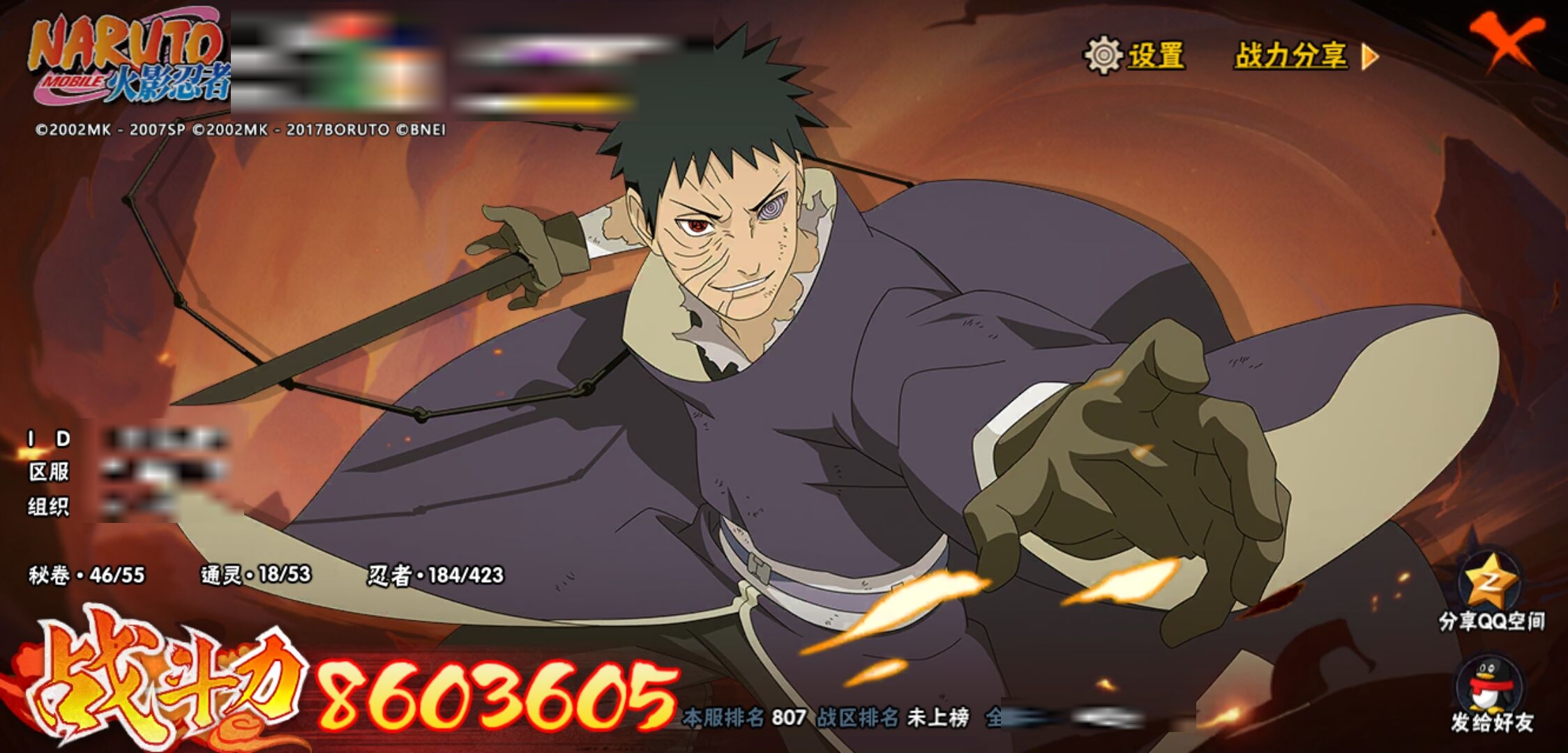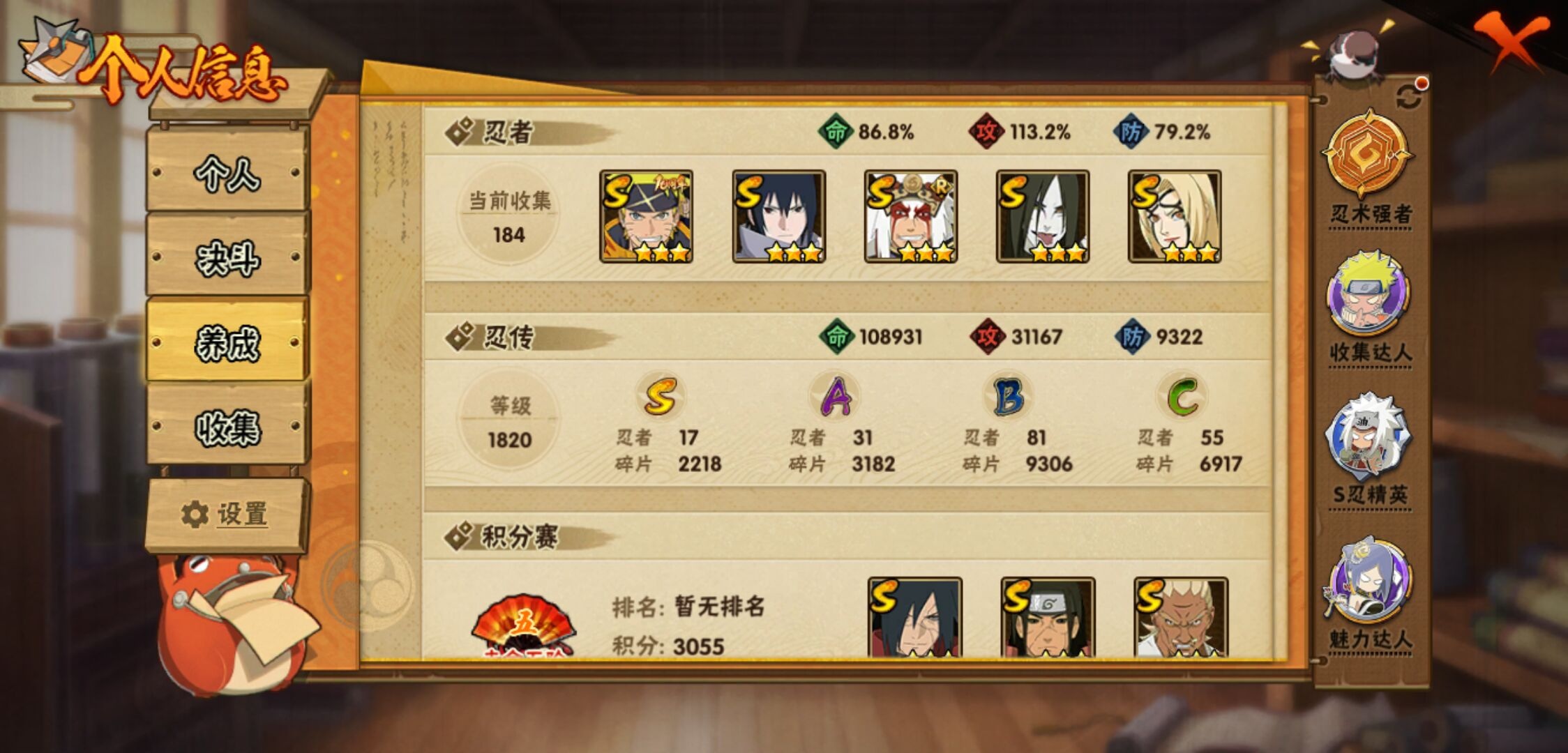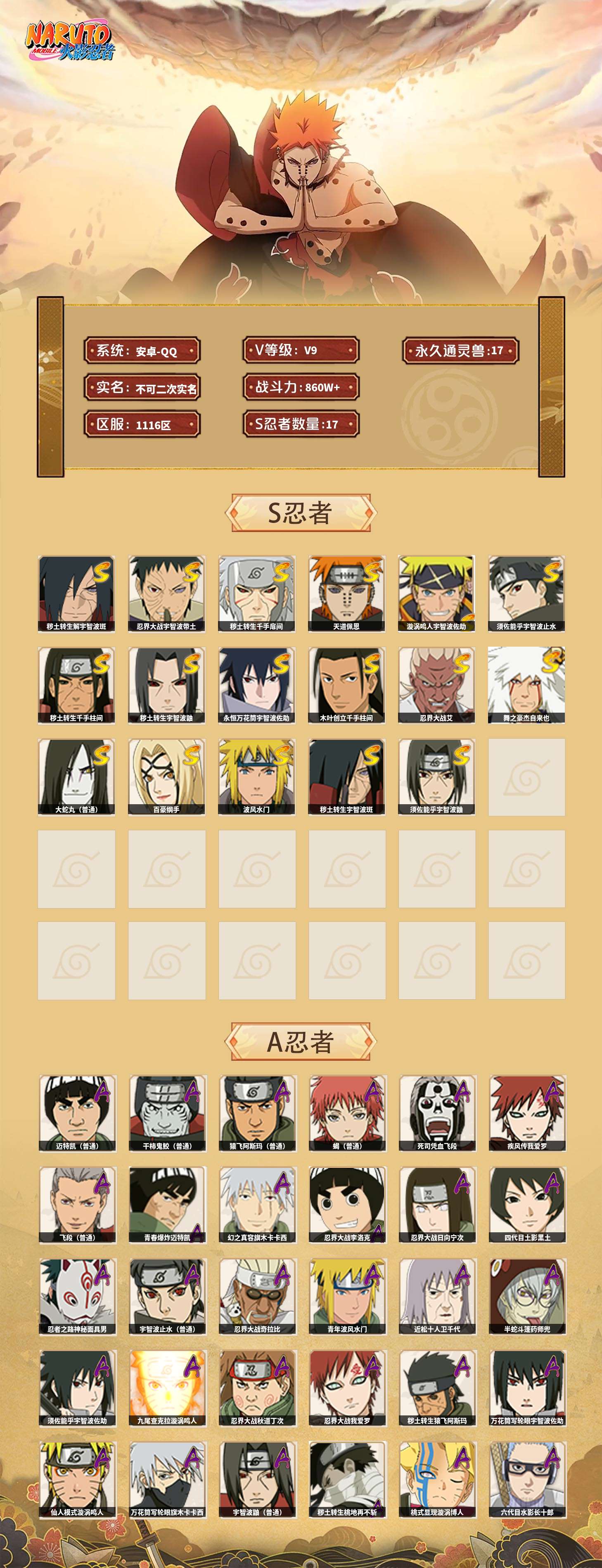 【火影忍者】【lyhy11105】战斗力:860w;段位:上忍3阶;本服排名:807;vip:v9级;s忍:17个;a忍:31个;通灵兽:17个,s忍:秽土转生解宇智波斑|忍界大战宇智波带土|秽土转生千手扉间|天道佩恩|漩涡鸣人宇智波佐助|须佐能乎宇智波止水|秽土转生千手柱间|秽土转生宇智波鼬|永恒万花筒宇智波佐助|木叶创立千手柱间|忍界大战艾|舞之豪杰自来也|大蛇丸(普通)|百豪纲手|波风水门|秽土转生宇智波斑|须佐能乎宇智波鼬__a忍:青春爆炸迈特凯|幻之真容旗木卡卡西|忍界大战李洛克|忍界大战日向宁次|四代目土影黑土|忍者之路神秘面具男|宇智波止水(普通)|忍界大战奇拉比|青年波风水门|近松十人卫千代|半蛇斗篷药师兜|须佐能乎宇智波佐助|九尾查克拉漩涡鸣人|忍界大战秋道丁次|忍界大战我爱罗|秽土转生猿飞阿斯玛|万花筒写轮眼宇智波佐助|死司凭血飞段 3星|疾风传我爱罗 3星|飞段(普通) 3星|仙人模式漩涡鸣人|万花筒写轮眼旗木卡卡西|迈特凯(普通) 5星|宇智波鼬(普通)|干柿鬼鲛(普通) 5星|秽土转生桃地再不斩|蝎(普通) 4星|猿飞阿斯玛(普通) 5星|桃式显现漩涡博人|六代目水影长十郎|宇智波泉奈__通灵兽:忍犬(普通)|蓝蛇|蛤蟆吉|忍龟|镰鼬|猿魔|山椒鱼|蜃|蛤蟆仙人|鲛鲨|蛤蟆健|乌鸦(普通)|砂之守鹤|蛤蟆龙|蛞蝓(普通)|蛤蟆广|梦貘