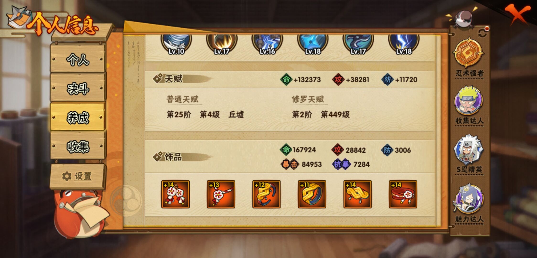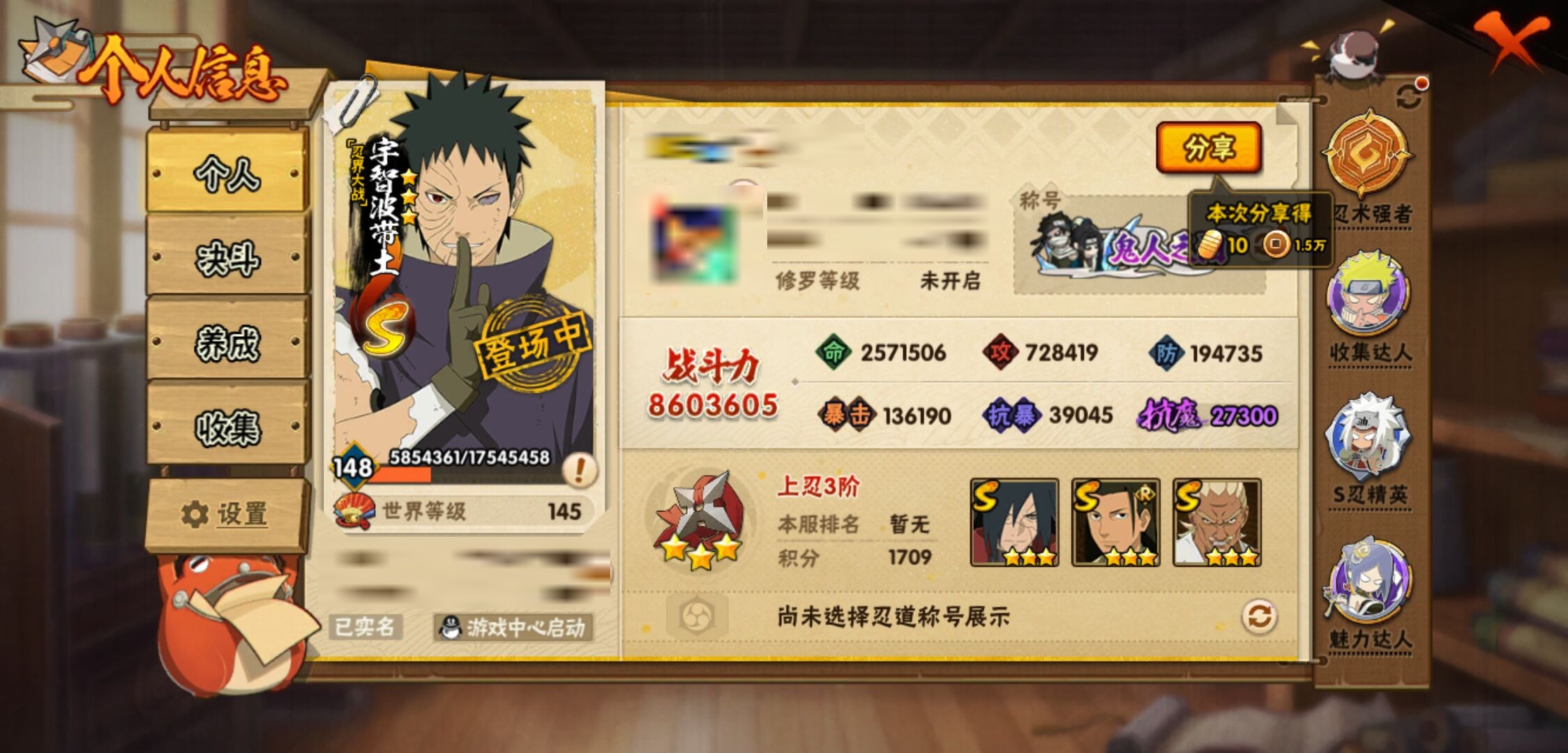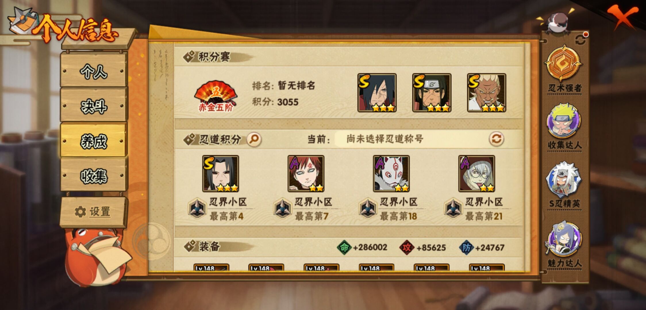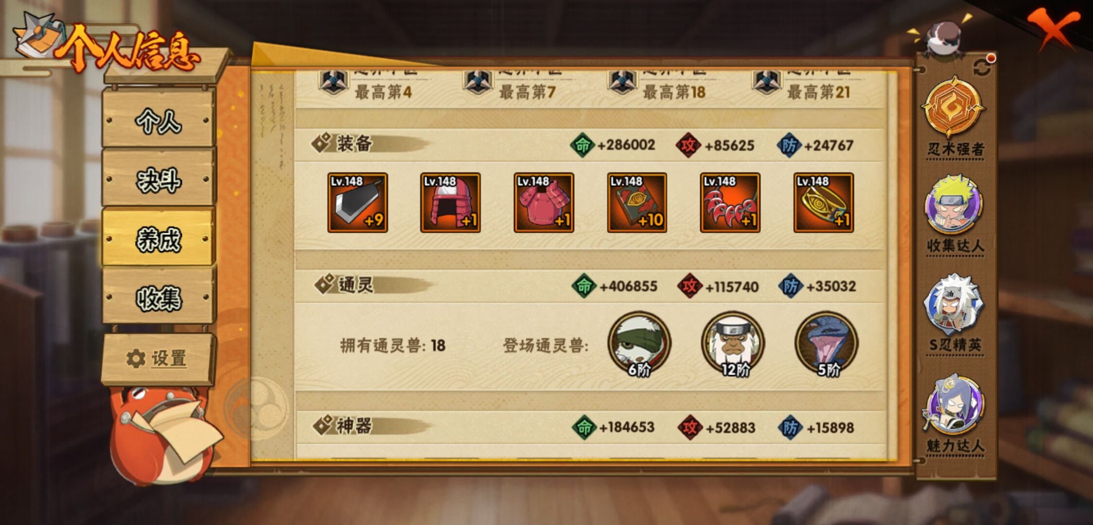 【火影忍者】【lyhy11105】战斗力:860w;段位:上忍3阶;本服排名:807;vip:v9级;s忍:17个;a忍:31个;通灵兽:17个,s忍:秽土转生解宇智波斑|忍界大战宇智波带土|秽土转生千手扉间|天道佩恩|漩涡鸣人宇智波佐助|须佐能乎宇智波止水|秽土转生千手柱间|秽土转生宇智波鼬|永恒万花筒宇智波佐助|木叶创立千手柱间|忍界大战艾|舞之豪杰自来也|大蛇丸(普通)|百豪纲手|波风水门|秽土转生宇智波斑|须佐能乎宇智波鼬__a忍:青春爆炸迈特凯|幻之真容旗木卡卡西|忍界大战李洛克|忍界大战日向宁次|四代目土影黑土|忍者之路神秘面具男|宇智波止水(普通)|忍界大战奇拉比|青年波风水门|近松十人卫千代|半蛇斗篷药师兜|须佐能乎宇智波佐助|九尾查克拉漩涡鸣人|忍界大战秋道丁次|忍界大战我爱罗|秽土转生猿飞阿斯玛|万花筒写轮眼宇智波佐助|死司凭血飞段 3星|疾风传我爱罗 3星|飞段(普通) 3星|仙人模式漩涡鸣人|万花筒写轮眼旗木卡卡西|迈特凯(普通) 5星|宇智波鼬(普通)|干柿鬼鲛(普通) 5星|秽土转生桃地再不斩|蝎(普通) 4星|猿飞阿斯玛(普通) 5星|桃式显现漩涡博人|六代目水影长十郎|宇智波泉奈__通灵兽:忍犬(普通)|蓝蛇|蛤蟆吉|忍龟|镰鼬|猿魔|山椒鱼|蜃|蛤蟆仙人|鲛鲨|蛤蟆健|乌鸦(普通)|砂之守鹤|蛤蟆龙|蛞蝓(普通)|蛤蟆广|梦貘