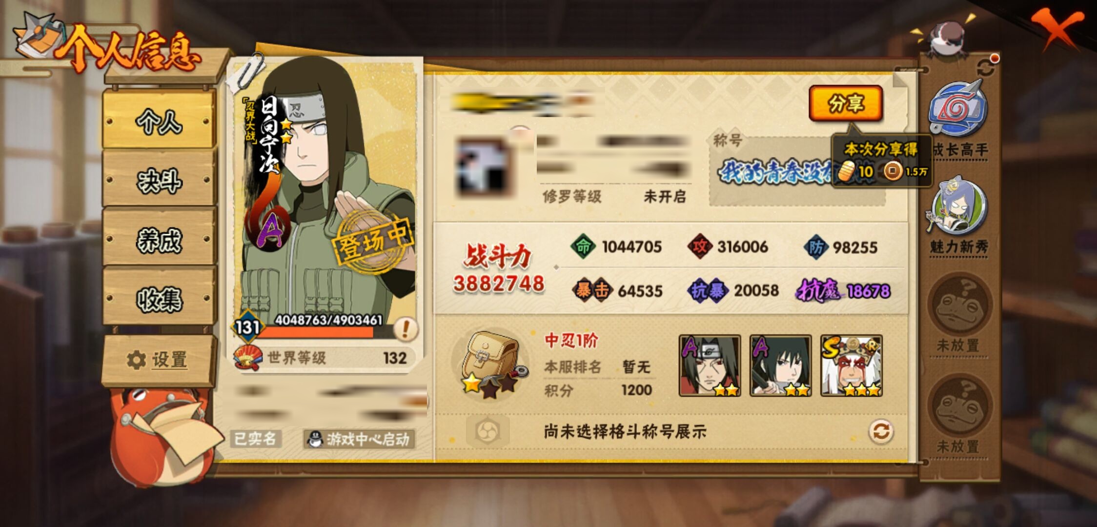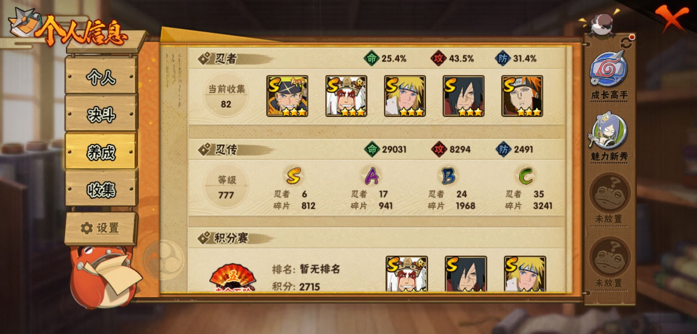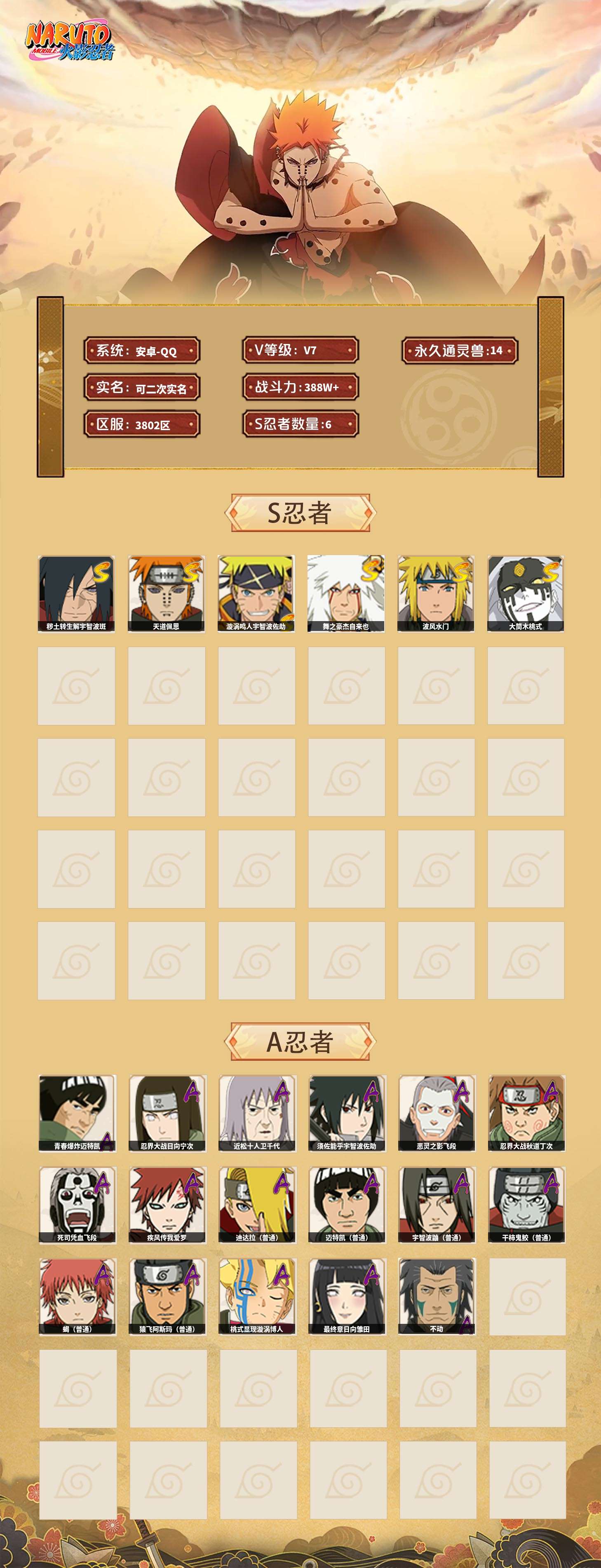 【火影忍者】【lyhy11117】战斗力:388w;段位:中忍1阶;本服排名:2373;vip:v7级;s忍:6个;a忍:17个;通灵兽:14个,s忍:秽土转生解宇智波斑|天道佩恩|漩涡鸣人宇智波佐助|舞之豪杰自来也|波风水门|大筒木桃式__a忍:青春爆炸迈特凯|忍界大战日向宁次|近松十人卫千代|须佐能乎宇智波佐助|恶灵之影飞段|忍界大战秋道丁次|死司凭血飞段|疾风传我爱罗|迪达拉(普通)|迈特凯(普通)|宇智波鼬(普通)|干柿鬼鲛(普通)|蝎(普通)|猿飞阿斯玛(普通)|桃式显现漩涡博人|最终章日向雏田|不动__通灵兽:忍犬(普通)|蓝蛇|蛤蟆吉|忍龟|镰鼬|猿魔|山椒鱼|砂之守鹤|蜃|蛤蟆仙人|鲛鲨|辛牙|蛤蟆健|乌鸦(普通)