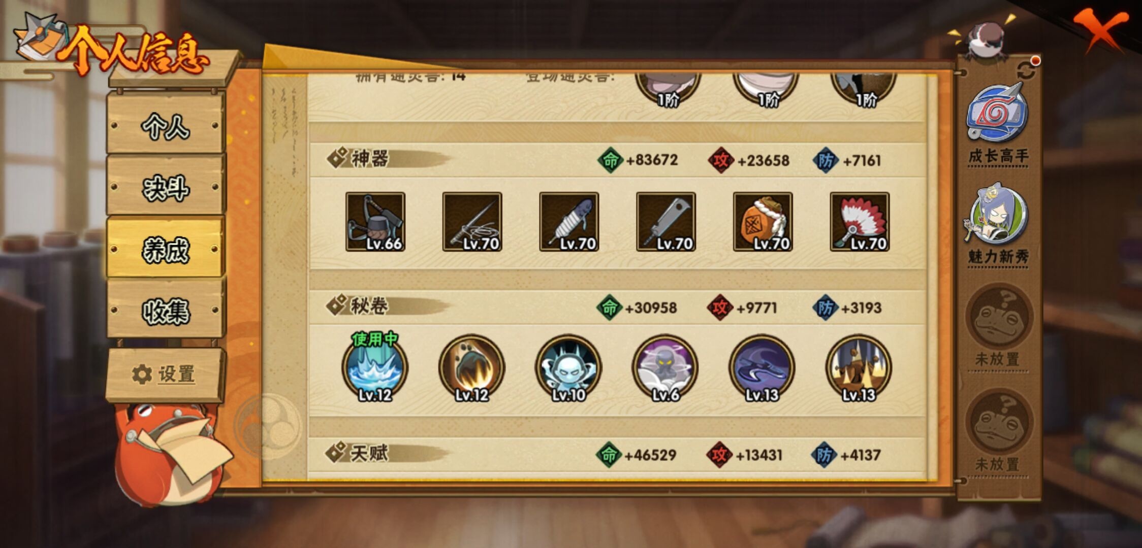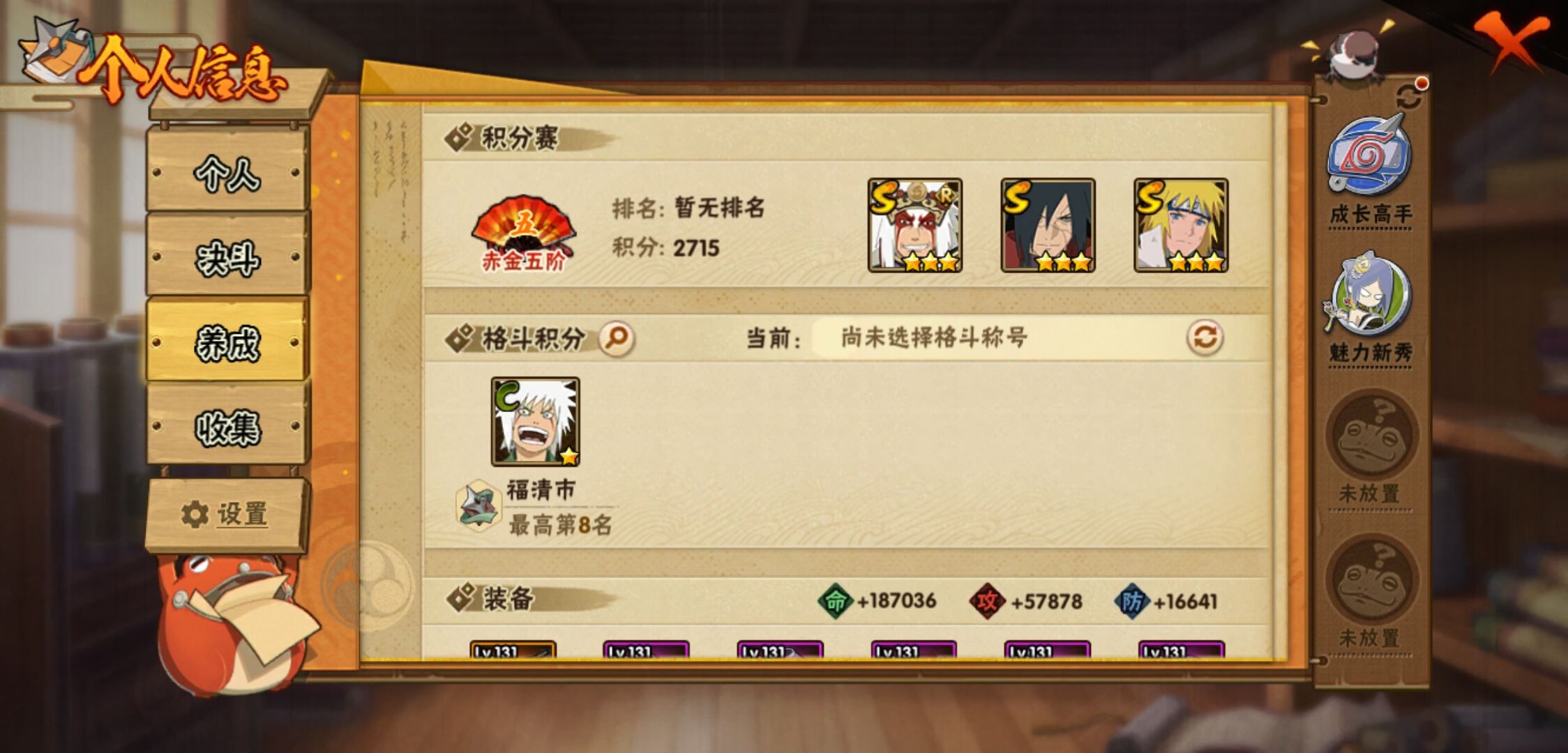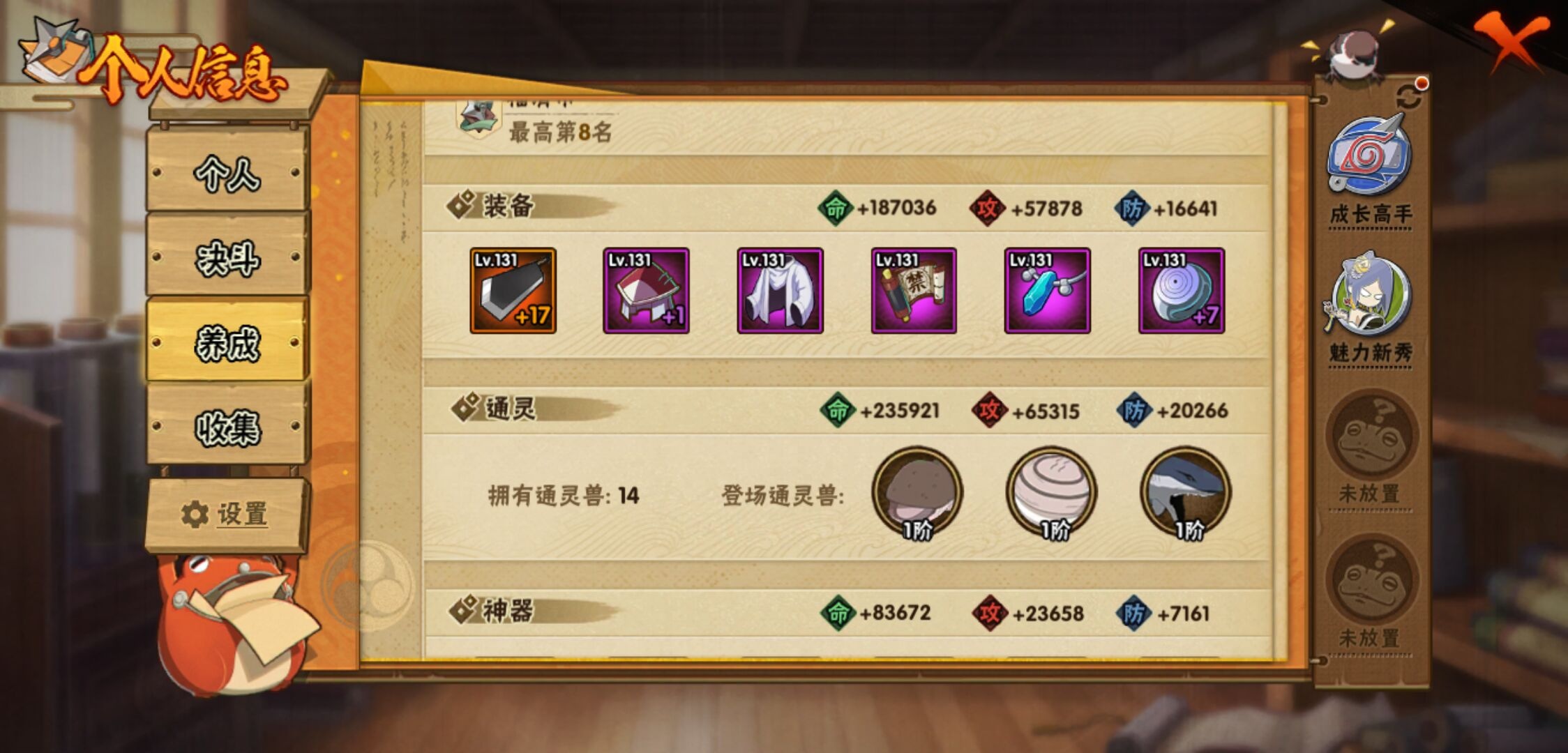 【火影忍者】【lyhy11117】战斗力:388w;段位:中忍1阶;本服排名:2373;vip:v7级;s忍:6个;a忍:17个;通灵兽:14个,s忍:秽土转生解宇智波斑|天道佩恩|漩涡鸣人宇智波佐助|舞之豪杰自来也|波风水门|大筒木桃式__a忍:青春爆炸迈特凯|忍界大战日向宁次|近松十人卫千代|须佐能乎宇智波佐助|恶灵之影飞段|忍界大战秋道丁次|死司凭血飞段|疾风传我爱罗|迪达拉(普通)|迈特凯(普通)|宇智波鼬(普通)|干柿鬼鲛(普通)|蝎(普通)|猿飞阿斯玛(普通)|桃式显现漩涡博人|最终章日向雏田|不动__通灵兽:忍犬(普通)|蓝蛇|蛤蟆吉|忍龟|镰鼬|猿魔|山椒鱼|砂之守鹤|蜃|蛤蟆仙人|鲛鲨|辛牙|蛤蟆健|乌鸦(普通)