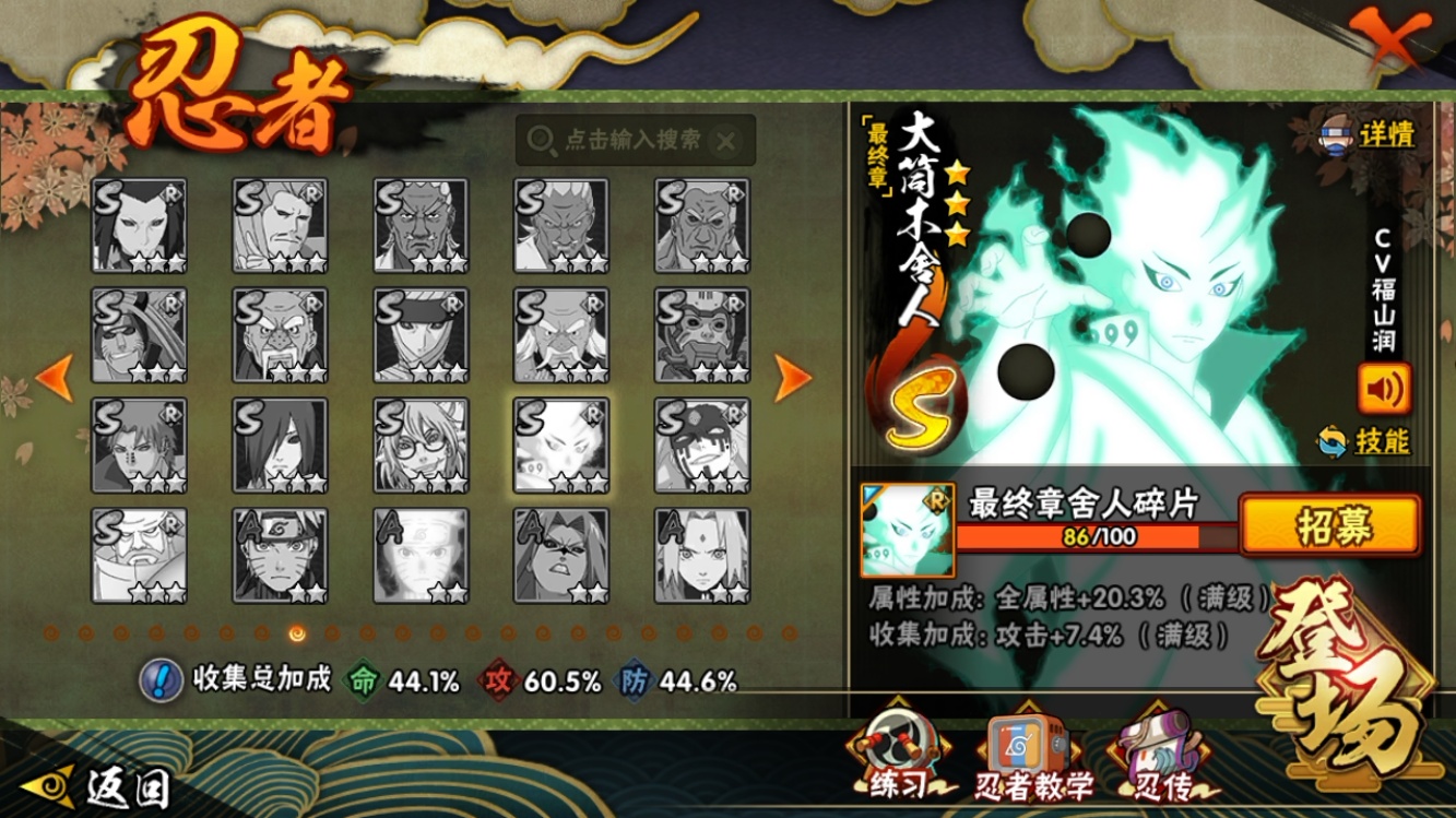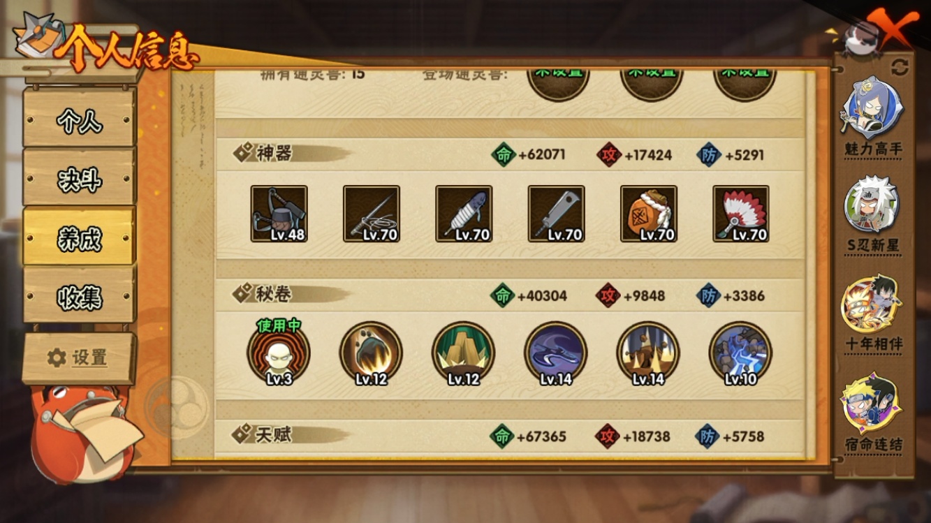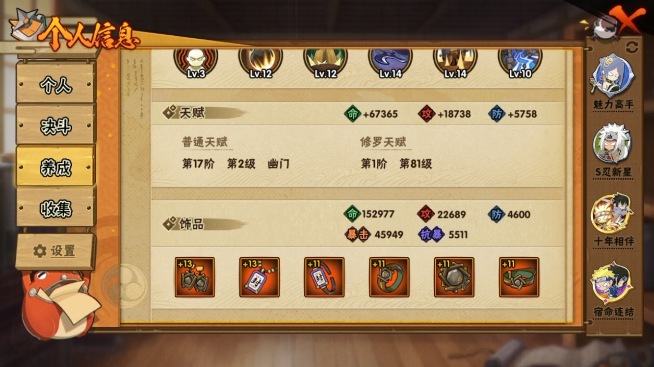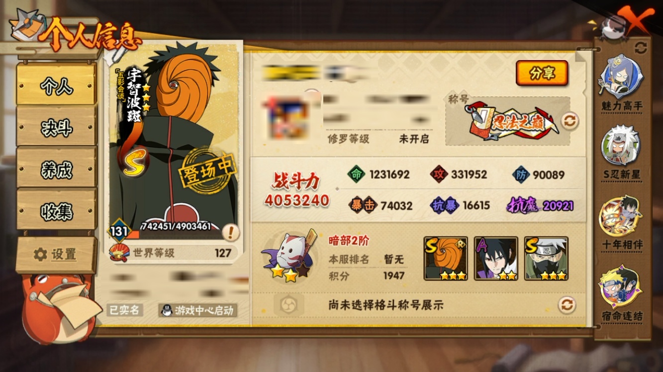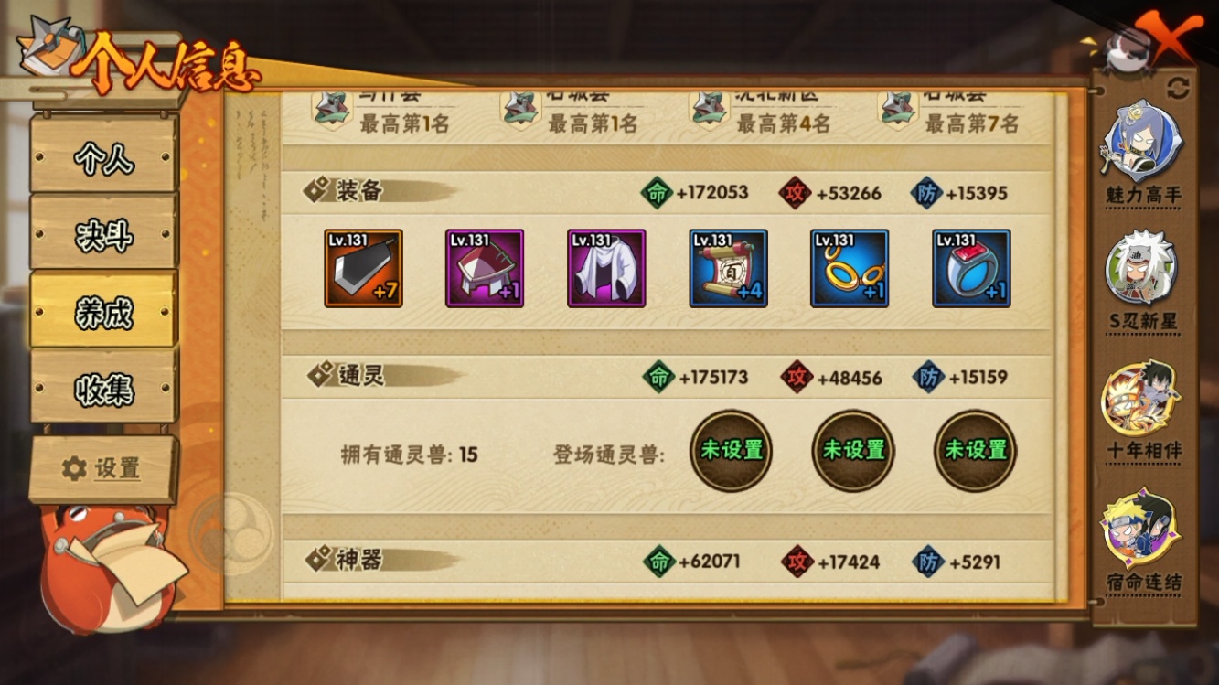 【火影忍者】【lyhy11118】战斗力:405w;段位:暗部2阶;本服排名:1150;vip:v9级;s忍:9个;a忍:23个;通灵兽:14个,s忍:须佐能乎旗木卡卡西|九喇嘛连结波风水门|五影会谈宇智波斑|天道佩恩|传说中的三忍自来也|漩涡鸣人宇智波佐助|舞之豪杰自来也|须佐能乎宇智波鼬|暴怒第六尾漩涡鸣人__a忍:青春爆炸迈特凯|仙人模式巳月|侠隐江湖宇智波佐助|幻之真容旗木卡卡西|忍界大战李洛克|秽土转生角都|忍者之路神秘面具男|半蛇斗篷药师兜|须佐能乎宇智波佐助|万花筒写轮眼宇智波佐助|疾风传我爱罗|迪达拉(普通)|飞段(普通)|迈特凯(普通)|宇智波鼬(普通)|干柿鬼鲛(普通)|秽土转生桃地再不斩|蝎(普通)|猿飞阿斯玛(普通)|不缘|宇智波泉奈|羁绊神农|初始形态机械鸣人__通灵兽:忍犬(普通)|蓝蛇|砂之守鹤|蛤蟆吉|忍龟|镰鼬|猿魔|山椒鱼|蜃|蛤蟆仙人|鲛鲨|蛤蟆健|蛞蝓(普通)|乌鸦(普通)