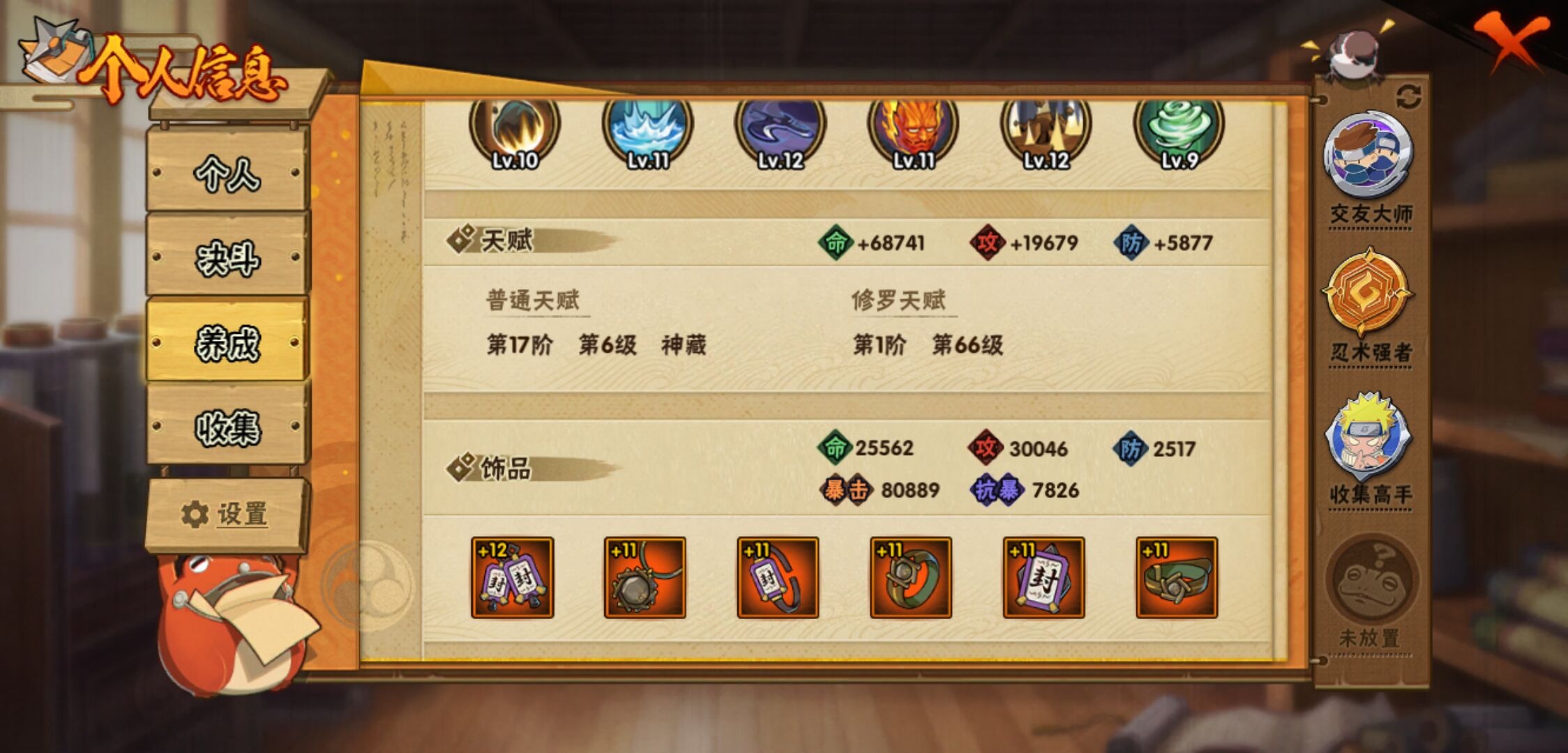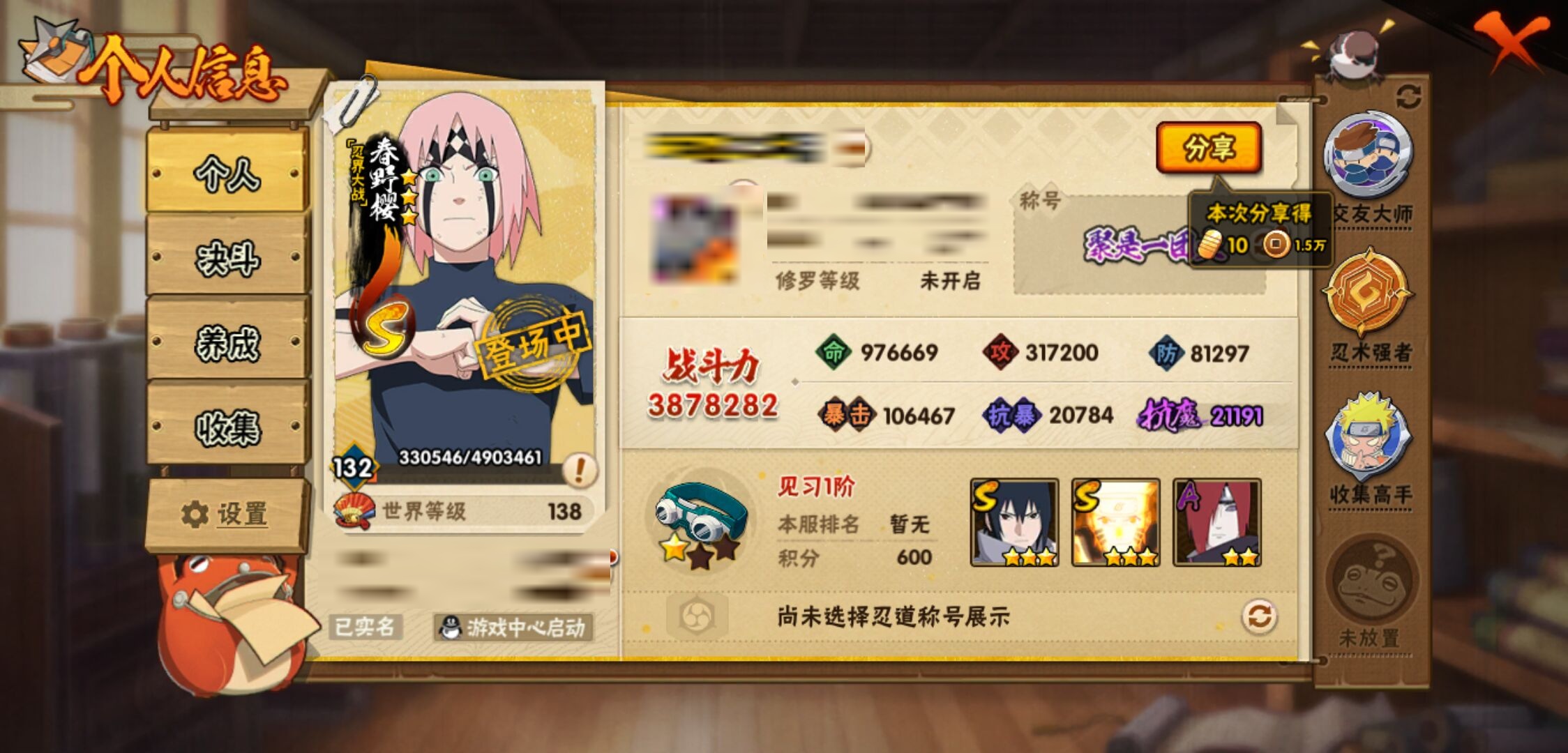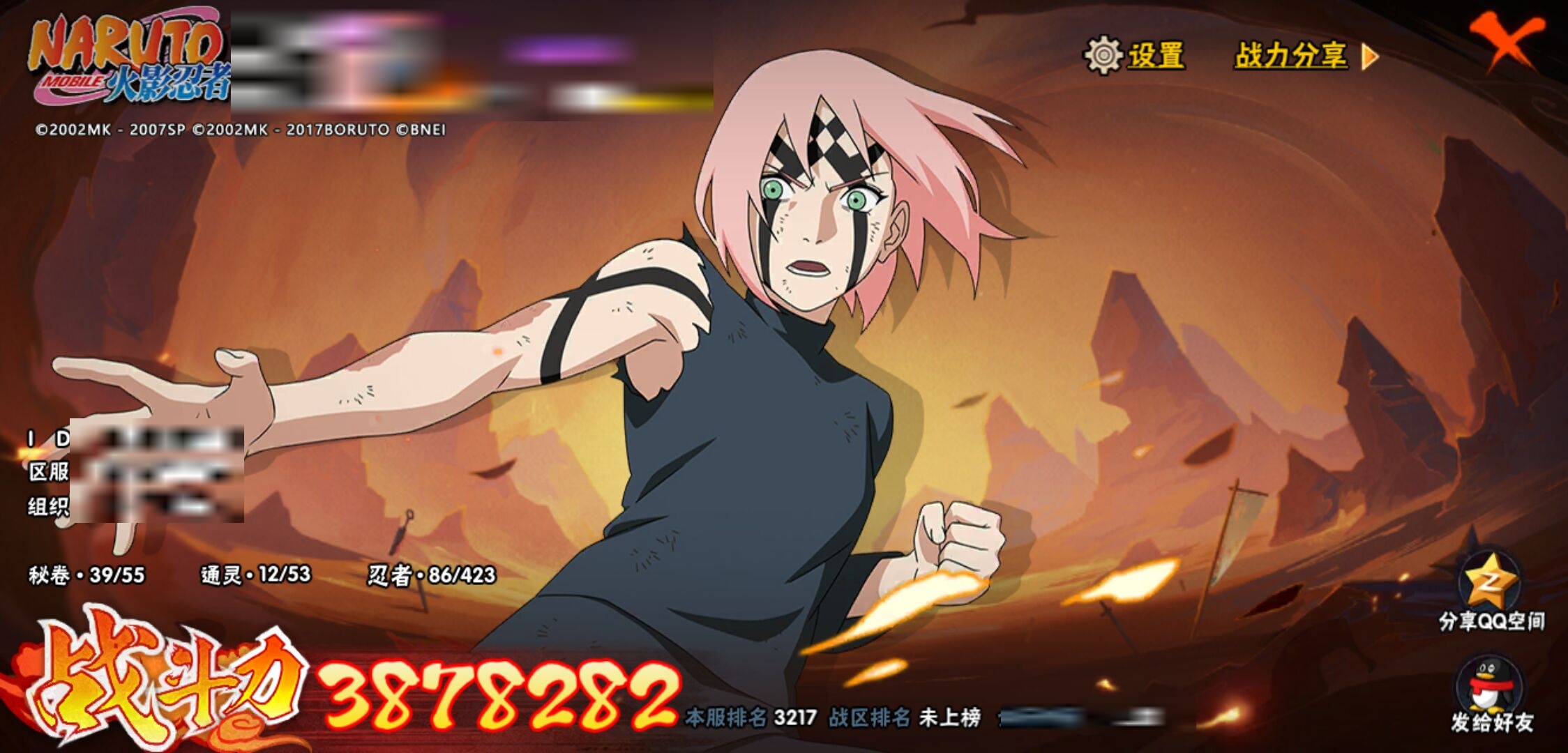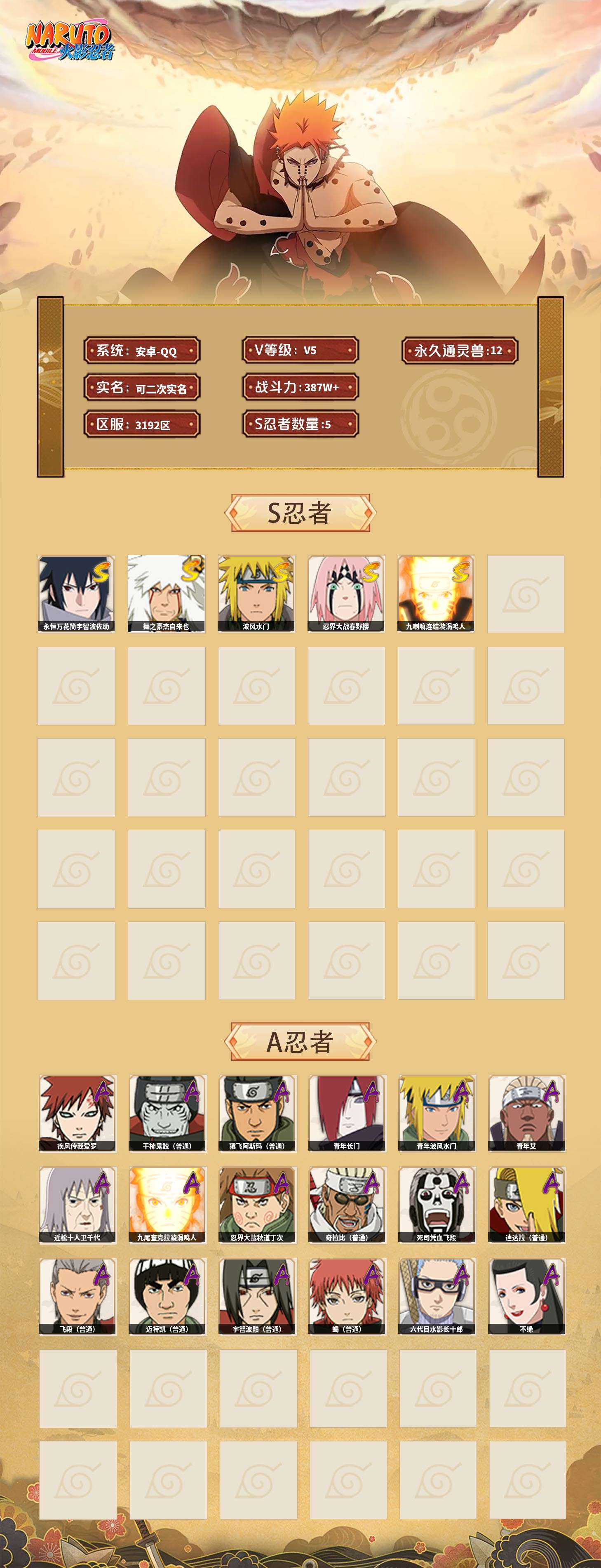 【火影忍者】【lyhy11120】战斗力:387w;段位:见习1阶;本服排名:3217;vip:v5级;s忍:5个;a忍:18个;通灵兽:12个,s忍:永恒万花筒宇智波佐助|舞之豪杰自来也|波风水门|忍界大战春野樱|九喇嘛连结漩涡鸣人__a忍:青年长门|青年波风水门|青年艾|近松十人卫千代|九尾查克拉漩涡鸣人|忍界大战秋道丁次|奇拉比(普通)|死司凭血飞段|疾风传我爱罗 3星|迪达拉(普通)|飞段(普通)|迈特凯(普通)|宇智波鼬(普通)|干柿鬼鲛(普通) 3星|蝎(普通)|猿飞阿斯玛(普通) 3星|六代目水影长十郎|不缘__通灵兽:忍犬(普通)|蓝蛇|蛤蟆吉|砂之守鹤|忍龟|镰鼬|猿魔|山椒鱼|蜃|蛤蟆仙人|鲛鲨|蛤蟆健