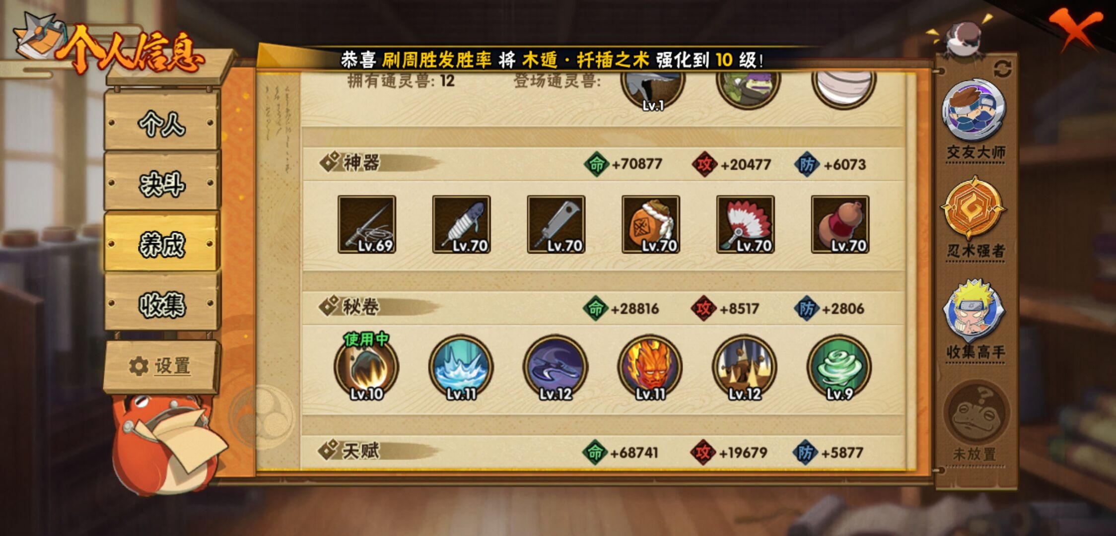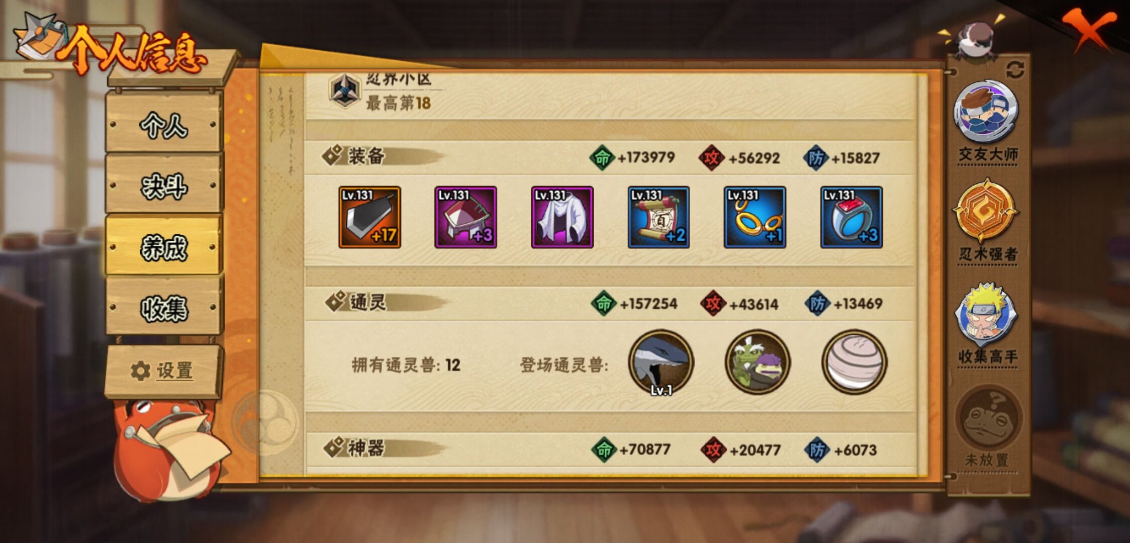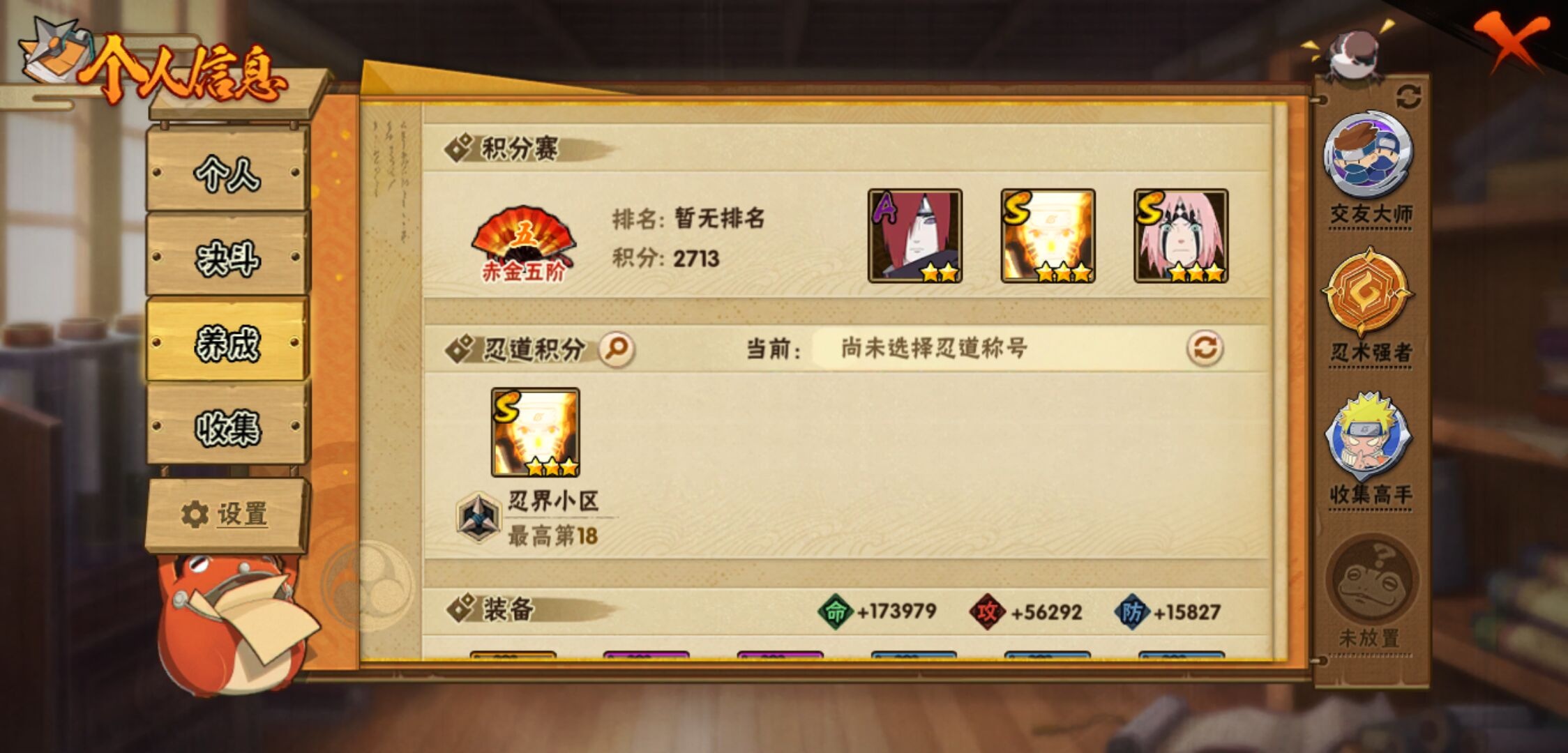 【火影忍者】【lyhy11120】战斗力:387w;段位:见习1阶;本服排名:3217;vip:v5级;s忍:5个;a忍:18个;通灵兽:12个,s忍:永恒万花筒宇智波佐助|舞之豪杰自来也|波风水门|忍界大战春野樱|九喇嘛连结漩涡鸣人__a忍:青年长门|青年波风水门|青年艾|近松十人卫千代|九尾查克拉漩涡鸣人|忍界大战秋道丁次|奇拉比(普通)|死司凭血飞段|疾风传我爱罗 3星|迪达拉(普通)|飞段(普通)|迈特凯(普通)|宇智波鼬(普通)|干柿鬼鲛(普通) 3星|蝎(普通)|猿飞阿斯玛(普通) 3星|六代目水影长十郎|不缘__通灵兽:忍犬(普通)|蓝蛇|蛤蟆吉|砂之守鹤|忍龟|镰鼬|猿魔|山椒鱼|蜃|蛤蟆仙人|鲛鲨|蛤蟆健