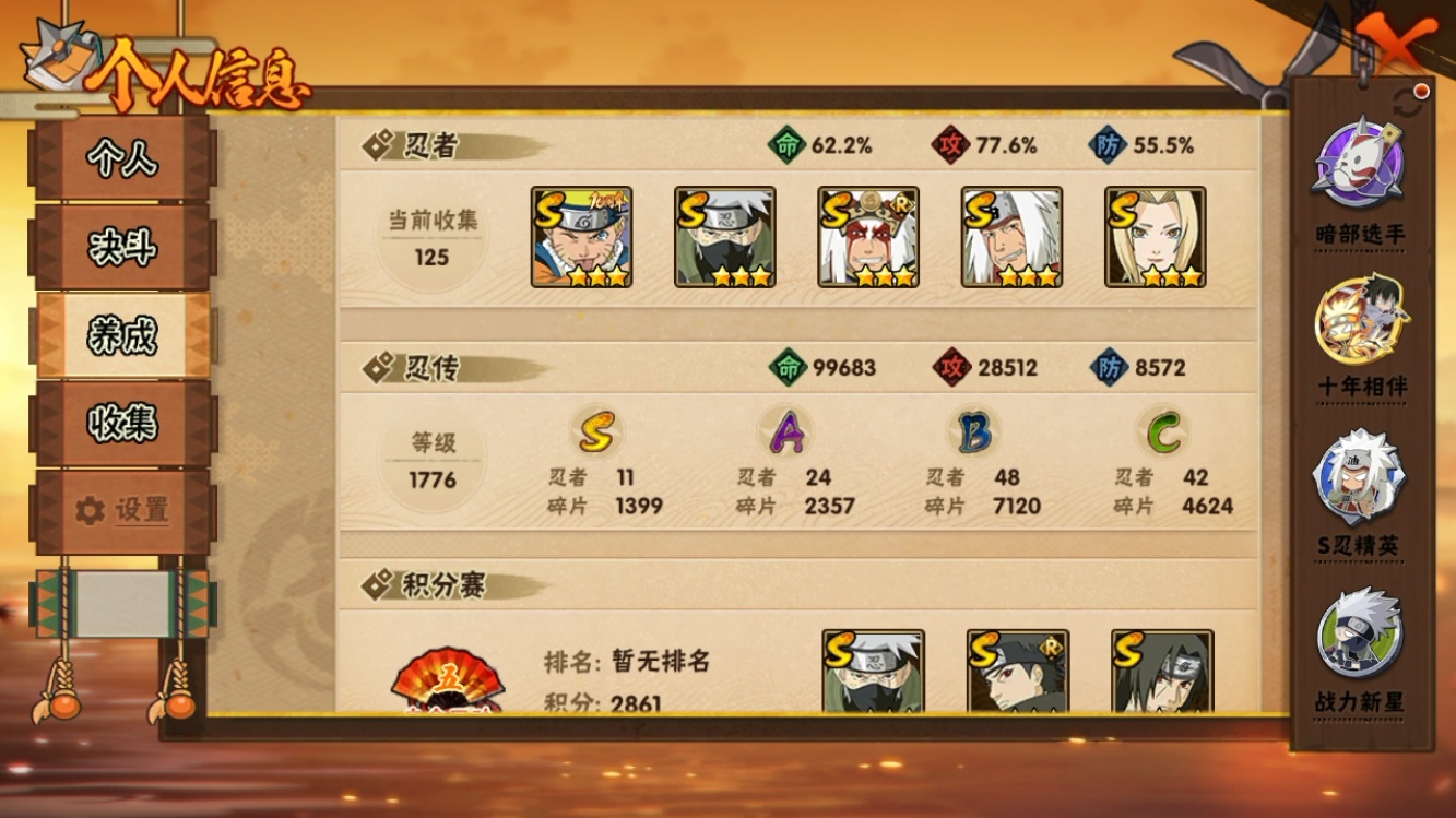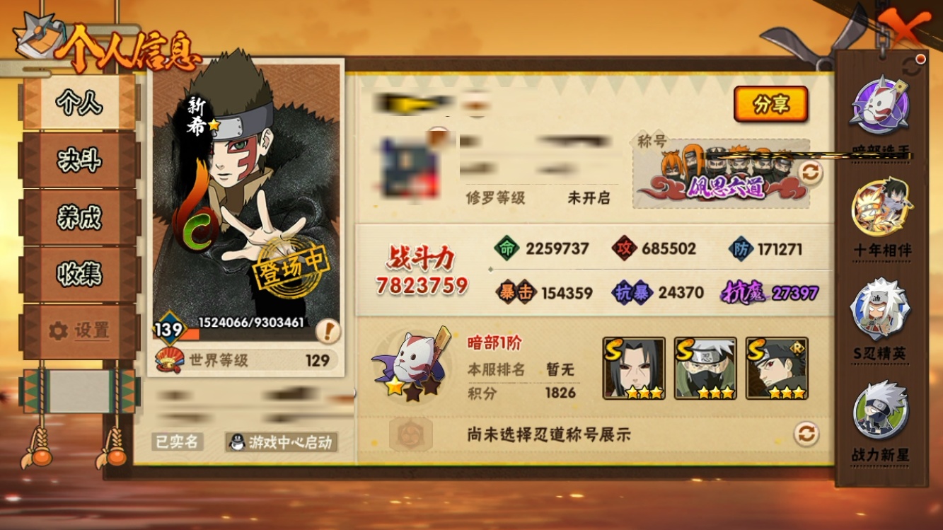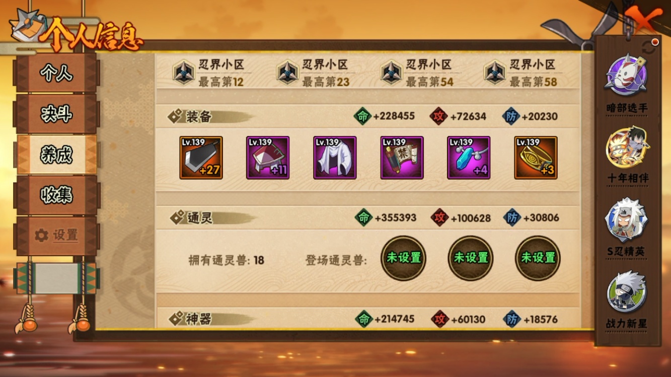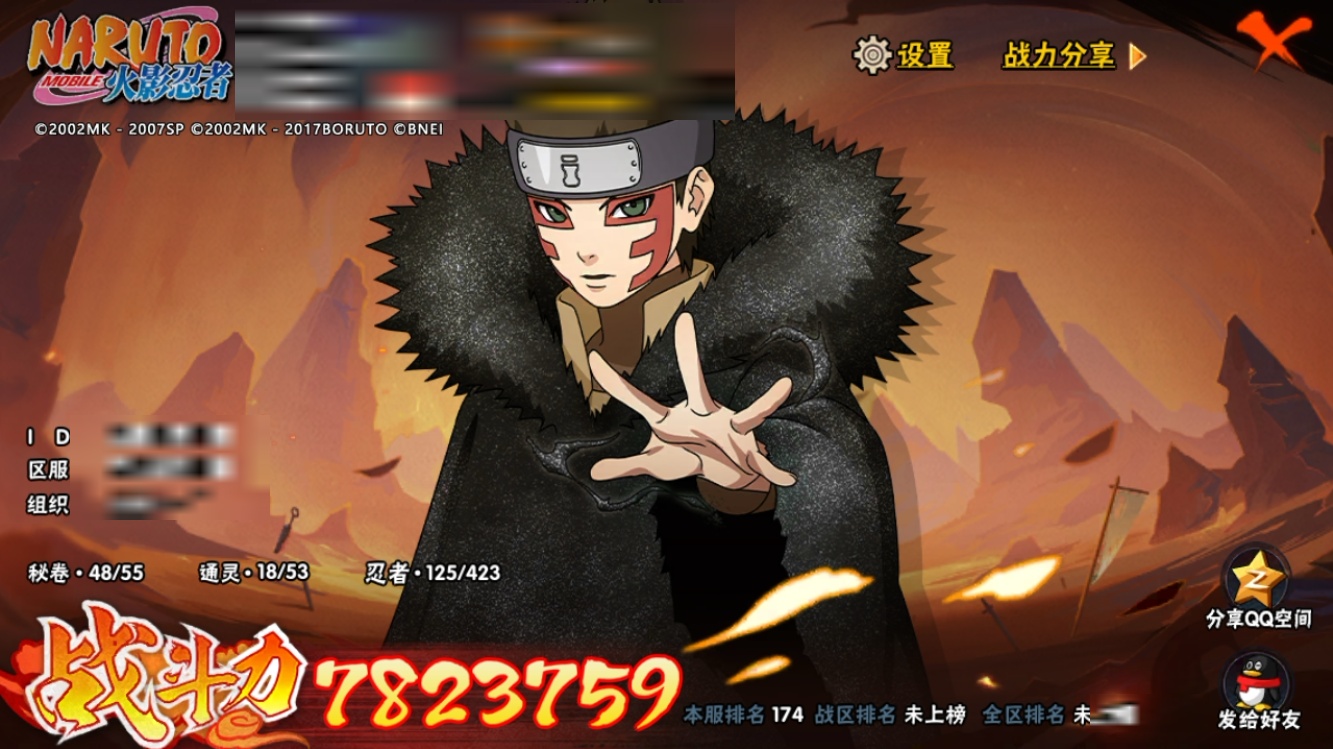 【火影忍者】【lyhy11128】战斗力:782w;段位:暗部1阶;本服排名:174;vip:v6级;s忍:11个;a忍:24个;通灵兽:15个,s忍:白面具宇智波斑|须佐能乎旗木卡卡西|九喇嘛连结波风水门|天道佩恩|传说中的三忍自来也|漩涡鸣人宇智波佐助|须佐能乎宇智波止水|秽土转生宇智波鼬|舞之豪杰自来也|纲手(普通)|须佐能乎宇智波鼬__a忍:青春爆炸迈特凯|仙人模式巳月|幻之真容旗木卡卡西|忍界大战李洛克|近松十人卫千代|晓大蛇丸|忍界大战秋道丁次|万花筒写轮眼宇智波佐助|死司凭血飞段|疾风传我爱罗|迪达拉(普通)|飞段(普通)|迈特凯(普通)|宇智波鼬(普通)|夏日限定宇智波鼬|干柿鬼鲛(普通)|秽土转生桃地再不斩|绯流琥蝎|蝎(普通)|猿飞阿斯玛(普通)|宇智波泉奈|羁绊神农|忍界大战土台|初始形态机械鸣人__通灵兽:忍犬(普通)|蓝蛇|蛤蟆吉|忍龟|镰鼬|砂之守鹤|猿魔|山椒鱼|蜃|蛤蟆仙人|鲛鲨|蛤蟆健|乌鸦(普通)|蛤蟆龙|蛤蟆广