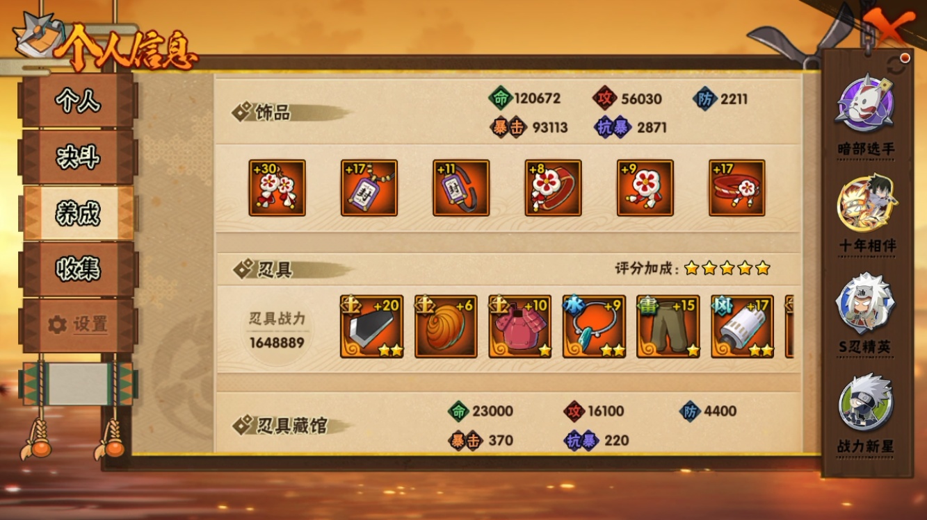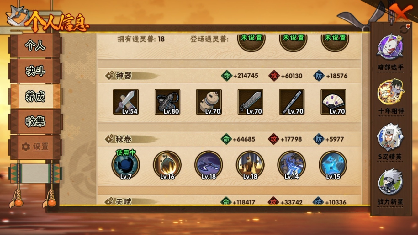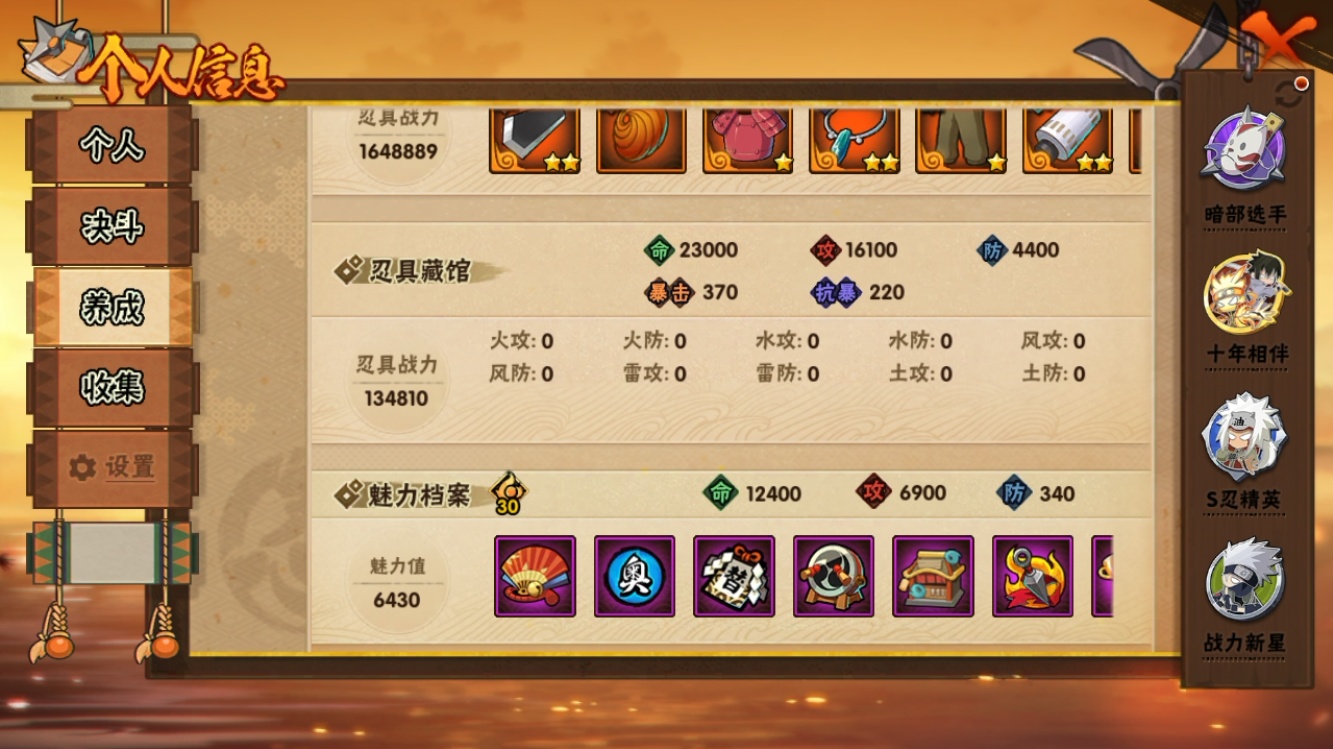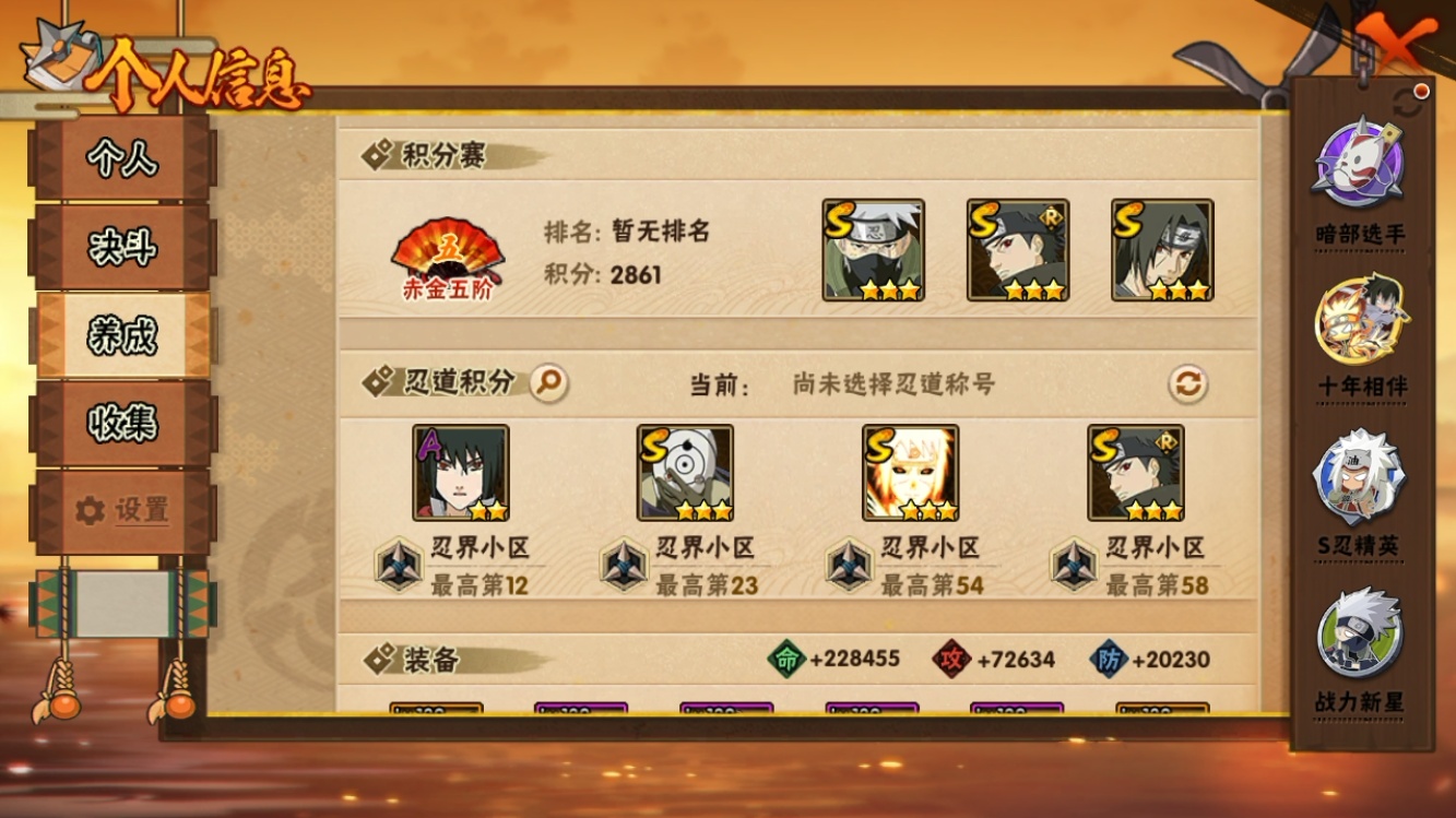 【火影忍者】【lyhy11128】战斗力:782w;段位:暗部1阶;本服排名:174;vip:v6级;s忍:11个;a忍:24个;通灵兽:15个,s忍:白面具宇智波斑|须佐能乎旗木卡卡西|九喇嘛连结波风水门|天道佩恩|传说中的三忍自来也|漩涡鸣人宇智波佐助|须佐能乎宇智波止水|秽土转生宇智波鼬|舞之豪杰自来也|纲手(普通)|须佐能乎宇智波鼬__a忍:青春爆炸迈特凯|仙人模式巳月|幻之真容旗木卡卡西|忍界大战李洛克|近松十人卫千代|晓大蛇丸|忍界大战秋道丁次|万花筒写轮眼宇智波佐助|死司凭血飞段|疾风传我爱罗|迪达拉(普通)|飞段(普通)|迈特凯(普通)|宇智波鼬(普通)|夏日限定宇智波鼬|干柿鬼鲛(普通)|秽土转生桃地再不斩|绯流琥蝎|蝎(普通)|猿飞阿斯玛(普通)|宇智波泉奈|羁绊神农|忍界大战土台|初始形态机械鸣人__通灵兽:忍犬(普通)|蓝蛇|蛤蟆吉|忍龟|镰鼬|砂之守鹤|猿魔|山椒鱼|蜃|蛤蟆仙人|鲛鲨|蛤蟆健|乌鸦(普通)|蛤蟆龙|蛤蟆广