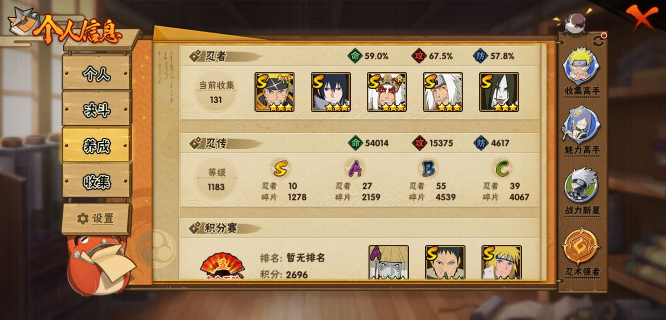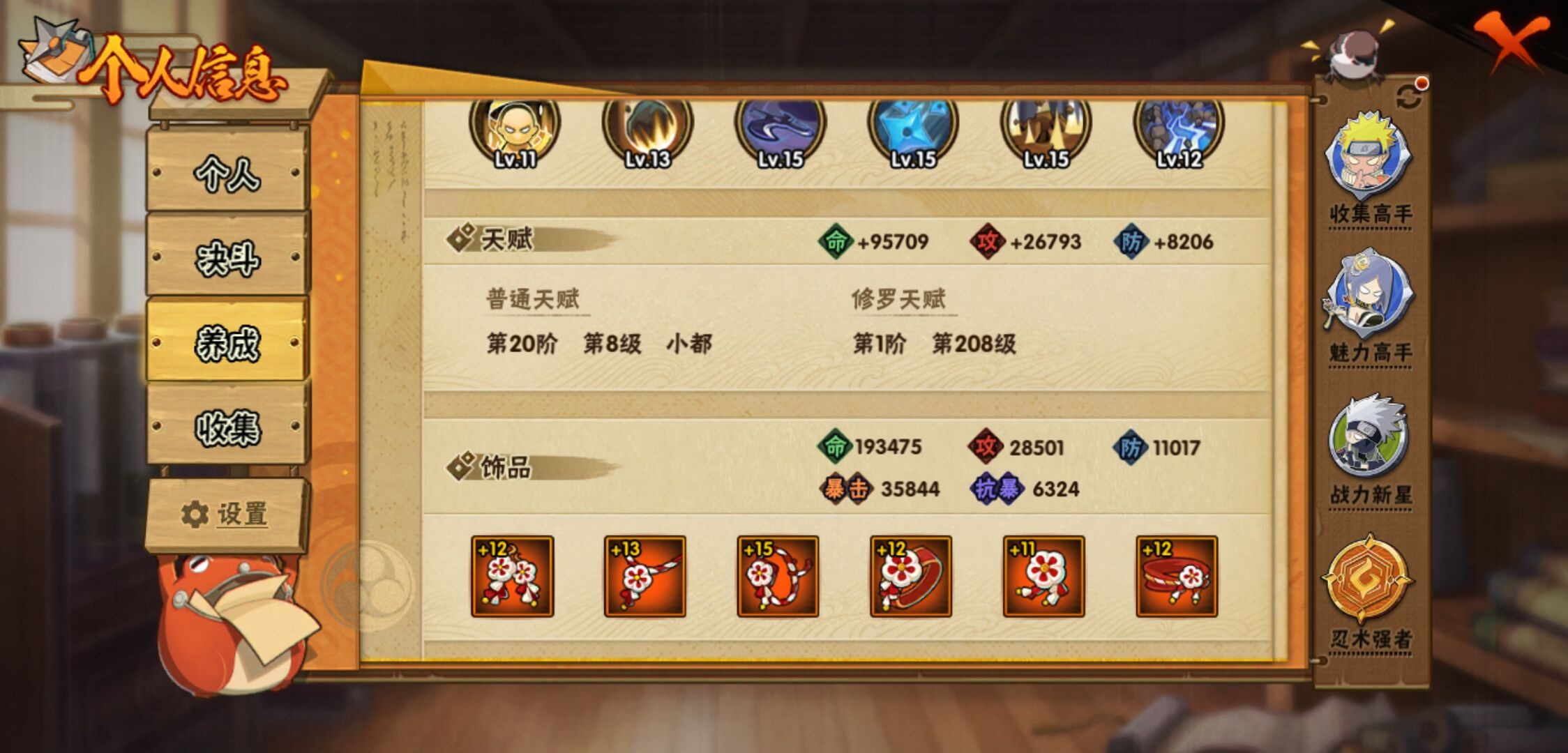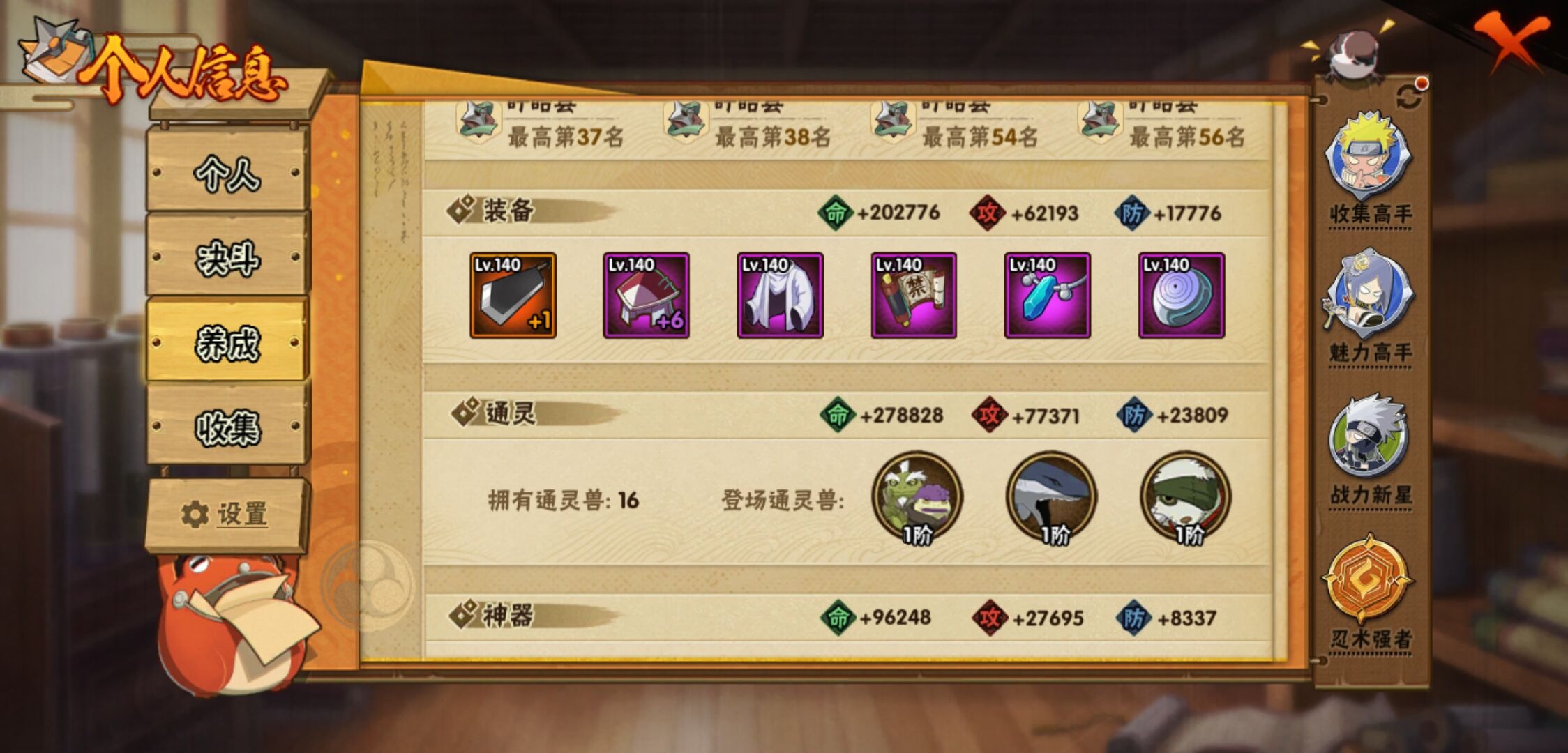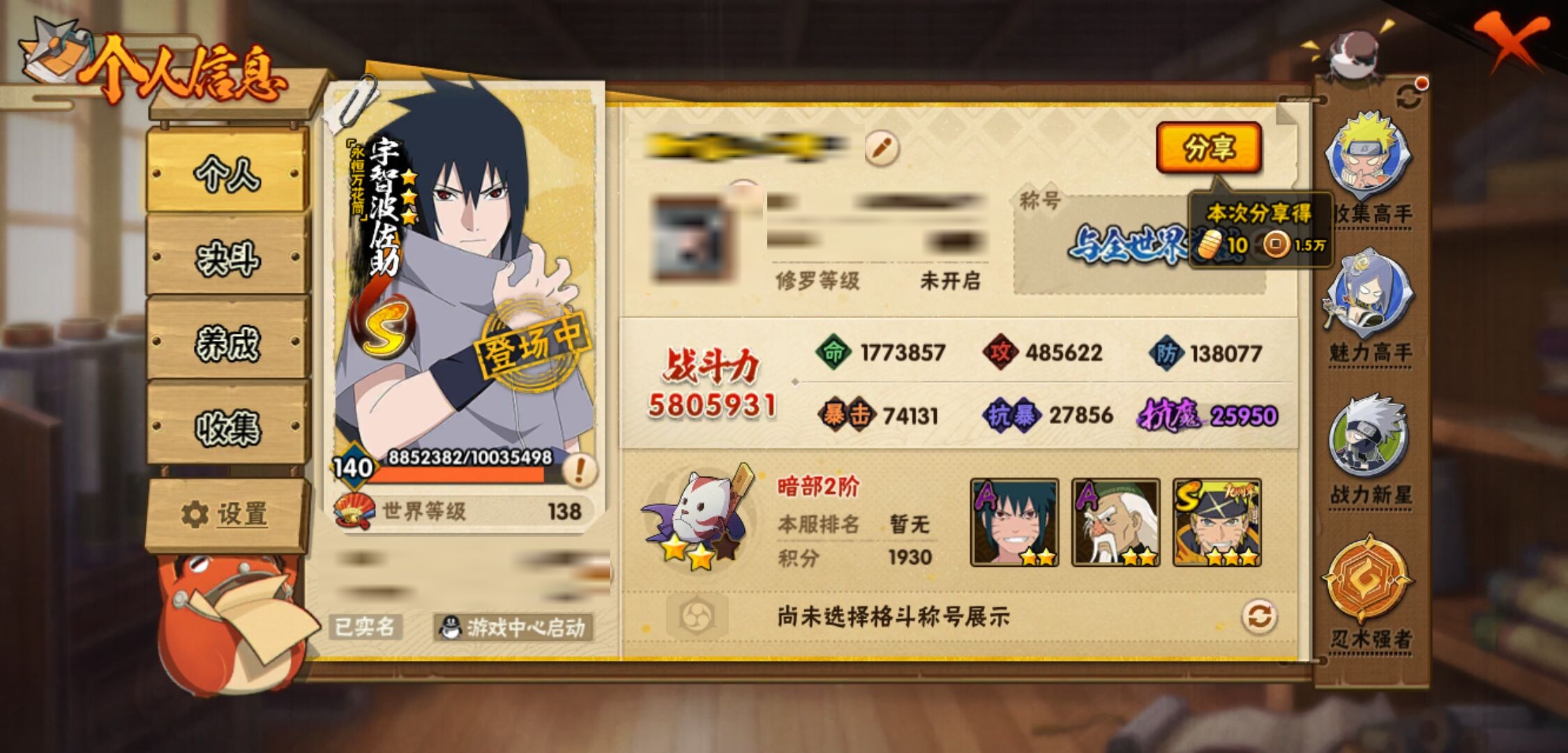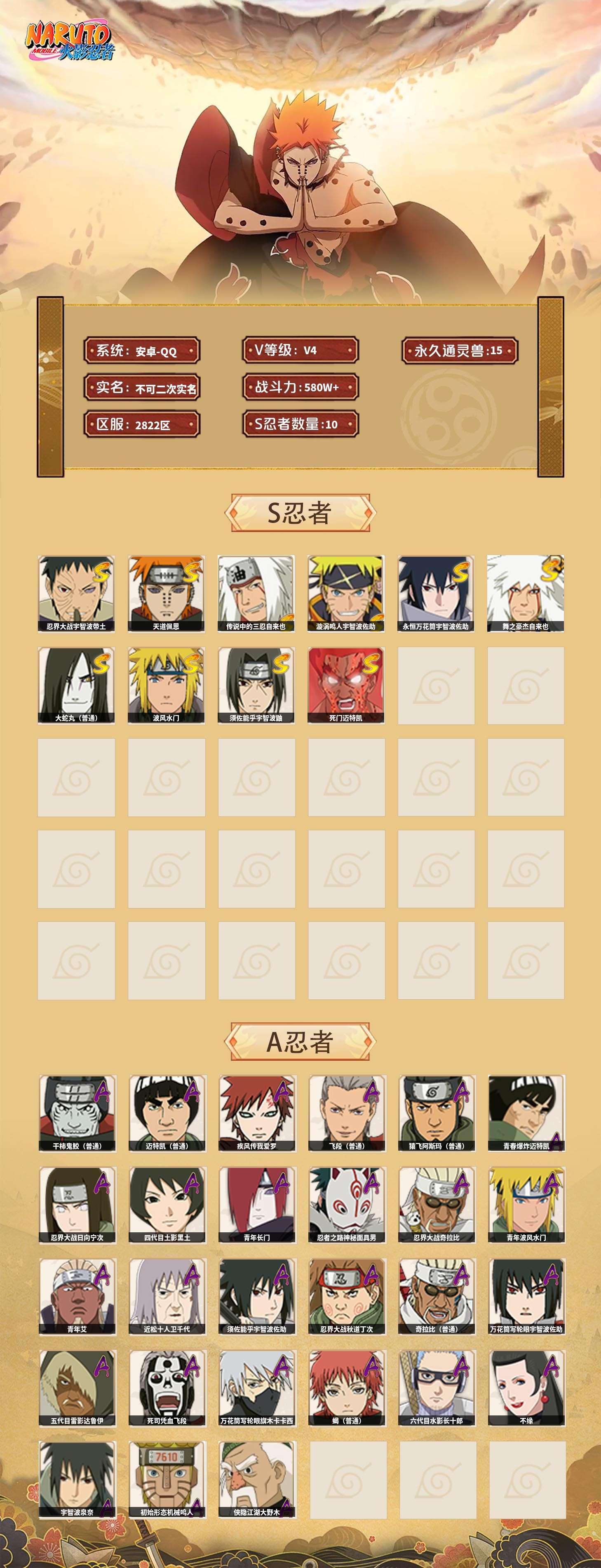 【火影忍者】【lyhy11130】战斗力:580w;段位:暗部2阶;本服排名:1116;vip:v4级;s忍:10个;a忍:27个;通灵兽:15个,s忍:忍界大战宇智波带土|天道佩恩|传说中的三忍自来也|漩涡鸣人宇智波佐助|永恒万花筒宇智波佐助|舞之豪杰自来也|大蛇丸(普通)|波风水门|须佐能乎宇智波鼬|死门迈特凯__a忍:青春爆炸迈特凯|忍界大战日向宁次|四代目土影黑土|青年长门|忍者之路神秘面具男|忍界大战奇拉比|青年波风水门|青年艾|近松十人卫千代|须佐能乎宇智波佐助|忍界大战秋道丁次|奇拉比(普通)|万花筒写轮眼宇智波佐助|五代目雷影达鲁伊|死司凭血飞段|疾风传我爱罗 3星|飞段(普通) 3星|万花筒写轮眼旗木卡卡西|迈特凯(普通) 4星|干柿鬼鲛(普通) 5星|蝎(普通)|猿飞阿斯玛(普通) 3星|六代目水影长十郎|不缘|宇智波泉奈|初始形态机械鸣人|侠隐江湖大野木__通灵兽:忍犬(普通)|蓝蛇|砂之守鹤|蛤蟆吉|忍龟|镰鼬|猿魔|山椒鱼|蜃|蛤蟆仙人|鲛鲨|蛤蟆健|乌鸦(普通)|辛牙|蛤蟆龙