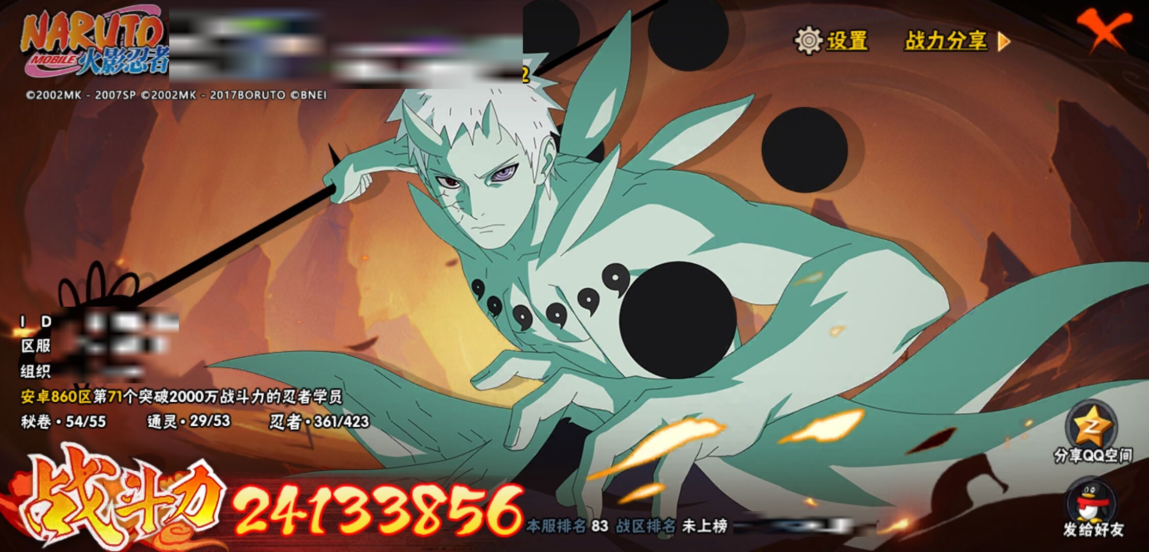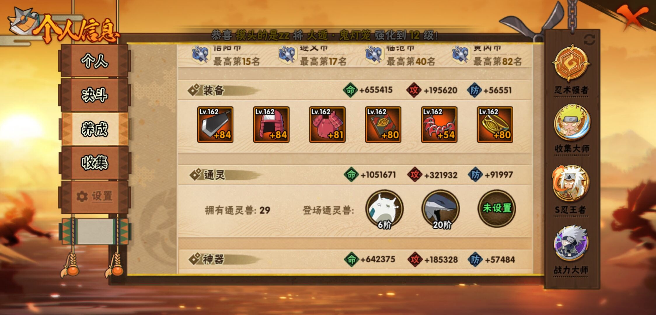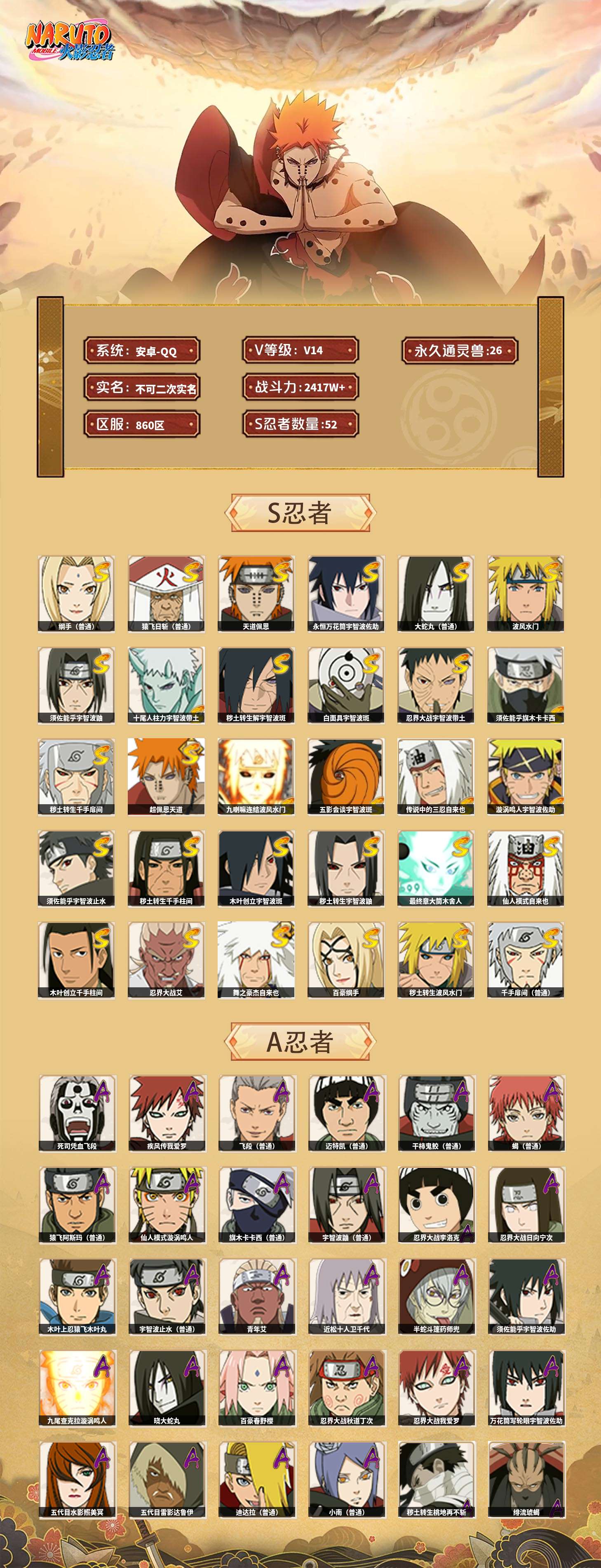 【火影忍者】【lyhy11131】战斗力:2417w;段位:暗部2阶;本服排名:83;vip:v14级;s忍:52个;a忍:76个;通灵兽:26个,s忍:十尾人柱力宇智波带土|秽土转生解宇智波斑|白面具宇智波斑|忍界大战宇智波带土|须佐能乎旗木卡卡西|秽土转生千手扉间|超佩恩天道|九喇嘛连结波风水门|五影会谈宇智波斑|天道佩恩 4星|传说中的三忍自来也|漩涡鸣人宇智波佐助|须佐能乎宇智波止水|秽土转生千手柱间|木叶创立宇智波斑|秽土转生宇智波鼬|永恒万花筒宇智波佐助 4星|最终章大筒木舍人|仙人模式自来也|木叶创立千手柱间|忍界大战艾|舞之豪杰自来也|大蛇丸(普通) 4星|纲手(普通) 5星|百豪纲手|波风水门 4星|秽土转生波风水门|千手扉间(普通)|千手柱间(普通)|秽土转生宇智波斑|宇智波斑(普通)|须佐能乎宇智波鼬 4星|神秘面具男(普通)|红夜之刃神秘面具男|秽土转生长门|秽土转生半藏|秽土转生金角银角|二代目土影无|二代目水影鬼灯幻月|三代目雷影艾|四代目雷影艾|四代目风影罗砂|仙人模式药师兜|死门迈特凯|忍界大战大野木|忍界大战春野樱|九喇嘛连结漩涡鸣人|大筒木桃式|猿飞日斩(普通) 5星|秽土转生猿飞日斩|自来也(普通)|暴怒第六尾漩涡鸣人__a忍:青春爆炸迈特凯|漂泊浪客宇智波带土|仙人模式巳月|幻之真容旗木卡卡西|忍界大战李洛克 3星|漂泊浪客佩恩六道|秽土转生角都|忍界大战日向宁次 3星|四代目土影黑土|木叶上忍猿飞木叶丸 3星|青年长门|秽土转生迪达拉|志村团藏|宇智波止水(普通) 3星|青年三船|不风|忍界大战奇拉比|青年波风水门|青年艾 3星|漂泊武士千手扉间|鲛肌融合干柿鬼鲛|加藤断|忍界大战旗木卡卡西|近松十人卫千代 3星|晓创生角都|半蛇斗篷药师兜 3星|须佐能乎宇智波佐助 3星|九尾查克拉漩涡鸣人 3星|新春限定小南|七夕限定猿飞阿斯玛|暴怒宇智波带土|晓大蛇丸 3星|地陆|火影继承人猿飞日斩|百豪春野樱 3星|忍界大战秋道丁次 3星|忍界大战我爱罗 3星|忍界大战勘九郎|秽土转生猿飞阿斯玛|新春限定波风水门|夏日泳装小南|新春限定宇智波鼬|奇拉比(普通)|万花筒写轮眼宇智波佐助 3星|五代目水影照美冥 3星|五代目雷影达鲁伊 3星|达鲁伊(普通)|三船(普通)|惊门迈特凯|绝|死司凭血飞段 5星|角都(普通)|地怨虞角都|疾风传我爱罗 5星|迪达拉(普通) 3星|飞段(普通) 5星|小南(普通) 3星|仙人模式漩涡鸣人 4星|万花筒写轮眼旗木卡卡西|旗木卡卡西(普通) 4星|迈特凯(普通) 5星|宇智波鼬(普通) 4星|干柿鬼鲛(普通) 5星|秽土转生桃地再不斩 3星|桃地再不斩|蝎(普通) 5星|绯流琥蝎 3星|猿飞阿斯玛(普通) 5星|桃式显现漩涡博人|六代目水影长十郎 3星|不缘|不动|宇智波泉奈|羁绊神农|忍界大战土台 3星|初始形态机械鸣人__通灵兽:忍犬(普通)|蓝蛇|蛤蟆吉|忍龟|蛞蝓(普通)|镰鼬|熊猫|猿魔|山椒鱼|蜃|蛤蟆仙人|鲛鲨|蛤蟆健|乌鸦(普通)|蛤蟆龙|蛤蟆广|梦貘|鹰|怒鬼(普通)|砂之守鹤|二尾又旅|蜘蛛|辛牙|变色龙|万蛇|螃蟹