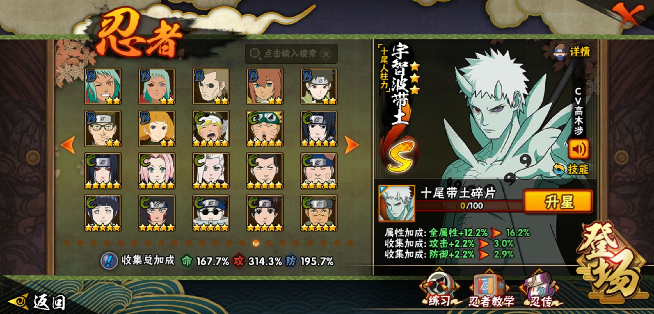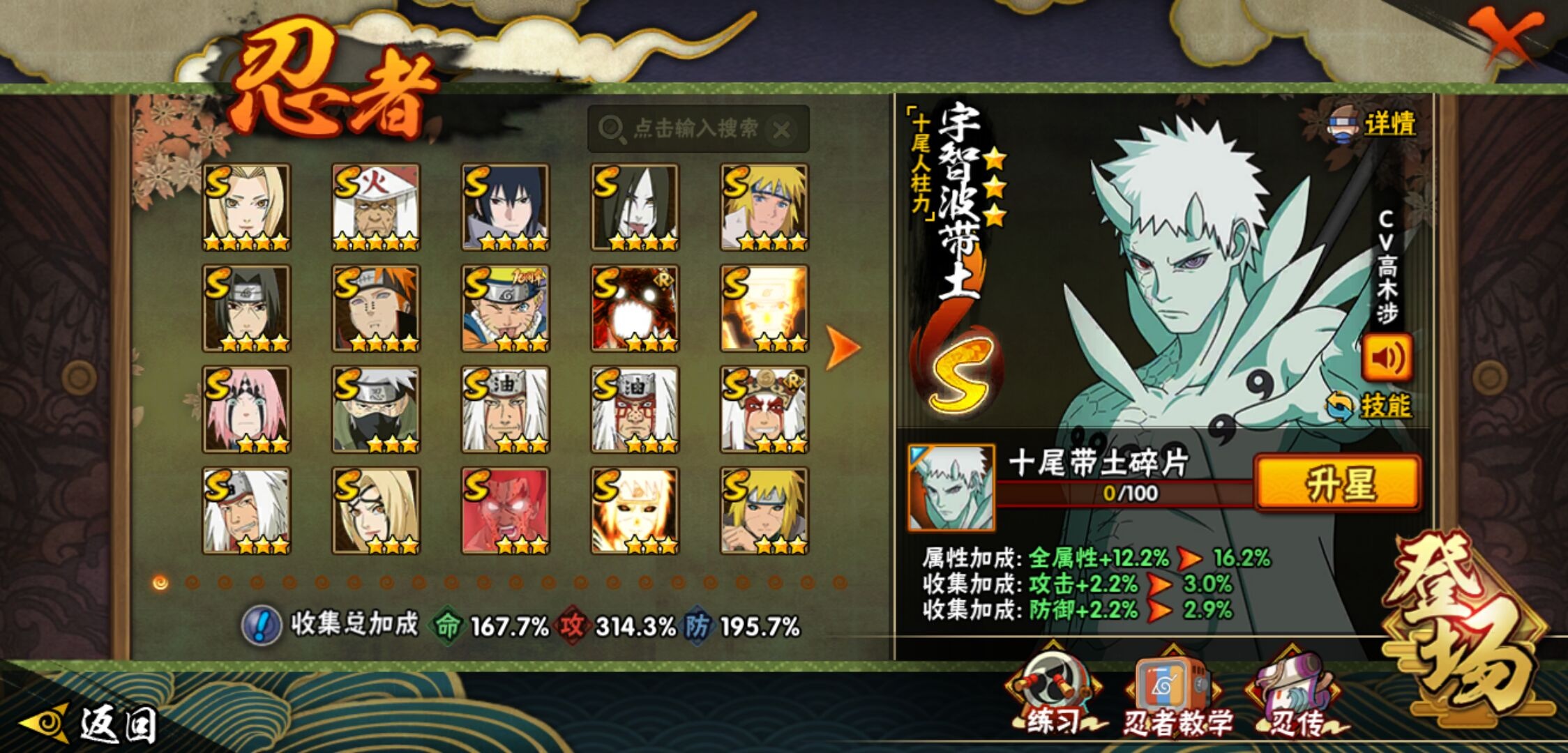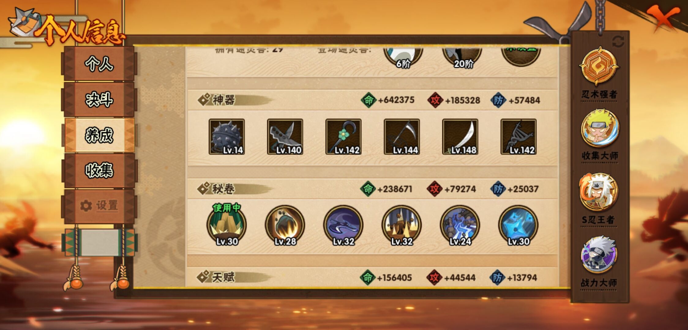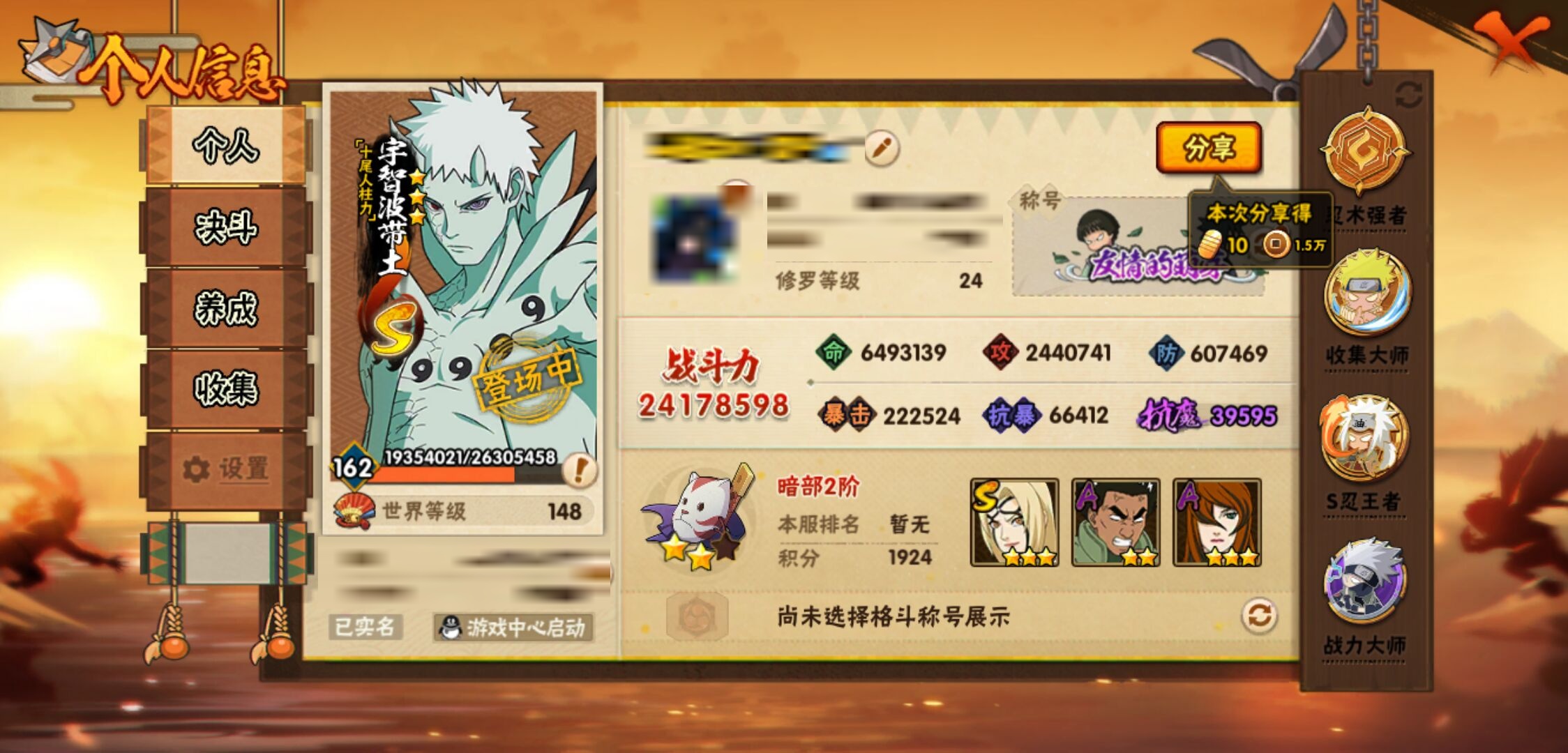 【火影忍者】【lyhy11131】战斗力:2417w;段位:暗部2阶;本服排名:83;vip:v14级;s忍:52个;a忍:76个;通灵兽:26个,s忍:十尾人柱力宇智波带土|秽土转生解宇智波斑|白面具宇智波斑|忍界大战宇智波带土|须佐能乎旗木卡卡西|秽土转生千手扉间|超佩恩天道|九喇嘛连结波风水门|五影会谈宇智波斑|天道佩恩 4星|传说中的三忍自来也|漩涡鸣人宇智波佐助|须佐能乎宇智波止水|秽土转生千手柱间|木叶创立宇智波斑|秽土转生宇智波鼬|永恒万花筒宇智波佐助 4星|最终章大筒木舍人|仙人模式自来也|木叶创立千手柱间|忍界大战艾|舞之豪杰自来也|大蛇丸(普通) 4星|纲手(普通) 5星|百豪纲手|波风水门 4星|秽土转生波风水门|千手扉间(普通)|千手柱间(普通)|秽土转生宇智波斑|宇智波斑(普通)|须佐能乎宇智波鼬 4星|神秘面具男(普通)|红夜之刃神秘面具男|秽土转生长门|秽土转生半藏|秽土转生金角银角|二代目土影无|二代目水影鬼灯幻月|三代目雷影艾|四代目雷影艾|四代目风影罗砂|仙人模式药师兜|死门迈特凯|忍界大战大野木|忍界大战春野樱|九喇嘛连结漩涡鸣人|大筒木桃式|猿飞日斩(普通) 5星|秽土转生猿飞日斩|自来也(普通)|暴怒第六尾漩涡鸣人__a忍:青春爆炸迈特凯|漂泊浪客宇智波带土|仙人模式巳月|幻之真容旗木卡卡西|忍界大战李洛克 3星|漂泊浪客佩恩六道|秽土转生角都|忍界大战日向宁次 3星|四代目土影黑土|木叶上忍猿飞木叶丸 3星|青年长门|秽土转生迪达拉|志村团藏|宇智波止水(普通) 3星|青年三船|不风|忍界大战奇拉比|青年波风水门|青年艾 3星|漂泊武士千手扉间|鲛肌融合干柿鬼鲛|加藤断|忍界大战旗木卡卡西|近松十人卫千代 3星|晓创生角都|半蛇斗篷药师兜 3星|须佐能乎宇智波佐助 3星|九尾查克拉漩涡鸣人 3星|新春限定小南|七夕限定猿飞阿斯玛|暴怒宇智波带土|晓大蛇丸 3星|地陆|火影继承人猿飞日斩|百豪春野樱 3星|忍界大战秋道丁次 3星|忍界大战我爱罗 3星|忍界大战勘九郎|秽土转生猿飞阿斯玛|新春限定波风水门|夏日泳装小南|新春限定宇智波鼬|奇拉比(普通)|万花筒写轮眼宇智波佐助 3星|五代目水影照美冥 3星|五代目雷影达鲁伊 3星|达鲁伊(普通)|三船(普通)|惊门迈特凯|绝|死司凭血飞段 5星|角都(普通)|地怨虞角都|疾风传我爱罗 5星|迪达拉(普通) 3星|飞段(普通) 5星|小南(普通) 3星|仙人模式漩涡鸣人 4星|万花筒写轮眼旗木卡卡西|旗木卡卡西(普通) 4星|迈特凯(普通) 5星|宇智波鼬(普通) 4星|干柿鬼鲛(普通) 5星|秽土转生桃地再不斩 3星|桃地再不斩|蝎(普通) 5星|绯流琥蝎 3星|猿飞阿斯玛(普通) 5星|桃式显现漩涡博人|六代目水影长十郎 3星|不缘|不动|宇智波泉奈|羁绊神农|忍界大战土台 3星|初始形态机械鸣人__通灵兽:忍犬(普通)|蓝蛇|蛤蟆吉|忍龟|蛞蝓(普通)|镰鼬|熊猫|猿魔|山椒鱼|蜃|蛤蟆仙人|鲛鲨|蛤蟆健|乌鸦(普通)|蛤蟆龙|蛤蟆广|梦貘|鹰|怒鬼(普通)|砂之守鹤|二尾又旅|蜘蛛|辛牙|变色龙|万蛇|螃蟹