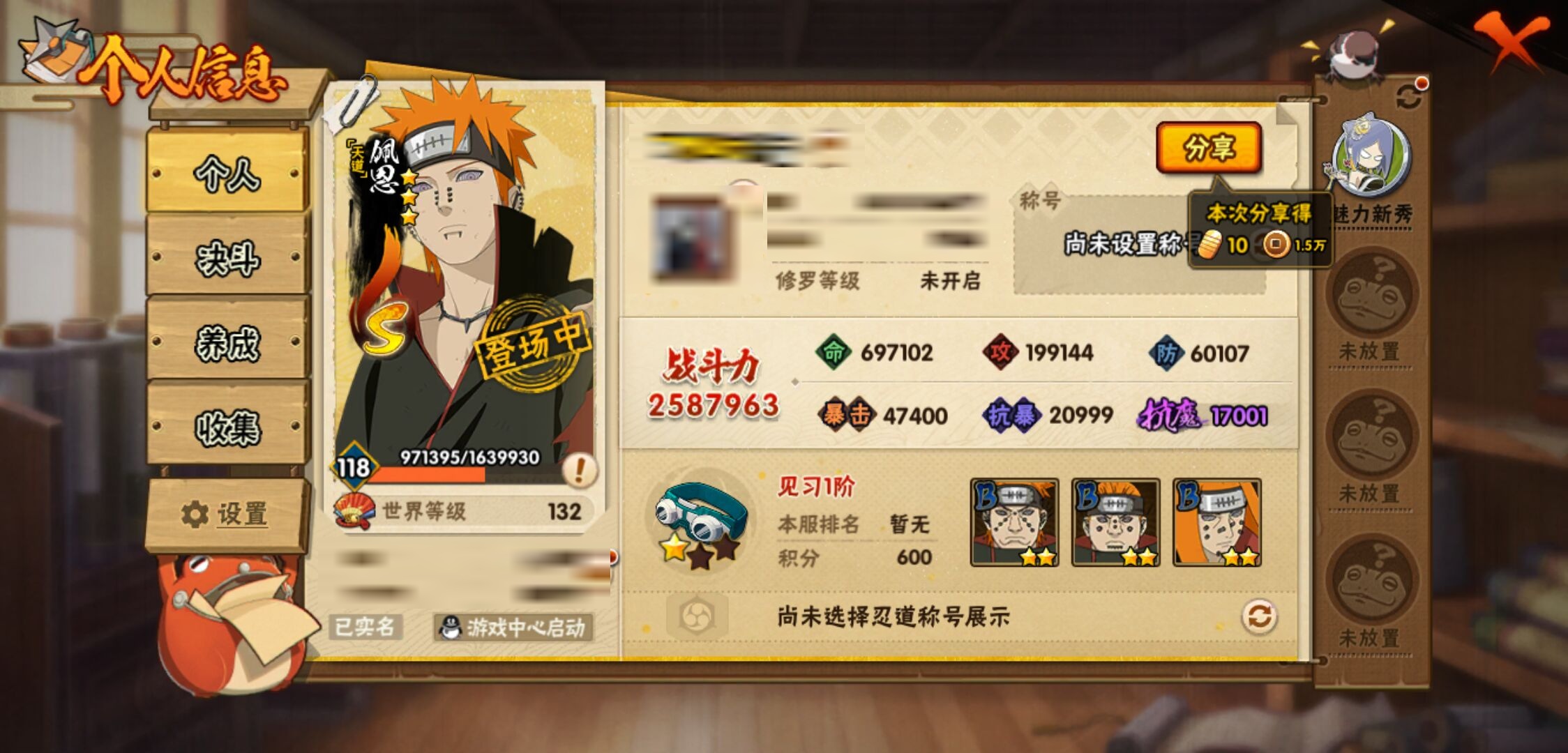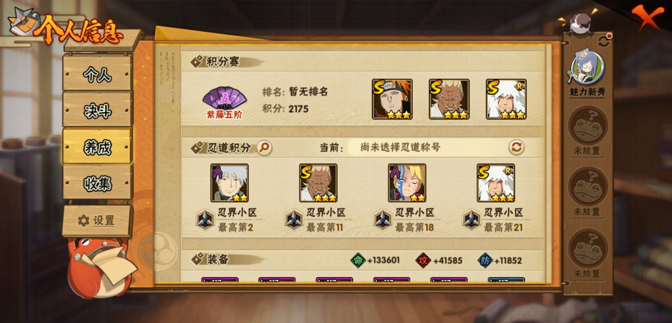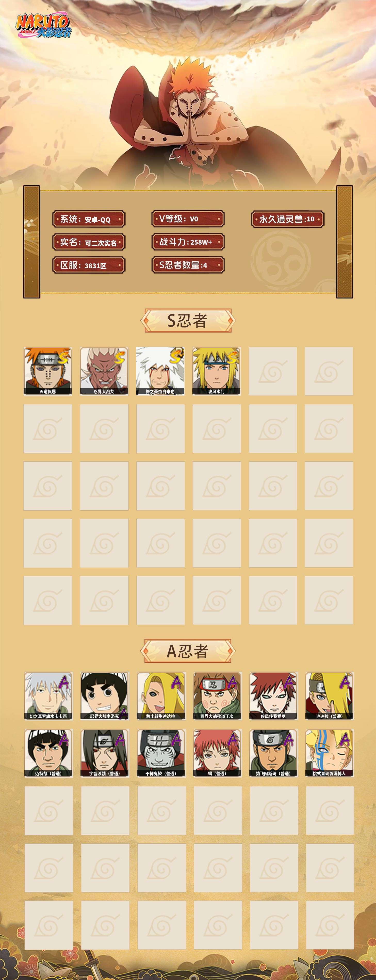 【火影忍者】【lyhy11132】战斗力:258w;段位:见习1阶;本服排名:41077;vip:v0级;s忍:4个;a忍:12个;通灵兽:10个,s忍:天道佩恩|忍界大战艾|舞之豪杰自来也|波风水门__a忍:幻之真容旗木卡卡西|忍界大战李洛克|秽土转生迪达拉|忍界大战秋道丁次|疾风传我爱罗|迪达拉(普通)|迈特凯(普通)|宇智波鼬(普通)|干柿鬼鲛(普通)|蝎(普通)|猿飞阿斯玛(普通)|桃式显现漩涡博人__通灵兽:忍犬(普通)|蓝蛇|蛤蟆吉|忍龟|镰鼬|猿魔|山椒鱼|蜃|蛤蟆仙人|鲛鲨