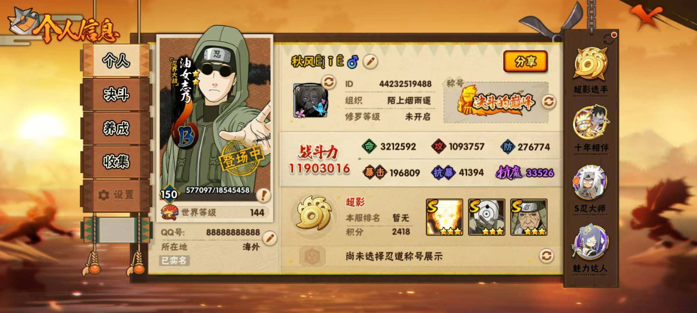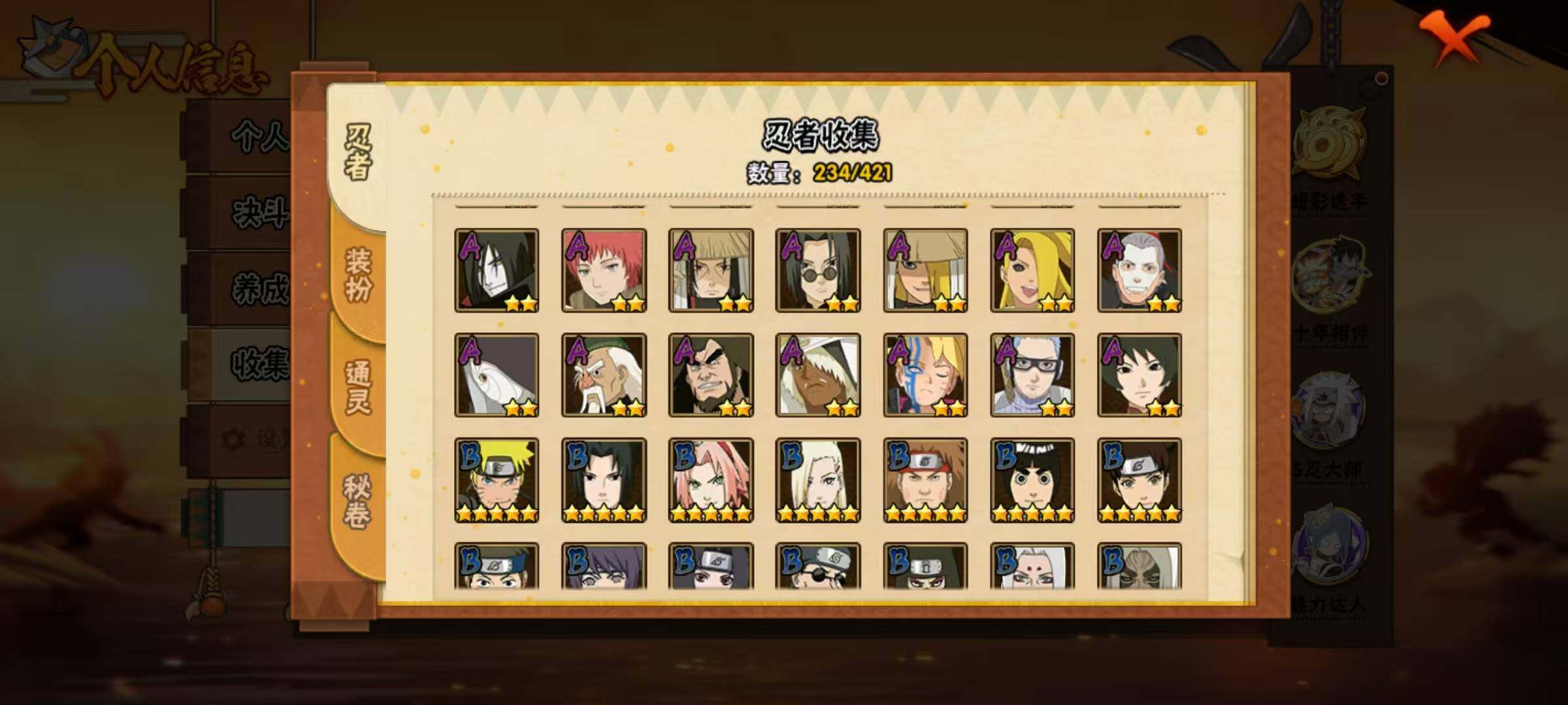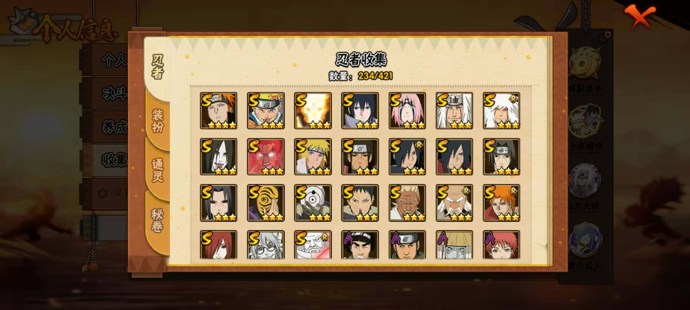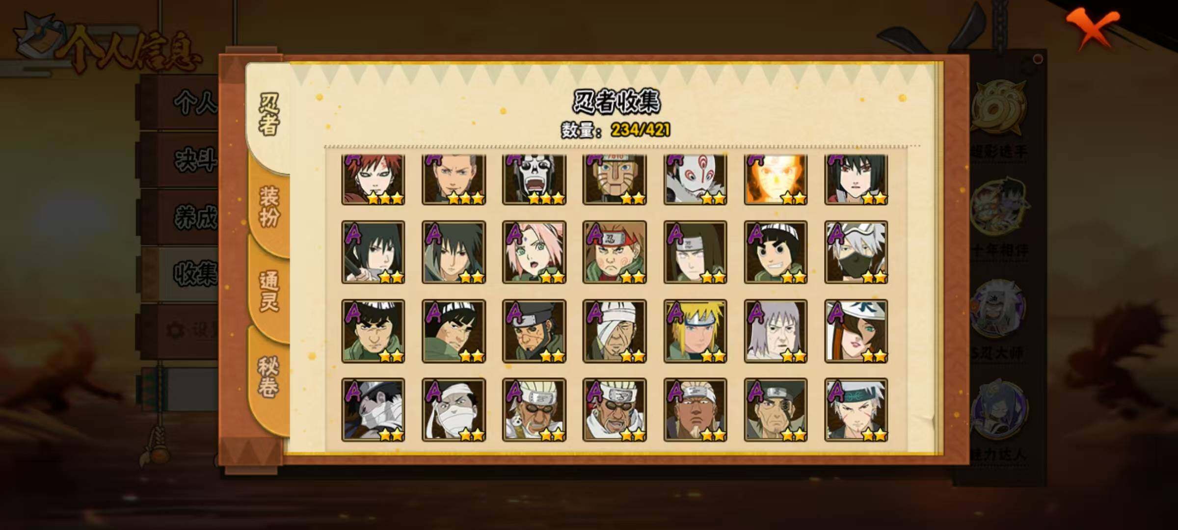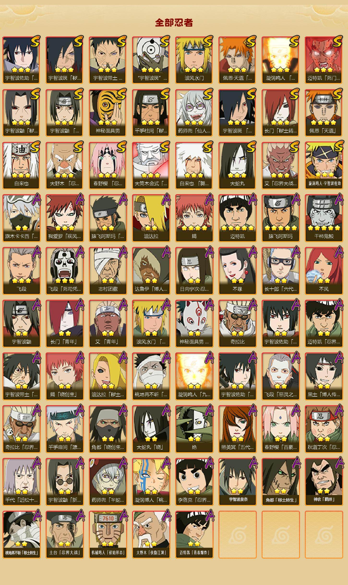 【378】24s级忍者数-53a级忍者数 【s级忍者】:长门「秽土转生」3星,千手柱间「秽土转生」3星,宇智波鼬「秽土转生」3星,宇智波斑「秽土转生·解」3星,大野木「忍界大战」3星,春野樱「忍界大战」3星,宇智波带土「忍界大战」3星,艾「忍界大战」3星,宇智波鼬「须佐能乎」3星,宇智波斑「木叶创立」3星,自来也3星,自来也「舞之豪杰」3星,大蛇
