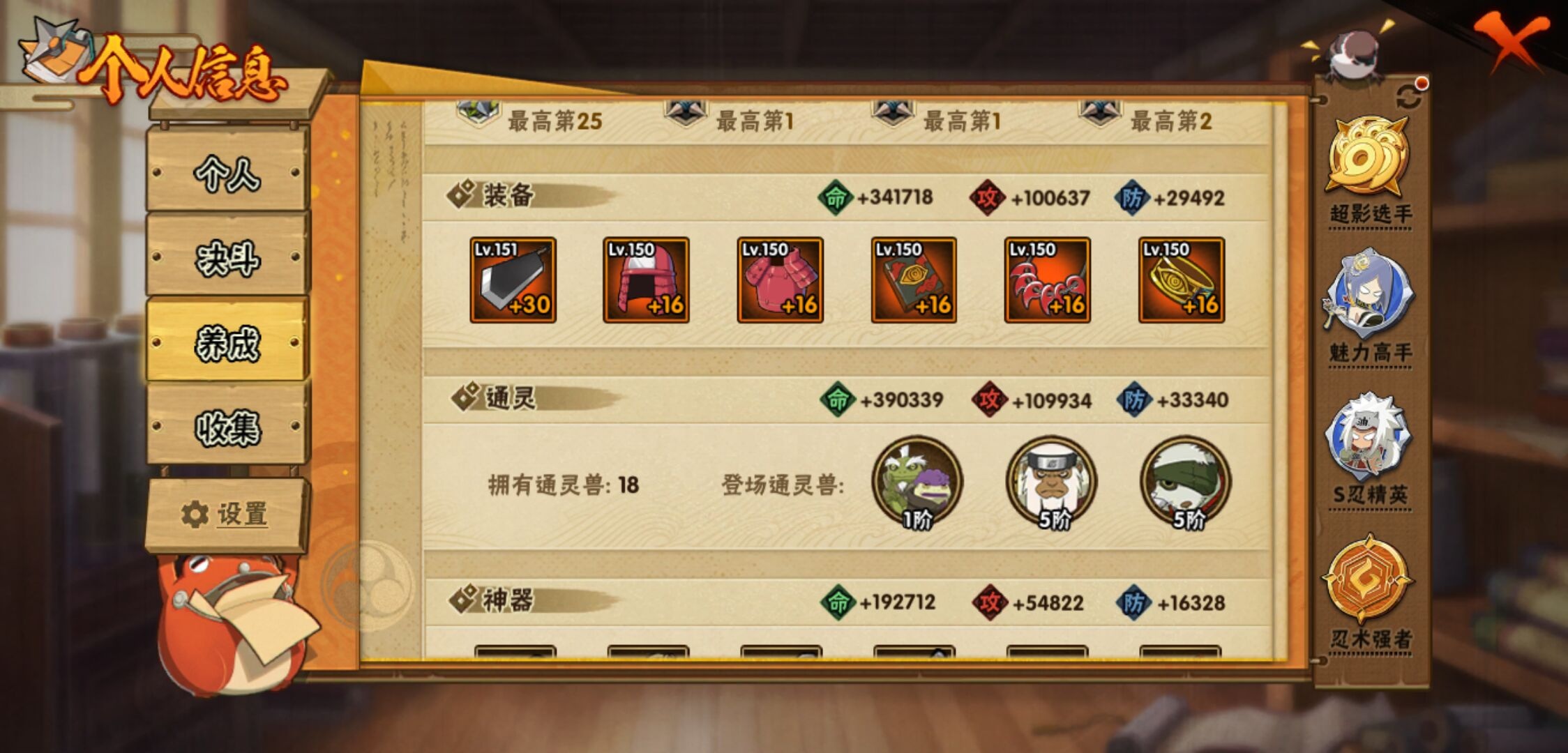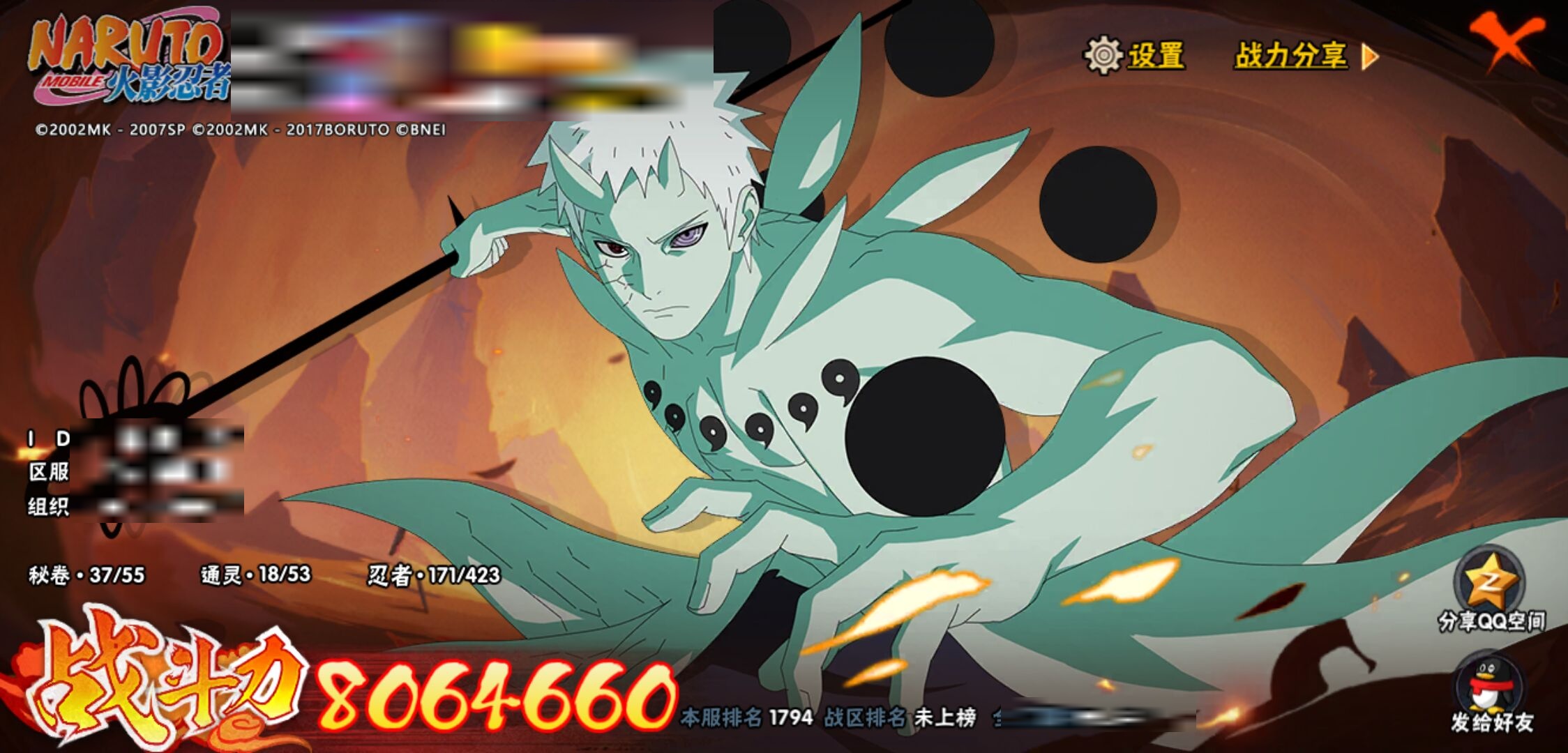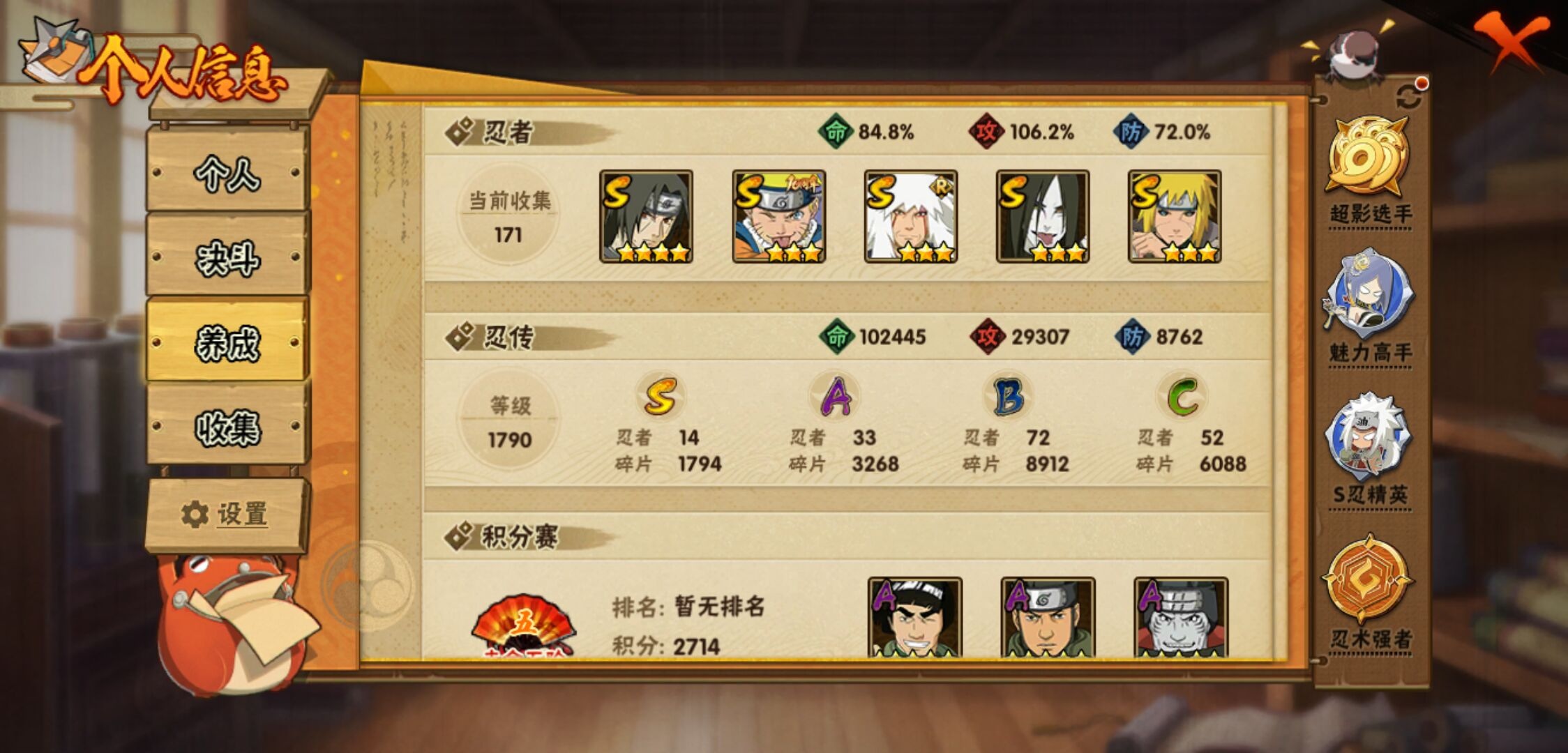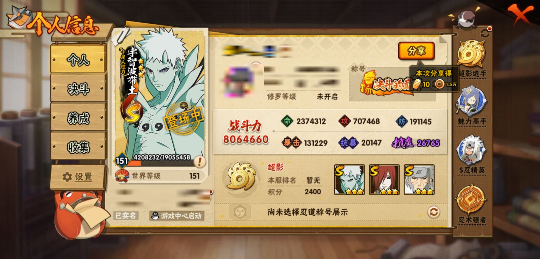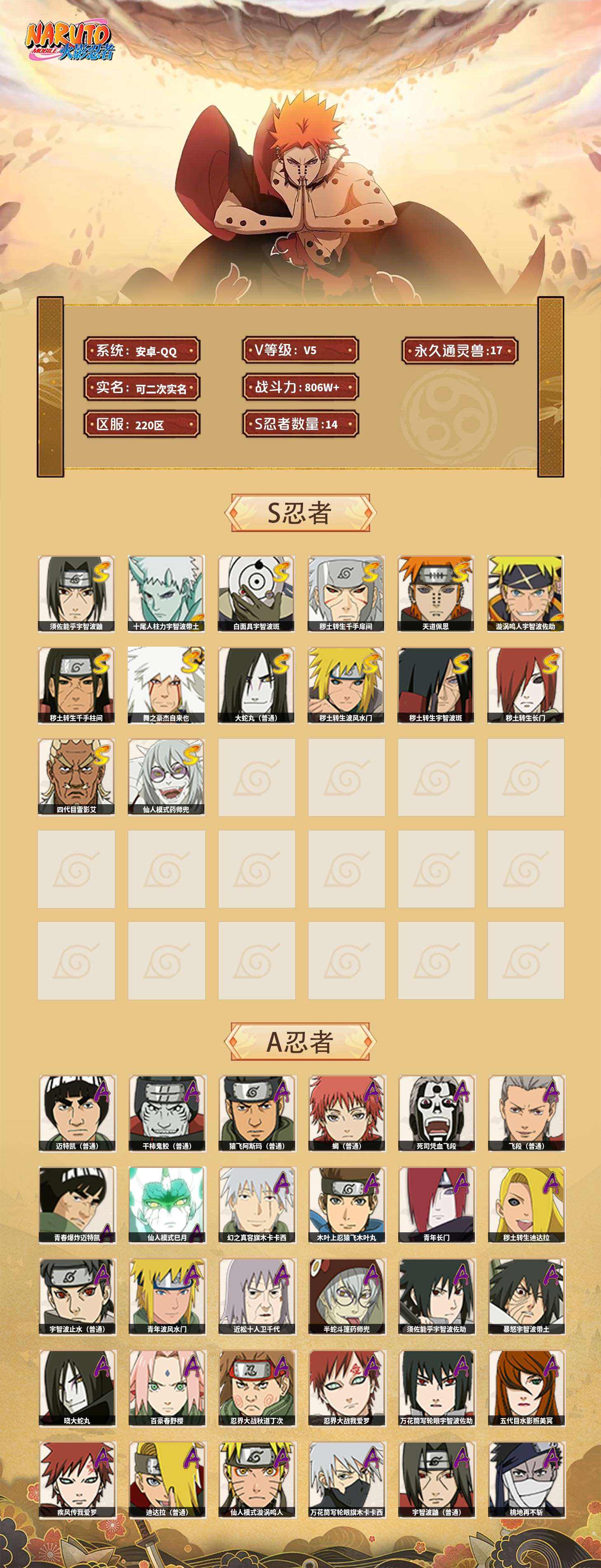 【火影忍者】【lyhy11145】战斗力:806w;段位:超影;本服排名:1794;vip:v5级;s忍:14个;a忍:33个;通灵兽:17个,s忍:十尾人柱力宇智波带土|白面具宇智波斑|秽土转生千手扉间|天道佩恩|漩涡鸣人宇智波佐助|秽土转生千手柱间|舞之豪杰自来也|大蛇丸(普通)|秽土转生波风水门|秽土转生宇智波斑|须佐能乎宇智波鼬 4星|秽土转生长门|四代目雷影艾|仙人模式药师兜__a忍:青春爆炸迈特凯|仙人模式巳月|幻之真容旗木卡卡西|木叶上忍猿飞木叶丸|青年长门|秽土转生迪达拉|宇智波止水(普通)|青年波风水门|近松十人卫千代|半蛇斗篷药师兜|须佐能乎宇智波佐助|暴怒宇智波带土|晓大蛇丸|百豪春野樱|忍界大战秋道丁次|忍界大战我爱罗|万花筒写轮眼宇智波佐助|五代目水影照美冥|死司凭血飞段 3星|疾风传我爱罗|迪达拉(普通)|飞段(普通) 3星|仙人模式漩涡鸣人|万花筒写轮眼旗木卡卡西|迈特凯(普通) 5星|宇智波鼬(普通)|干柿鬼鲛(普通) 5星|桃地再不斩|蝎(普通) 4星|猿飞阿斯玛(普通) 5星|最终章日向雏田|不缘|宇智波泉奈__通灵兽:忍犬(普通)|蓝蛇|蛤蟆吉|忍龟|镰鼬|猿魔|山椒鱼|蜃|蛤蟆仙人|鲛鲨|蛤蟆健|乌鸦(普通)|蛤蟆龙|蛤蟆广|辛牙|梦貘|砂之守鹤