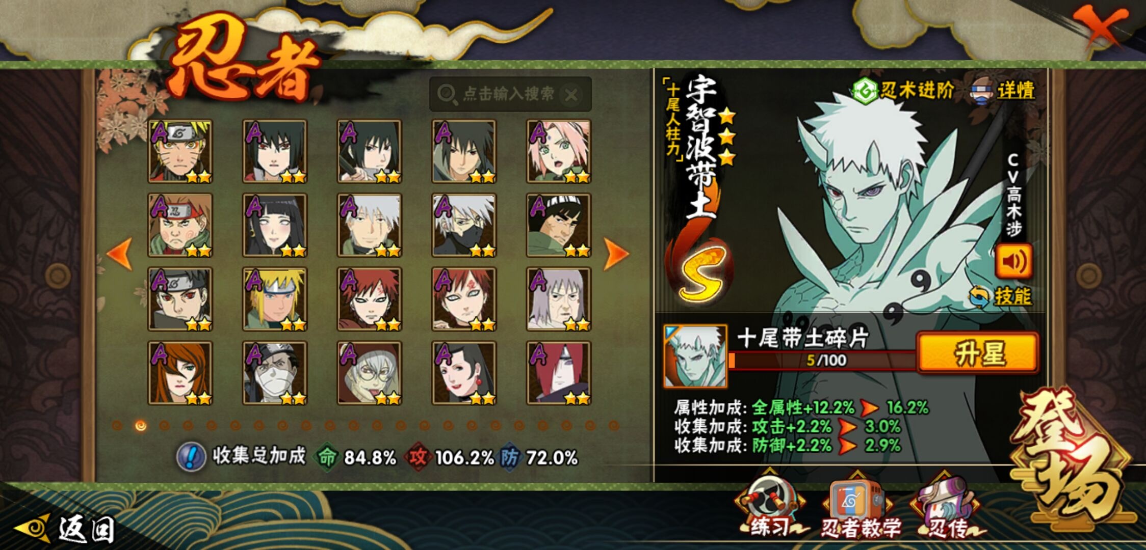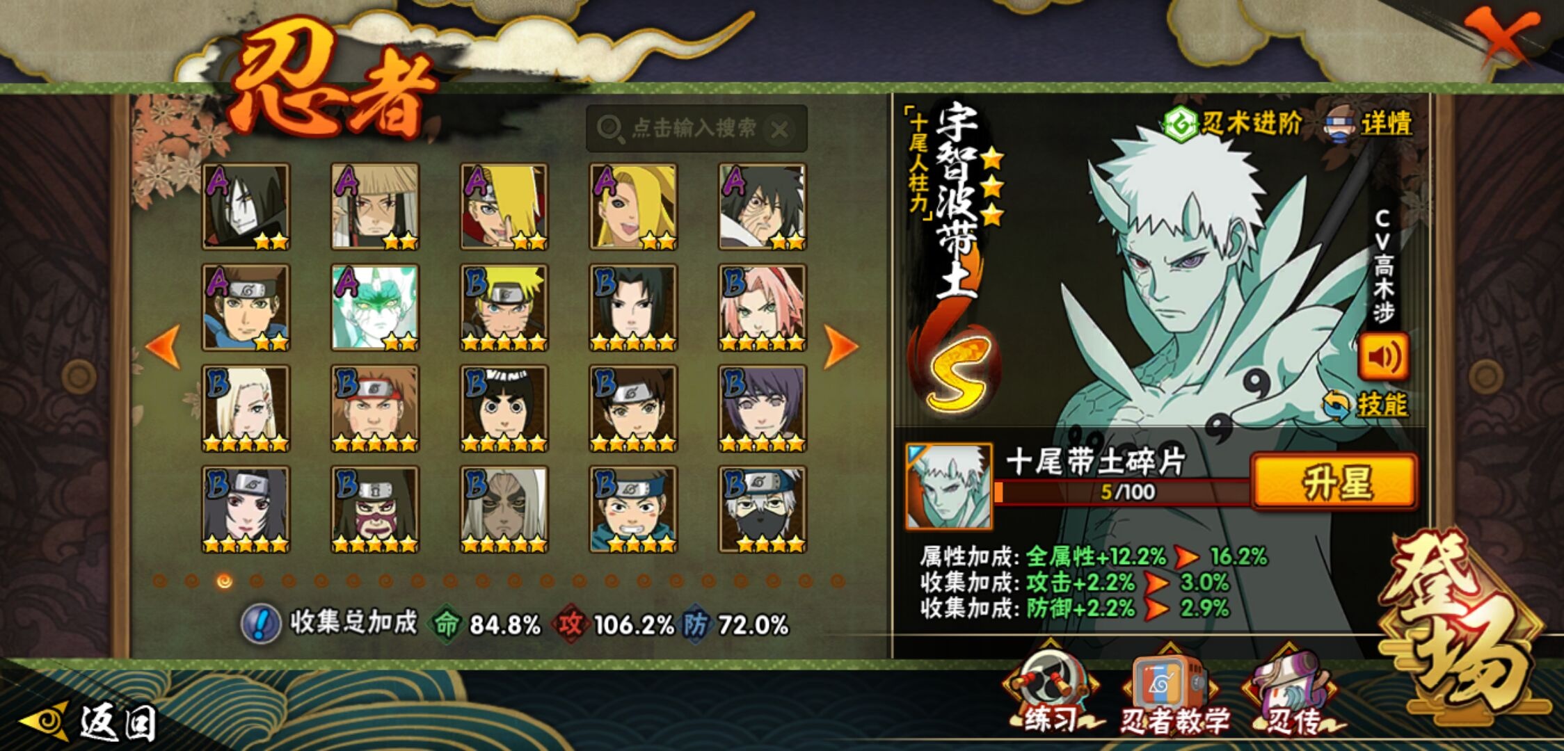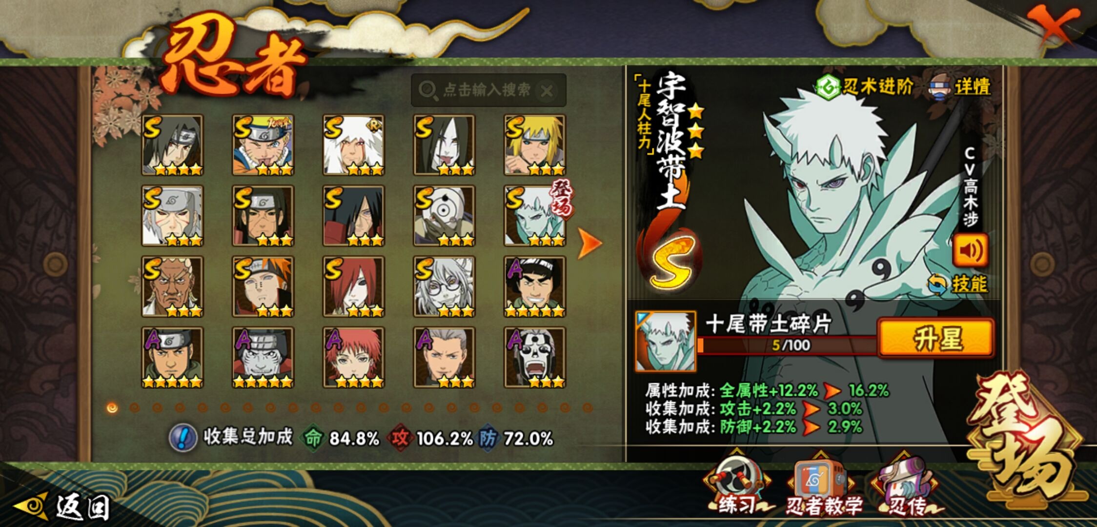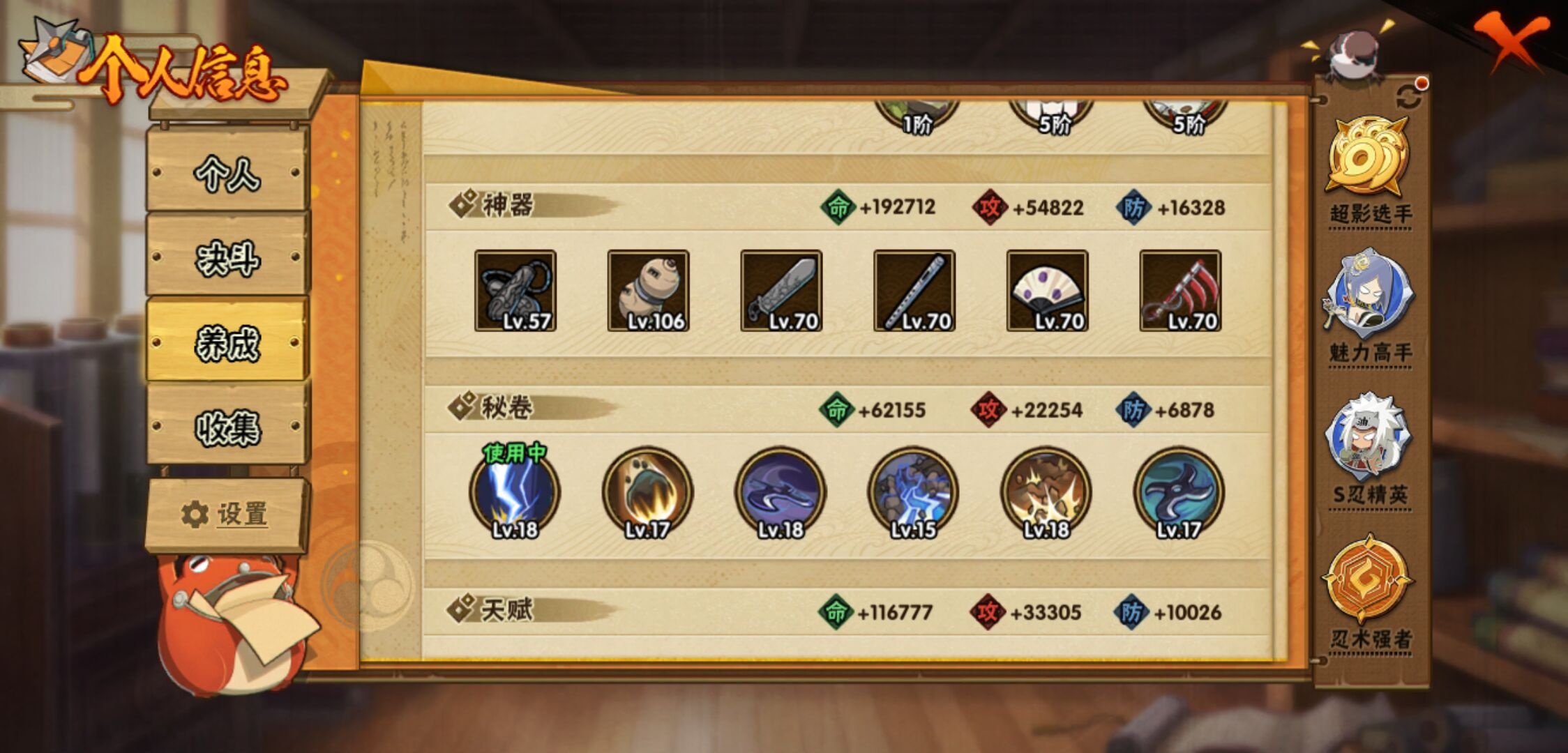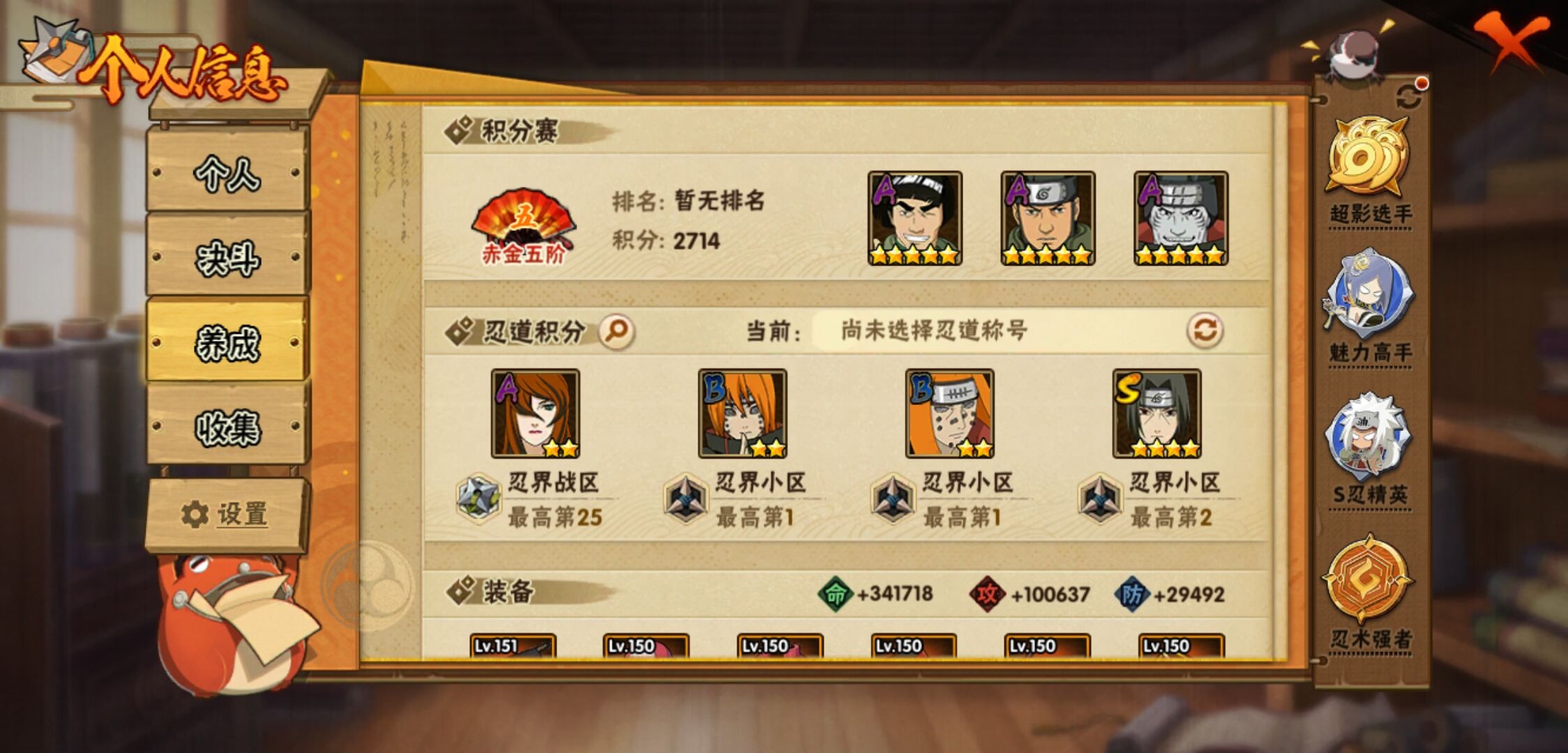 【火影忍者】【lyhy11145】战斗力:806w;段位:超影;本服排名:1794;vip:v5级;s忍:14个;a忍:33个;通灵兽:17个,s忍:十尾人柱力宇智波带土|白面具宇智波斑|秽土转生千手扉间|天道佩恩|漩涡鸣人宇智波佐助|秽土转生千手柱间|舞之豪杰自来也|大蛇丸(普通)|秽土转生波风水门|秽土转生宇智波斑|须佐能乎宇智波鼬 4星|秽土转生长门|四代目雷影艾|仙人模式药师兜__a忍:青春爆炸迈特凯|仙人模式巳月|幻之真容旗木卡卡西|木叶上忍猿飞木叶丸|青年长门|秽土转生迪达拉|宇智波止水(普通)|青年波风水门|近松十人卫千代|半蛇斗篷药师兜|须佐能乎宇智波佐助|暴怒宇智波带土|晓大蛇丸|百豪春野樱|忍界大战秋道丁次|忍界大战我爱罗|万花筒写轮眼宇智波佐助|五代目水影照美冥|死司凭血飞段 3星|疾风传我爱罗|迪达拉(普通)|飞段(普通) 3星|仙人模式漩涡鸣人|万花筒写轮眼旗木卡卡西|迈特凯(普通) 5星|宇智波鼬(普通)|干柿鬼鲛(普通) 5星|桃地再不斩|蝎(普通) 4星|猿飞阿斯玛(普通) 5星|最终章日向雏田|不缘|宇智波泉奈__通灵兽:忍犬(普通)|蓝蛇|蛤蟆吉|忍龟|镰鼬|猿魔|山椒鱼|蜃|蛤蟆仙人|鲛鲨|蛤蟆健|乌鸦(普通)|蛤蟆龙|蛤蟆广|辛牙|梦貘|砂之守鹤