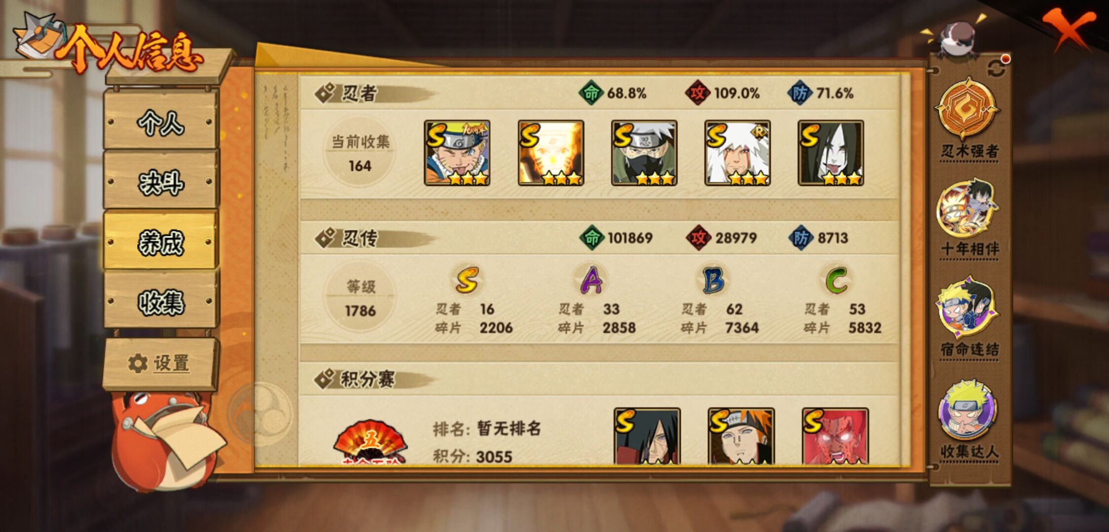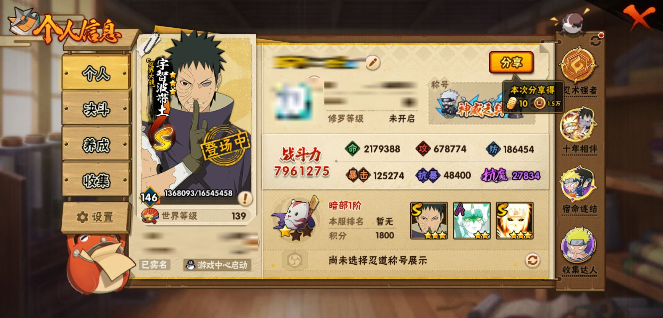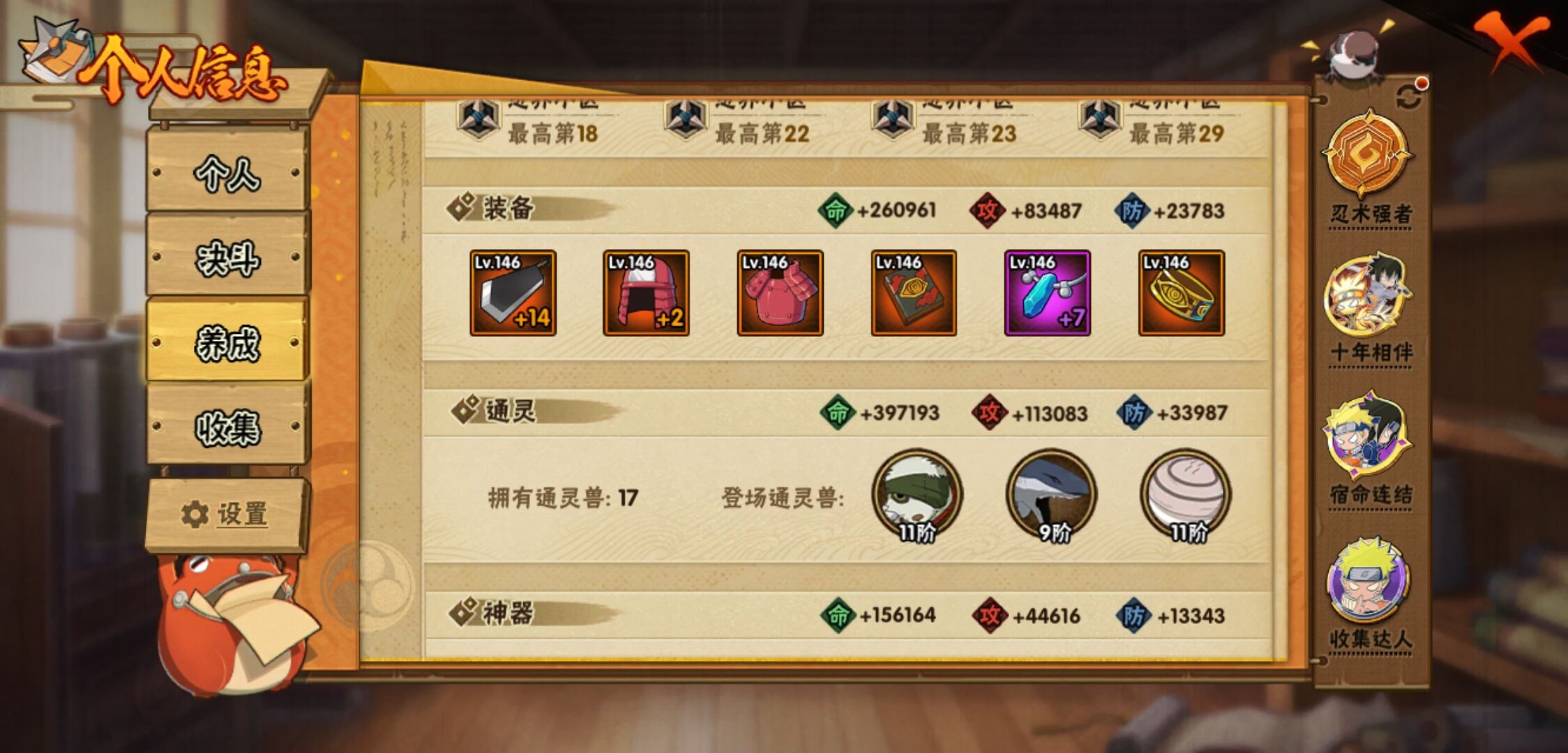 【火影忍者】【lyhy11157】战斗力:796w;段位:暗部1阶;本服排名:464;vip:v11级;s忍:16个;a忍:33个;通灵兽:17个,s忍:忍界大战宇智波带土|须佐能乎旗木卡卡西|九喇嘛连结波风水门|天道佩恩|漩涡鸣人宇智波佐助|须佐能乎宇智波止水|秽土转生千手柱间|舞之豪杰自来也|大蛇丸(普通)|波风水门|秽土转生宇智波斑|须佐能乎宇智波鼬|红夜之刃神秘面具男|死门迈特凯|九喇嘛连结漩涡鸣人|博人传大筒木金式__a忍:青春爆炸迈特凯|仙人模式巳月|幻之真容旗木卡卡西|侠隐江湖药师兜|忍界大战李洛克|四代目土影黑土|青年长门|秽土转生迪达拉|青年波风水门|青年艾|近松十人卫千代|须佐能乎宇智波佐助|晓大蛇丸|忍界大战秋道丁次|奇拉比(普通)|万花筒写轮眼宇智波佐助|五代目水影照美冥|五代目雷影达鲁伊|死司凭血飞段|疾风传我爱罗 3星|飞段(普通) 3星|漂泊浪客小南|迈特凯(普通) 5星|夏日限定宇智波鼬|干柿鬼鲛(普通) 5星|秽土转生桃地再不斩|绯流琥蝎|蝎(普通)|猿飞阿斯玛(普通) 5星|宇智波泉奈|羁绊神农|初始形态机械鸣人|侠隐江湖大野木__通灵兽:忍犬(普通)|蓝蛇|蛤蟆吉|忍龟|镰鼬|砂之守鹤|猿魔|山椒鱼|蜃|蛤蟆仙人|鲛鲨|蛤蟆健|乌鸦(普通)|蛤蟆龙|蛞蝓(普通)|熊猫|蛤蟆广