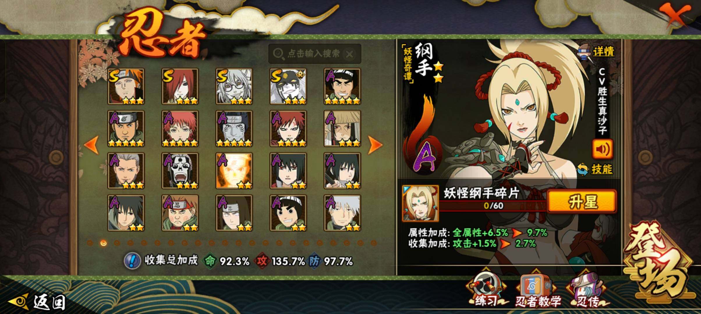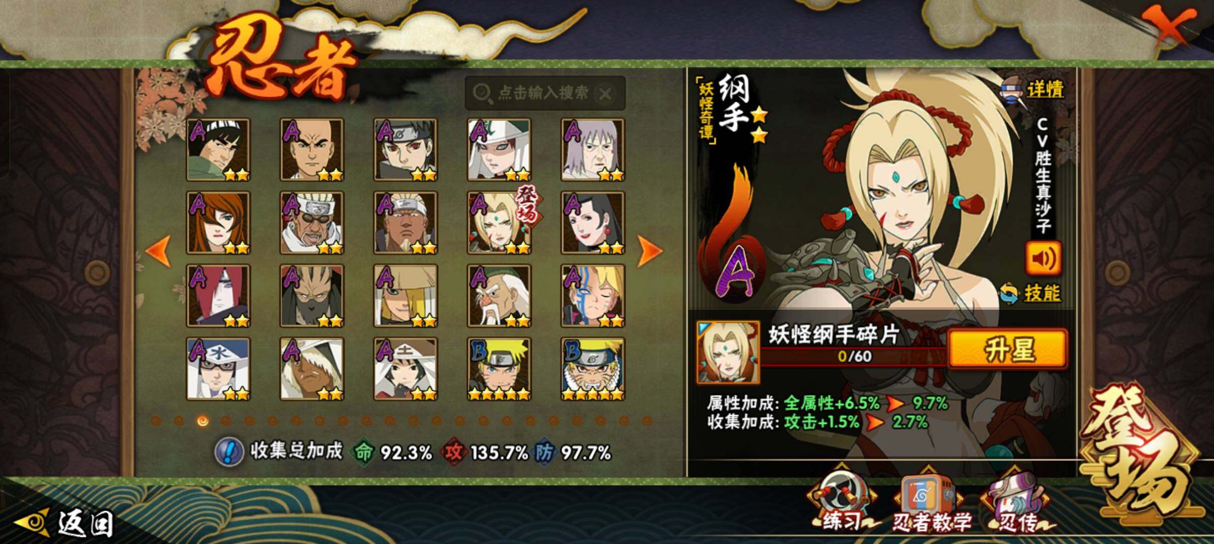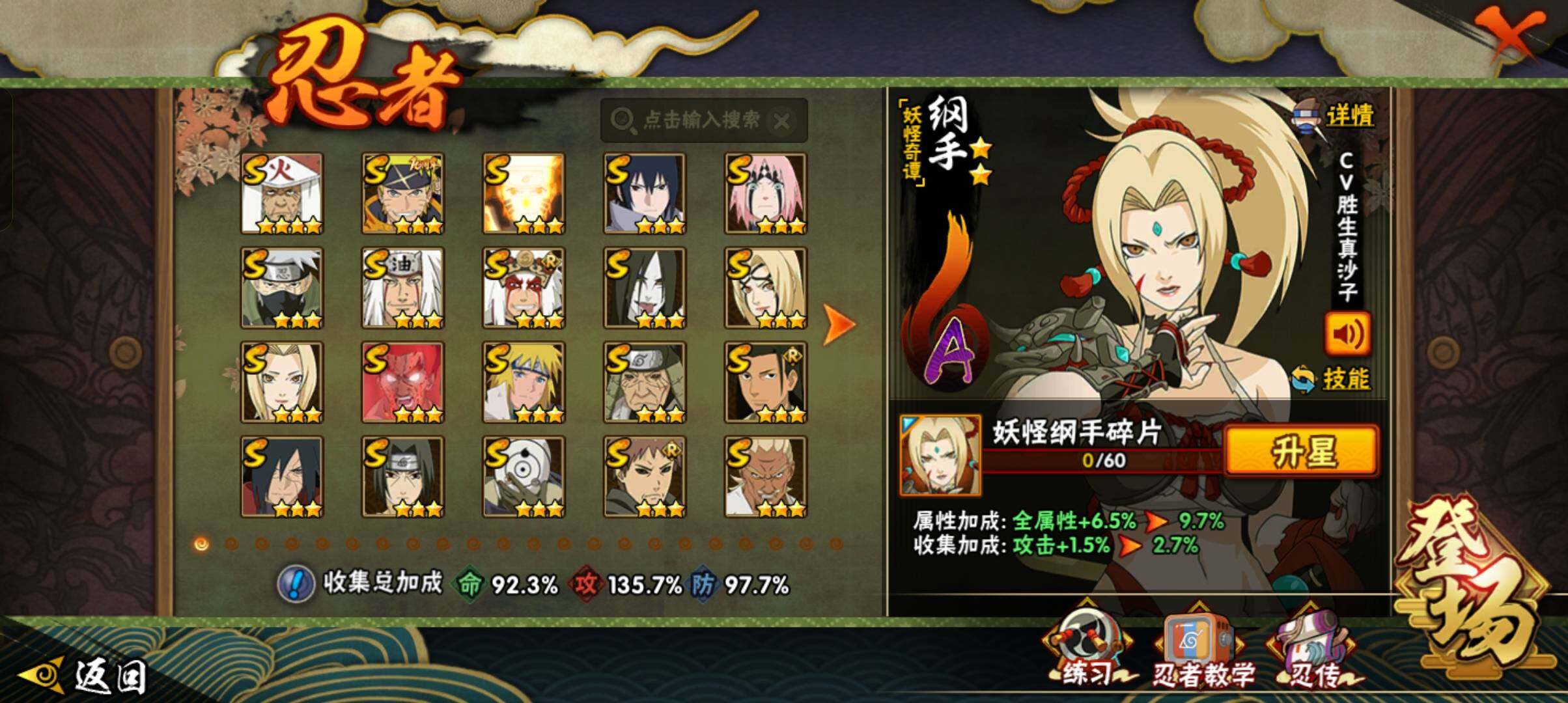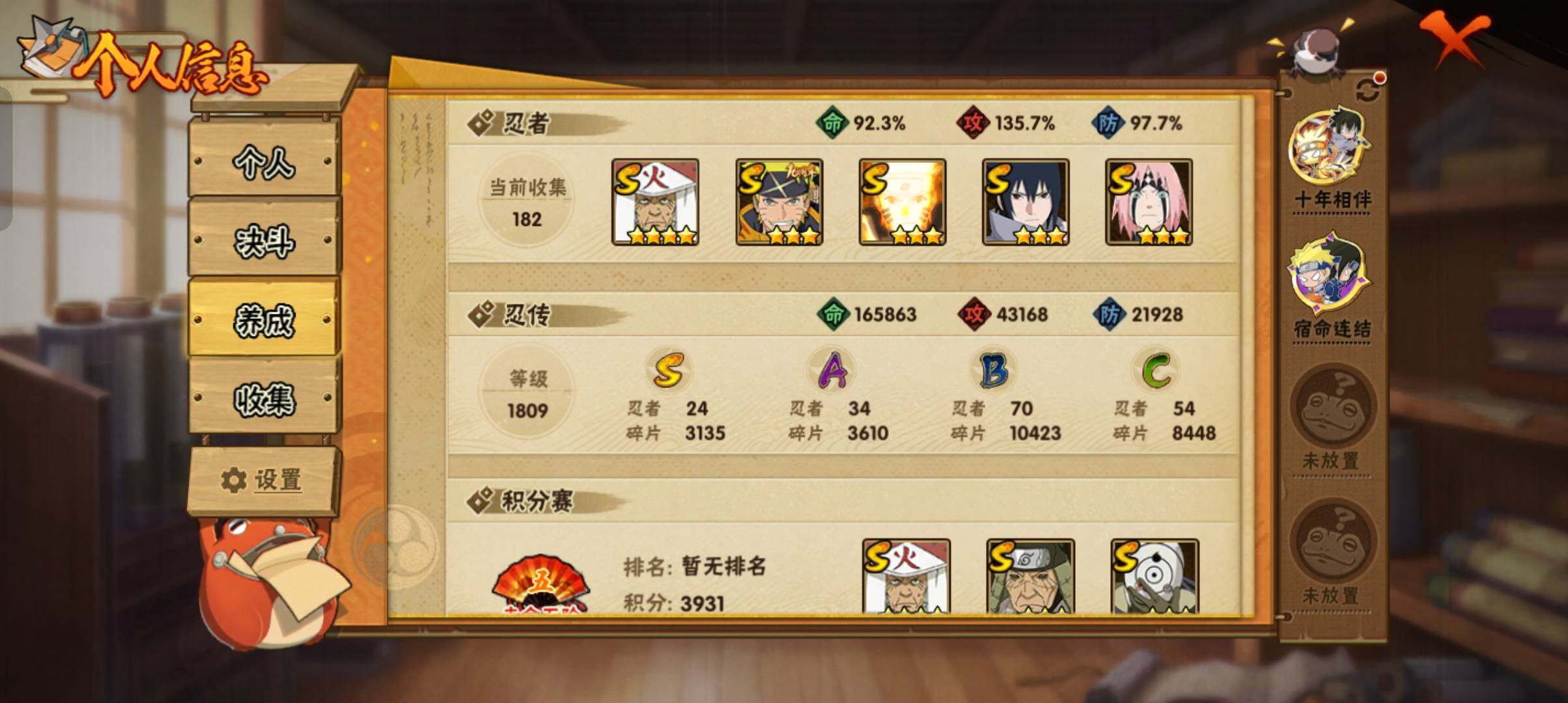 可二次,24s级忍者数-34a级忍者数,熊猫【s级忍者】:长门「秽土转生」3星,猿飞日斩「秽土转生」3星,宇智波斑「秽土转生·解」3星,春野樱「忍界大战」3星,艾「忍界大战」3星,宇智波鼬「须佐能乎」3星,旗木卡卡西「须佐能乎」3星,千手柱间「木叶创立」3星,罗砂「四代目风影」3星,自来也3星,自来也「舞之豪杰」3星,大蛇丸3星,纲手3星,纲手「百豪」3星,猿飞日斩4星,波风水门3星,药师兜「仙人模式」3星,漩涡鸣人「九喇嘛连结」3星,迈特凯「死门」3星,佩恩「天道」3星,宇智波佐助「永恒万花筒」3星,宇智波斑 「白面具」3星宇智波斑「白面具」,大筒木桃式3星,漩涡鸣人·宇智波佐助3星【a级忍者】:艾「青年」2星,长门「青年」2星,达鲁伊「博人传」2星,迪达拉2星,奇拉比2星,飞段3星,飞段「死司凭血」3星,干柿鬼鲛5星,漩涡博人「桃式显现」2星,漩涡鸣人「九尾查克拉」2星,迈特凯5星,旗木卡卡西「幻之真容」2星,我爱罗「疾风传」4星,我爱罗「忍界大战」2星,蝎5星,蝎「绯流琥」2星,猿飞阿斯玛5星,宇智波止水2星,宇智波鼬3星,宇智波佐助「须佐能乎」2星,宇智波佐助「万花筒写轮眼」2星,照美冥「五代目水影」2星,日向宁次「忍界大战」2星,长十郎「六代目水影」2星,李洛克「忍界大战」2星,黑土「博人传」2星,秋道丁次「忍界大战」2星,千代「近松十人卫」2星,不缘2星,地陆2星,宇智波泉奈2星,大野木「侠隐江湖」2星,纲手「妖怪奇谭」2星,迈特凯「青春爆炸」2星【通灵兽】:忍犬,蓝蛇,蛤蟆吉,忍龟,镰鼬,猿魔,山椒鱼,蜃,蛤蟆仙人,乌鸦,鲛鲨,蛤蟆健,蛤蟆广,蛤蟆龙,蛞蝓,熊猫,砂之守鹤,怒鬼,怒鬼·无臂,怒鬼·爪,梦貘,零尾,辛牙【角色时装】:佩恩「天道」-百战,天天「峨眉宗师」-熊猫少女,长十郎「六代目水影」-飞瀑流泉,李洛克「截拳宗师」-龙的传人,大蛇丸-百战,波风水门-百战,达鲁伊「五代目雷影」-惊雷掠影,我爱罗「忍界大战」-风之守护,迪达拉-刹那的艺术,干柿鬼鲛-狂野鲛鲨,宇智波鼬-编织虚实,自来也「舞之豪杰」-蜀面豪杰,黑土「四代目土影」-烈土霓裳,漩涡鸣人·宇智波佐助-宿命连结,春野樱「百豪」-绯樱绽放,干柿鬼鲛-血雾怪人,波风水门-传说的光芒【永久主场景】:木叶周年庆