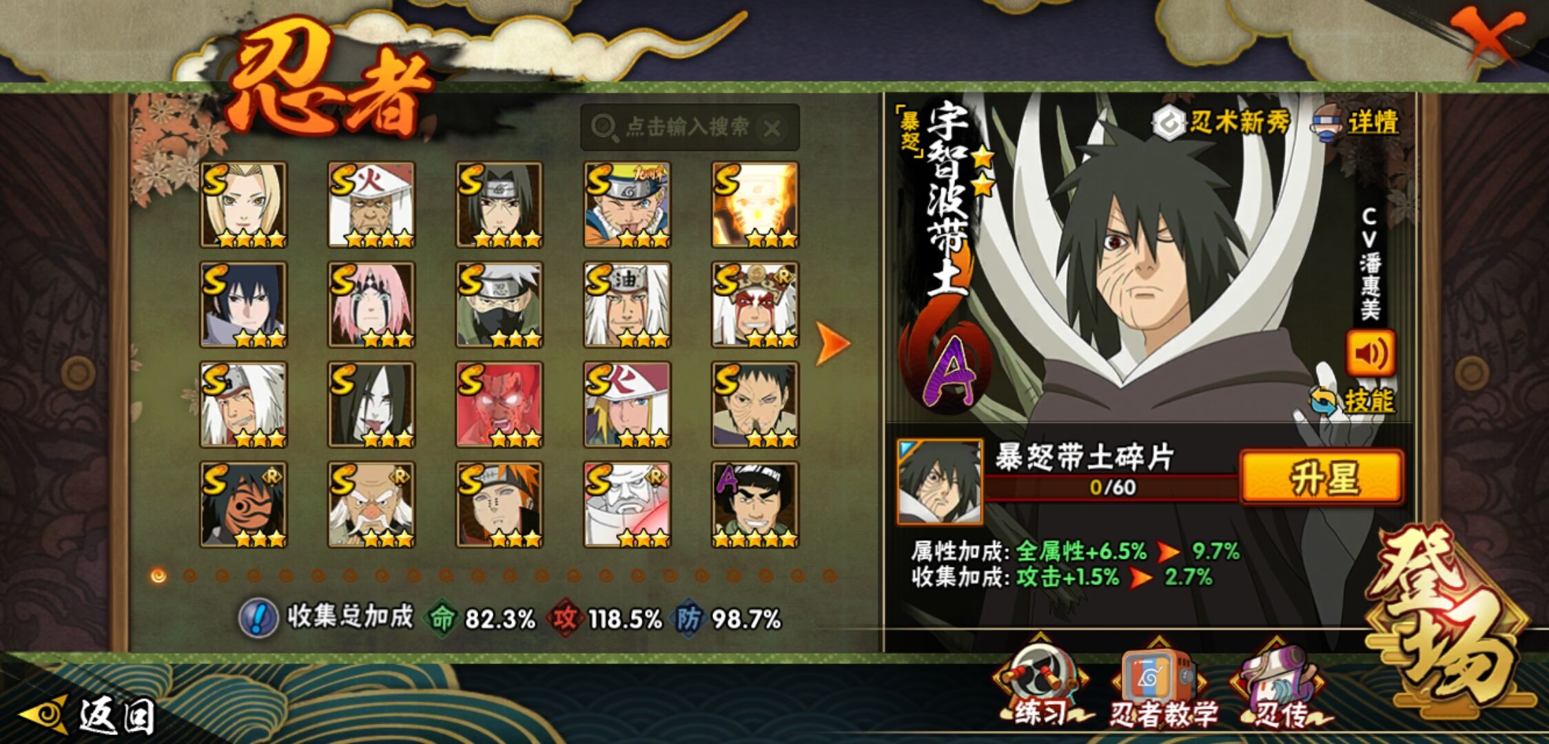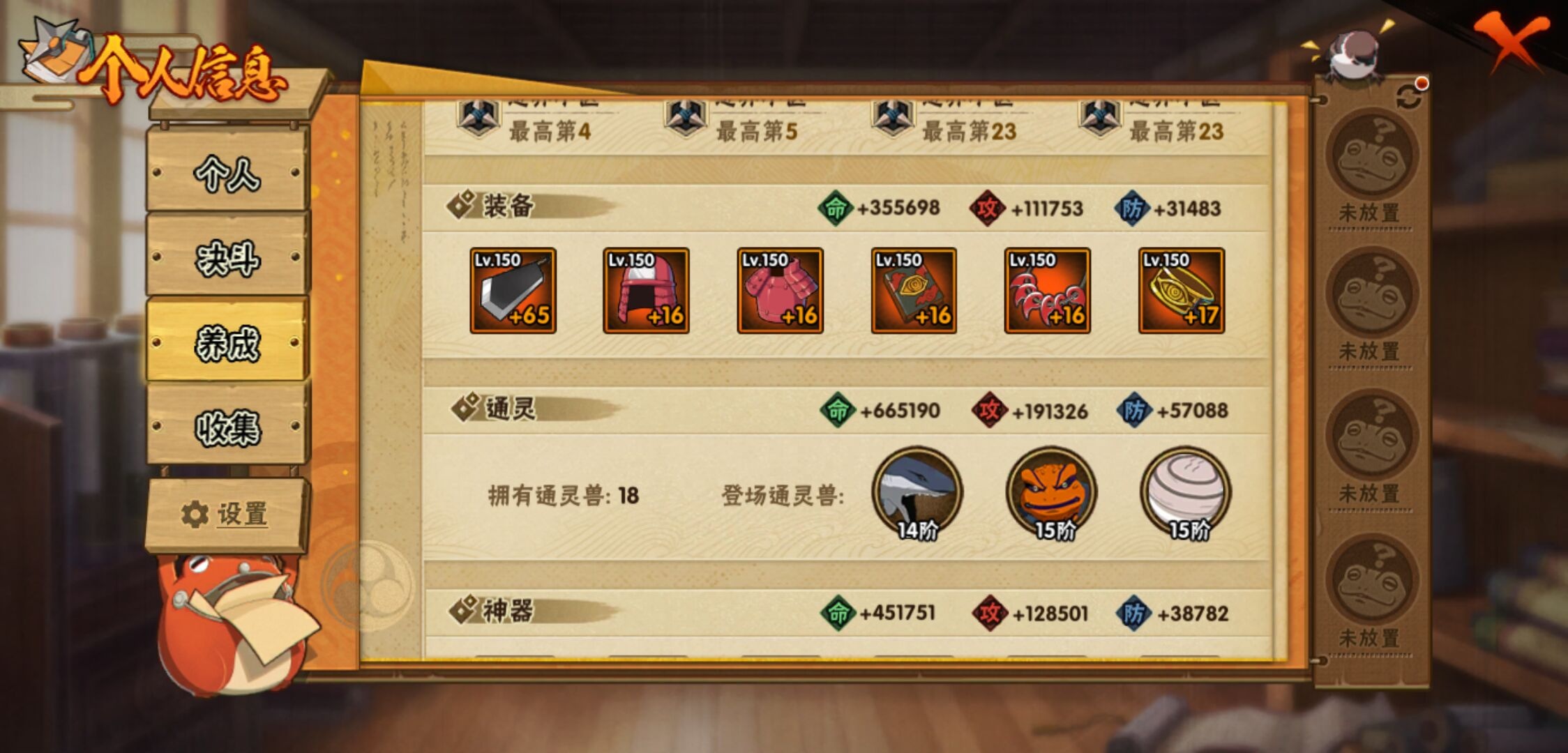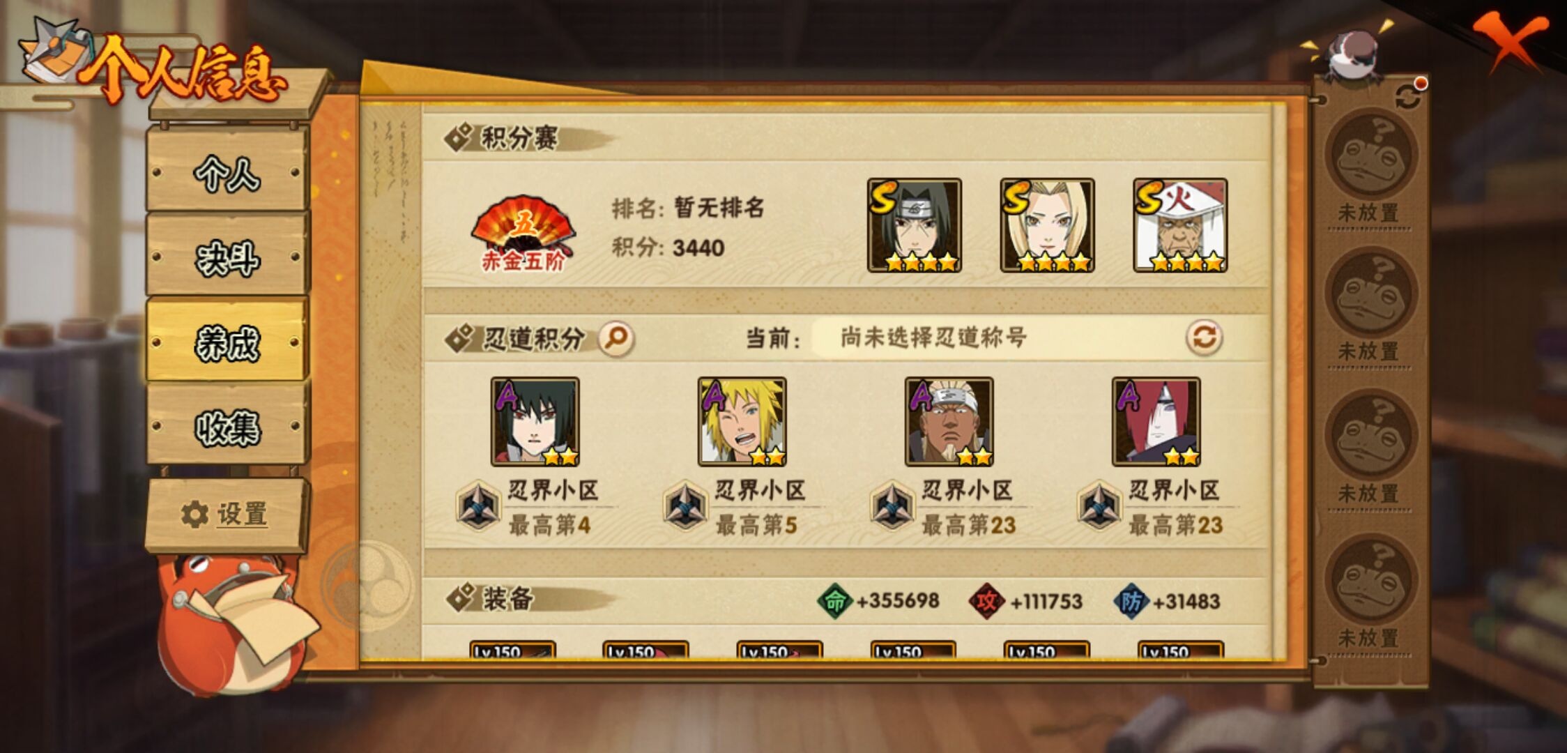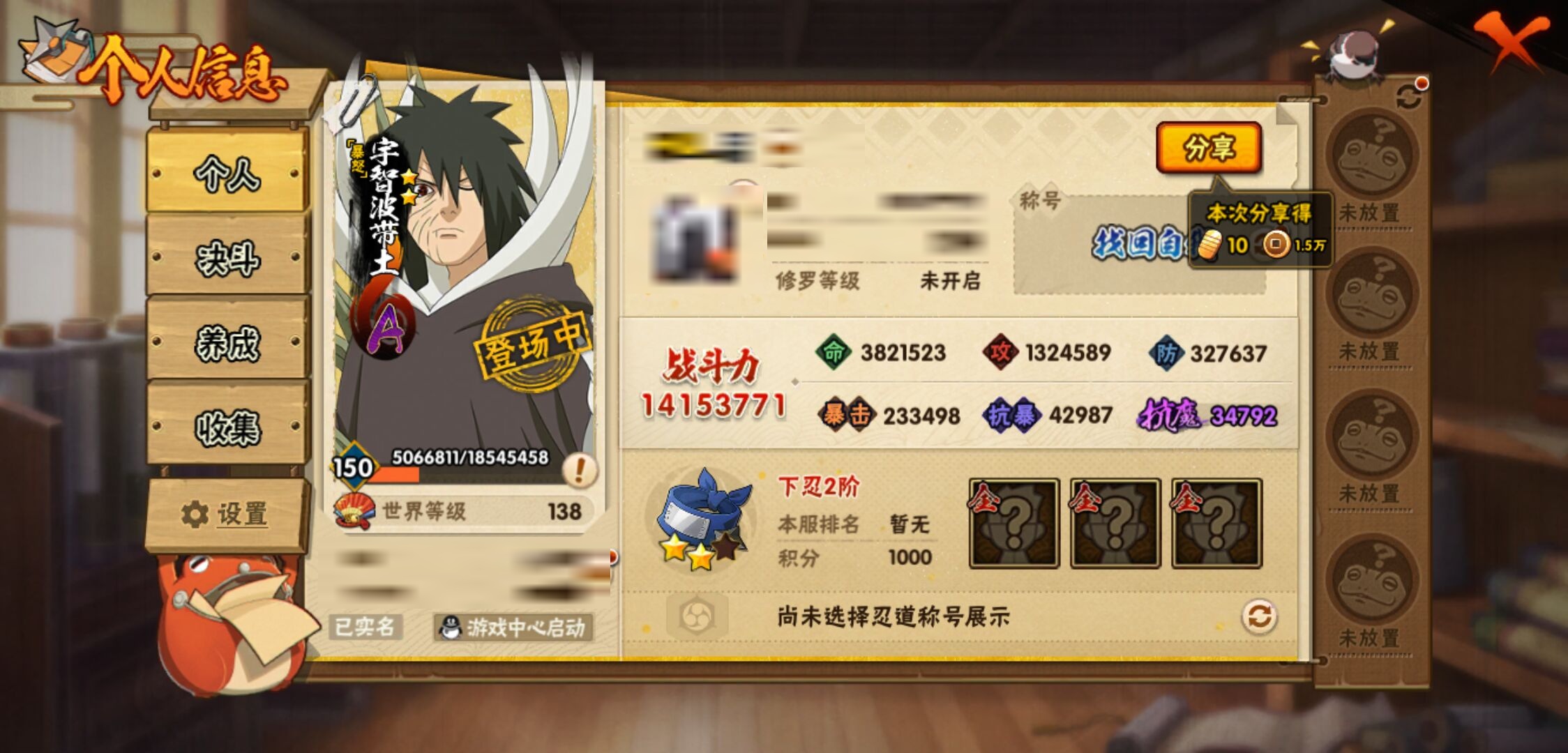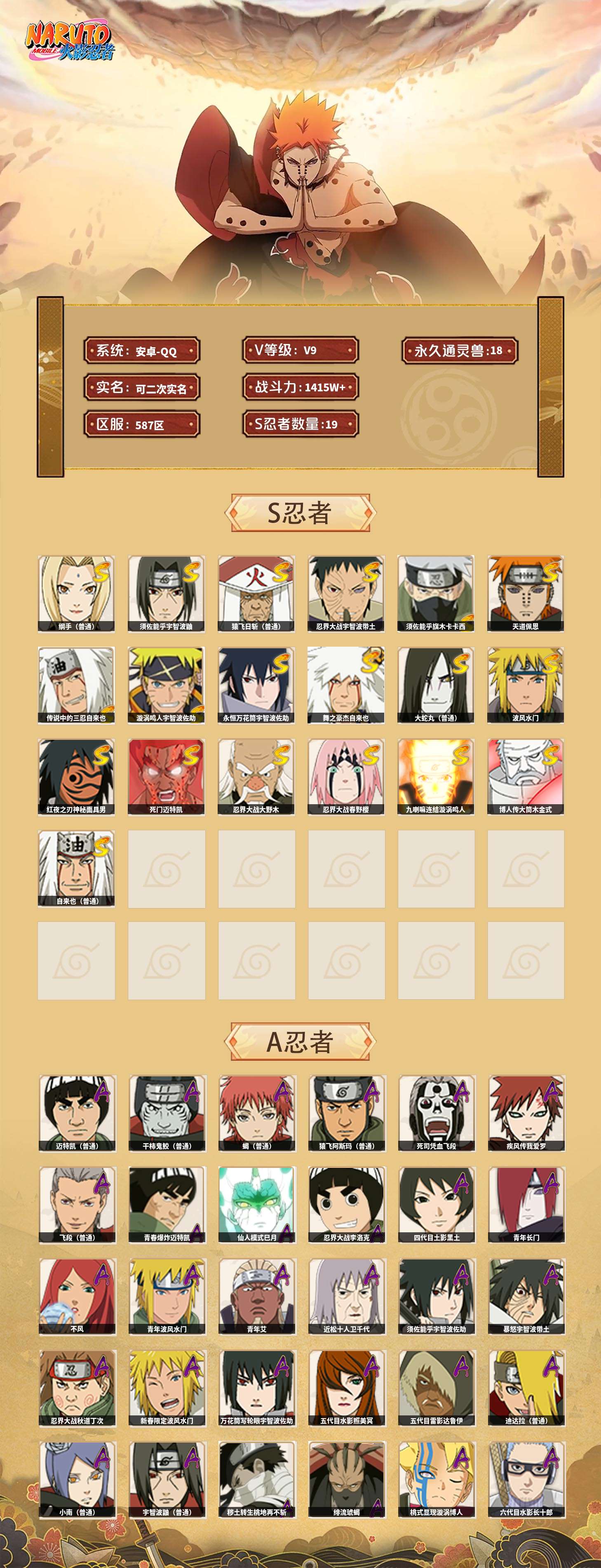 【火影忍者】【lyhy11178】战斗力:1415w;段位:下忍2阶;本服排名:85;vip:v9级;s忍:19个;a忍:33个;通灵兽:18个,s忍:忍界大战宇智波带土|须佐能乎旗木卡卡西|天道佩恩|传说中的三忍自来也|漩涡鸣人宇智波佐助|永恒万花筒宇智波佐助|舞之豪杰自来也|大蛇丸(普通)|纲手(普通) 4星|波风水门|须佐能乎宇智波鼬 4星|红夜之刃神秘面具男|死门迈特凯|忍界大战大野木|忍界大战春野樱|九喇嘛连结漩涡鸣人|博人传大筒木金式|猿飞日斩(普通) 4星|自来也(普通)__a忍:青春爆炸迈特凯|仙人模式巳月|忍界大战李洛克|四代目土影黑土|青年长门|不风|青年波风水门|青年艾|近松十人卫千代|须佐能乎宇智波佐助|暴怒宇智波带土|忍界大战秋道丁次|新春限定波风水门|万花筒写轮眼宇智波佐助|五代目水影照美冥|五代目雷影达鲁伊|死司凭血飞段 3星|疾风传我爱罗 3星|迪达拉(普通)|飞段(普通) 3星|小南(普通)|迈特凯(普通) 5星|宇智波鼬(普通)|干柿鬼鲛(普通) 5星|秽土转生桃地再不斩|蝎(普通) 5星|绯流琥蝎|猿飞阿斯玛(普通) 5星|桃式显现漩涡博人|六代目水影长十郎|不缘|宇智波泉奈|忍界大战土台__通灵兽:忍犬(普通)|蓝蛇|砂之守鹤|蛤蟆吉|忍龟|镰鼬|猿魔|山椒鱼|蜃|蛤蟆仙人|鲛鲨|蛤蟆健|乌鸦(普通)|蛞蝓(普通)|蛤蟆龙|蛤蟆广|梦貘|鹰
