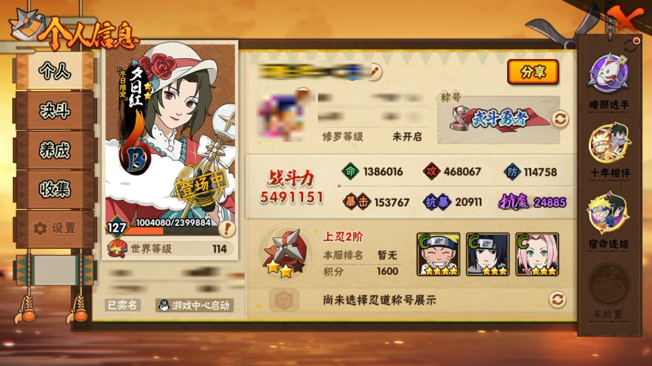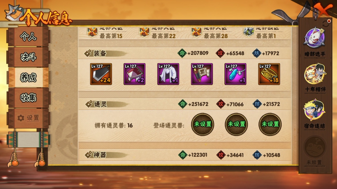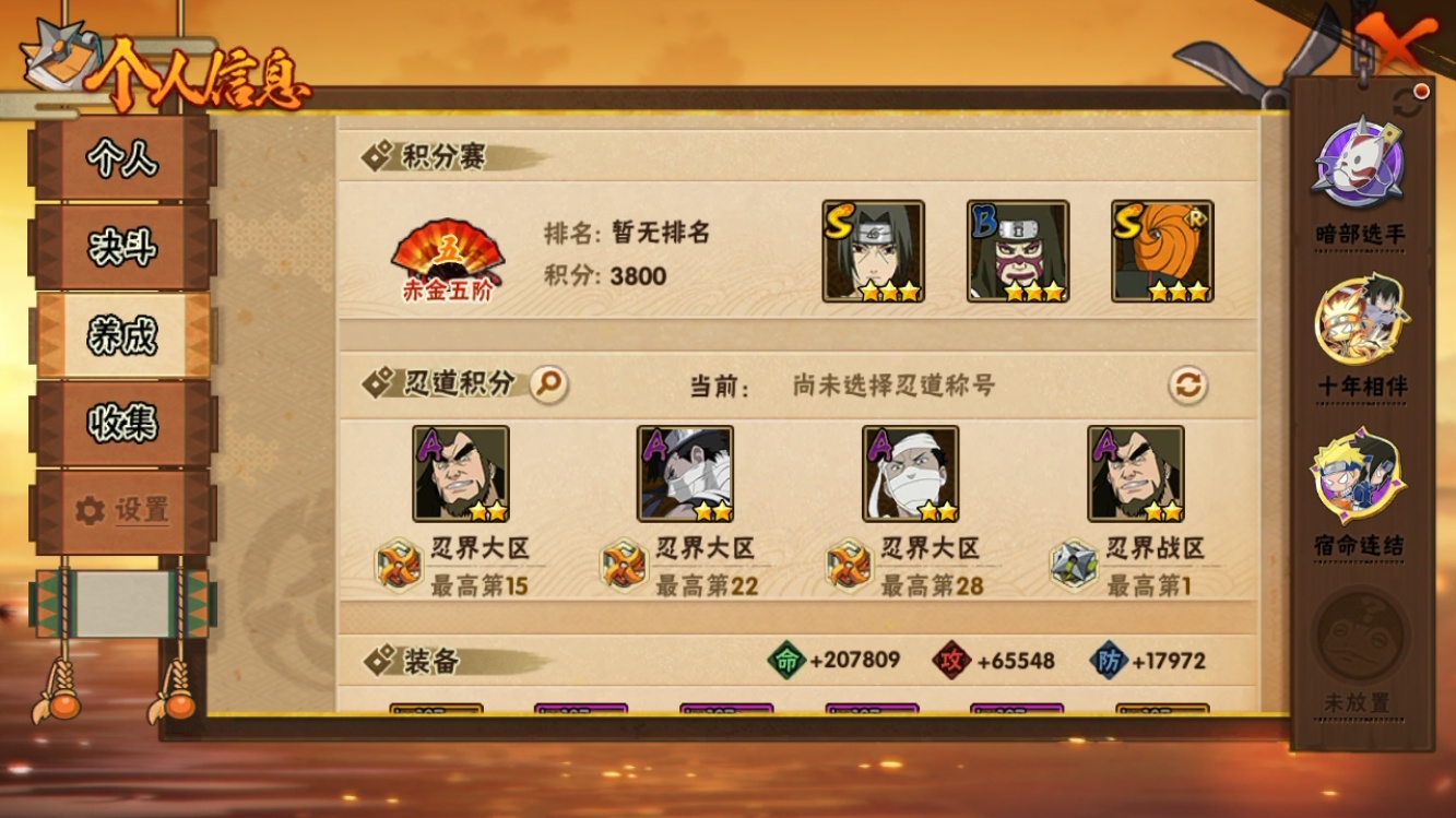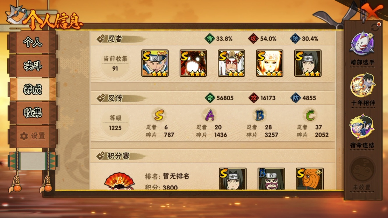 【火影忍者】【lyhy11170】战斗力:549w;段位:上忍2阶;vip:v9级;s忍:6个;a忍:20个;通灵兽:14个,s忍:九喇嘛连结波风水门|五影会谈宇智波斑|漩涡鸣人宇智波佐助|舞之豪杰自来也|须佐能乎宇智波鼬|暴怒第六尾漩涡鸣人__a忍:青春爆炸迈特凯|仙人模式巳月|幻之真容旗木卡卡西|四代目土影黑土|漂泊武士桃地再不斩|近松十人卫千代|暴怒宇智波带土|迪达拉(普通)|飞段(普通)|迈特凯(普通)|宇智波鼬(普通)|干柿鬼鲛(普通)|桃地再不斩|秽土转生桃地再不斩|蝎(普通)|猿飞阿斯玛(普通)|六代目水影长十郎|羁绊神农|忍界大战土台|初始形态机械鸣人__通灵兽:忍犬(普通)|蓝蛇|蛤蟆吉|砂之守鹤|忍龟|镰鼬|猿魔|山椒鱼|蜃|蛤蟆仙人|鲛鲨|蛤蟆健|蛞蝓(普通)|乌鸦(普通)