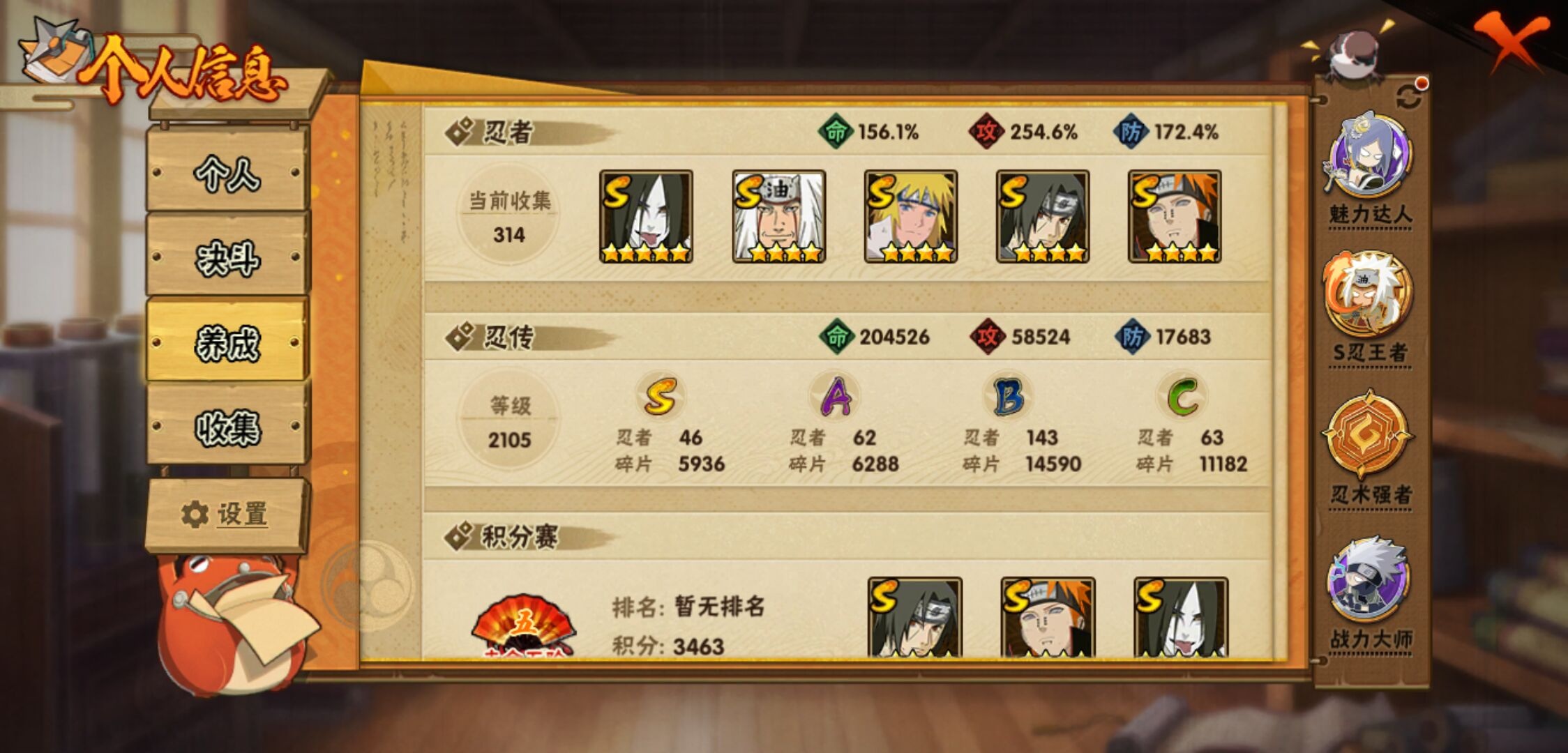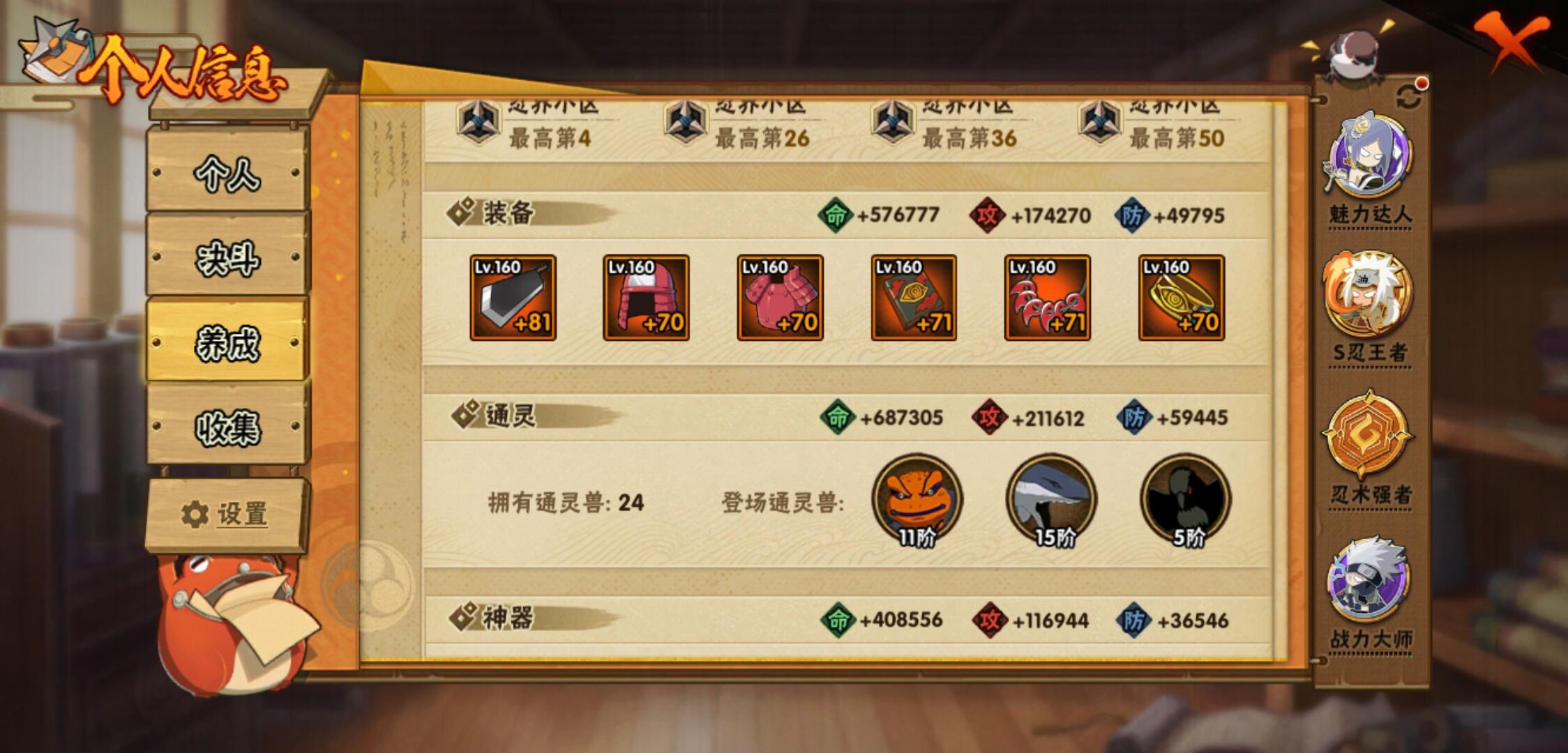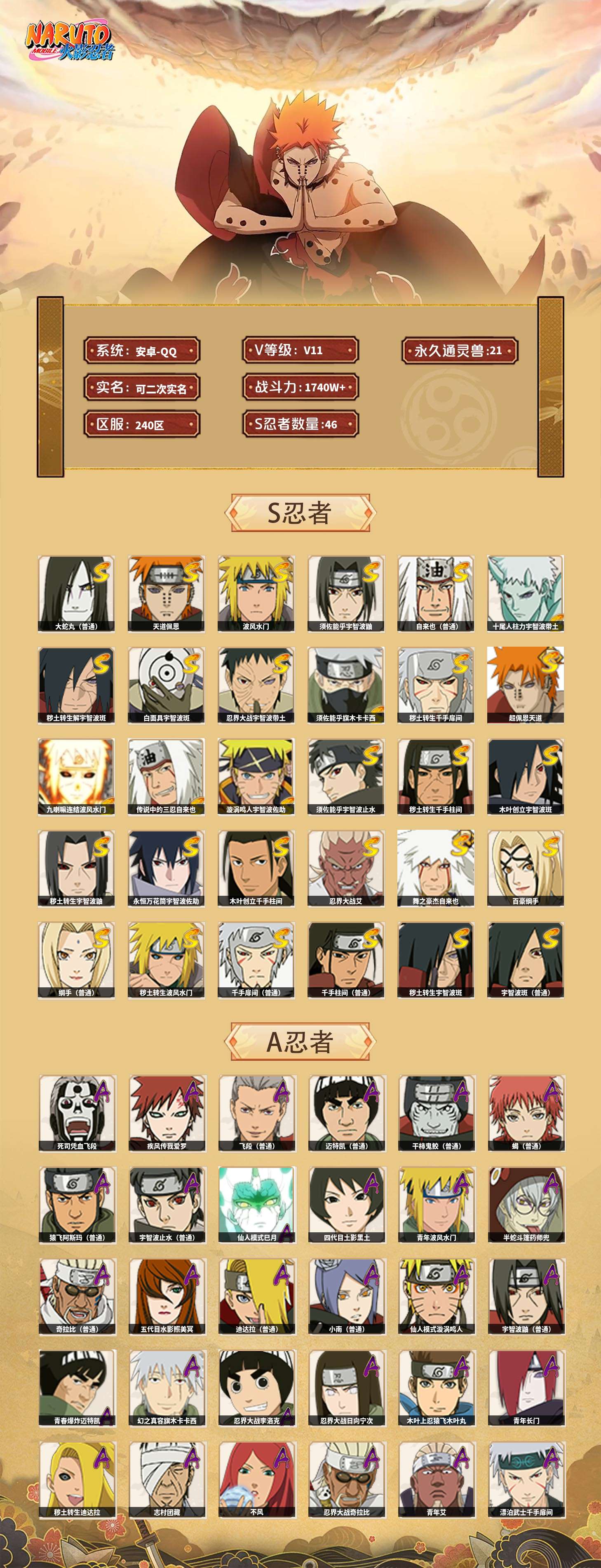 【火影忍者】【lyhy11188】战斗力:1740w;段位:中忍3阶;本服排名:339;vip:v11级;s忍:46个;a忍:62个;通灵兽:21个,s忍:十尾人柱力宇智波带土|秽土转生解宇智波斑|白面具宇智波斑|忍界大战宇智波带土|须佐能乎旗木卡卡西|秽土转生千手扉间|超佩恩天道|九喇嘛连结波风水门|天道佩恩 4星|传说中的三忍自来也|漩涡鸣人宇智波佐助|须佐能乎宇智波止水|秽土转生千手柱间|木叶创立宇智波斑|秽土转生宇智波鼬|永恒万花筒宇智波佐助|木叶创立千手柱间|忍界大战艾|舞之豪杰自来也|大蛇丸(普通) 5星|百豪纲手|纲手(普通)|波风水门 4星|秽土转生波风水门|千手扉间(普通)|千手柱间(普通)|秽土转生宇智波斑|宇智波斑(普通)|须佐能乎宇智波鼬 4星|神秘面具男(普通)|红夜之刃神秘面具男|秽土转生长门|秽土转生三代目风影|三代目雷影艾|四代目雷影艾|四代目风影罗砂|仙人模式药师兜|死门迈特凯|忍界大战大野木|忍界大战春野樱|九喇嘛连结漩涡鸣人|博人传大筒木金式|大筒木桃式|猿飞日斩(普通)|秽土转生猿飞日斩|自来也(普通) 4星__a忍:青春爆炸迈特凯|仙人模式巳月 3星|幻之真容旗木卡卡西|忍界大战李洛克|忍界大战日向宁次|四代目土影黑土 3星|木叶上忍猿飞木叶丸|青年长门|秽土转生迪达拉|志村团藏|宇智波止水(普通) 4星|不风|忍界大战奇拉比|青年波风水门 3星|青年艾|漂泊武士千手扉间|加藤断|近松十人卫千代|晓创生角都|半蛇斗篷药师兜 3星|须佐能乎宇智波佐助|九尾查克拉漩涡鸣人|晓大蛇丸|地陆|火影继承人猿飞日斩|百豪春野樱|忍界大战秋道丁次|忍界大战我爱罗|忍界大战勘九郎|秽土转生猿飞阿斯玛|奇拉比(普通) 3星|万花筒写轮眼宇智波佐助|五代目水影照美冥 3星|五代目雷影达鲁伊|死司凭血飞段 5星|角都(普通)|地怨虞角都|疾风传我爱罗 5星|迪达拉(普通) 3星|飞段(普通) 5星|小南(普通) 3星|漂泊浪客小南|仙人模式漩涡鸣人 3星|万花筒写轮眼旗木卡卡西|迈特凯(普通) 5星|宇智波鼬(普通) 3星|干柿鬼鲛(普通) 5星|秽土转生桃地再不斩|桃地再不斩|蝎(普通) 5星|绯流琥蝎|猿飞阿斯玛(普通) 5星|桃式显现漩涡博人|最终章日向雏田|六代目水影长十郎|不缘|不动|宇智波泉奈|羁绊神农|忍界大战土台|初始形态机械鸣人|侠隐江湖大野木__通灵兽:忍犬(普通)|蓝蛇|蛤蟆吉|忍龟|镰鼬|猿魔|山椒鱼|蜃|蛤蟆仙人|鲛鲨|蛤蟆健|乌鸦(普通)|蛤蟆龙|蛤蟆广|梦貘|砂之守鹤|蛞蝓(普通)|鹰|蜘蛛|怒鬼爪|辛牙