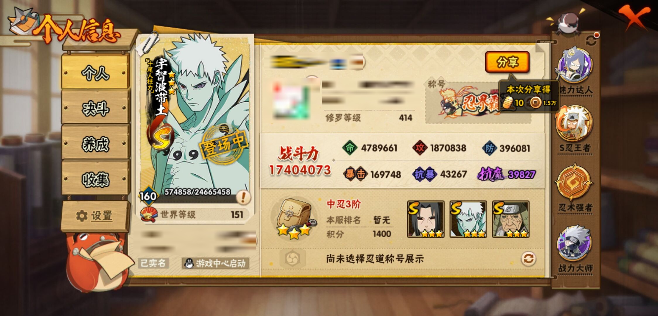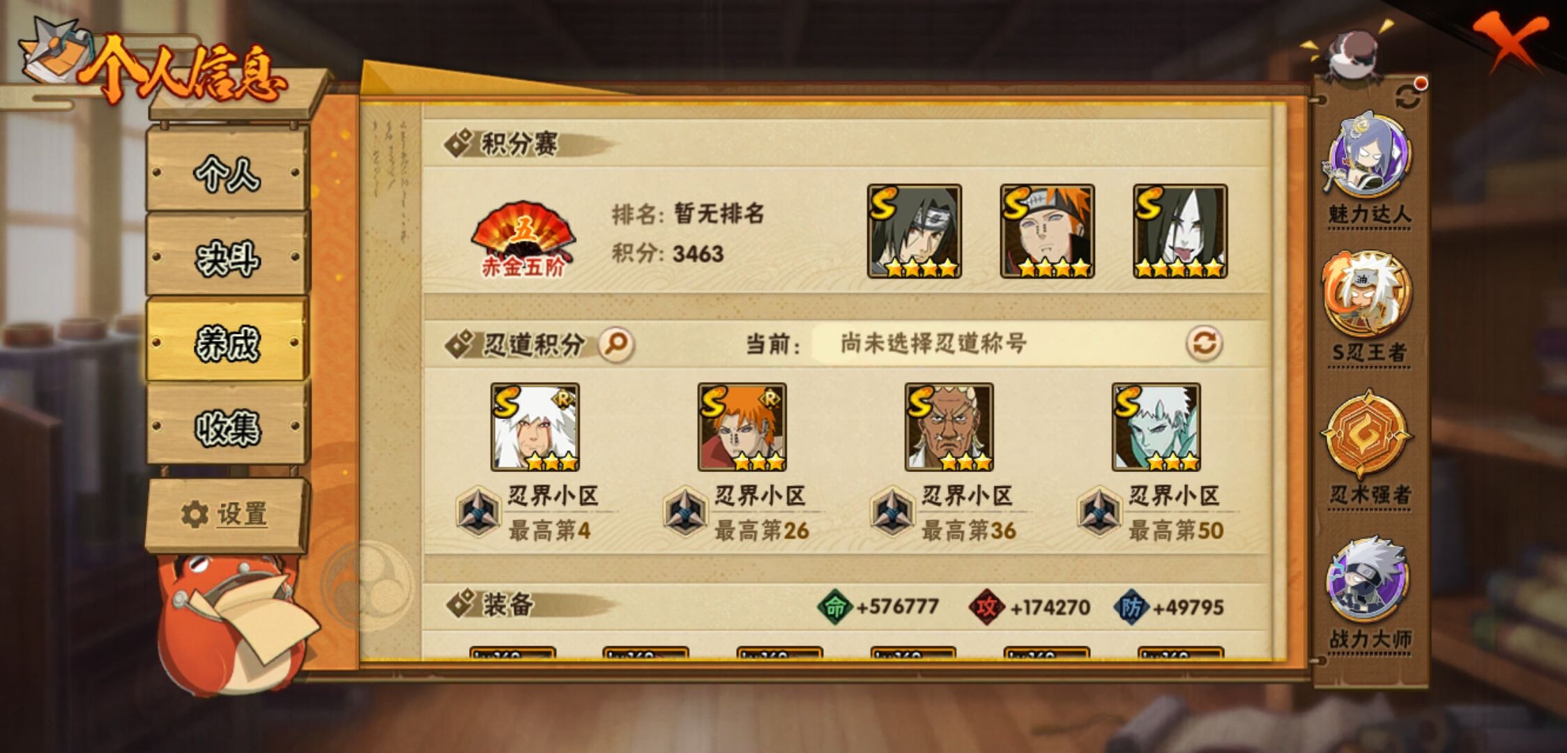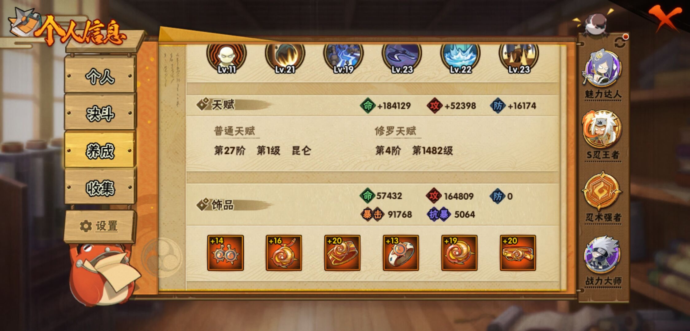 【火影忍者】【lyhy11188】战斗力:1740w;段位:中忍3阶;本服排名:339;vip:v11级;s忍:46个;a忍:62个;通灵兽:21个,s忍:十尾人柱力宇智波带土|秽土转生解宇智波斑|白面具宇智波斑|忍界大战宇智波带土|须佐能乎旗木卡卡西|秽土转生千手扉间|超佩恩天道|九喇嘛连结波风水门|天道佩恩 4星|传说中的三忍自来也|漩涡鸣人宇智波佐助|须佐能乎宇智波止水|秽土转生千手柱间|木叶创立宇智波斑|秽土转生宇智波鼬|永恒万花筒宇智波佐助|木叶创立千手柱间|忍界大战艾|舞之豪杰自来也|大蛇丸(普通) 5星|百豪纲手|纲手(普通)|波风水门 4星|秽土转生波风水门|千手扉间(普通)|千手柱间(普通)|秽土转生宇智波斑|宇智波斑(普通)|须佐能乎宇智波鼬 4星|神秘面具男(普通)|红夜之刃神秘面具男|秽土转生长门|秽土转生三代目风影|三代目雷影艾|四代目雷影艾|四代目风影罗砂|仙人模式药师兜|死门迈特凯|忍界大战大野木|忍界大战春野樱|九喇嘛连结漩涡鸣人|博人传大筒木金式|大筒木桃式|猿飞日斩(普通)|秽土转生猿飞日斩|自来也(普通) 4星__a忍:青春爆炸迈特凯|仙人模式巳月 3星|幻之真容旗木卡卡西|忍界大战李洛克|忍界大战日向宁次|四代目土影黑土 3星|木叶上忍猿飞木叶丸|青年长门|秽土转生迪达拉|志村团藏|宇智波止水(普通) 4星|不风|忍界大战奇拉比|青年波风水门 3星|青年艾|漂泊武士千手扉间|加藤断|近松十人卫千代|晓创生角都|半蛇斗篷药师兜 3星|须佐能乎宇智波佐助|九尾查克拉漩涡鸣人|晓大蛇丸|地陆|火影继承人猿飞日斩|百豪春野樱|忍界大战秋道丁次|忍界大战我爱罗|忍界大战勘九郎|秽土转生猿飞阿斯玛|奇拉比(普通) 3星|万花筒写轮眼宇智波佐助|五代目水影照美冥 3星|五代目雷影达鲁伊|死司凭血飞段 5星|角都(普通)|地怨虞角都|疾风传我爱罗 5星|迪达拉(普通) 3星|飞段(普通) 5星|小南(普通) 3星|漂泊浪客小南|仙人模式漩涡鸣人 3星|万花筒写轮眼旗木卡卡西|迈特凯(普通) 5星|宇智波鼬(普通) 3星|干柿鬼鲛(普通) 5星|秽土转生桃地再不斩|桃地再不斩|蝎(普通) 5星|绯流琥蝎|猿飞阿斯玛(普通) 5星|桃式显现漩涡博人|最终章日向雏田|六代目水影长十郎|不缘|不动|宇智波泉奈|羁绊神农|忍界大战土台|初始形态机械鸣人|侠隐江湖大野木__通灵兽:忍犬(普通)|蓝蛇|蛤蟆吉|忍龟|镰鼬|猿魔|山椒鱼|蜃|蛤蟆仙人|鲛鲨|蛤蟆健|乌鸦(普通)|蛤蟆龙|蛤蟆广|梦貘|砂之守鹤|蛞蝓(普通)|鹰|蜘蛛|怒鬼爪|辛牙