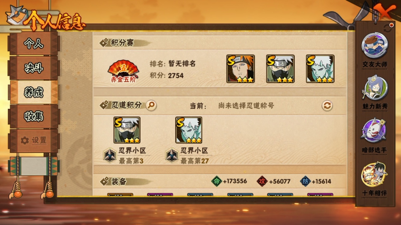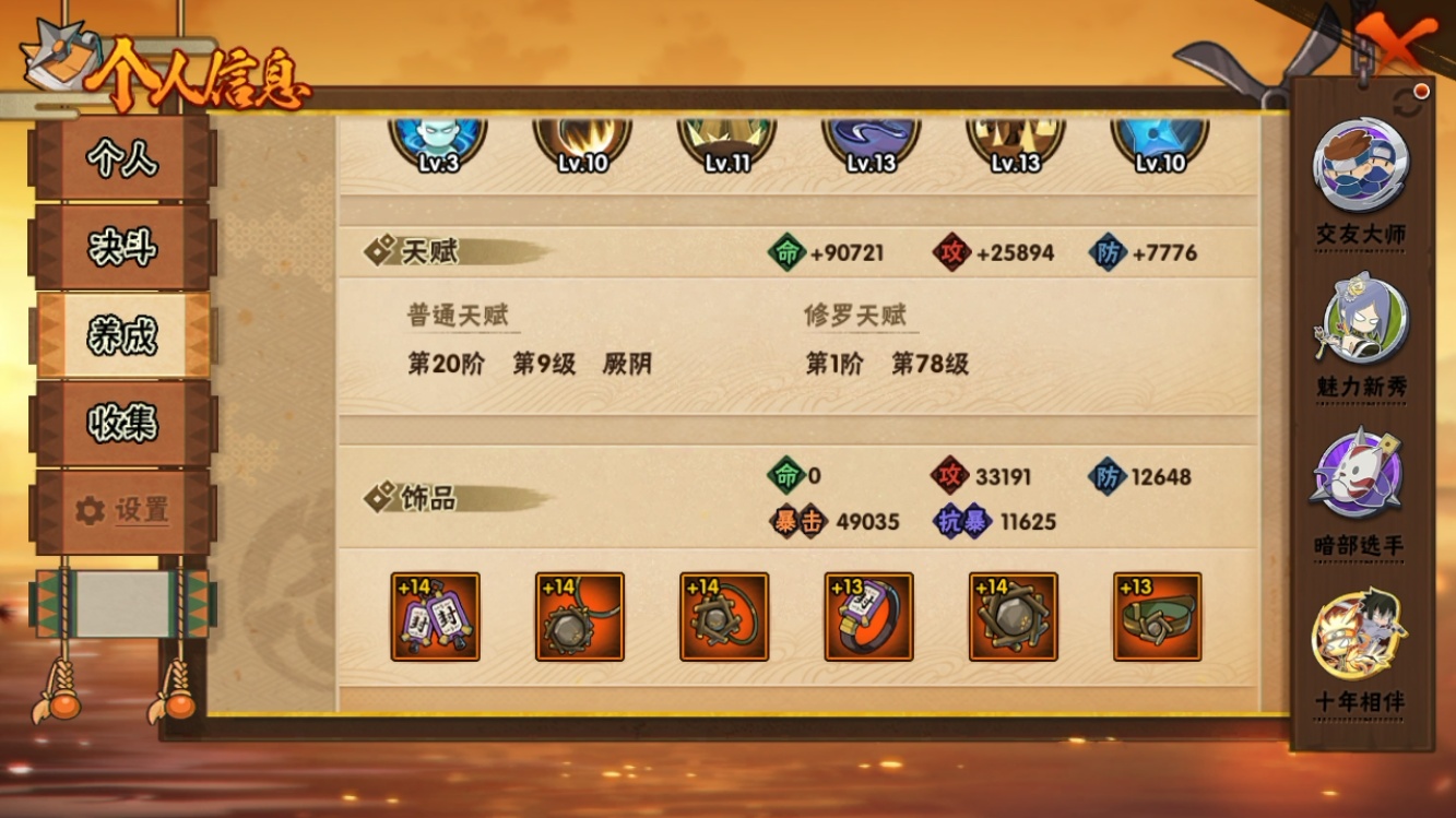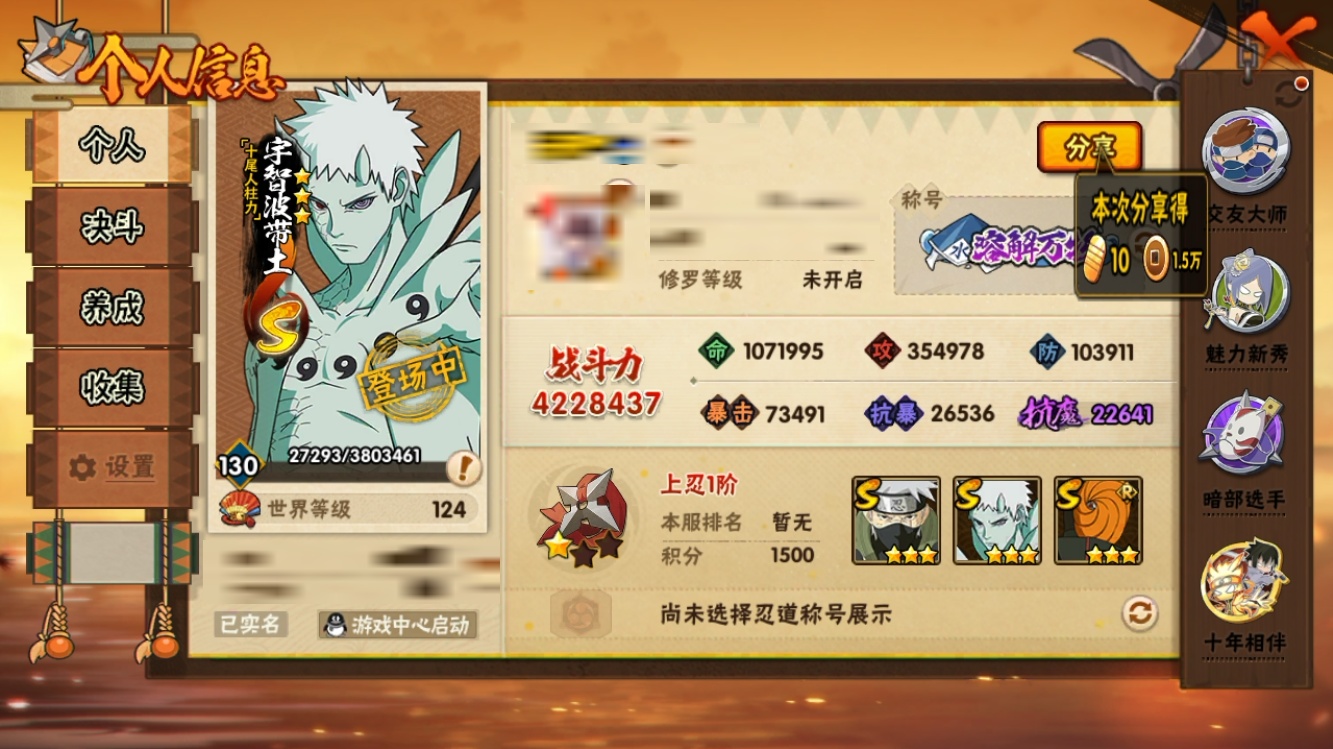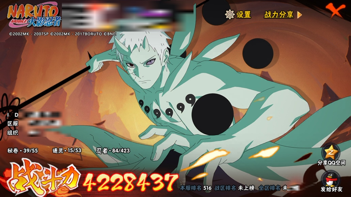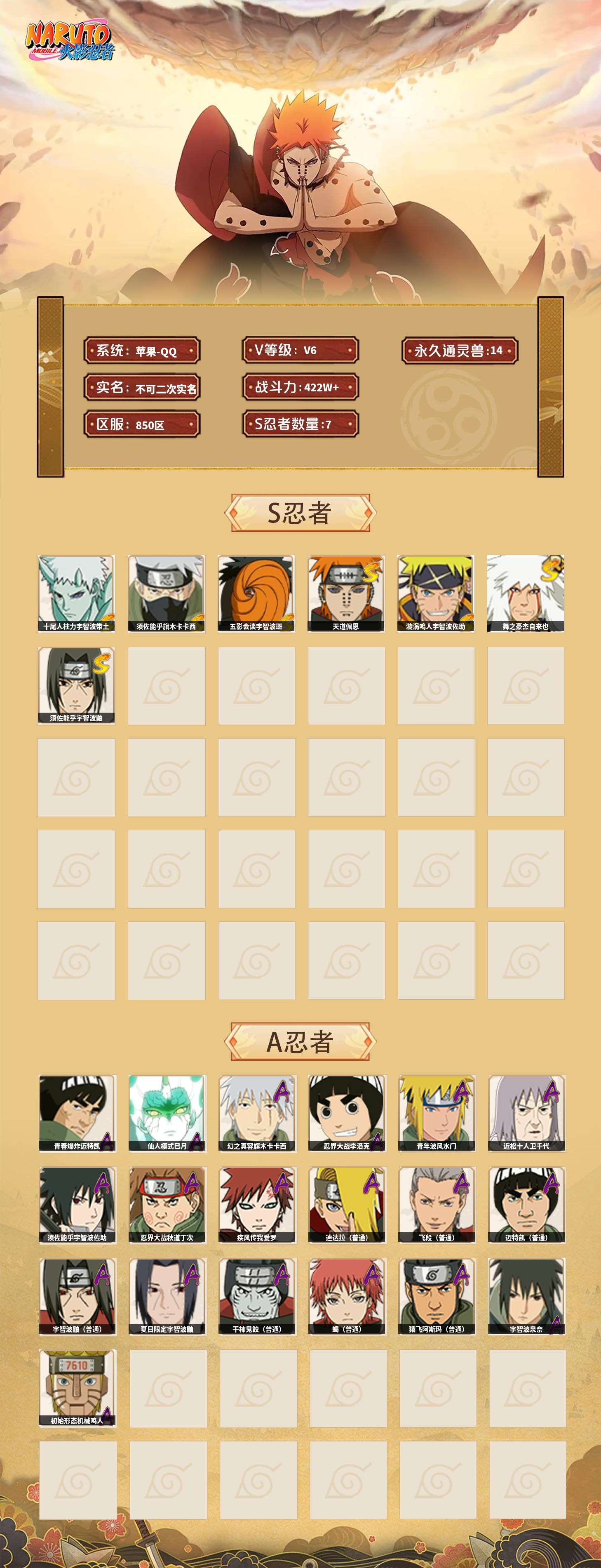 【火影忍者】【lyhy11176】战斗力:422w;段位:上忍1阶;本服排名:516;vip:v6级;s忍:7个;a忍:19个;通灵兽:14个,s忍:十尾人柱力宇智波带土|须佐能乎旗木卡卡西|五影会谈宇智波斑|天道佩恩|漩涡鸣人宇智波佐助|舞之豪杰自来也|须佐能乎宇智波鼬__a忍:青春爆炸迈特凯|仙人模式巳月|幻之真容旗木卡卡西|忍界大战李洛克|青年波风水门|近松十人卫千代|须佐能乎宇智波佐助|忍界大战秋道丁次|疾风传我爱罗|迪达拉(普通)|飞段(普通)|迈特凯(普通)|宇智波鼬(普通)|夏日限定宇智波鼬|干柿鬼鲛(普通)|蝎(普通)|猿飞阿斯玛(普通)|宇智波泉奈|初始形态机械鸣人__通灵兽:忍犬(普通)|蓝蛇|蛤蟆吉|忍龟|砂之守鹤|镰鼬|猿魔|山椒鱼|蜃|蛤蟆仙人|鲛鲨|蛤蟆健|乌鸦夏日限定|乌鸦(普通)1