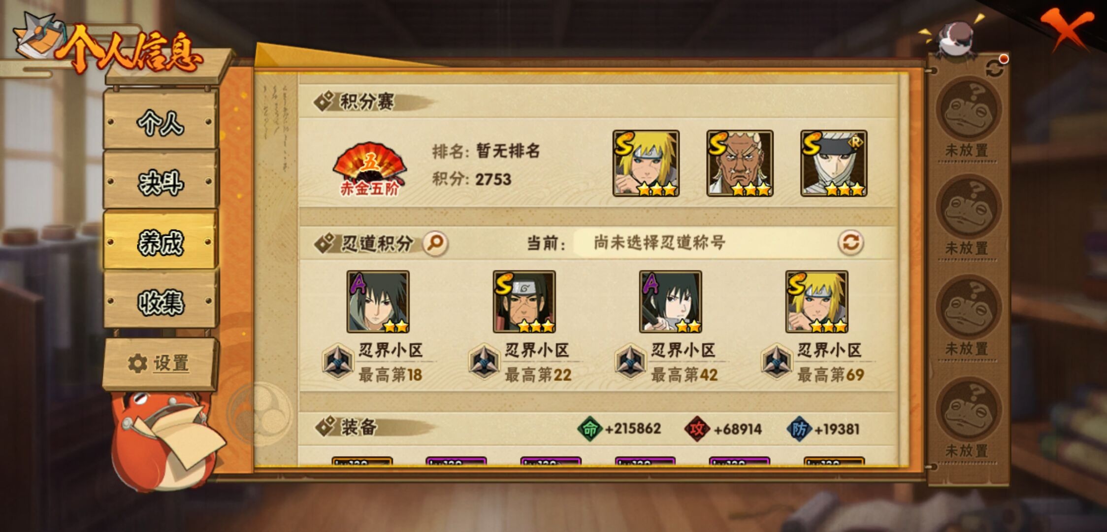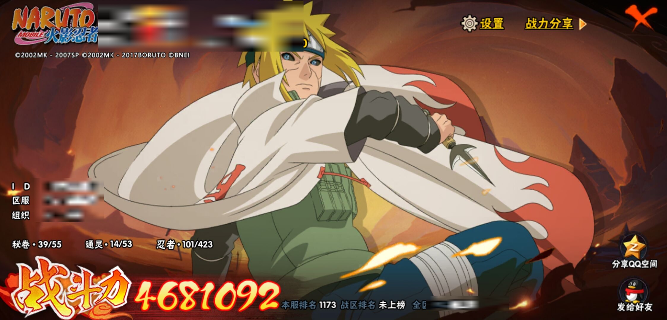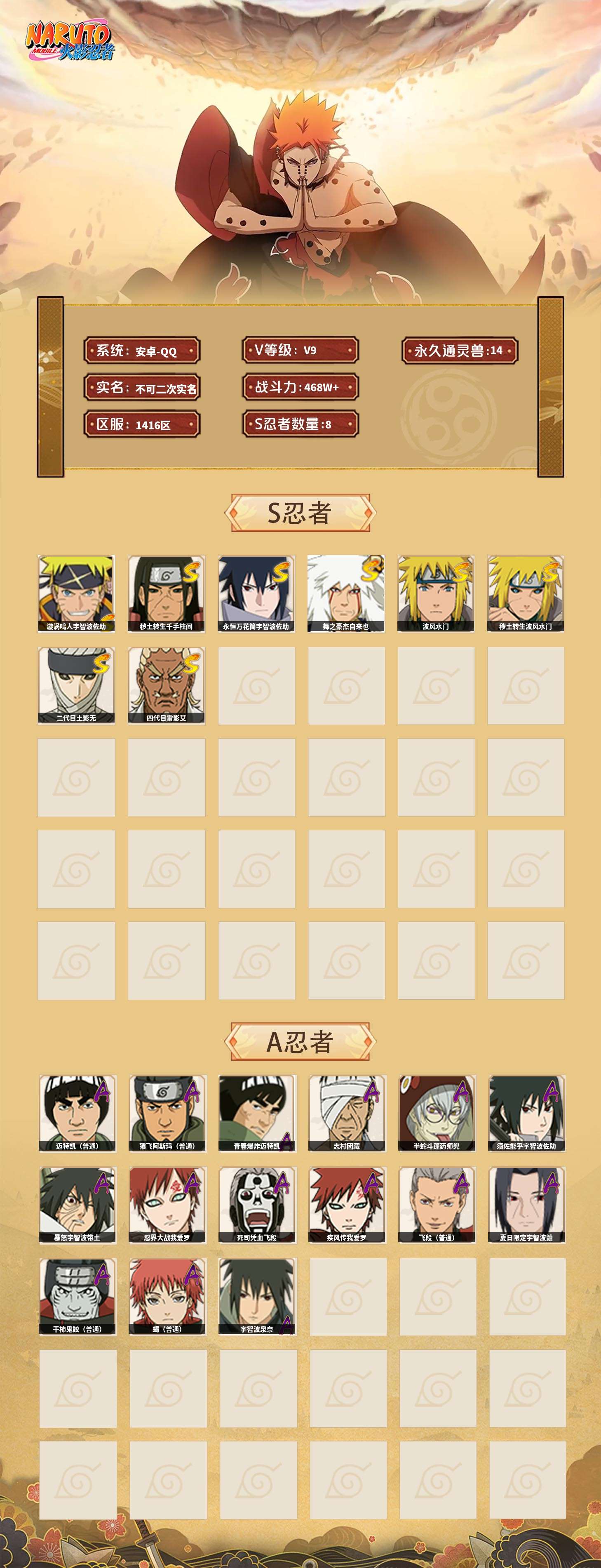 【火影忍者】【lyhy11209】战斗力:468w;段位:中忍3阶;本服排名:1173;vip:v9级;s忍:8个;a忍:15个;通灵兽:14个,s忍:漩涡鸣人宇智波佐助|秽土转生千手柱间|永恒万花筒宇智波佐助|舞之豪杰自来也|波风水门|秽土转生波风水门|二代目土影无|四代目雷影艾__a忍:青春爆炸迈特凯|志村团藏|半蛇斗篷药师兜|须佐能乎宇智波佐助|暴怒宇智波带土|忍界大战我爱罗|死司凭血飞段|疾风传我爱罗|飞段(普通)|迈特凯(普通) 4星|夏日限定宇智波鼬|干柿鬼鲛(普通)|蝎(普通)|猿飞阿斯玛(普通) 3星|宇智波泉奈__通灵兽:忍犬(普通)|蓝蛇|蛤蟆吉|忍龟|镰鼬|猿魔|山椒鱼|蜃|蛤蟆仙人|鲛鲨|蛤蟆健|砂之守鹤|蛞蝓(普通)|乌鸦(普通)