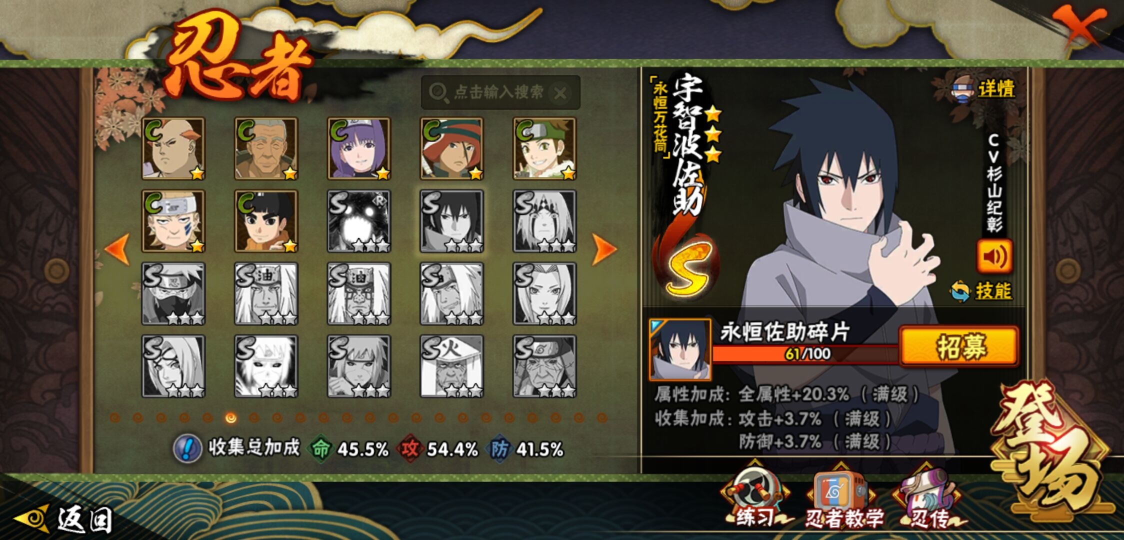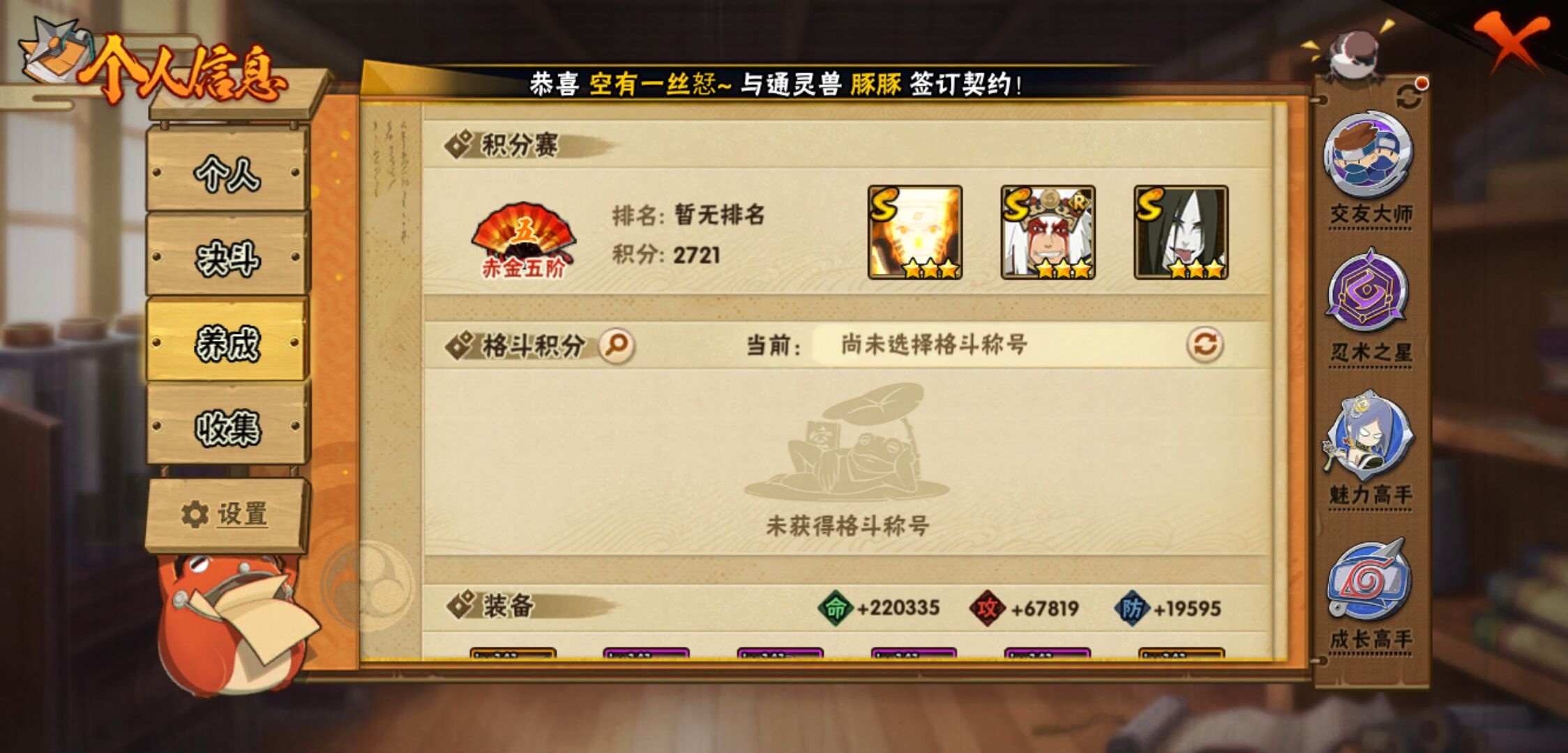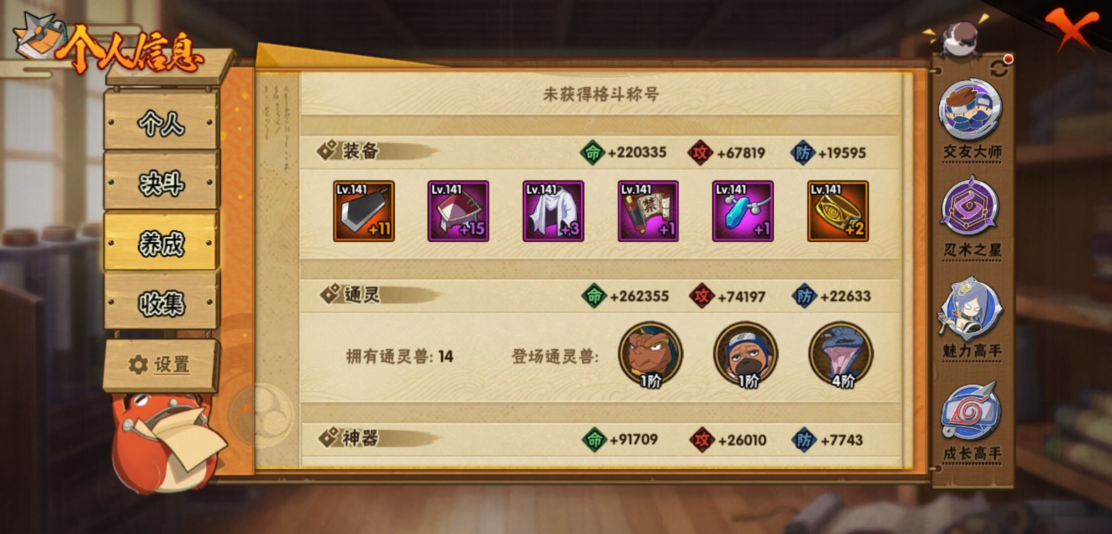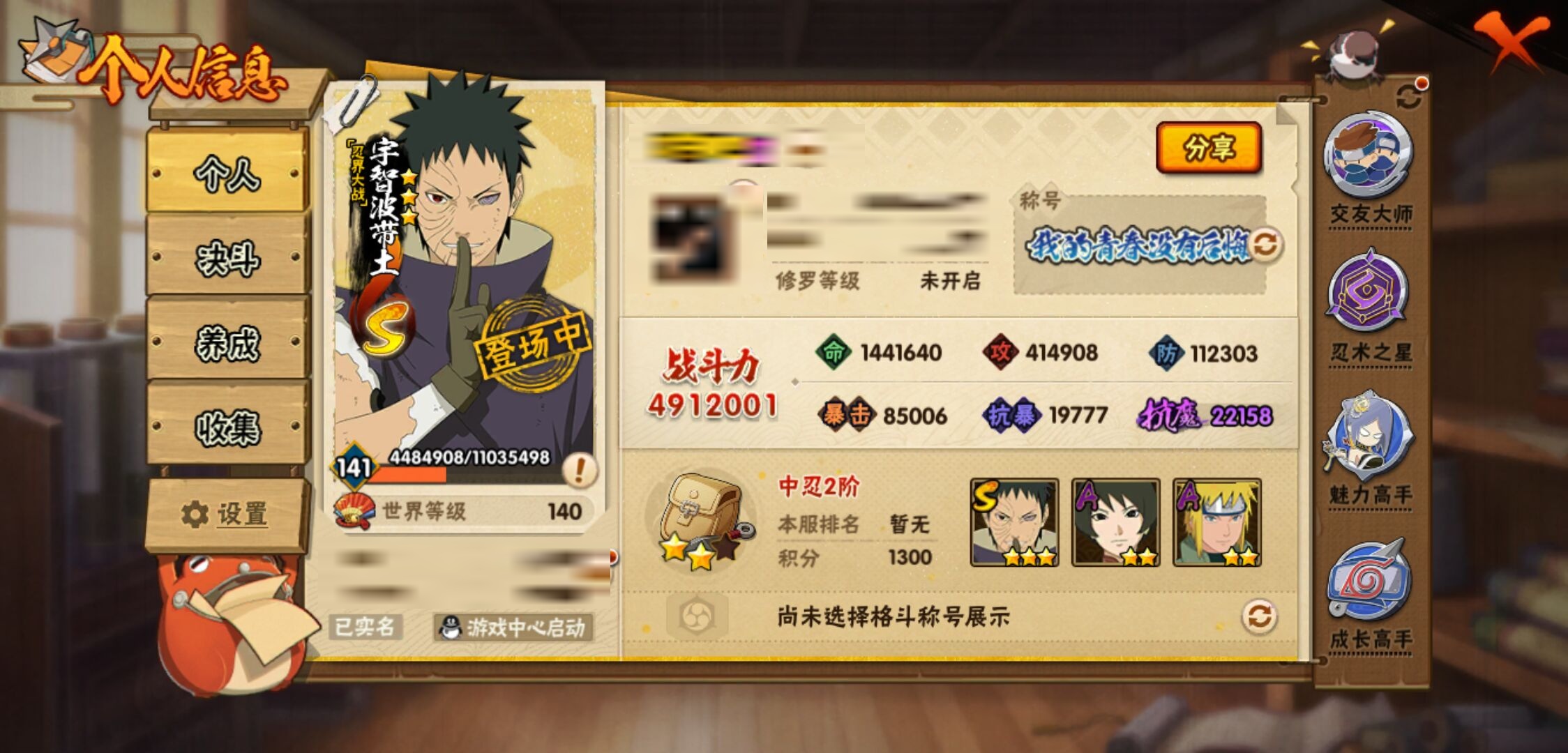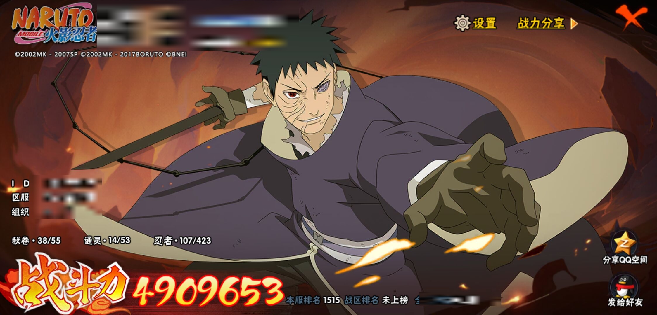 【火影忍者】【lyhy11196】战斗力:491w;段位:中忍2阶;本服排名:1515;vip:v7级;s忍:8个;a忍:17个;通灵兽:13个,s忍:忍界大战宇智波带土|漩涡鸣人宇智波佐助|舞之豪杰自来也|大蛇丸(普通)|波风水门|须佐能乎宇智波鼬|死门迈特凯|九喇嘛连结漩涡鸣人__a忍:青春爆炸迈特凯|四代目土影黑土|青年长门|青年波风水门|青年艾|近松十人卫千代|忍界大战秋道丁次|五代目雷影达鲁伊|死司凭血飞段|疾风传我爱罗 3星|飞段(普通) 3星|迈特凯(普通)|夏日限定宇智波鼬|干柿鬼鲛(普通) 3星|蝎(普通)|猿飞阿斯玛(普通)|侠隐江湖大野木__通灵兽:忍犬(普通)|蓝蛇|蛤蟆吉|忍龟|镰鼬|砂之守鹤|猿魔|山椒鱼|蜃|蛤蟆仙人|鲛鲨|蛤蟆健|乌鸦(普通)