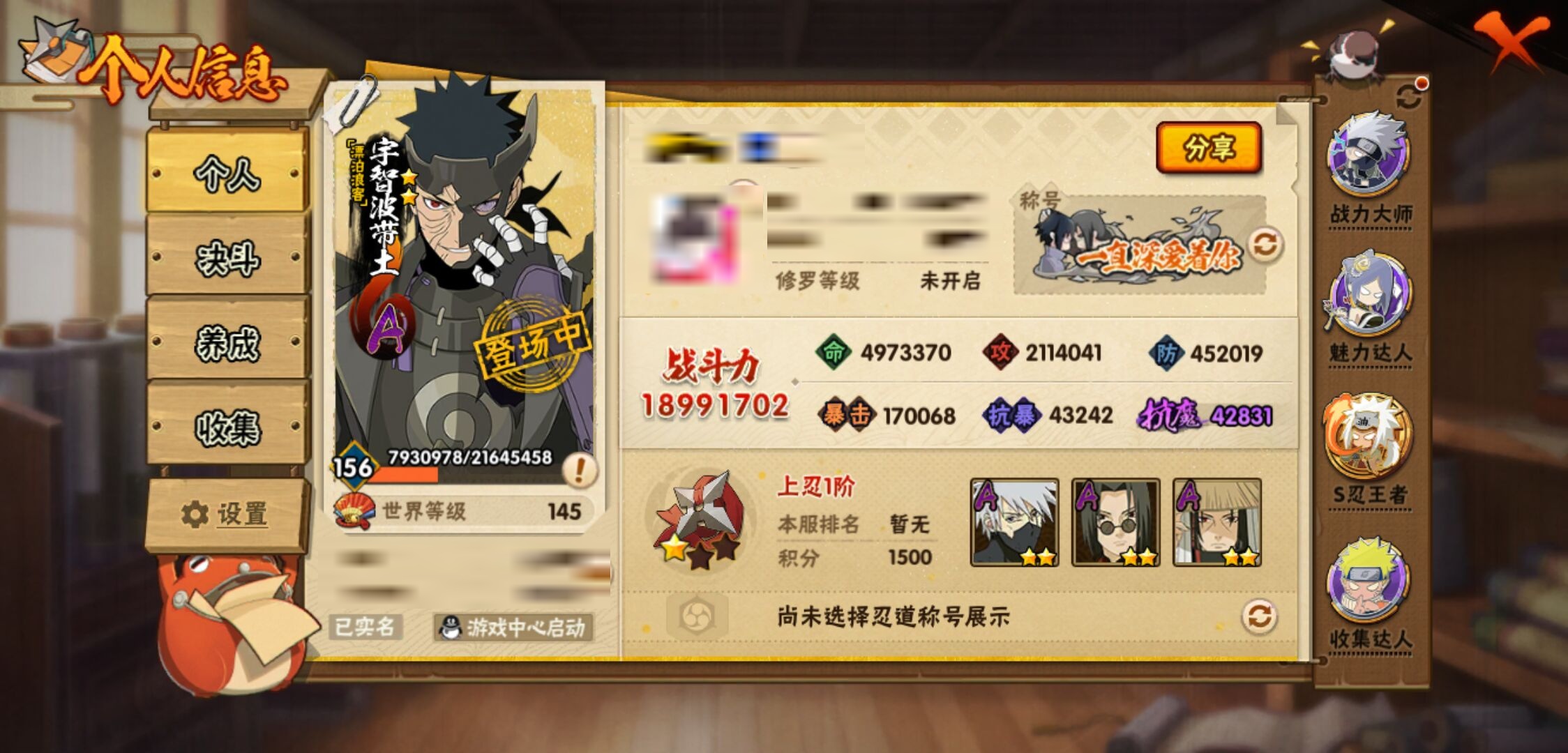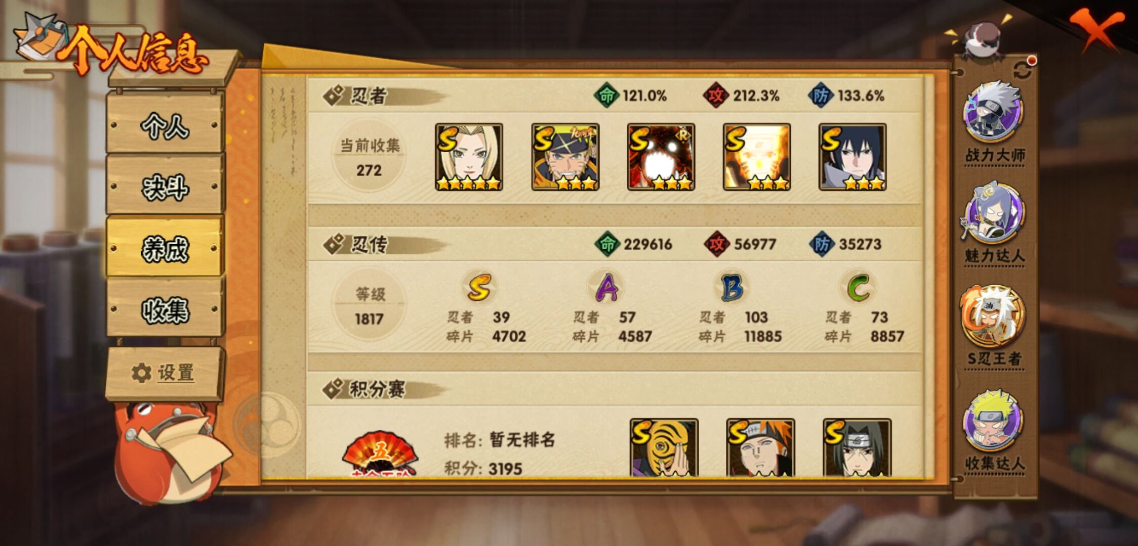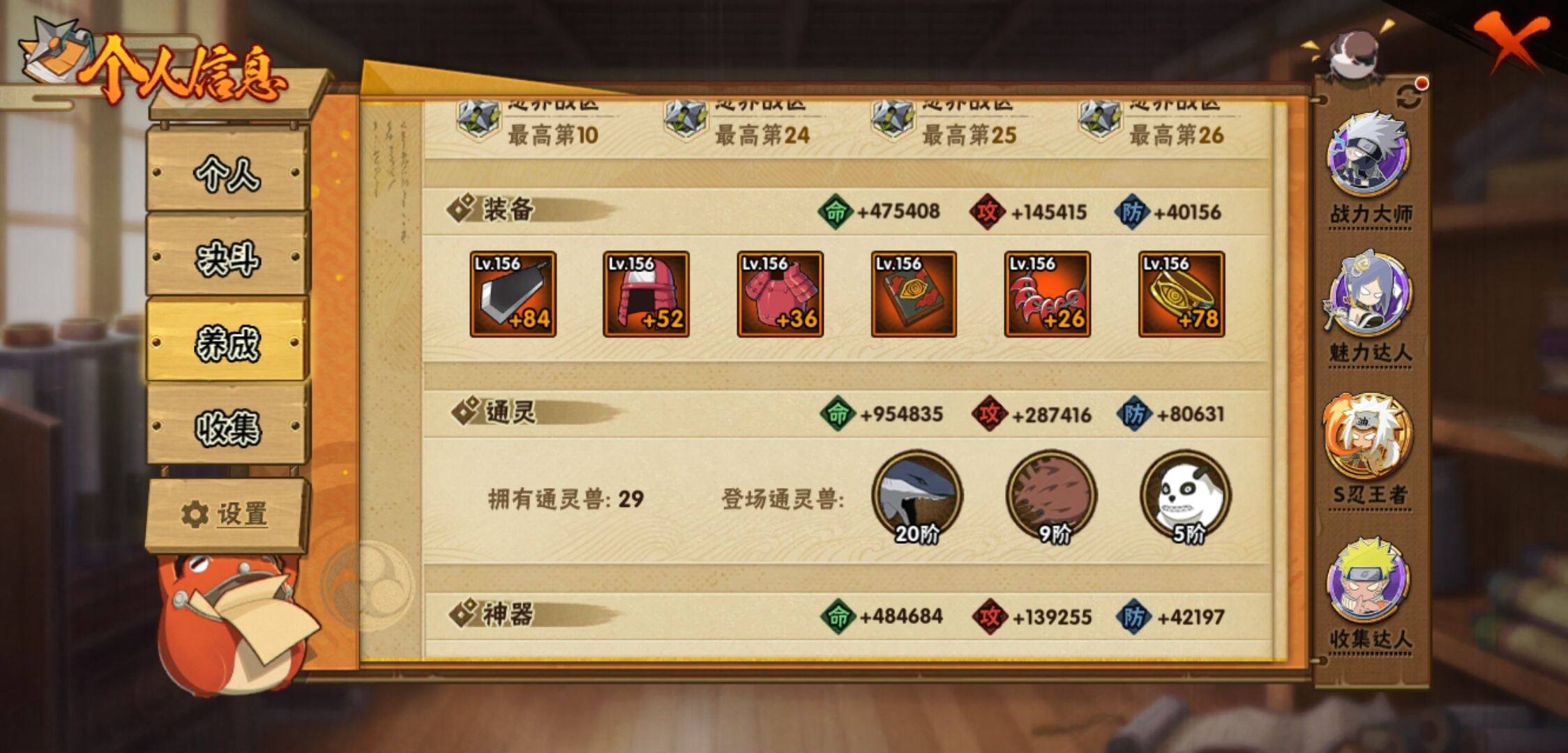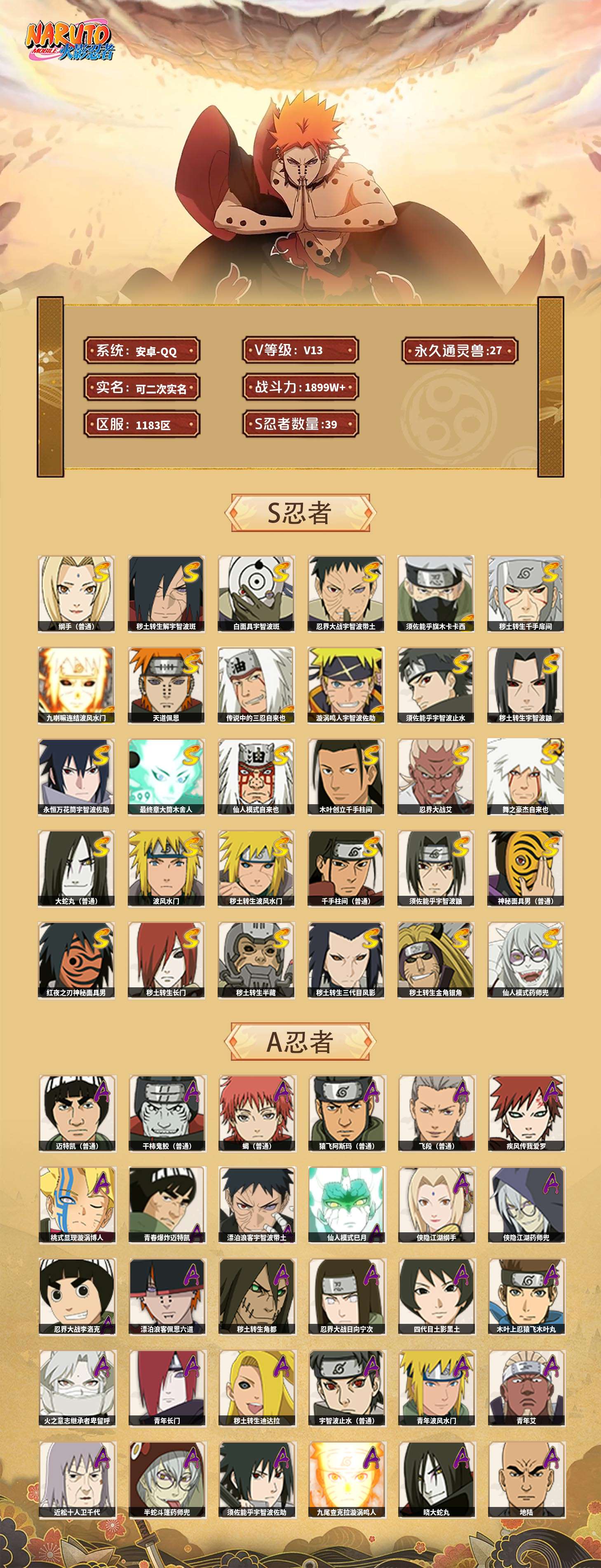 【火影忍者】【lyhy11203】战斗力:1899w;段位:上忍1阶;本服排名:103;vip:v13级;s忍:39个;a忍:57个;通灵兽:27个,s忍:秽土转生解宇智波斑|白面具宇智波斑|忍界大战宇智波带土|须佐能乎旗木卡卡西|秽土转生千手扉间|九喇嘛连结波风水门|天道佩恩|传说中的三忍自来也|漩涡鸣人宇智波佐助|须佐能乎宇智波止水|秽土转生宇智波鼬|永恒万花筒宇智波佐助|最终章大筒木舍人|仙人模式自来也|木叶创立千手柱间|忍界大战艾|舞之豪杰自来也|大蛇丸(普通)|纲手(普通) 5星|波风水门|秽土转生波风水门|千手柱间(普通)|须佐能乎宇智波鼬|神秘面具男(普通)|红夜之刃神秘面具男|秽土转生长门|秽土转生半藏|秽土转生三代目风影|秽土转生金角银角|仙人模式药师兜|死门迈特凯|忍界大战春野樱|九喇嘛连结漩涡鸣人|博人传大筒木金式|大筒木桃式|猿飞日斩(普通)|秽土转生猿飞日斩|自来也(普通)|暴怒第六尾漩涡鸣人__a忍:青春爆炸迈特凯|漂泊浪客宇智波带土|仙人模式巳月|侠隐江湖纲手|侠隐江湖药师兜|忍界大战李洛克|漂泊浪客佩恩六道|秽土转生角都|忍界大战日向宁次|四代目土影黑土|木叶上忍猿飞木叶丸|火之意志继承者卑留呼|青年长门|秽土转生迪达拉|宇智波止水(普通)|青年波风水门|青年艾|近松十人卫千代|半蛇斗篷药师兜|须佐能乎宇智波佐助|九尾查克拉漩涡鸣人|晓大蛇丸|地陆|百豪春野樱|忍界大战秋道丁次|忍界大战我爱罗|新春限定波风水门|疾风传咒印宇智波佐助|新春限定宇智波鼬|奇拉比(普通)|万花筒写轮眼宇智波佐助|死司凭血飞段|疾风传我爱罗 3星|迪达拉(普通)|飞段(普通) 4星|小南(普通)|漂泊浪客小南|仙人模式漩涡鸣人|万花筒写轮眼旗木卡卡西|迈特凯(普通) 5星|宇智波鼬(普通)|夏日限定宇智波鼬|干柿鬼鲛(普通) 5星|秽土转生桃地再不斩|蝎(普通) 5星|绯流琥蝎|猿飞阿斯玛(普通) 5星|桃式显现漩涡博人 3星|六代目水影长十郎|不缘|新春限定大蛇丸|不动|宇智波泉奈|羁绊神农|忍界大战土台|初始形态机械鸣人|侠隐江湖大野木__通灵兽:忍犬(普通)|蓝蛇|蛤蟆吉|忍龟|镰鼬|猿魔|山椒鱼|蜃|蛞蝓(普通)|蛤蟆仙人|鲛鲨|蛤蟆健|熊猫|乌鸦(普通)|砂之守鹤|蛤蟆龙|蛤蟆广|梦貘|乌鸦夏日限定|辛牙|万蛇|螃蟹|怒鬼无臂|鹰|怒鬼爪|变色龙|蜘蛛