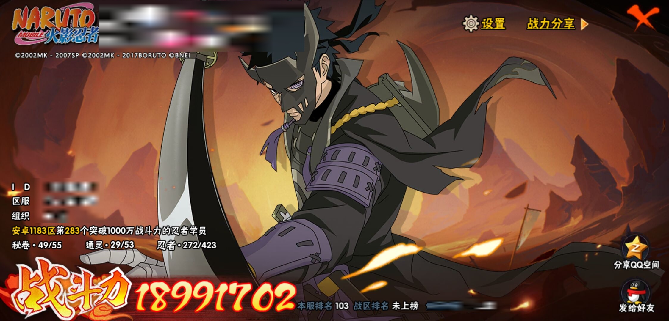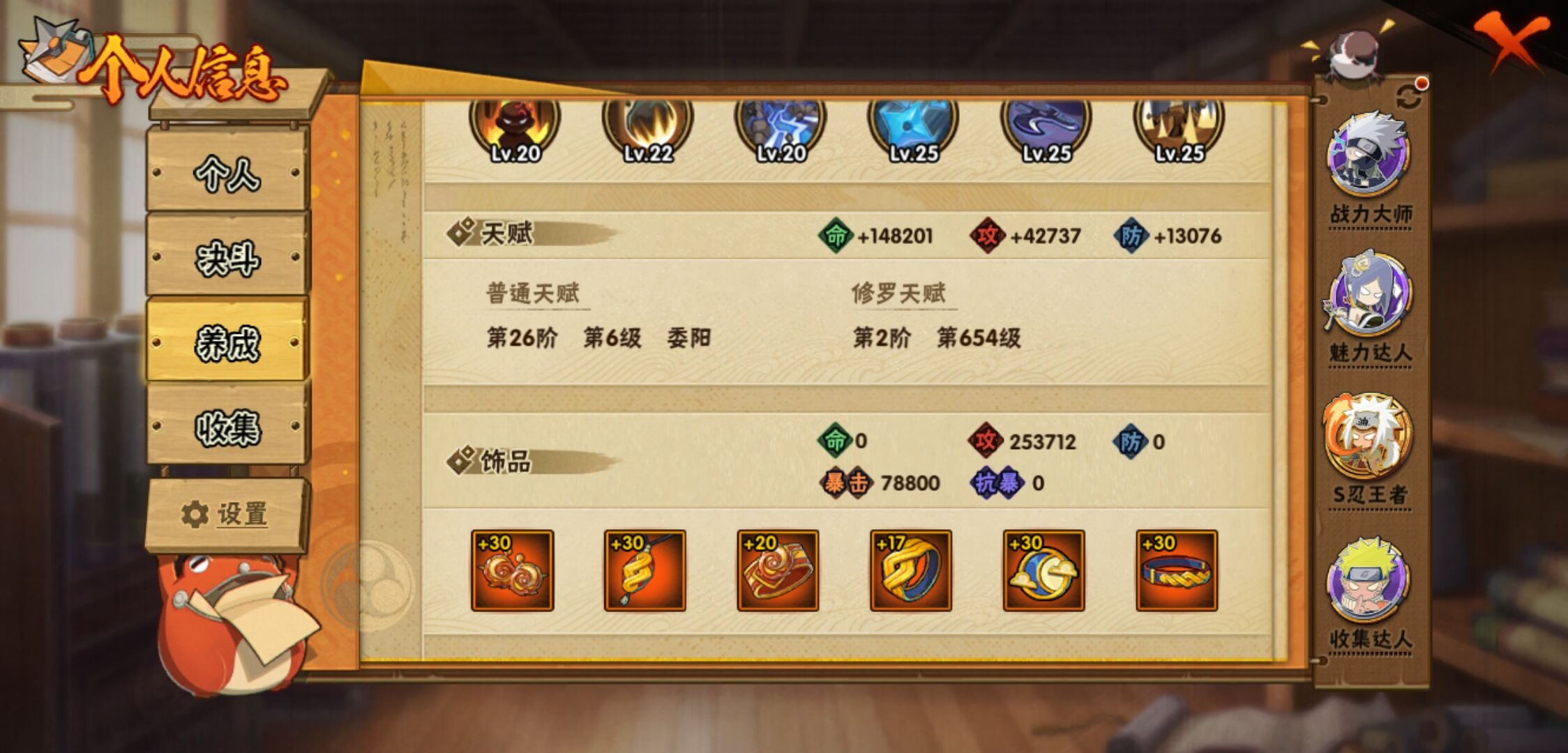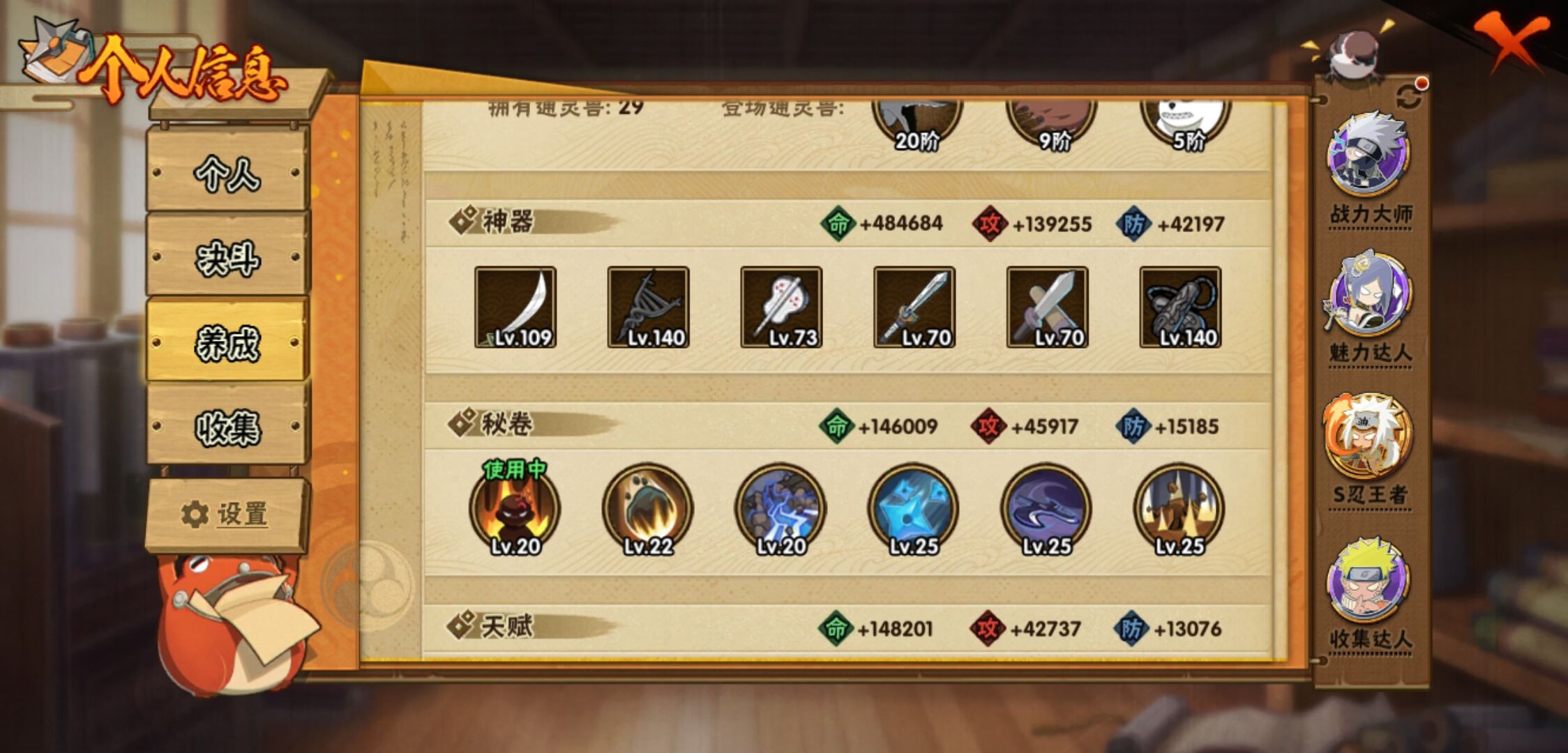 【火影忍者】【lyhy11203】战斗力:1899w;段位:上忍1阶;本服排名:103;vip:v13级;s忍:39个;a忍:57个;通灵兽:27个,s忍:秽土转生解宇智波斑|白面具宇智波斑|忍界大战宇智波带土|须佐能乎旗木卡卡西|秽土转生千手扉间|九喇嘛连结波风水门|天道佩恩|传说中的三忍自来也|漩涡鸣人宇智波佐助|须佐能乎宇智波止水|秽土转生宇智波鼬|永恒万花筒宇智波佐助|最终章大筒木舍人|仙人模式自来也|木叶创立千手柱间|忍界大战艾|舞之豪杰自来也|大蛇丸(普通)|纲手(普通) 5星|波风水门|秽土转生波风水门|千手柱间(普通)|须佐能乎宇智波鼬|神秘面具男(普通)|红夜之刃神秘面具男|秽土转生长门|秽土转生半藏|秽土转生三代目风影|秽土转生金角银角|仙人模式药师兜|死门迈特凯|忍界大战春野樱|九喇嘛连结漩涡鸣人|博人传大筒木金式|大筒木桃式|猿飞日斩(普通)|秽土转生猿飞日斩|自来也(普通)|暴怒第六尾漩涡鸣人__a忍:青春爆炸迈特凯|漂泊浪客宇智波带土|仙人模式巳月|侠隐江湖纲手|侠隐江湖药师兜|忍界大战李洛克|漂泊浪客佩恩六道|秽土转生角都|忍界大战日向宁次|四代目土影黑土|木叶上忍猿飞木叶丸|火之意志继承者卑留呼|青年长门|秽土转生迪达拉|宇智波止水(普通)|青年波风水门|青年艾|近松十人卫千代|半蛇斗篷药师兜|须佐能乎宇智波佐助|九尾查克拉漩涡鸣人|晓大蛇丸|地陆|百豪春野樱|忍界大战秋道丁次|忍界大战我爱罗|新春限定波风水门|疾风传咒印宇智波佐助|新春限定宇智波鼬|奇拉比(普通)|万花筒写轮眼宇智波佐助|死司凭血飞段|疾风传我爱罗 3星|迪达拉(普通)|飞段(普通) 4星|小南(普通)|漂泊浪客小南|仙人模式漩涡鸣人|万花筒写轮眼旗木卡卡西|迈特凯(普通) 5星|宇智波鼬(普通)|夏日限定宇智波鼬|干柿鬼鲛(普通) 5星|秽土转生桃地再不斩|蝎(普通) 5星|绯流琥蝎|猿飞阿斯玛(普通) 5星|桃式显现漩涡博人 3星|六代目水影长十郎|不缘|新春限定大蛇丸|不动|宇智波泉奈|羁绊神农|忍界大战土台|初始形态机械鸣人|侠隐江湖大野木__通灵兽:忍犬(普通)|蓝蛇|蛤蟆吉|忍龟|镰鼬|猿魔|山椒鱼|蜃|蛞蝓(普通)|蛤蟆仙人|鲛鲨|蛤蟆健|熊猫|乌鸦(普通)|砂之守鹤|蛤蟆龙|蛤蟆广|梦貘|乌鸦夏日限定|辛牙|万蛇|螃蟹|怒鬼无臂|鹰|怒鬼爪|变色龙|蜘蛛