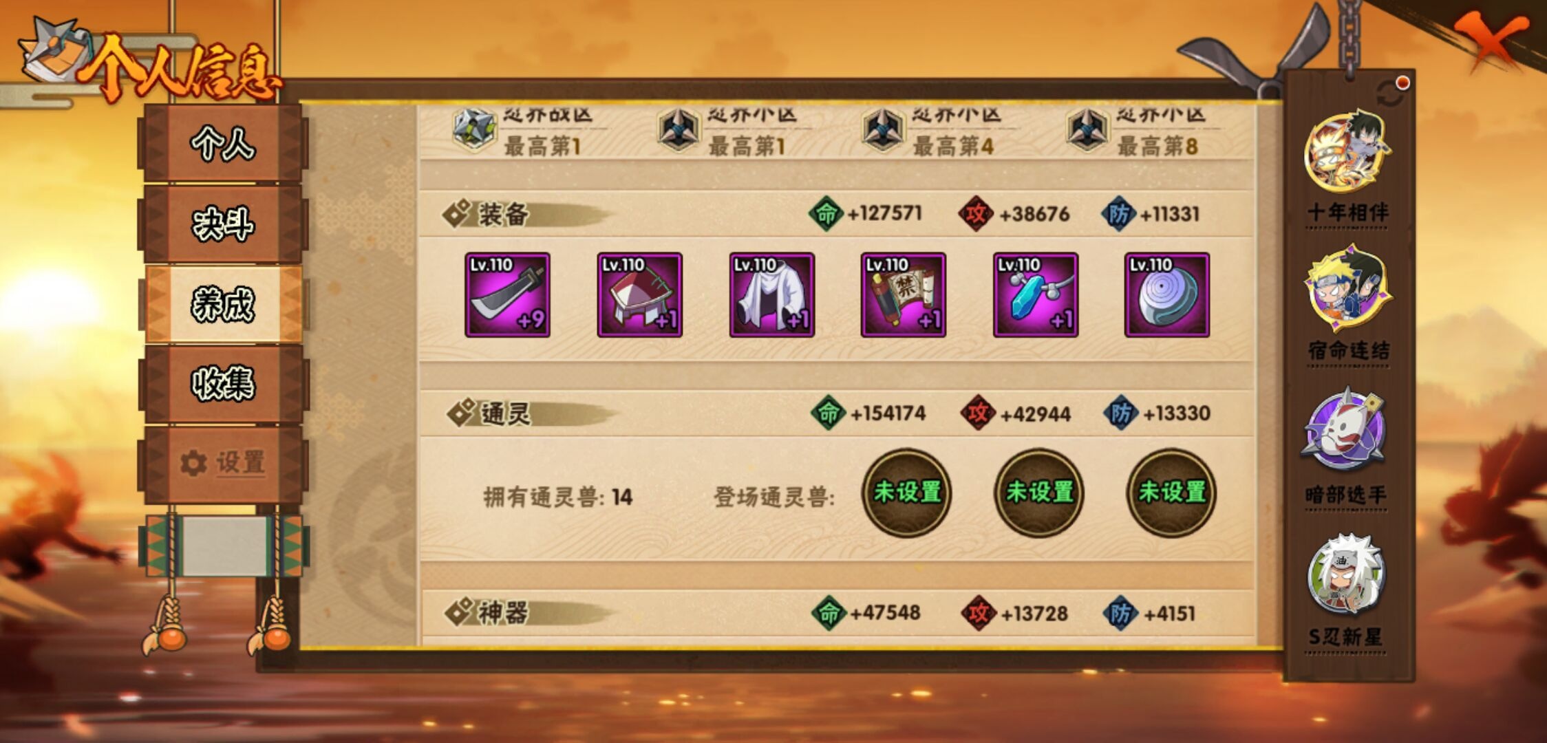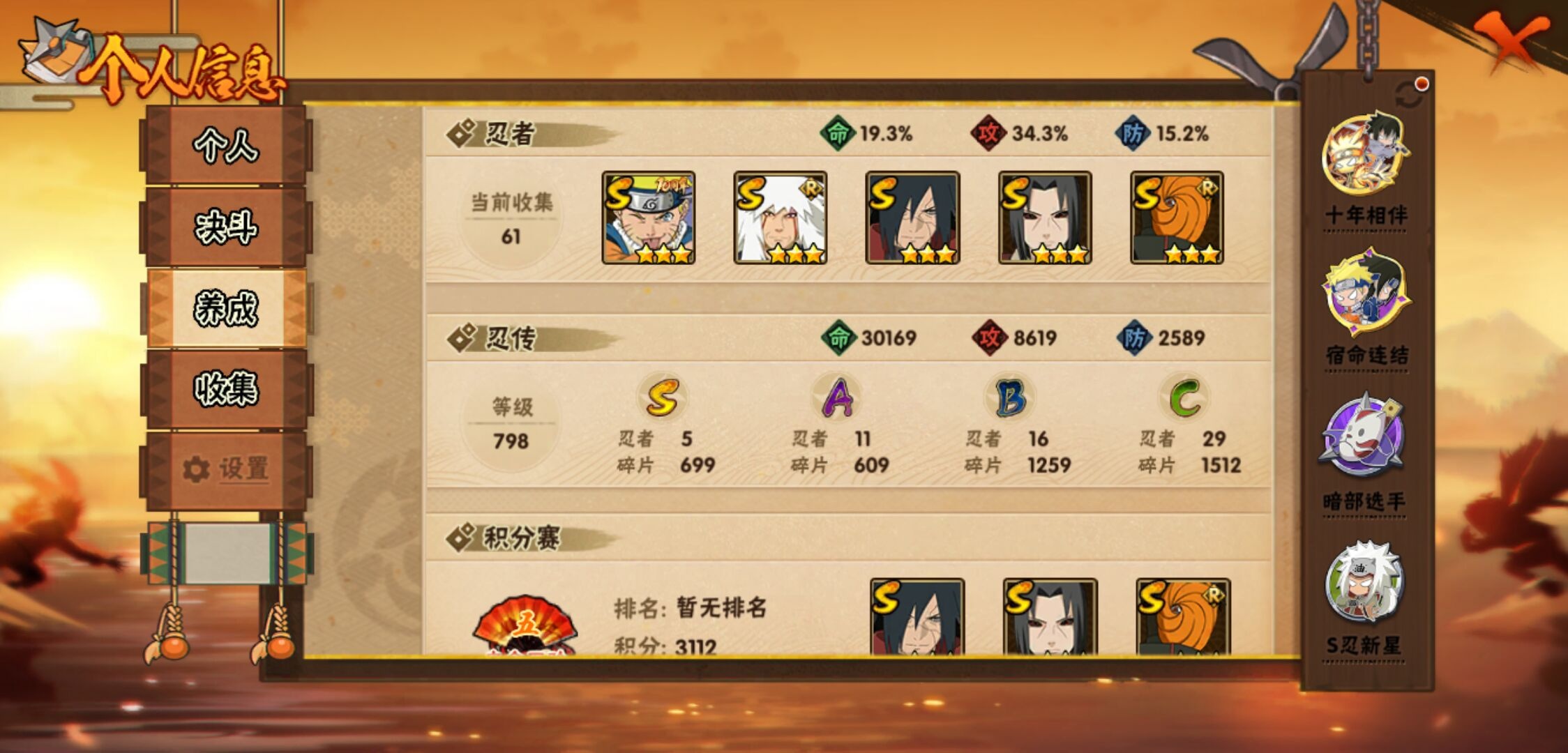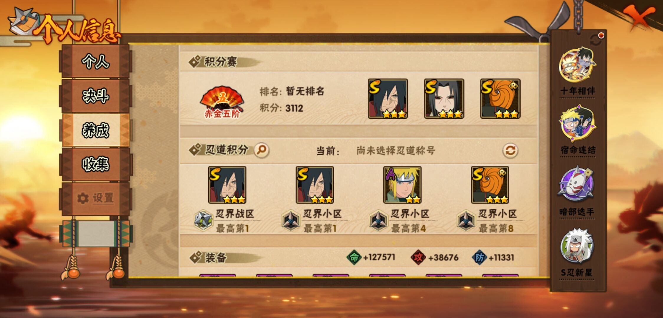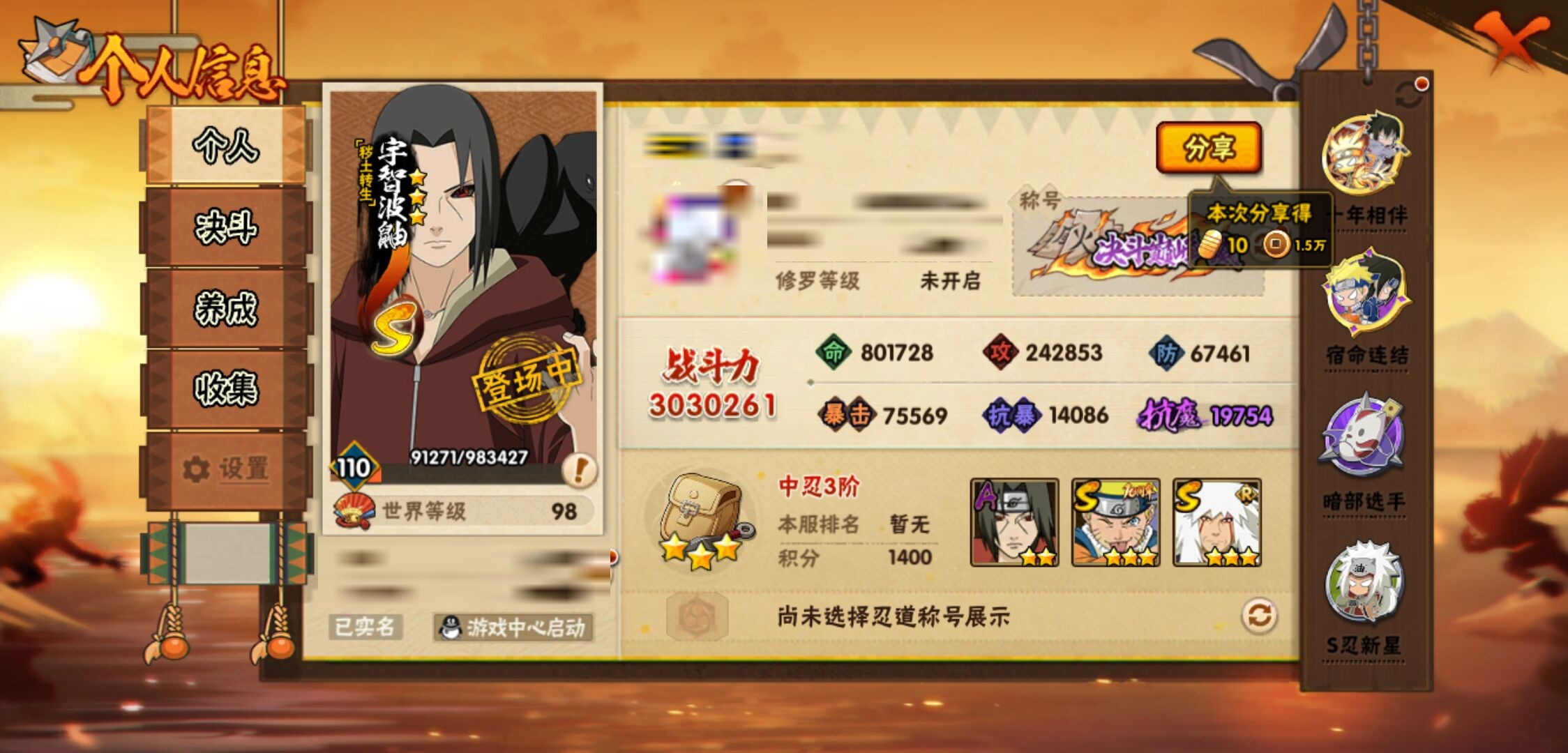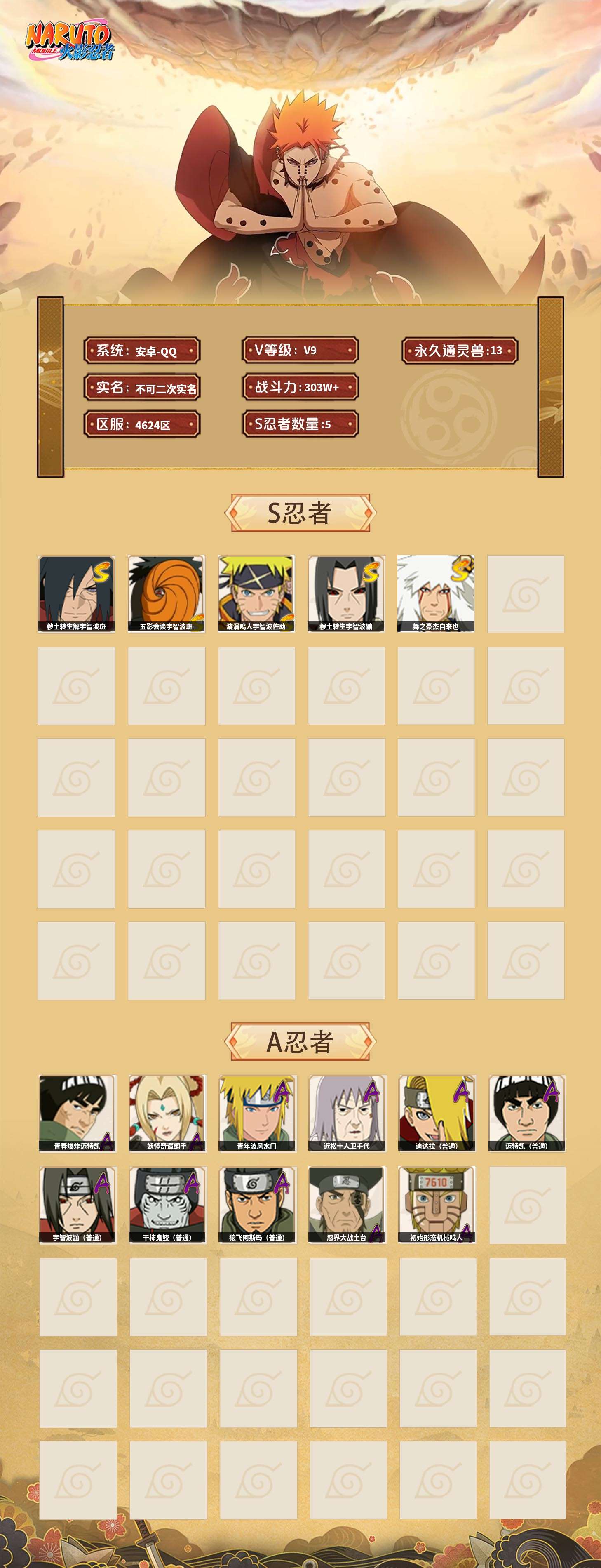 【火影忍者】【lyhy11198】战斗力:303w;段位:中忍3阶;本服排名:206;vip:v9级;s忍:5个;a忍:11个;通灵兽:13个,s忍:秽土转生解宇智波斑|五影会谈宇智波斑|漩涡鸣人宇智波佐助|秽土转生宇智波鼬|舞之豪杰自来也__a忍:青春爆炸迈特凯|妖怪奇谭纲手|青年波风水门|近松十人卫千代|迪达拉(普通)|迈特凯(普通)|宇智波鼬(普通)|干柿鬼鲛(普通)|猿飞阿斯玛(普通)|忍界大战土台|初始形态机械鸣人__通灵兽:忍犬(普通)|蓝蛇|蛤蟆吉|砂之守鹤|忍龟|镰鼬|猿魔|山椒鱼|蛞蝓(普通)|蜃|蛤蟆仙人|鲛鲨|蛤蟆健