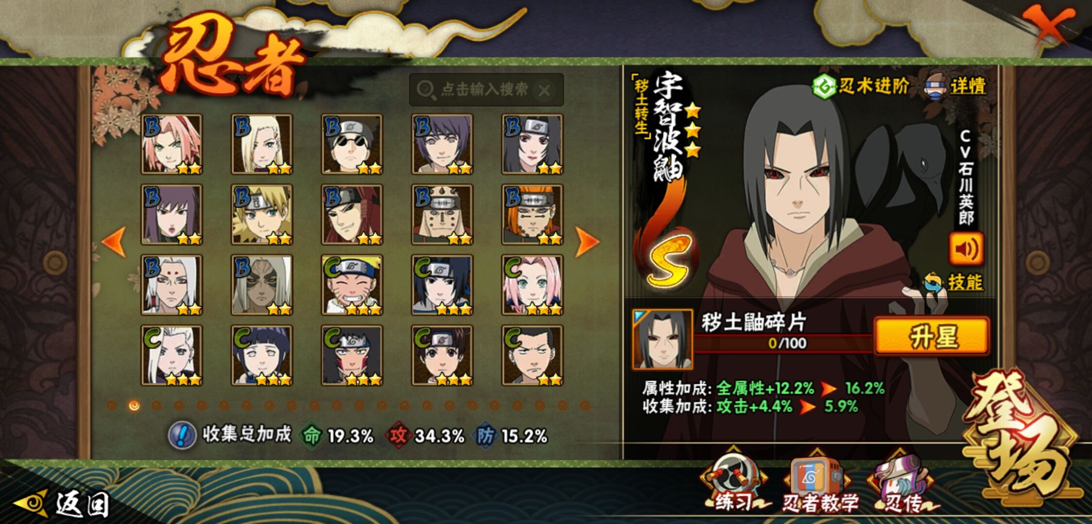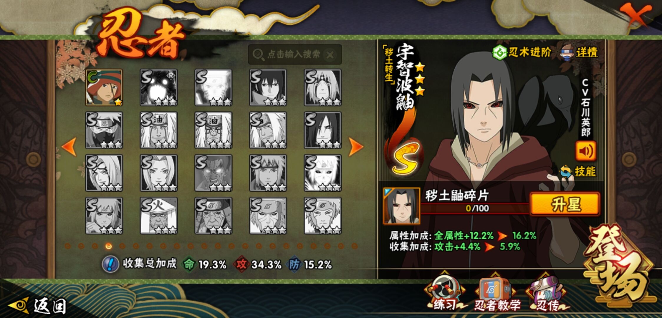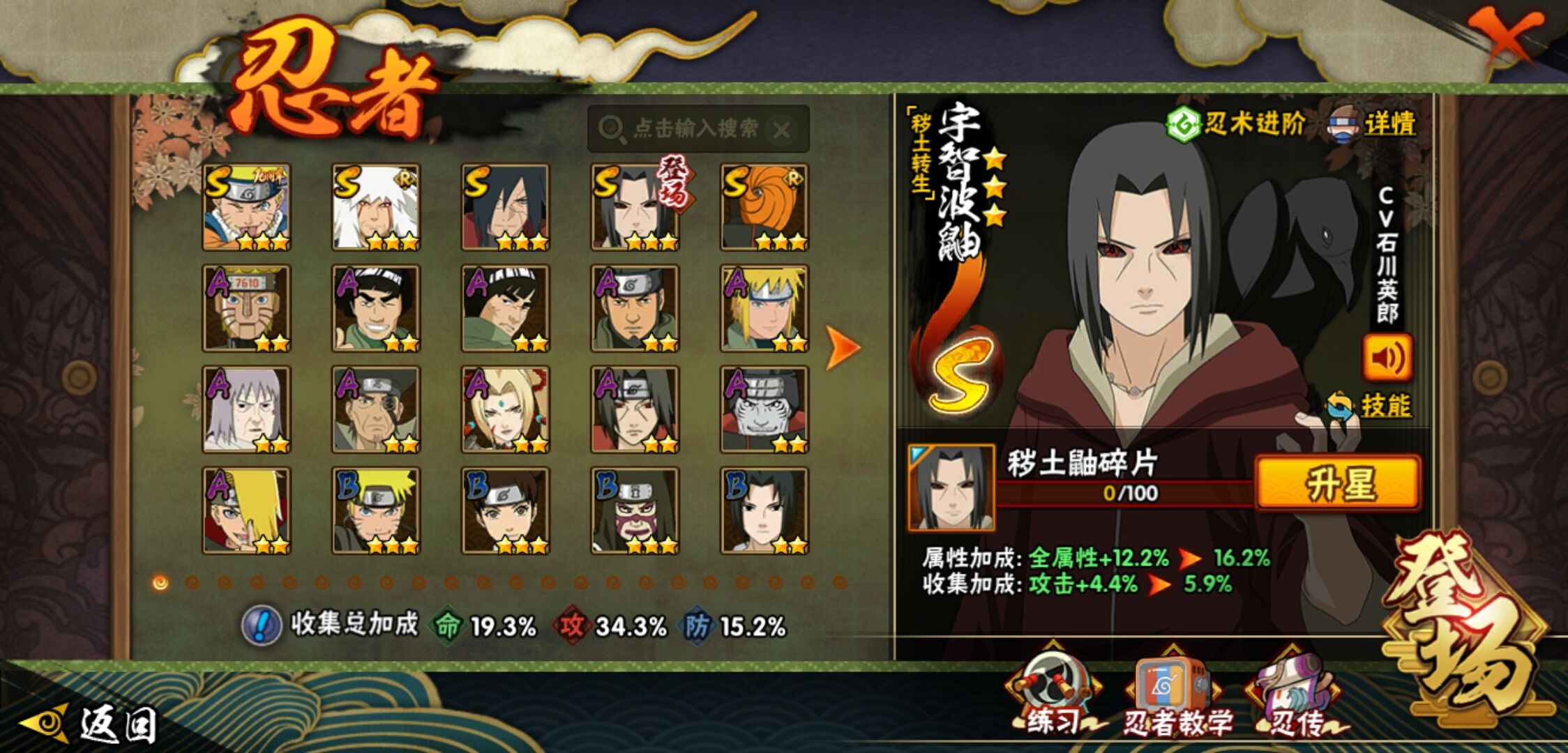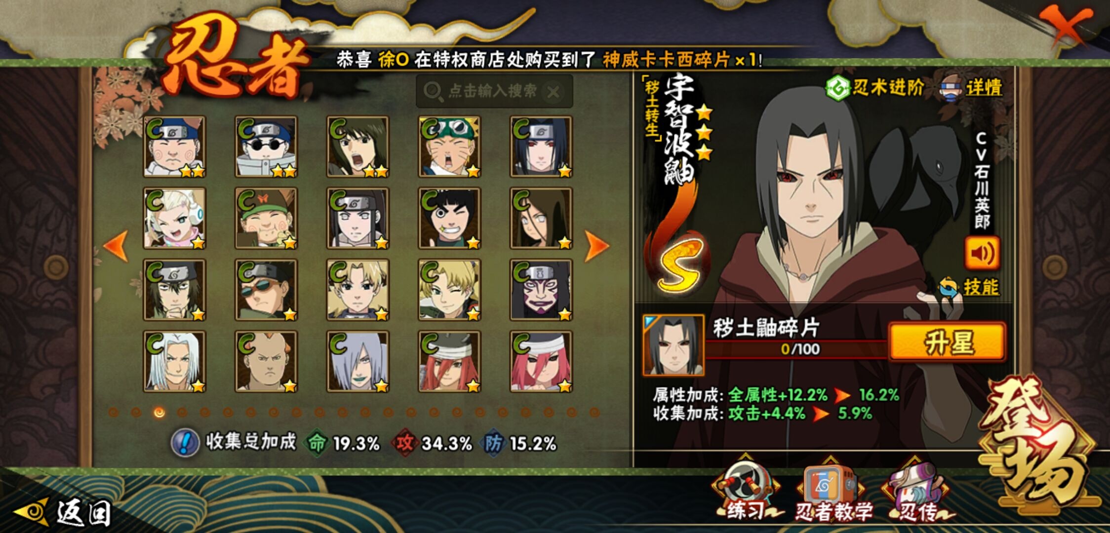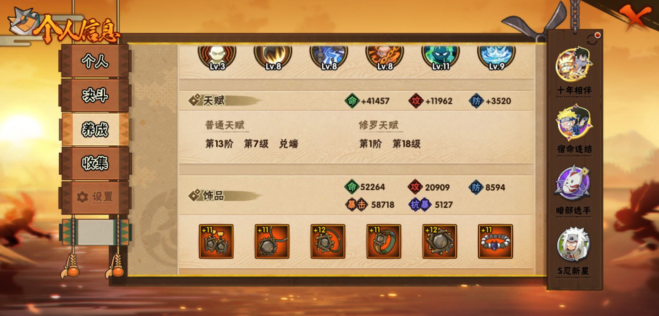 【火影忍者】【lyhy11198】战斗力:303w;段位:中忍3阶;本服排名:206;vip:v9级;s忍:5个;a忍:11个;通灵兽:13个,s忍:秽土转生解宇智波斑|五影会谈宇智波斑|漩涡鸣人宇智波佐助|秽土转生宇智波鼬|舞之豪杰自来也__a忍:青春爆炸迈特凯|妖怪奇谭纲手|青年波风水门|近松十人卫千代|迪达拉(普通)|迈特凯(普通)|宇智波鼬(普通)|干柿鬼鲛(普通)|猿飞阿斯玛(普通)|忍界大战土台|初始形态机械鸣人__通灵兽:忍犬(普通)|蓝蛇|蛤蟆吉|砂之守鹤|忍龟|镰鼬|猿魔|山椒鱼|蛞蝓(普通)|蜃|蛤蟆仙人|鲛鲨|蛤蟆健