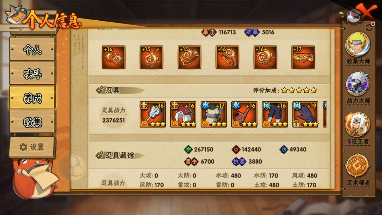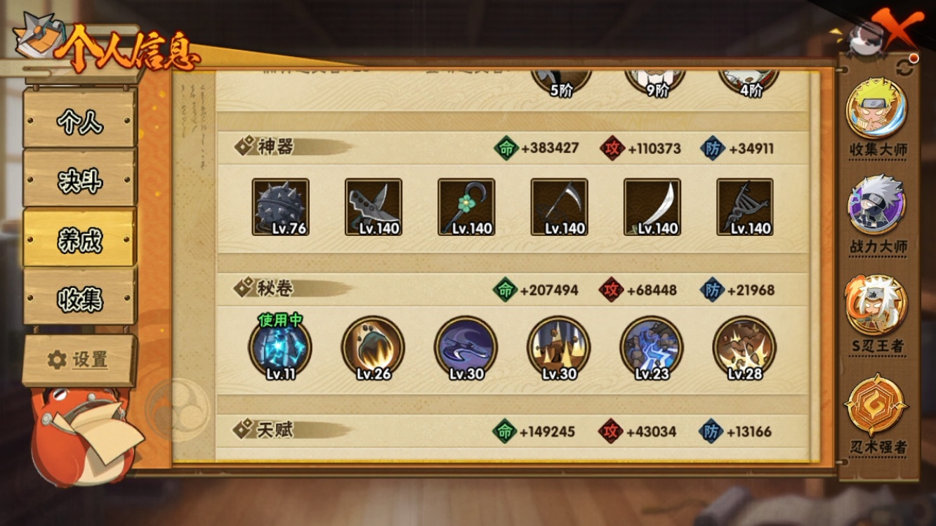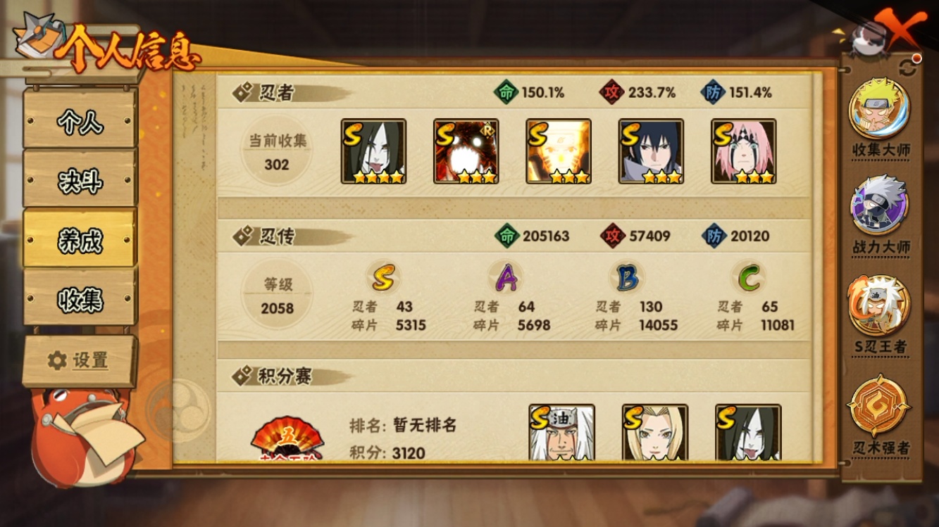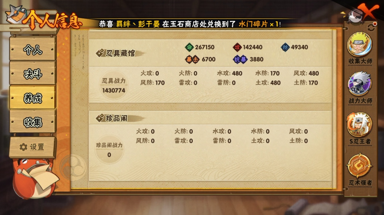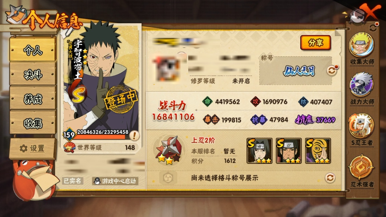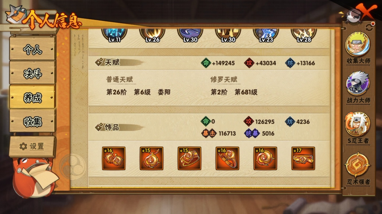 【火影忍者】【lyhy10569】战斗力:1684w;段位:上忍2阶;本服排名:245;vip:v12级;s忍:43个;a忍:64个;通灵兽:25个,s忍:秽土转生解宇智波斑|白面具宇智波斑|忍界大战宇智波带土|须佐能乎旗木卡卡西|秽土转生千手扉间|九喇嘛连结波风水门|天道佩恩|传说中的三忍自来也|秽土转生千手柱间|木叶创立宇智波斑|秽土转生宇智波鼬|永恒万花筒宇智波佐助|最终章大筒木舍人|木叶创立千手柱间|忍界大战艾|舞之豪杰自来也|大蛇丸(普通)|纲手(普通)|百豪纲手|波风水门|秽土转生波风水门|千手扉间(普通)|千手柱间(普通)|秽土转生宇智波斑|宇智波斑(普通)|须佐能乎宇智波鼬|神秘面具男(普通)|秽土转生长门|秽土转生半藏|秽土转生三代目风影|秽土转生金角银角|二代目土影无|三代目土影大野木|四代目雷影艾|四代目风影罗砂|仙人模式药师兜|死门迈特凯|忍界大战春野樱|九喇嘛连结漩涡鸣人|博人传大筒木金式|秽土转生猿飞日斩|自来也(普通)|暴怒第六尾漩涡鸣人__a忍:仙人模式巳月|幻之真容旗木卡卡西|忍界大战李洛克|秽土转生角都|忍界大战日向宁次|四代目土影黑土|木叶上忍猿飞木叶丸|青年长门|秽土转生迪达拉|志村团藏|宇智波止水(普通)|不风|忍界大战奇拉比|青年波风水门|青年艾|漂泊武士千手扉间|加藤断|近松十人卫千代|晓创生角都|忍界大战迈特凯|半蛇斗篷药师兜|须佐能乎宇智波佐助|九尾查克拉漩涡鸣人|暴怒宇智波带土|晓大蛇丸|地陆|火影继承人猿飞日斩|百豪春野樱|忍界大战秋道丁次|忍界大战我爱罗|忍界大战勘九郎|秽土转生猿飞阿斯玛|新春限定波风水门|新春限定宇智波鼬|奇拉比(普通)|万花筒写轮眼宇智波佐助|五代目水影照美冥|五代目雷影达鲁伊|死司凭血飞段|角都(普通)|地怨虞角都|疾风传我爱罗|迪达拉(普通)|飞段(普通)|小南(普通)|仙人模式漩涡鸣人|万花筒写轮眼旗木卡卡西|迈特凯(普通)|宇智波鼬(普通)|干柿鬼鲛(普通)|秽土转生桃地再不斩|桃地再不斩|蝎(普通)|绯流琥蝎|猿飞阿斯玛(普通)|桃式显现漩涡博人|最终章日向雏田|六代目水影长十郎|不缘|不动|宇智波泉奈|羁绊神农|初始形态机械鸣人|侠隐江湖大野木__通灵兽:忍犬(普通)|蓝蛇|蛤蟆吉|忍龟|镰鼬|猿魔|山椒鱼|蜃|蛤蟆仙人|鲛鲨|蛤蟆健|熊猫|蛞蝓(普通)|乌鸦(普通)|二尾又旅|蛤蟆龙|蛤蟆广|砂之守鹤|梦貘|怒鬼无臂|怒鬼(普通)|鹰|怒鬼爪|蜘蛛|辛牙