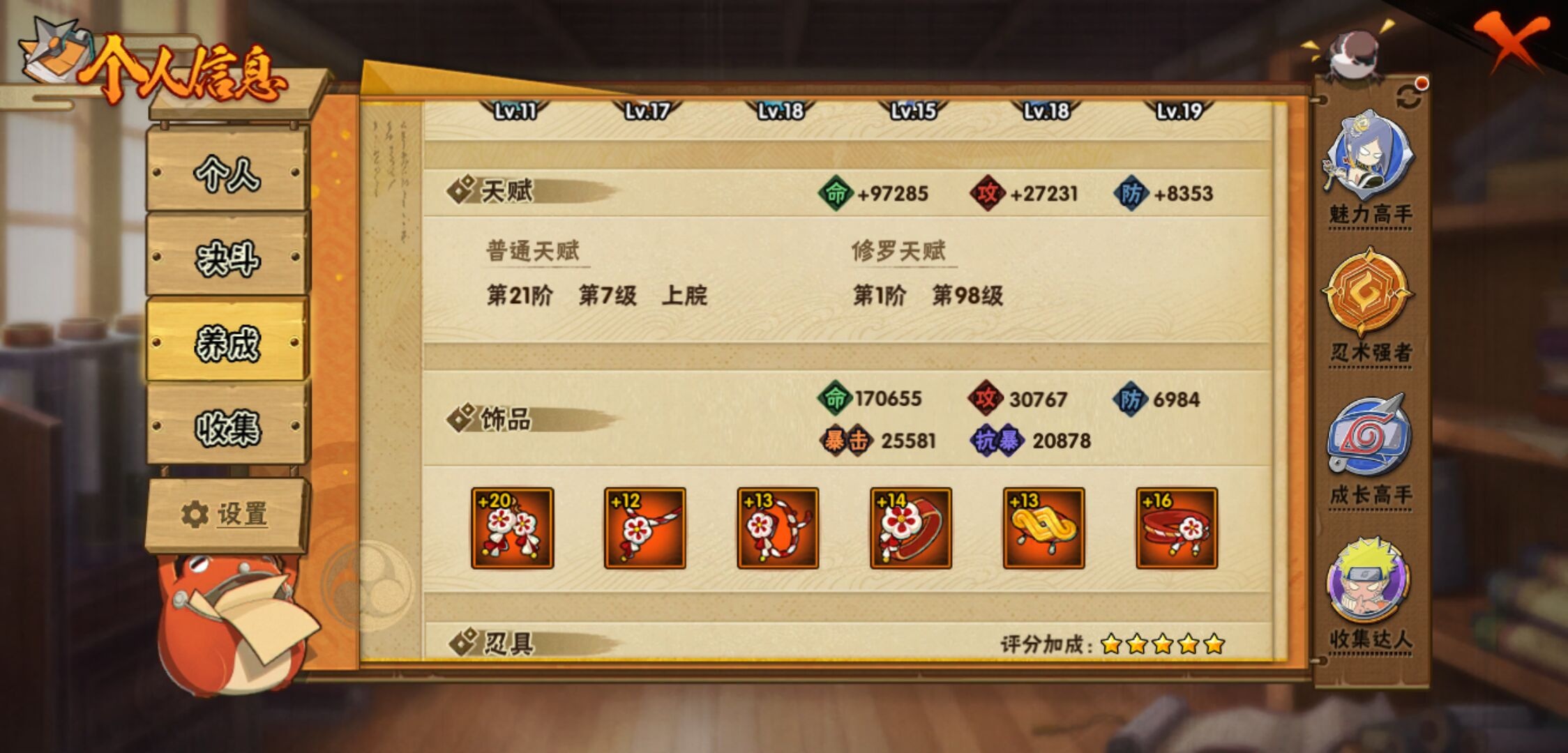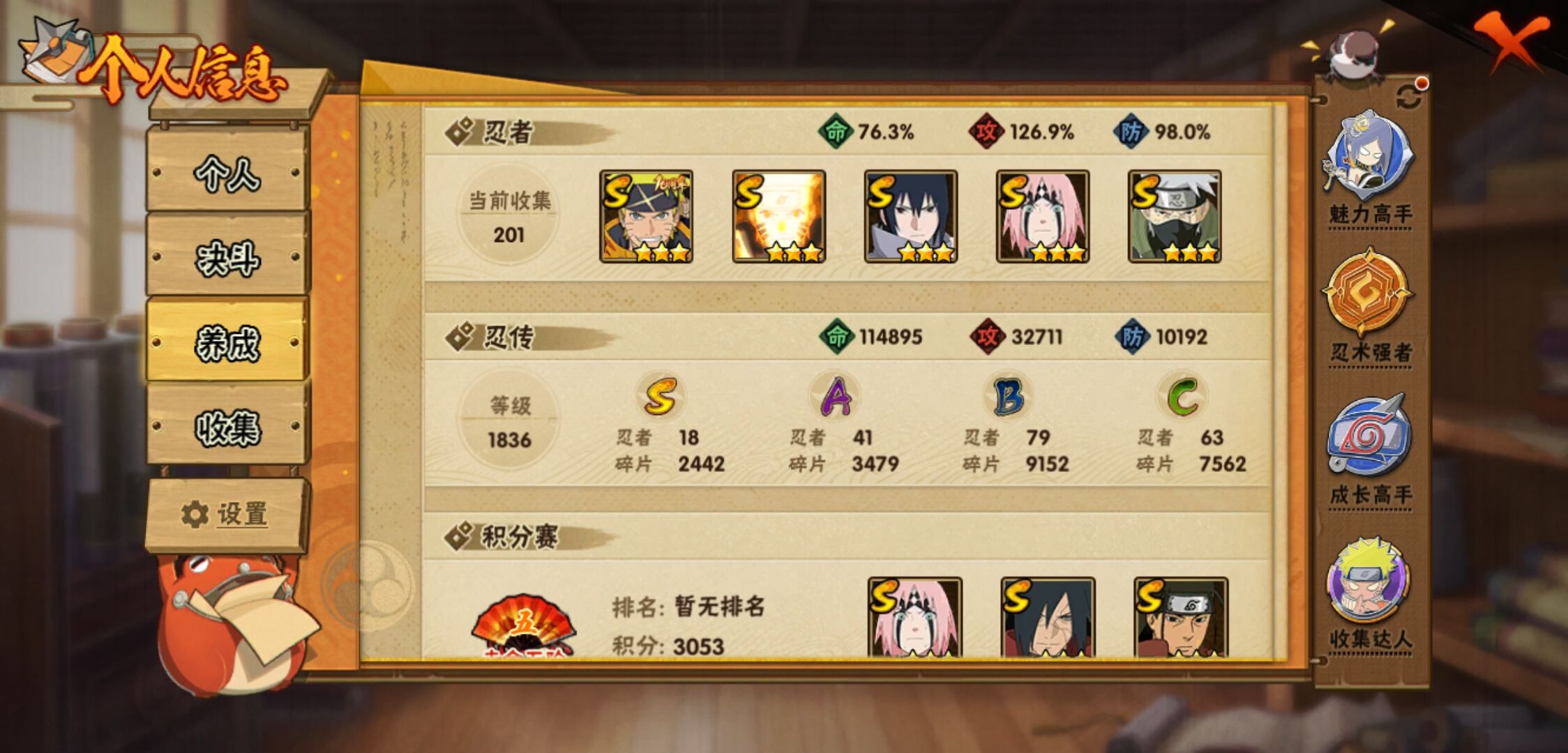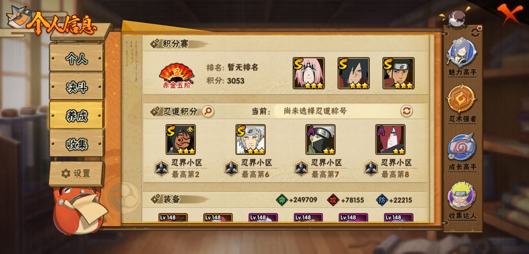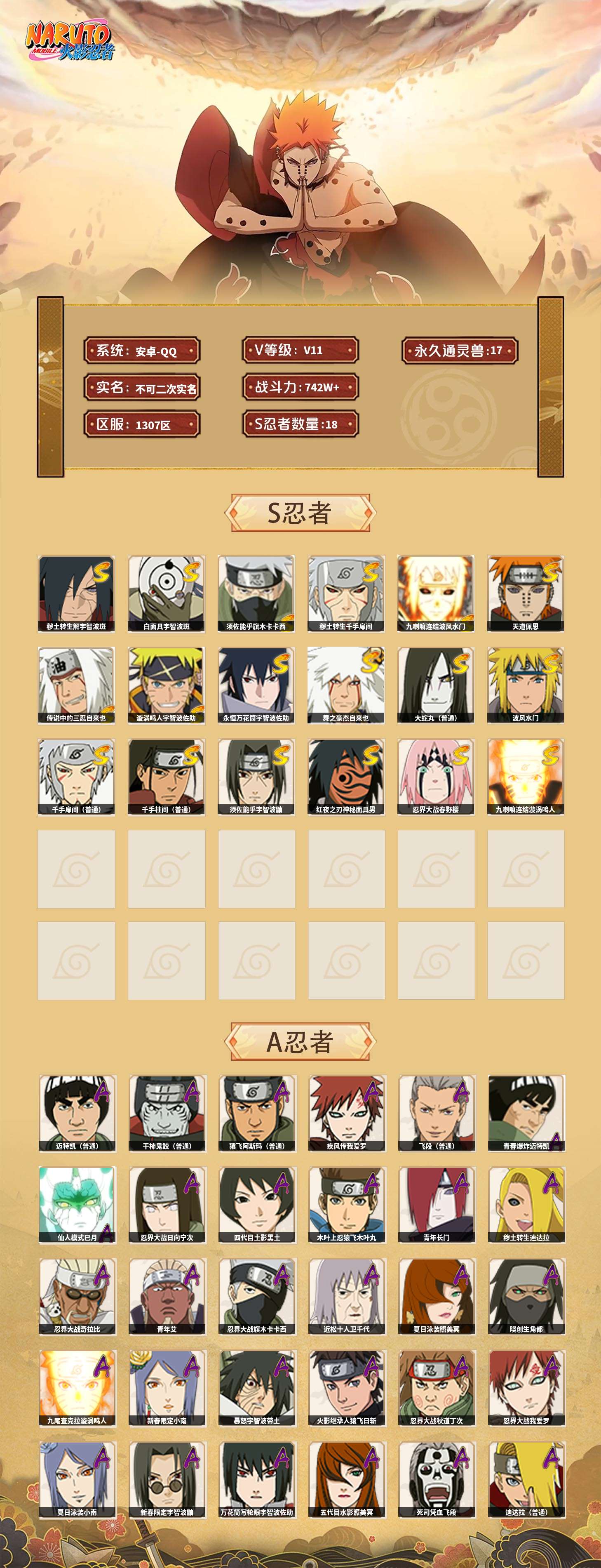 【火影忍者】【lyhy11143】s忍:秽土转生解宇智波斑|白面具宇智波斑|须佐能乎旗木卡卡西|秽土转生千手扉间|九喇嘛连结波风水门|天道佩恩|传说中的三忍自来也|漩涡鸣人宇智波佐助|永恒万花筒宇智波佐助|舞之豪杰自来也|大蛇丸(普通)|波风水门|千手扉间(普通)|千手柱间(普通)|须佐能乎宇智波鼬|红夜之刃神秘面具男|忍界大战春野樱|九喇嘛连结漩涡鸣人__a忍:青春爆炸迈特凯|仙人模式巳月|忍界大战日向宁次|四代目土影黑土|木叶上忍猿飞木叶丸|青年长门|秽土转生迪达拉|忍界大战奇拉比|青年艾|忍界大战旗木卡卡西|近松十人卫千代|夏日泳装照美冥|晓创生角都|九尾查克拉漩涡鸣人|新春限定小南|暴怒宇智波带土|火影继承人猿飞日斩|忍界大战秋道丁次|忍界大战我爱罗|夏日泳装小南|新春限定宇智波鼬|万花筒写轮眼宇智波佐助|五代目水影照美冥|死司凭血飞段|疾风传我爱罗 3星|迪达拉(普通)|飞段(普通) 3星|仙人模式漩涡鸣人|迈特凯(普通) 5星|夏日限定宇智波鼬|干柿鬼鲛(普通) 5星|秽土转生桃地再不斩|绯流琥蝎|蝎(普通)|猿飞阿斯玛(普通) 5星|最终章日向雏田|六代目水影长十郎|宇智波泉奈|羁绊神农|初始形态机械鸣人|侠隐江湖大野木__通灵兽:忍犬(普通)|蓝蛇|蛤蟆吉|忍龟|镰鼬|猿魔|山椒鱼|蜃|熊猫|蛞蝓(普通)|蛤蟆仙人|鲛鲨|蛤蟆健|乌鸦(普通)|砂之守鹤|蛤蟆龙|蛤蟆广【火影忍者】【lyhy11143】战斗力:744w;段位:暗部2阶;本服排名:1050;vip:v11级;s忍:18个;a忍:41个;通灵兽:17个,s忍:秽土转生解宇智波斑|白面具宇智波斑|须佐能乎旗木卡卡西|秽土转生千手扉间|九喇嘛连结波风水门|天道佩恩|传说中的三忍自来也|漩涡鸣人宇智波佐助|永恒万花筒宇智波佐助|舞之豪杰自来也|大蛇丸(普通)|波风水门|千手扉间(普通)|千手柱间(普通)|须佐能乎宇智波鼬|红夜之刃神秘面具男|忍界大战春野樱|九喇嘛连结漩涡鸣人__a忍:青春爆炸迈特凯|仙人模式巳月|忍界大战日向宁次|四代目土影黑土|木叶上忍猿飞木叶丸|青年长门|秽土转生迪达拉|忍界大战奇拉比|青年艾|忍界大战旗木卡卡西|近松十人卫千代|夏日泳装照美冥|晓创生角都|九尾查克拉漩涡鸣人|新春限定小南|暴怒宇智波带土|火影继承人猿飞日斩|忍界大战秋道丁次|忍界大战我爱罗|夏日泳装小南|新春限定宇智波鼬|万花筒写轮眼宇智波佐助|五代目水影照美冥|死司凭血飞段|疾风传我爱罗 3星|迪达拉(普通)|飞段(普通) 3星|仙人模式漩涡鸣人|迈特凯(普通) 5星|夏日限定宇智波鼬|干柿鬼鲛(普通) 5星|秽土转生桃地再不斩|绯流琥蝎|蝎(普通)|猿飞阿斯玛(普通) 5星|最终章日向雏田|六代目水影长十郎|宇智波泉奈|羁绊神农|初始形态机械鸣人|侠隐江湖大野木__通灵兽:忍犬(普通)|蓝蛇|蛤蟆吉|忍龟|镰鼬|猿魔|山椒鱼|蜃|熊猫|蛞蝓(普通)|蛤蟆仙人|鲛鲨|蛤蟆健|乌鸦(普通)|砂之守鹤|蛤蟆龙|蛤蟆广