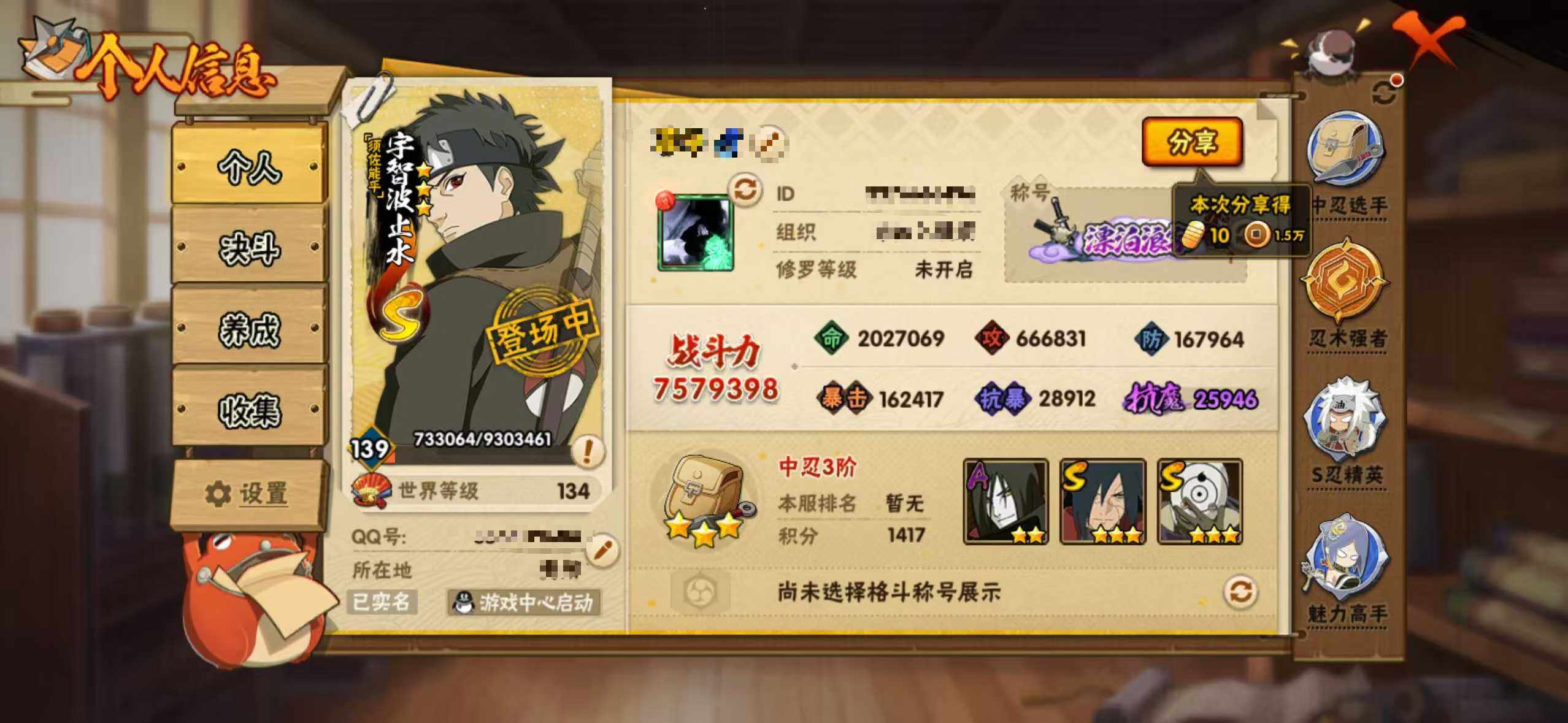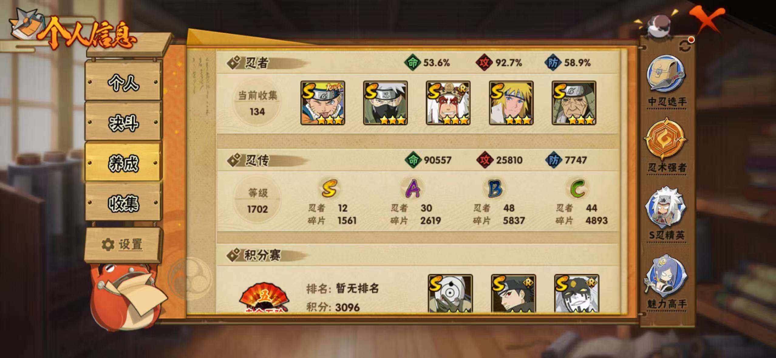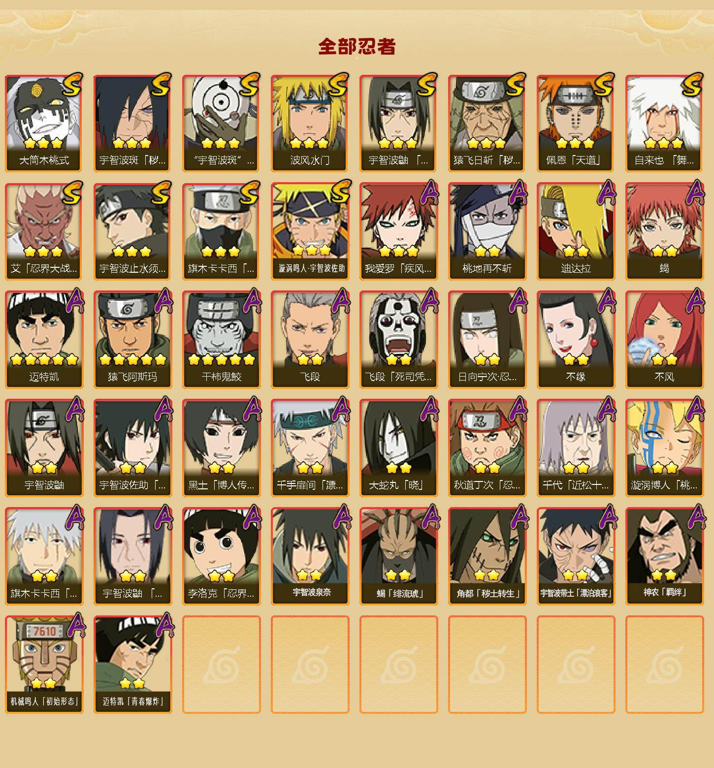 【hy595】12s级忍者数-30a级忍者数 【s级忍者】:猿飞日斩「秽土转生」3星,宇智波斑「秽土转生·解」3星,艾「忍界大战」3星,宇智波鼬「须佐能乎」3星,宇智波止水「须佐能乎」3星,旗木卡卡西「须佐能乎」3星,自来也「舞之豪杰」3星,波风水门3星,佩恩「天道」3星,宇智波斑 「白面具」3星宇智波斑「白面具」,大筒木桃式3星,漩涡鸣人·宇智波佐助3星 【a级忍者】:迪达拉2星,大蛇丸「晓」2星,飞段2星,飞段「死司凭血」2星,干柿鬼鲛5星,漩涡博人「桃式显现」2星,机械鸣人「初始形态」2星,迈特凯5星,旗木卡卡西「幻之真容」2星,桃地再不斩2星,我爱罗「疾风传」3星,蝎2星,蝎「绯流琥」2星,角都「秽土转生」2星,猿飞阿斯玛5星,宇智波鼬2星,宇智波鼬「夏日限定」2星,宇智波佐助「须佐能乎」2星,日向宁次「忍界大战」2星,宇智波带土「漂泊浪客」2星,李洛克「忍界大战」2星,黑土「博人传」2星,千手扉间「漂泊武士」2星,秋道丁次「忍界大战」2星,千代「近松十人卫」2星,神农「羁绊」2星,不缘2星,不风2星,宇智波泉奈2星,迈特凯「青春爆炸」2星