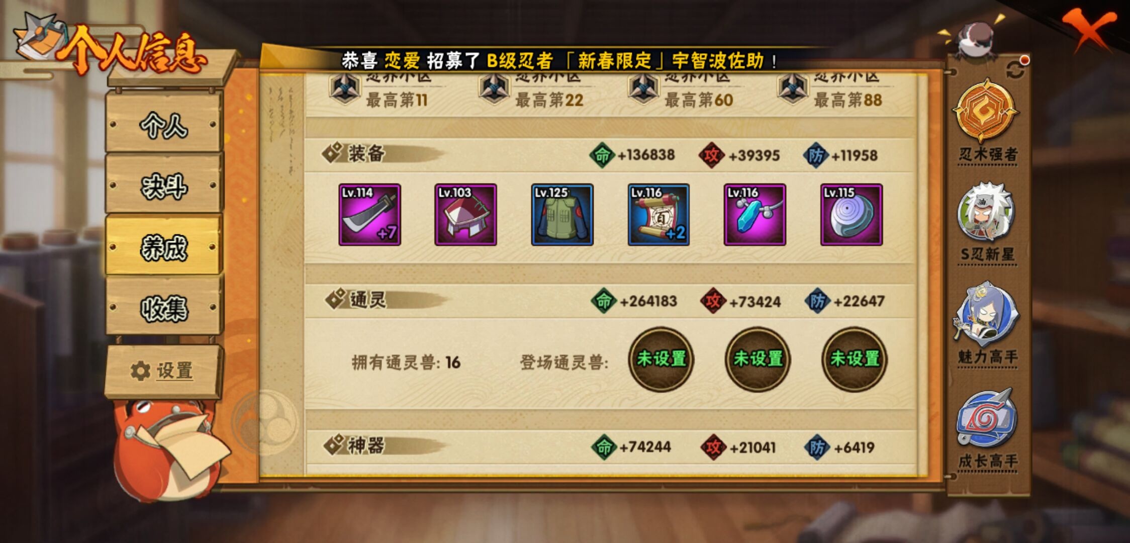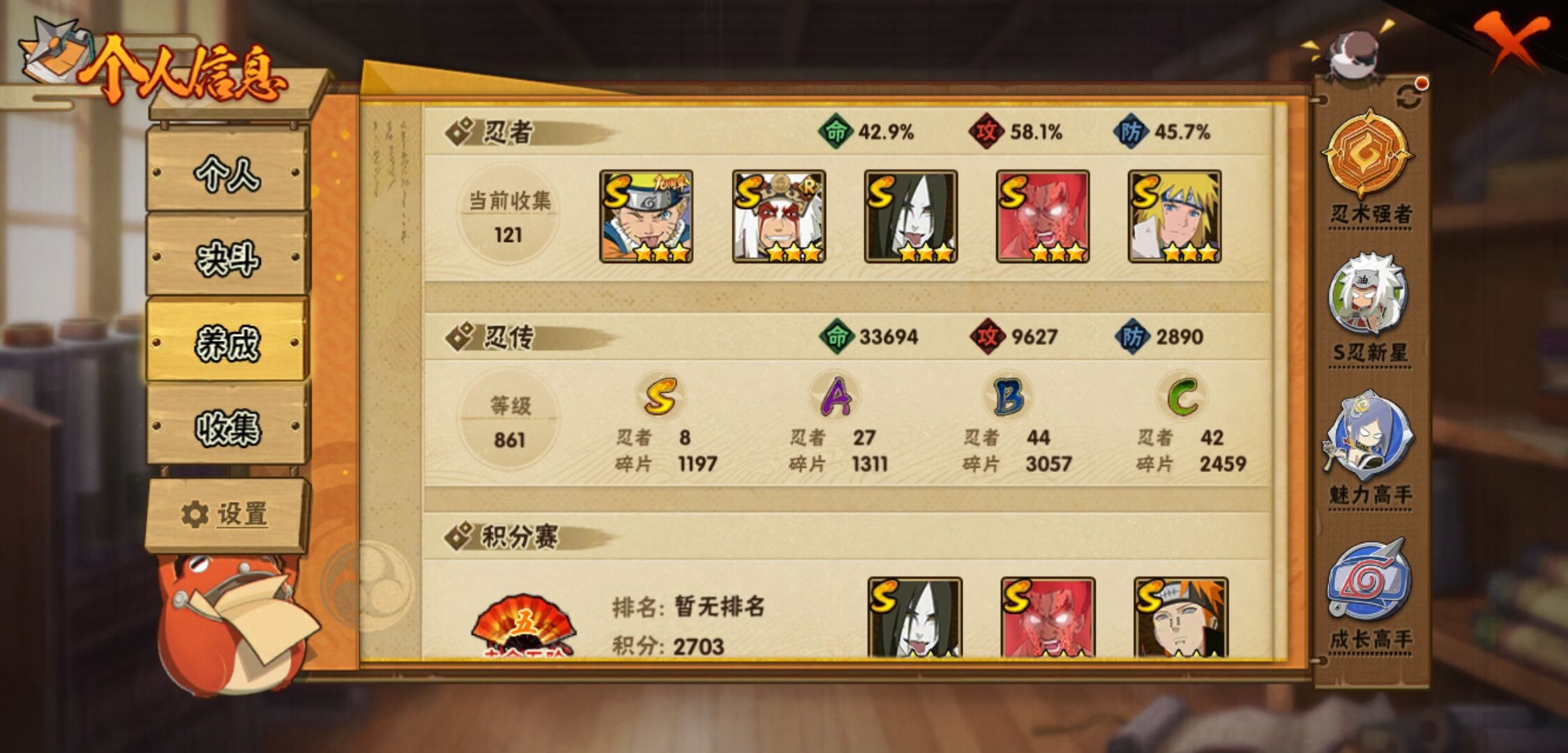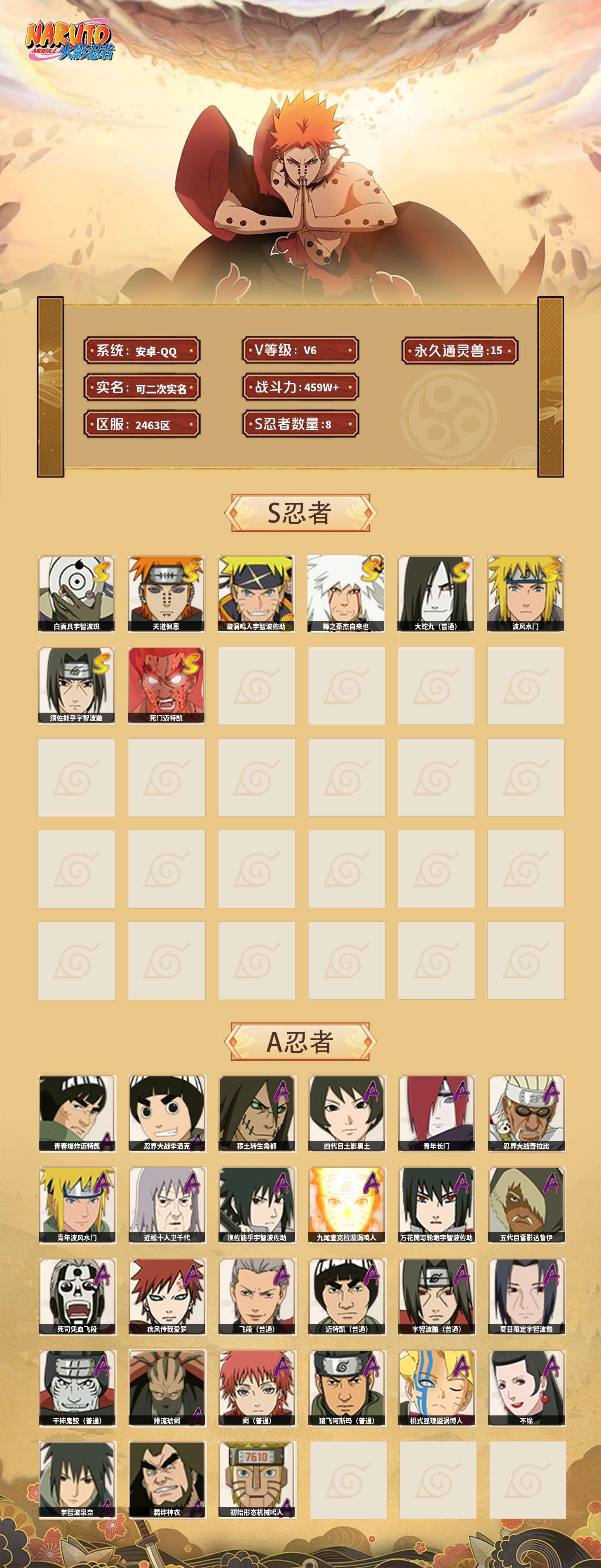 【火影忍者】【lyhy11263】战斗力:459w;段位:下忍2阶;本服排名:2176;vip:v6级;s忍:8个;a忍:27个;通灵兽:15个,s忍:白面具宇智波斑|天道佩恩|漩涡鸣人宇智波佐助|舞之豪杰自来也|大蛇丸(普通)|波风水门|须佐能乎宇智波鼬|死门迈特凯__a忍:青春爆炸迈特凯|忍界大战李洛克|秽土转生角都|四代目土影黑土|青年长门|忍界大战奇拉比|青年波风水门|近松十人卫千代|须佐能乎宇智波佐助|九尾查克拉漩涡鸣人|万花筒写轮眼宇智波佐助|五代目雷影达鲁伊|死司凭血飞段|疾风传我爱罗|飞段(普通)|迈特凯(普通)|宇智波鼬(普通)|夏日限定宇智波鼬|干柿鬼鲛(普通)|绯流琥蝎|蝎(普通)|猿飞阿斯玛(普通)|桃式显现漩涡博人|不缘|宇智波泉奈|羁绊神农|初始形态机械鸣人__通灵兽:忍犬(普通)|蓝蛇|蛤蟆吉|砂之守鹤|忍龟|镰鼬|猿魔|山椒鱼|蜃|蛤蟆仙人|鲛鲨|蛤蟆健|乌鸦(普通)|蛤蟆龙|乌鸦夏日限定
