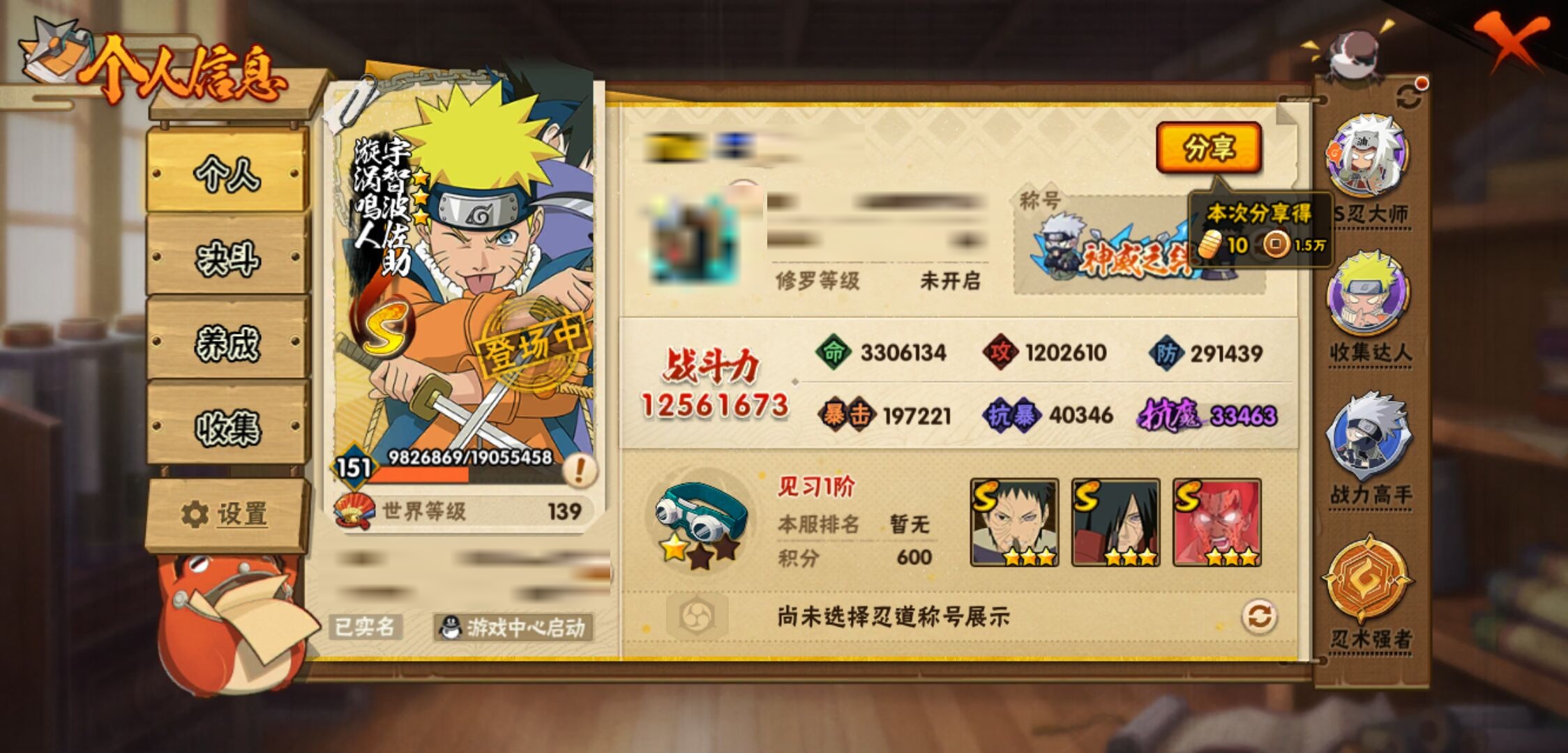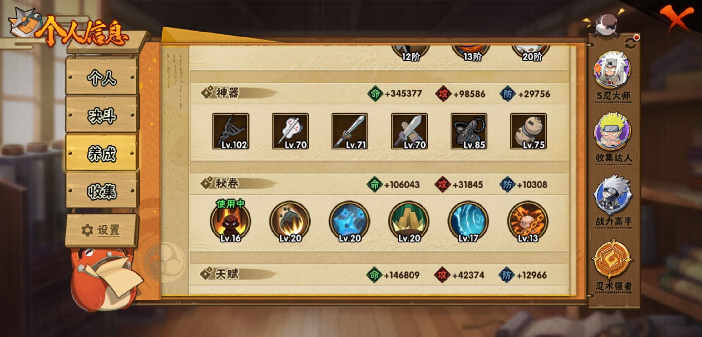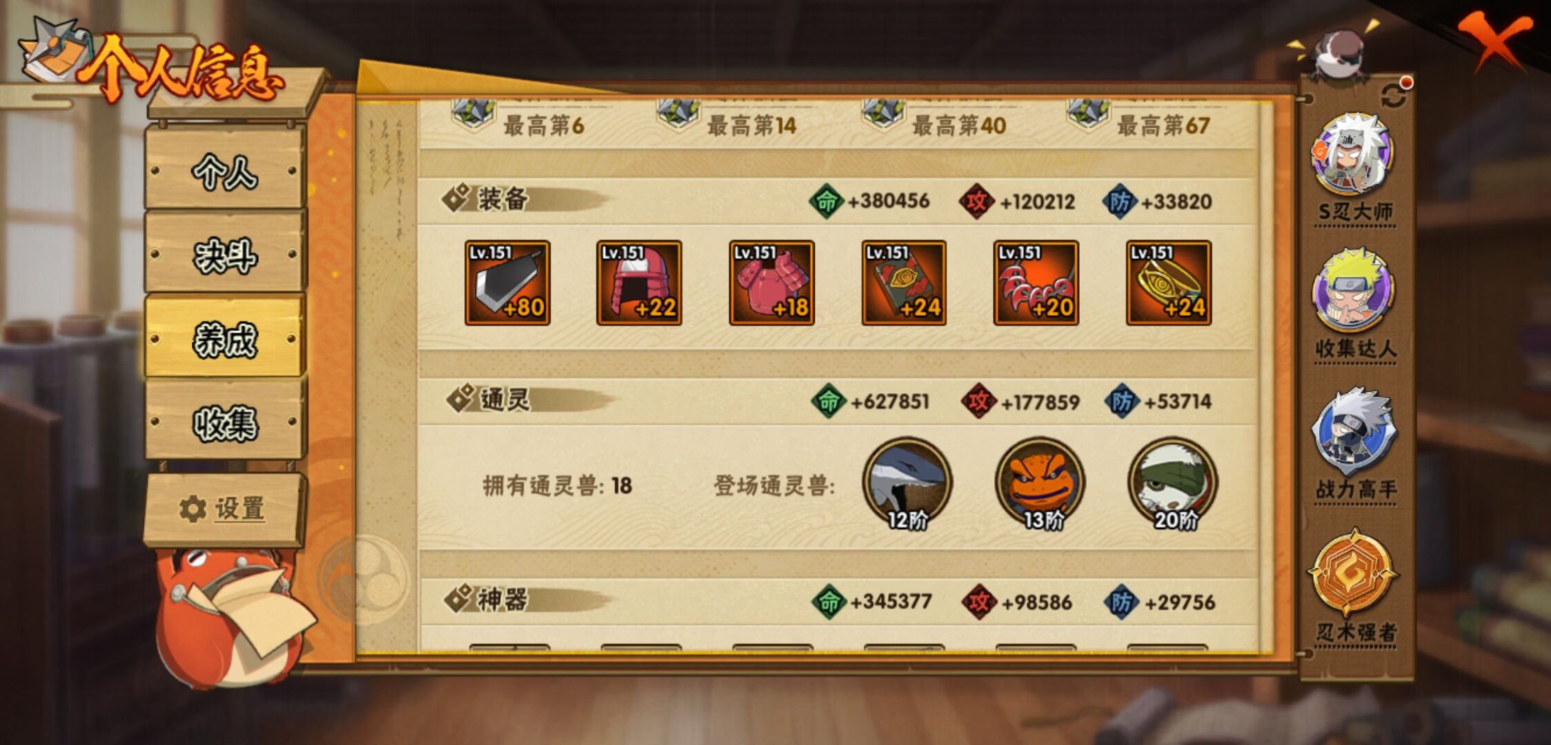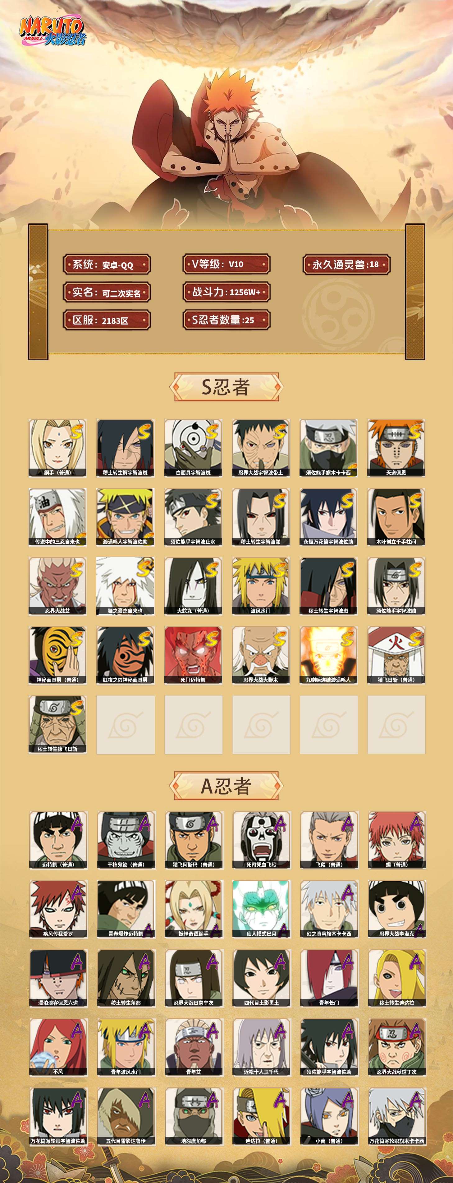 【火影忍者】【lyhy11257】s忍:秽土转生解宇智波斑|白面具宇智波斑|忍界大战宇智波带土|须佐能乎旗木卡卡西|天道佩恩|传说中的三忍自来也|漩涡鸣人宇智波佐助|须佐能乎宇智波止水|秽土转生宇智波鼬|永恒万花筒宇智波佐助|木叶创立千手柱间|忍界大战艾|舞之豪杰自来也|大蛇丸(普通)|纲手(普通) 4星|波风水门|秽土转生宇智波斑|须佐能乎宇智波鼬|神秘面具男(普通)|红夜之刃神秘面具男|死门迈特凯|忍界大战大野木|九喇嘛连结漩涡鸣人|猿飞日斩(普通)|秽土转生猿飞日斩__a忍:青春爆炸迈特凯|妖怪奇谭纲手|仙人模式巳月|幻之真容旗木卡卡西|忍界大战李洛克|漂泊浪客佩恩六道|秽土转生角都|忍界大战日向宁次|四代目土影黑土|青年长门|秽土转生迪达拉|不风|青年波风水门|青年艾|近松十人卫千代|须佐能乎宇智波佐助|忍界大战秋道丁次|万花筒写轮眼宇智波佐助|五代目雷影达鲁伊|死司凭血飞段 4星|地怨虞角都|疾风传我爱罗 3星|迪达拉(普通)|飞段(普通) 4星|小南(普通)|万花筒写轮眼旗木卡卡西|迈特凯(普通) 5星|宇智波鼬(普通)|干柿鬼鲛(普通) 5星|秽土转生桃地再不斩|蝎(普通) 4星|绯流琥蝎|猿飞阿斯玛(普通) 5星|桃式显现漩涡博人|最终章日向雏田|六代目水影长十郎|不缘|不动|宇智波泉奈|羁绊神农|忍界大战土台|初始形态机械鸣人__通灵兽:忍犬(普通)|蓝蛇|蛤蟆吉|忍龟|镰鼬|猿魔|山椒鱼|砂之守鹤|蜃|蛤蟆仙人|鲛鲨|蛤蟆健|乌鸦(普通)|蛞蝓(普通)|蛤蟆龙|蛤蟆广|梦貘|鹰1,战斗力:1256;vip:v10级