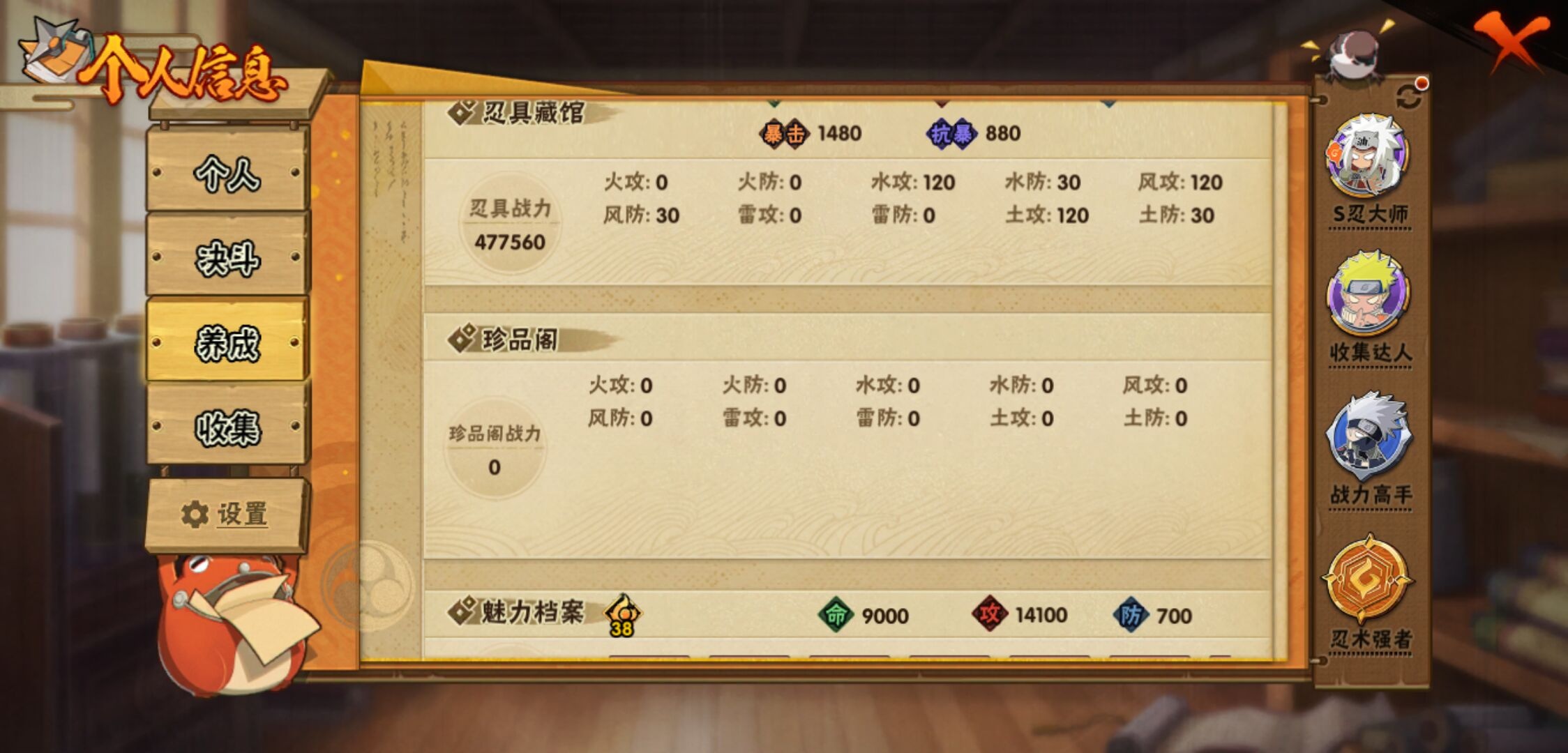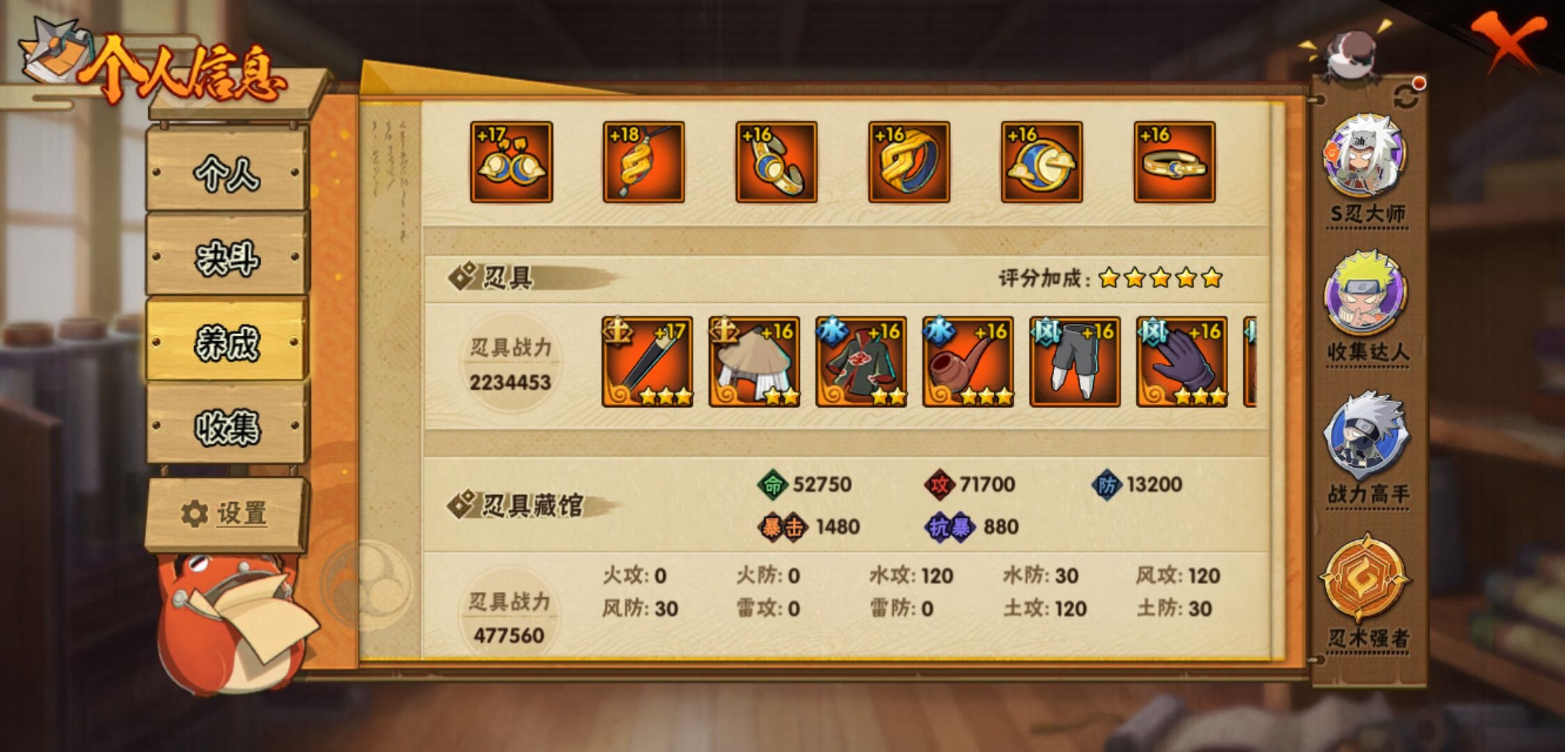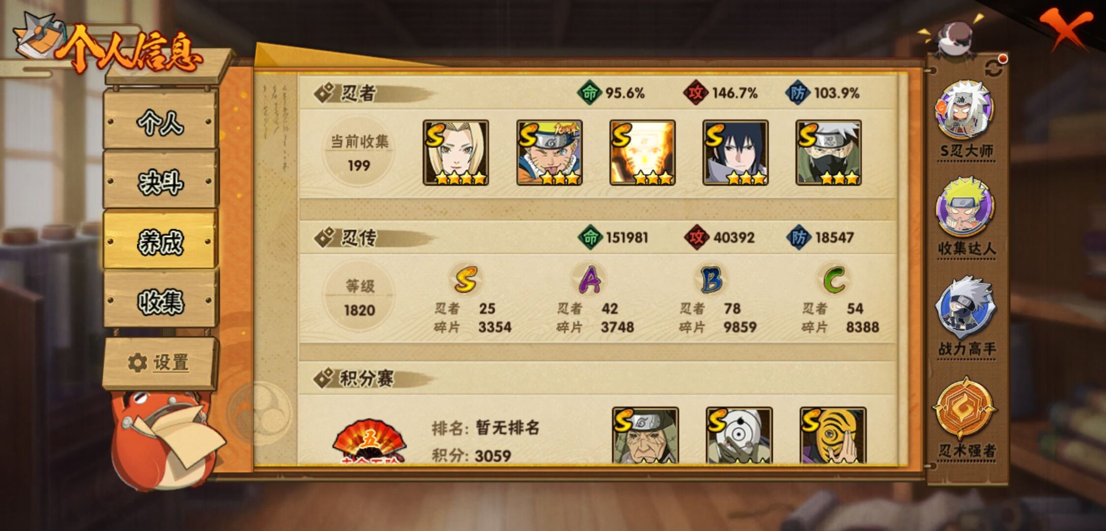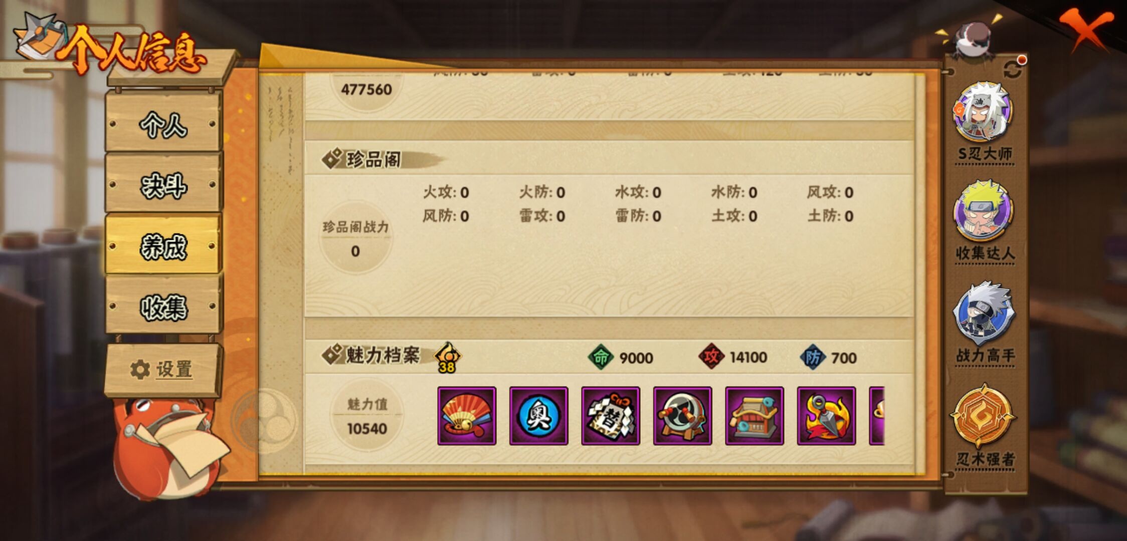 【火影忍者】【lyhy11257】s忍:秽土转生解宇智波斑|白面具宇智波斑|忍界大战宇智波带土|须佐能乎旗木卡卡西|天道佩恩|传说中的三忍自来也|漩涡鸣人宇智波佐助|须佐能乎宇智波止水|秽土转生宇智波鼬|永恒万花筒宇智波佐助|木叶创立千手柱间|忍界大战艾|舞之豪杰自来也|大蛇丸(普通)|纲手(普通) 4星|波风水门|秽土转生宇智波斑|须佐能乎宇智波鼬|神秘面具男(普通)|红夜之刃神秘面具男|死门迈特凯|忍界大战大野木|九喇嘛连结漩涡鸣人|猿飞日斩(普通)|秽土转生猿飞日斩__a忍:青春爆炸迈特凯|妖怪奇谭纲手|仙人模式巳月|幻之真容旗木卡卡西|忍界大战李洛克|漂泊浪客佩恩六道|秽土转生角都|忍界大战日向宁次|四代目土影黑土|青年长门|秽土转生迪达拉|不风|青年波风水门|青年艾|近松十人卫千代|须佐能乎宇智波佐助|忍界大战秋道丁次|万花筒写轮眼宇智波佐助|五代目雷影达鲁伊|死司凭血飞段 4星|地怨虞角都|疾风传我爱罗 3星|迪达拉(普通)|飞段(普通) 4星|小南(普通)|万花筒写轮眼旗木卡卡西|迈特凯(普通) 5星|宇智波鼬(普通)|干柿鬼鲛(普通) 5星|秽土转生桃地再不斩|蝎(普通) 4星|绯流琥蝎|猿飞阿斯玛(普通) 5星|桃式显现漩涡博人|最终章日向雏田|六代目水影长十郎|不缘|不动|宇智波泉奈|羁绊神农|忍界大战土台|初始形态机械鸣人__通灵兽:忍犬(普通)|蓝蛇|蛤蟆吉|忍龟|镰鼬|猿魔|山椒鱼|砂之守鹤|蜃|蛤蟆仙人|鲛鲨|蛤蟆健|乌鸦(普通)|蛞蝓(普通)|蛤蟆龙|蛤蟆广|梦貘|鹰1,战斗力:1256;vip:v10级