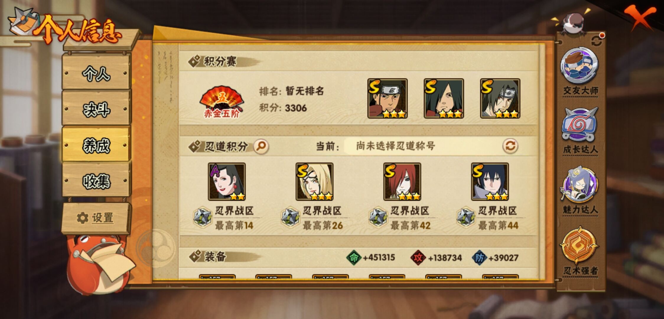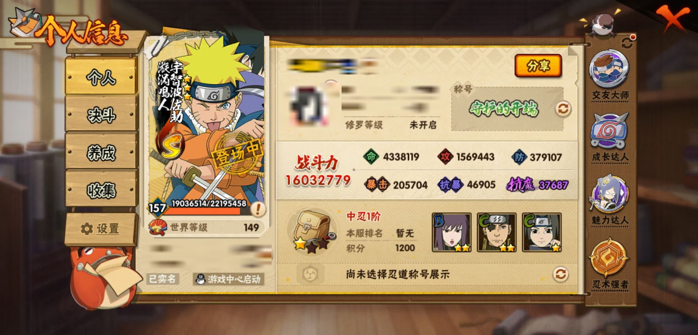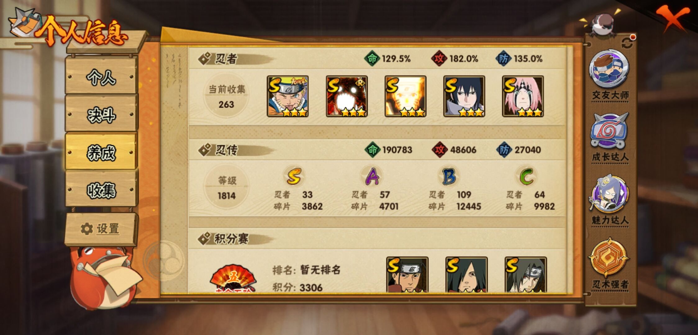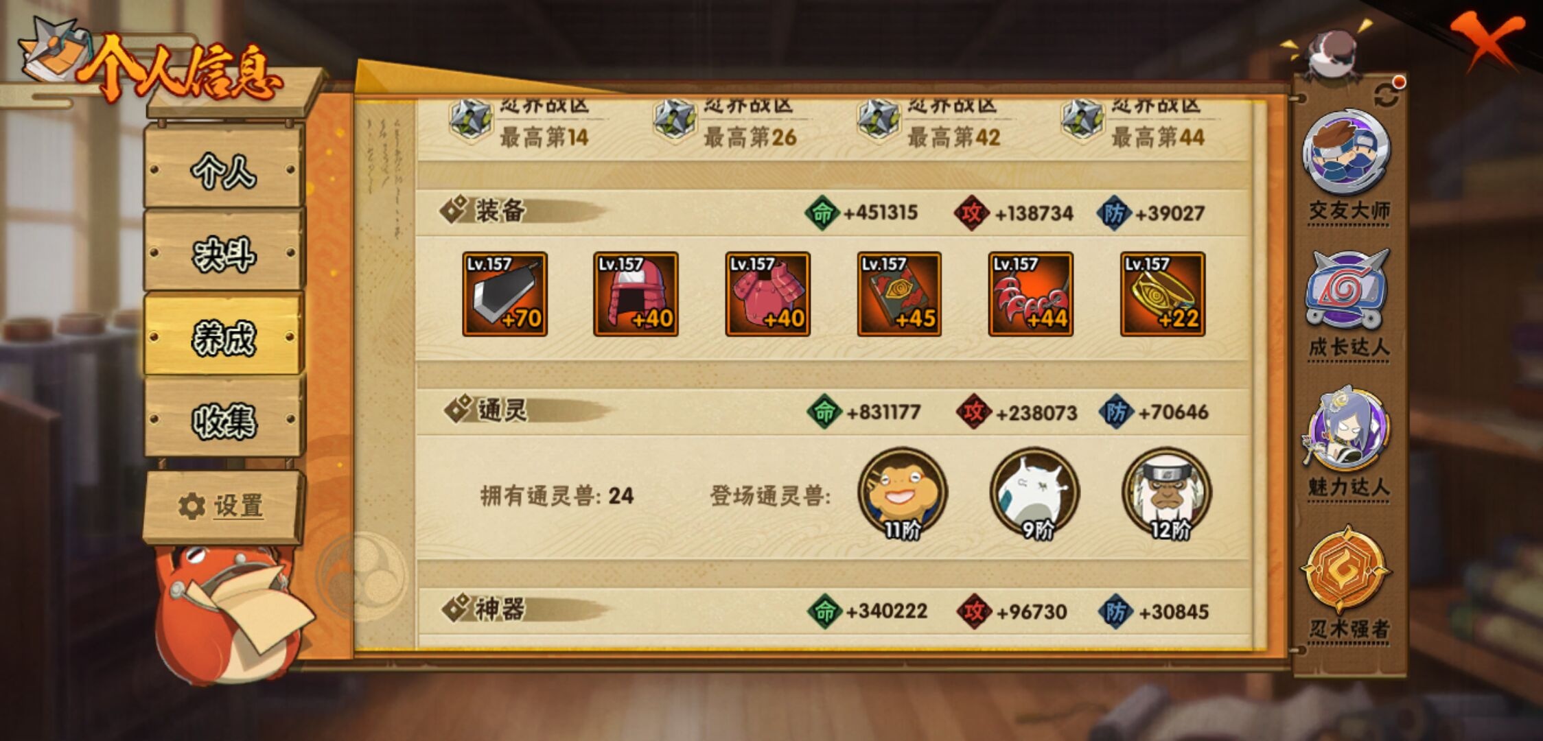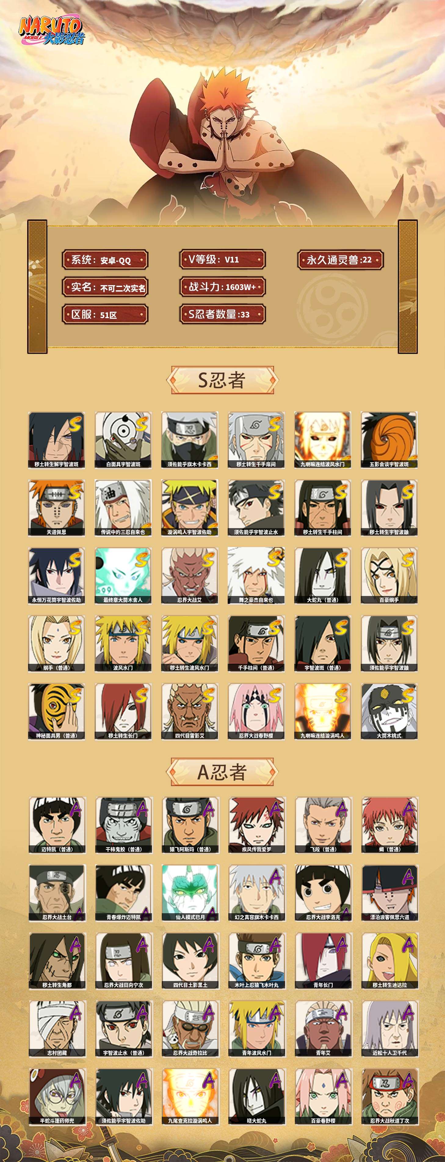 【火影忍者】【lyhy11270】战斗力:1603w;段位:中忍1阶;本服排名:309;vip:v11级;s忍:33个;a忍:57个;通灵兽:22个,s忍:秽土转生解宇智波斑|白面具宇智波斑|须佐能乎旗木卡卡西|秽土转生千手扉间|九喇嘛连结波风水门|五影会谈宇智波斑|天道佩恩|传说中的三忍自来也|漩涡鸣人宇智波佐助|须佐能乎宇智波止水|秽土转生千手柱间|秽土转生宇智波鼬|永恒万花筒宇智波佐助|最终章大筒木舍人|忍界大战艾|舞之豪杰自来也|大蛇丸(普通)|百豪纲手|纲手(普通)|波风水门|秽土转生波风水门|千手柱间(普通)|宇智波斑(普通)|须佐能乎宇智波鼬|神秘面具男(普通)|秽土转生长门|四代目雷影艾|忍界大战春野樱|九喇嘛连结漩涡鸣人|大筒木桃式|秽土转生猿飞日斩|自来也(普通)|暴怒第六尾漩涡鸣人__a忍:青春爆炸迈特凯|仙人模式巳月|幻之真容旗木卡卡西|忍界大战李洛克|漂泊浪客佩恩六道|秽土转生角都|忍界大战日向宁次|四代目土影黑土|木叶上忍猿飞木叶丸|青年长门|秽土转生迪达拉|志村团藏|宇智波止水(普通)|忍界大战奇拉比|青年波风水门|青年艾|近松十人卫千代|半蛇斗篷药师兜|须佐能乎宇智波佐助|九尾查克拉漩涡鸣人|晓大蛇丸|百豪春野樱|忍界大战秋道丁次|忍界大战我爱罗|忍界大战勘九郎|新春限定宇智波鼬|奇拉比(普通)|万花筒写轮眼宇智波佐助|五代目水影照美冥|五代目雷影达鲁伊|三船(普通)|绝|死司凭血飞段|疾风传我爱罗 4星|迪达拉(普通)|飞段(普通) 4星|小南(普通)|仙人模式漩涡鸣人|万花筒写轮眼旗木卡卡西|迈特凯(普通) 5星|宇智波鼬(普通)|干柿鬼鲛(普通) 5星|秽土转生桃地再不斩|桃地再不斩|蝎(普通) 4星|绯流琥蝎|猿飞阿斯玛(普通) 5星|桃式显现漩涡博人|最终章日向雏田|六代目水影长十郎|不缘|不动|宇智波泉奈|羁绊神农|忍界大战土台 3星|初始形态机械鸣人|侠隐江湖大野木__通灵兽:忍犬(普通)|蓝蛇|蛤蟆吉|忍龟|镰鼬|猿魔|山椒鱼|蛞蝓(普通)|熊猫|蛤蟆文太|蜃|蛤蟆仙人|鲛鲨|蛤蟆健|乌鸦(普通)|蛤蟆龙|砂之守鹤|蛤蟆广|梦貘|辛牙|鹰|蜘蛛