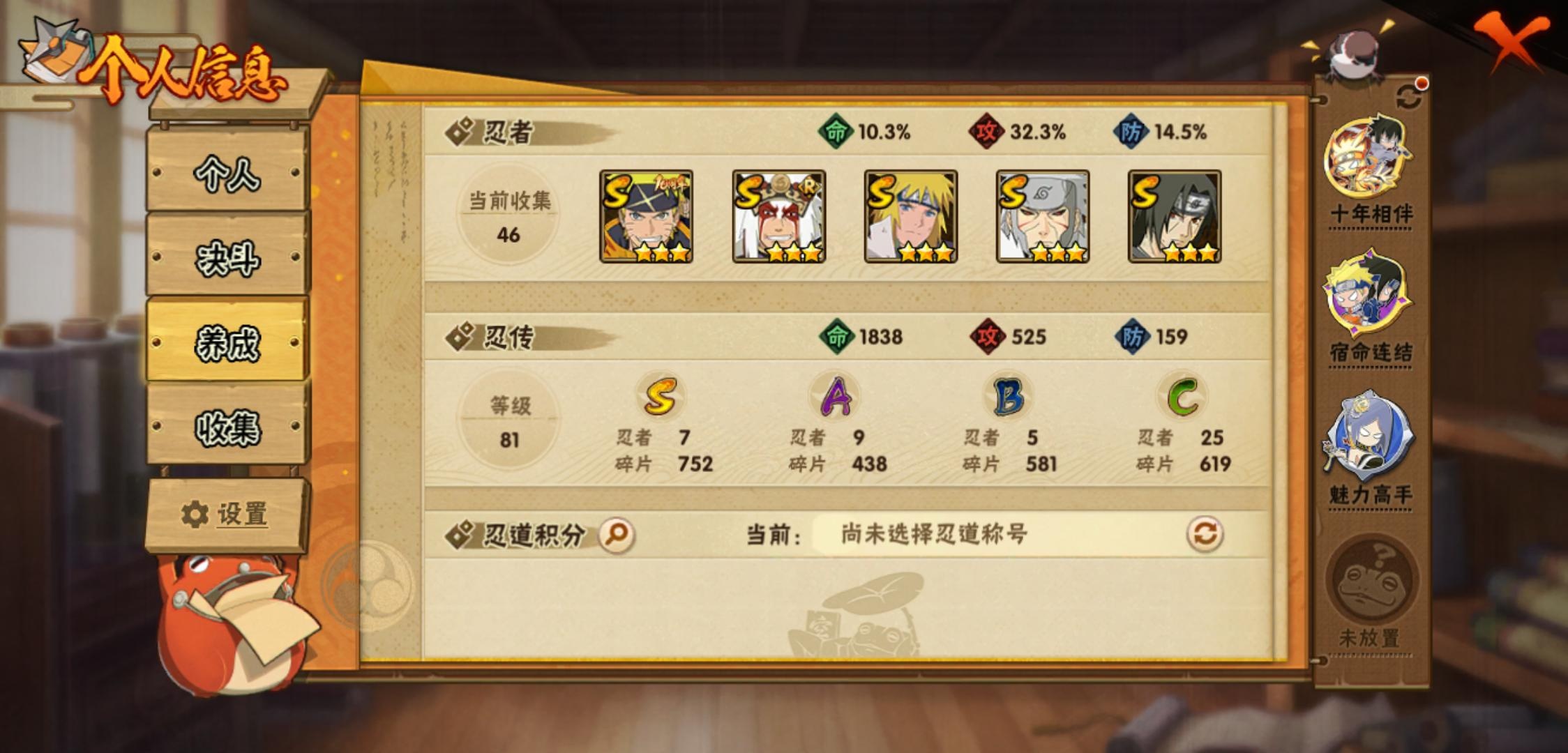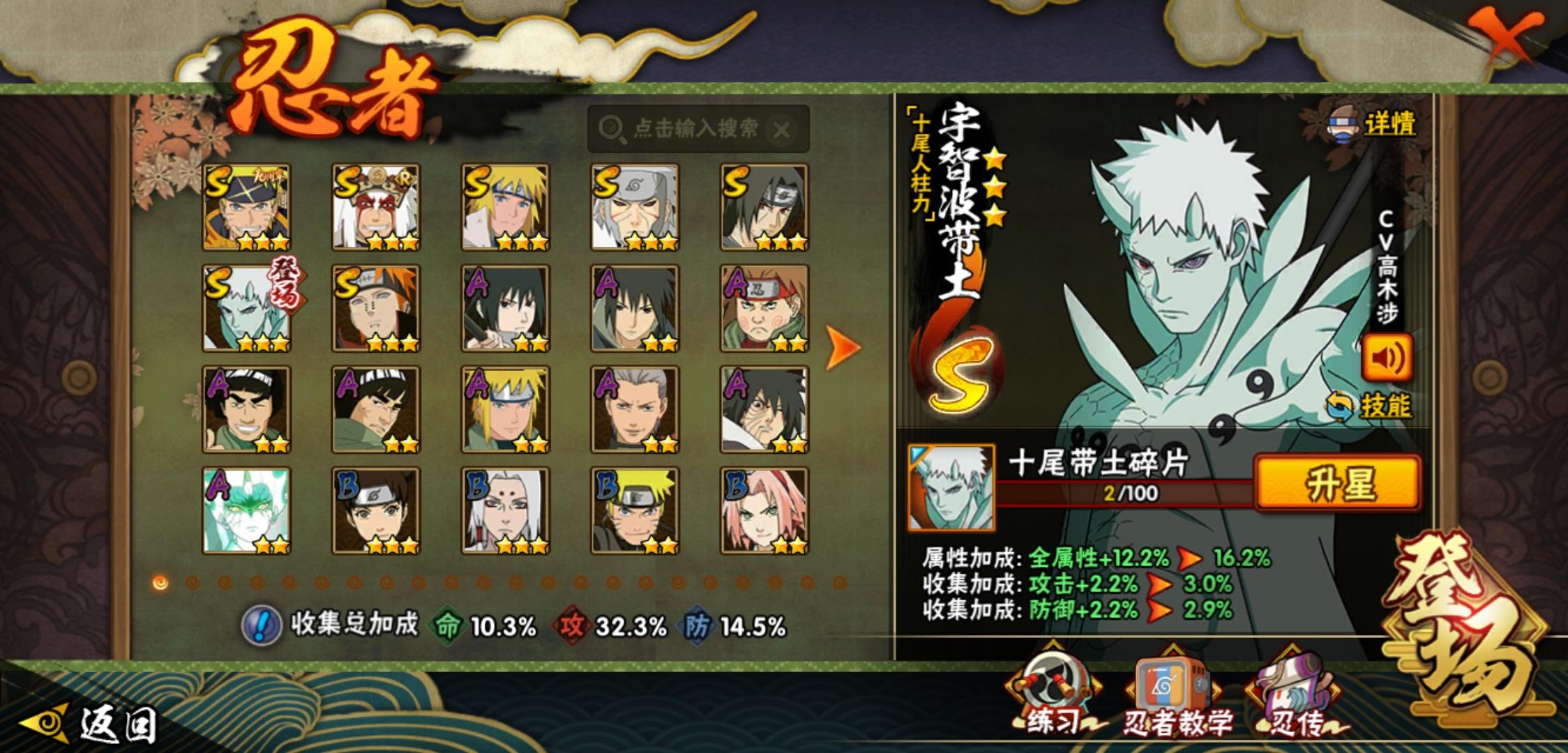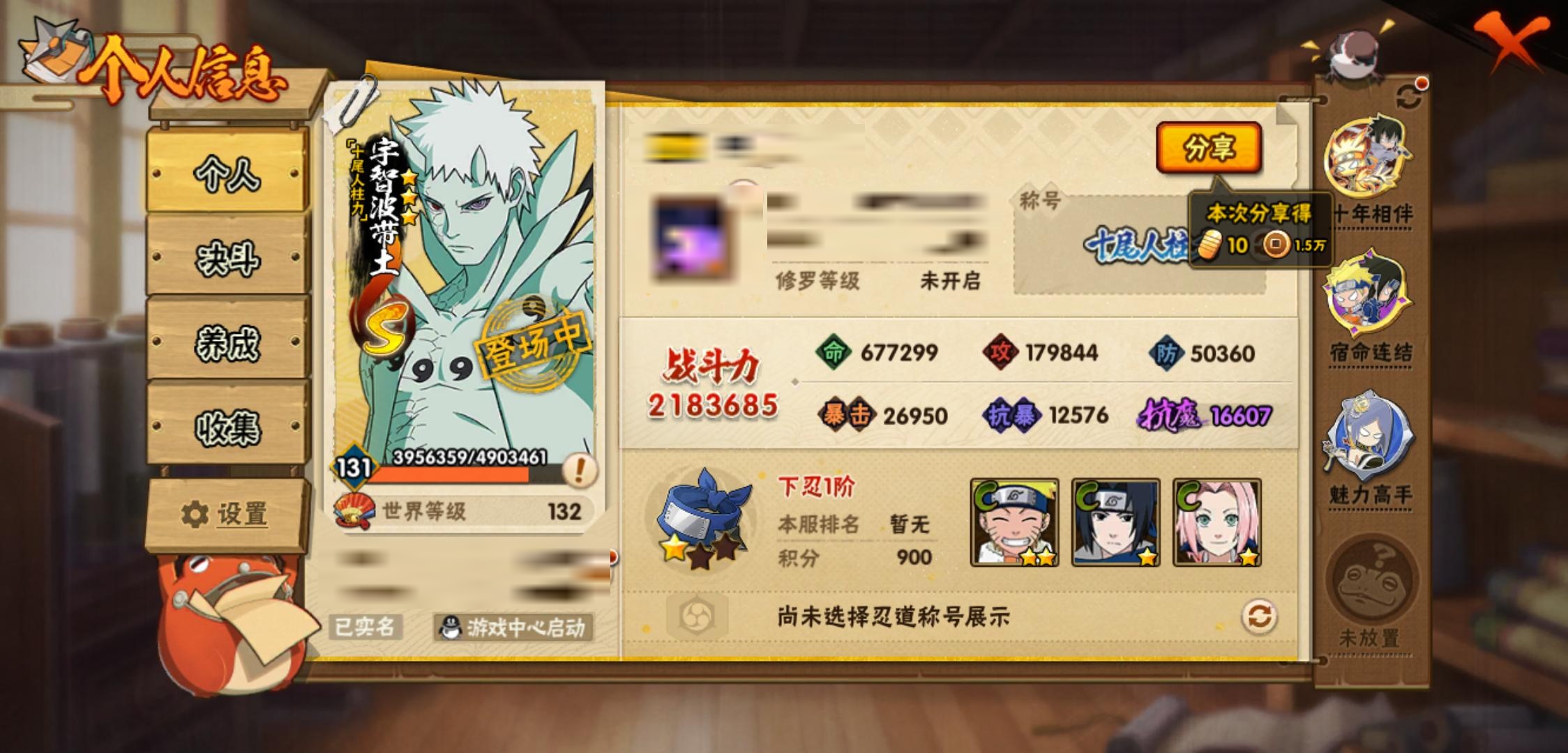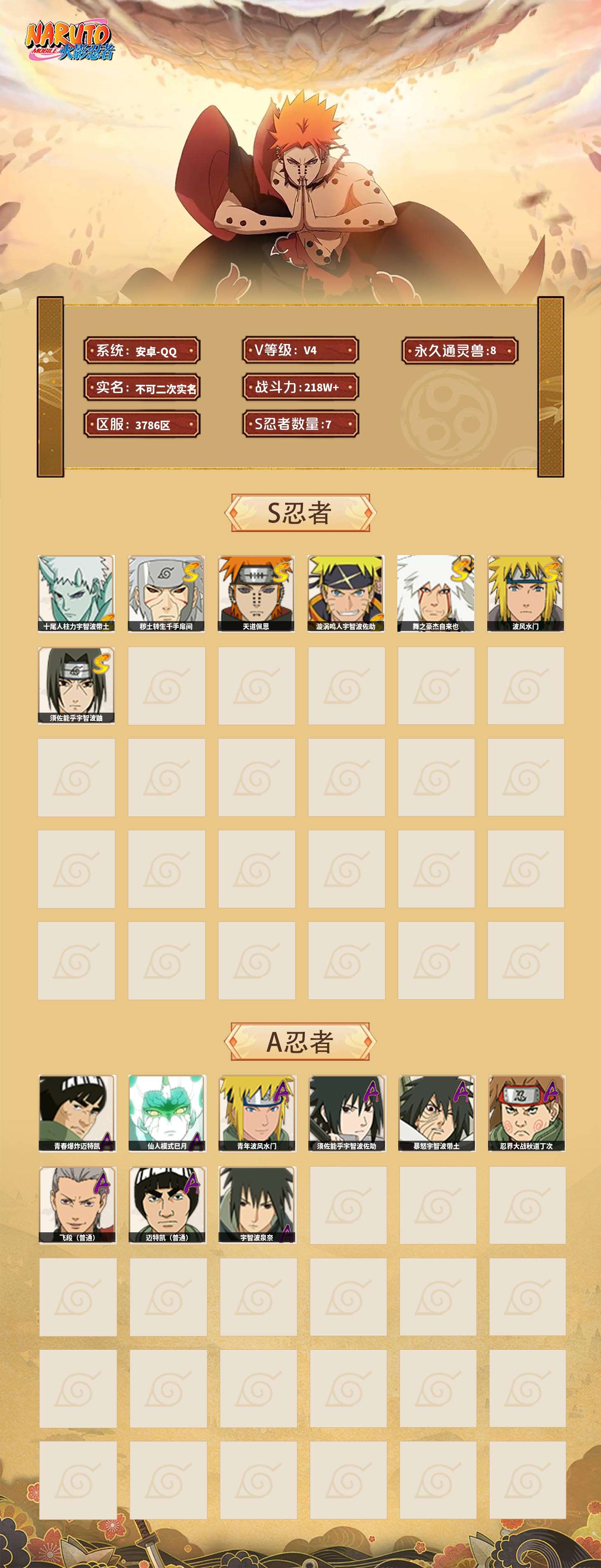 【火影忍者】【lyhy11275】战斗力:218w;段位:下忍1阶;本服排名:4596;vip:v4级;s忍:7个;a忍:9个;通灵兽:8个,s忍:十尾人柱力宇智波带土|秽土转生千手扉间|天道佩恩|漩涡鸣人宇智波佐助|舞之豪杰自来也|波风水门|须佐能乎宇智波鼬__a忍:青春爆炸迈特凯|仙人模式巳月|青年波风水门|须佐能乎宇智波佐助|暴怒宇智波带土|忍界大战秋道丁次|飞段(普通)|迈特凯(普通)|宇智波泉奈__通灵兽:忍犬(普通)|蓝蛇|蛤蟆吉|忍龟|镰鼬|猿魔|山椒鱼|砂之守鹤