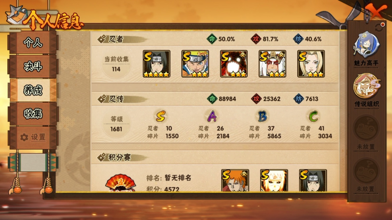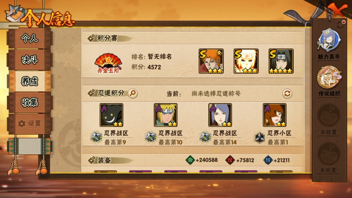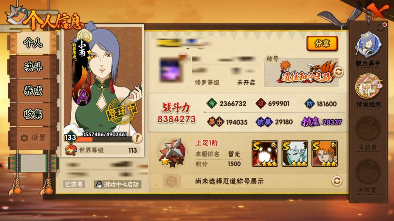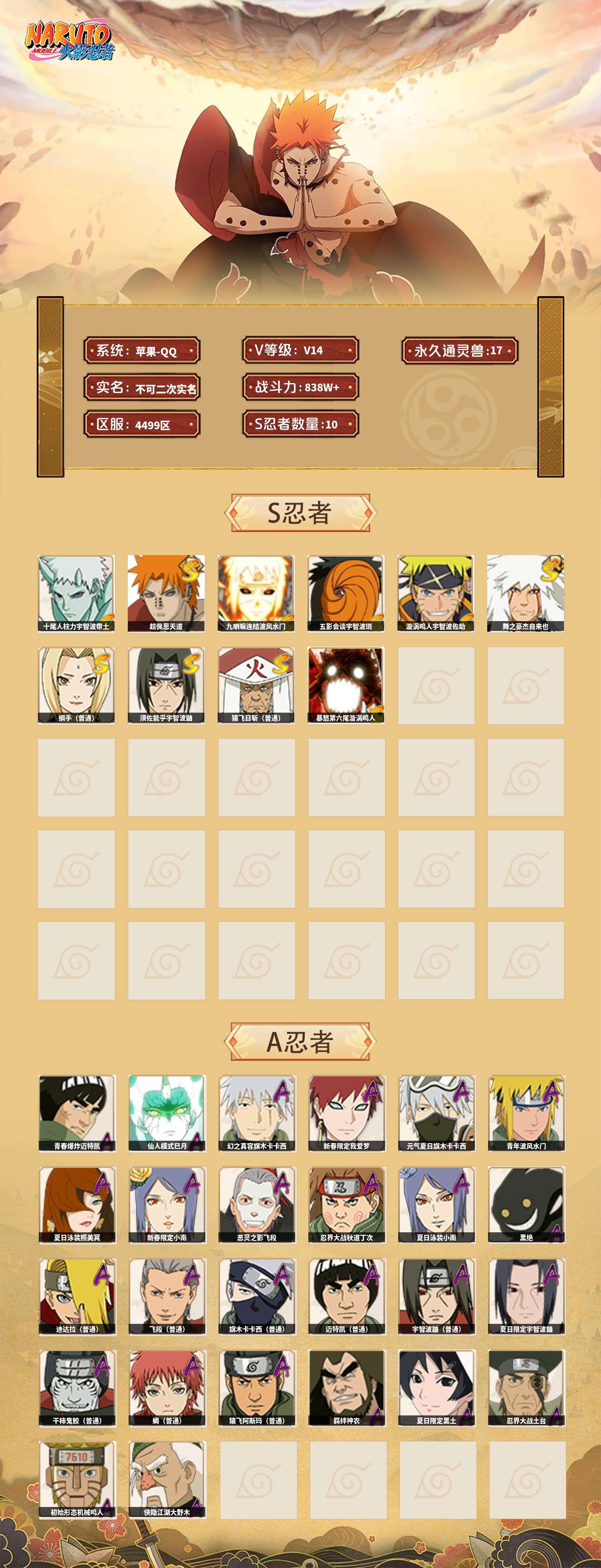 【火影忍者】【lyhy11279】战斗力:838w;段位:上忍1阶;本服排名:8;vip:v14级;s忍:10个;a忍:26个;通灵兽:17个,s忍:十尾人柱力宇智波带土|超佩恩天道|九喇嘛连结波风水门|五影会谈宇智波斑|漩涡鸣人宇智波佐助|舞之豪杰自来也|纲手(普通)|须佐能乎宇智波鼬|猿飞日斩(普通)|暴怒第六尾漩涡鸣人__a忍:青春爆炸迈特凯|仙人模式巳月|幻之真容旗木卡卡西|新春限定我爱罗|元气夏日旗木卡卡西|青年波风水门|夏日泳装照美冥|新春限定小南|恶灵之影飞段|忍界大战秋道丁次|夏日泳装小南|黑绝|迪达拉(普通)|飞段(普通)|旗木卡卡西(普通)|迈特凯(普通)|宇智波鼬(普通)|夏日限定宇智波鼬|干柿鬼鲛(普通)|蝎(普通)|猿飞阿斯玛(普通)|羁绊神农|夏日限定黑土|忍界大战土台|初始形态机械鸣人|侠隐江湖大野木__通灵兽:忍犬(普通)|蓝蛇|蛤蟆吉|忍龟|镰鼬|猿魔|蛞蝓(普通)|砂之守鹤|山椒鱼|蜃|蛤蟆仙人|守鹤(普通)|鲛鲨|蛤蟆健|乌鸦(普通)|蛤蟆龙|熊猫