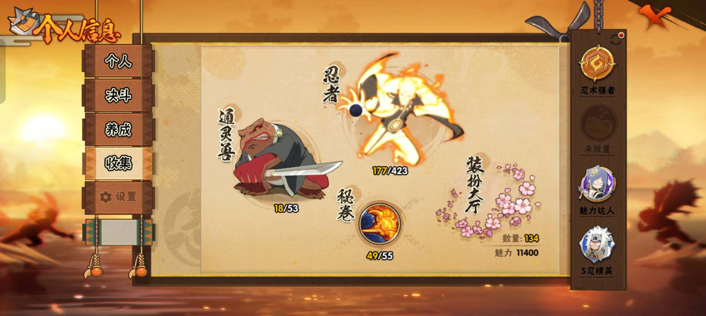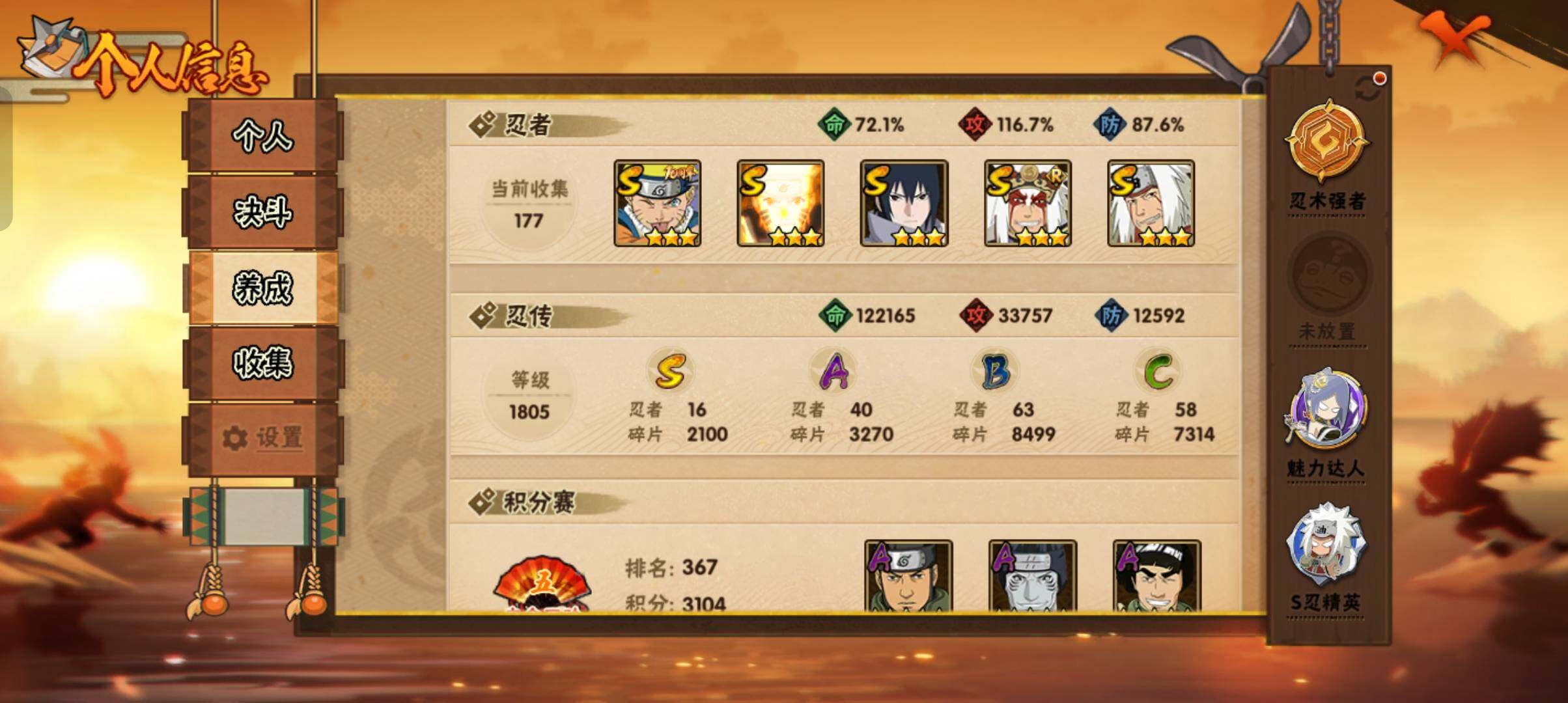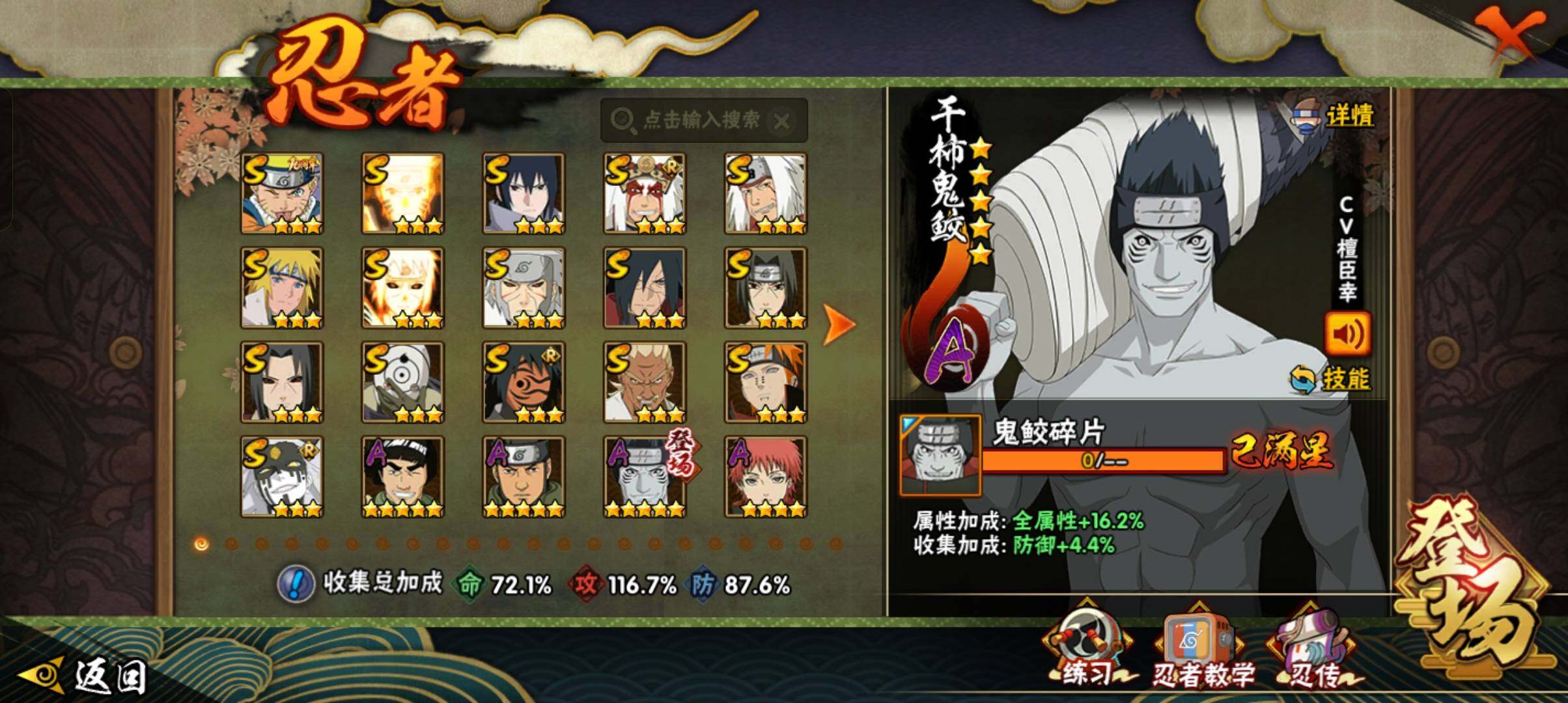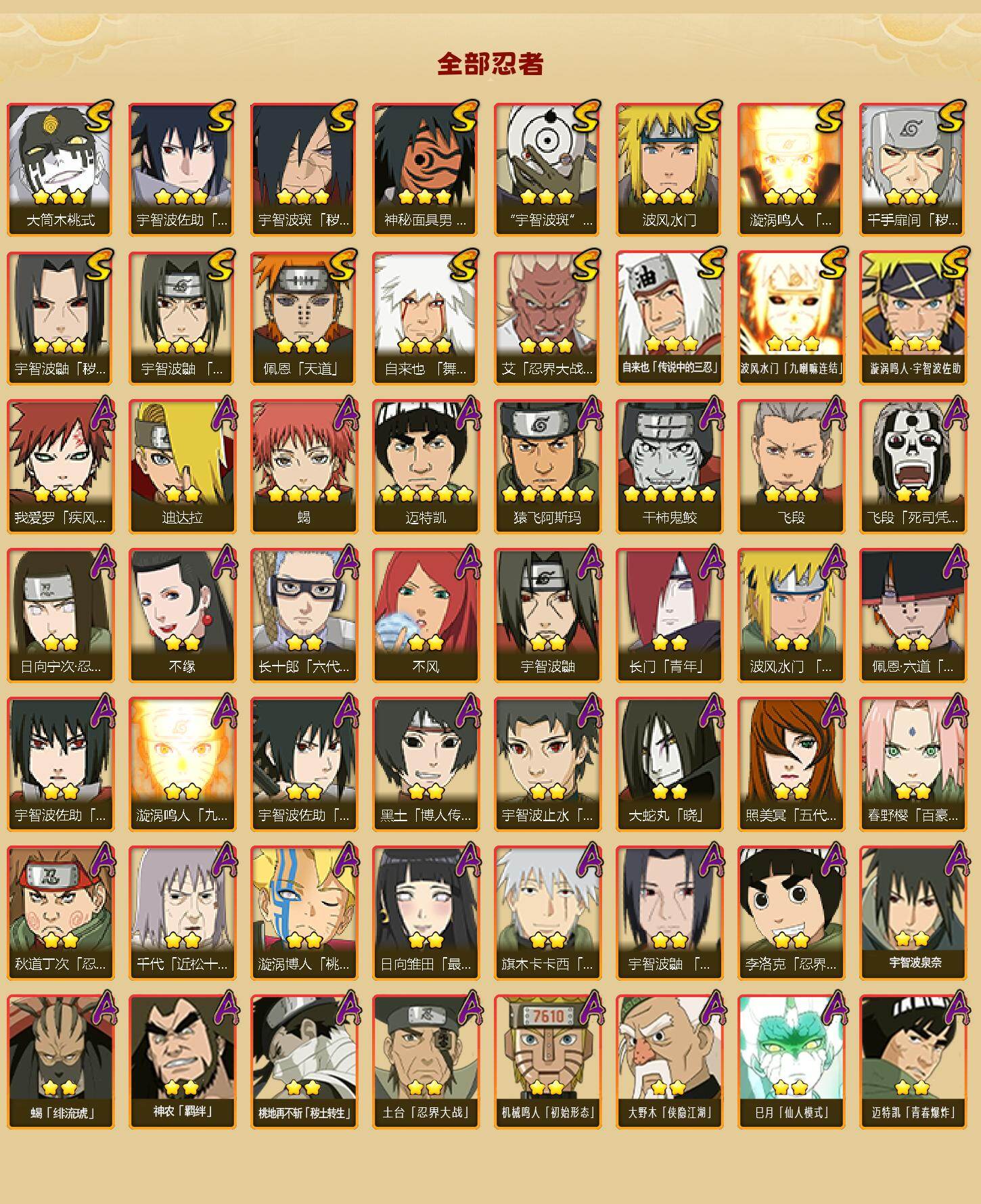 可二次,16s级忍者数-40a级忍者数,熊猫,【s级忍者】:千手扉间「秽土转生」3星,宇智波鼬「秽土转生」3星,宇智波斑「秽土转生·解」3星,艾「忍界大战」3星,宇智波鼬「须佐能乎」3星,自来也「舞之豪杰」3星,自来也「传说中的三忍」3星,波风水门3星,神秘面具男「红夜之刃」3星,漩涡鸣人「九喇嘛连结」3星,佩恩「天道」3星,宇智波佐助「永恒万花筒」3星,宇智波斑 「白面具」3星宇智波斑「白面具」,大筒木桃式3星,波风水门「九喇嘛连结」3星,漩涡鸣人·宇智波佐助3星【a级忍者】:长门「青年」2星,波风水门「青年」2星,迪达拉2星,大蛇丸「晓」2星,飞段3星,飞段「死司凭血」2星,干柿鬼鲛5星,漩涡博人「桃式显现」2星,漩涡鸣人「九尾查克拉」2星,机械鸣人「初始形态」2星,迈特凯5星,旗木卡卡西「幻之真容」2星,桃地再不斩「秽土转生」2星,我爱罗「疾风传」3星,蝎4星,蝎「绯流琥」2星,猿飞阿斯玛5星,宇智波止水「新春限定」2星,宇智波鼬2星,宇智波鼬「夏日限定」2星,宇智波佐助「须佐能乎」2星,宇智波佐助「万花筒写轮眼」2星,照美冥「五代目水影」2星,日向宁次「忍界大战」2星,日向雏田「最终章」2星,长十郎「六代目水影」2星,佩恩·六道「漂泊浪客」2星,李洛克「忍界大战」2星,黑土「博人传」2星,春野樱「百豪」2星,秋道丁次「忍界大战」2星,千代「近松十人卫」2星,神农「羁绊」2星,土台「忍界大战」2星,不缘2星,不风2星,宇智波泉奈2星,大野木「侠隐江湖」2星,巳月「仙人模式」2星,迈特凯「青春爆炸」2星【通灵兽】:忍犬,蓝蛇,蛤蟆吉,猿魔,忍龟,镰鼬,山椒鱼,蜃,蛤蟆仙人,鲛鲨,乌鸦,蛤蟆健,蛤蟆龙,蛤蟆广,蛞蝓,熊猫,砂之守鹤,鹰【角色时装】:漩涡鸣人·宇智波佐助-宿命连结,日向花火「武当宗师」-太极灵韵,春野樱「百豪」-绯樱绽放,佩恩「天道」-百战,天天「峨眉宗师」-熊猫少女,长十郎「六代目水影」-飞瀑流泉,李洛克「截拳宗师」-龙的传人,波风水门-百战,干柿鬼鲛-狂野鲛鲨,自来也「舞之豪杰」-蜀面豪杰,黑土「四代目土影」-烈土霓裳,宇智波鼬「须佐能乎」-百战,干柿鬼鲛-血雾怪人【永久主场景】:博人传,木叶周年庆