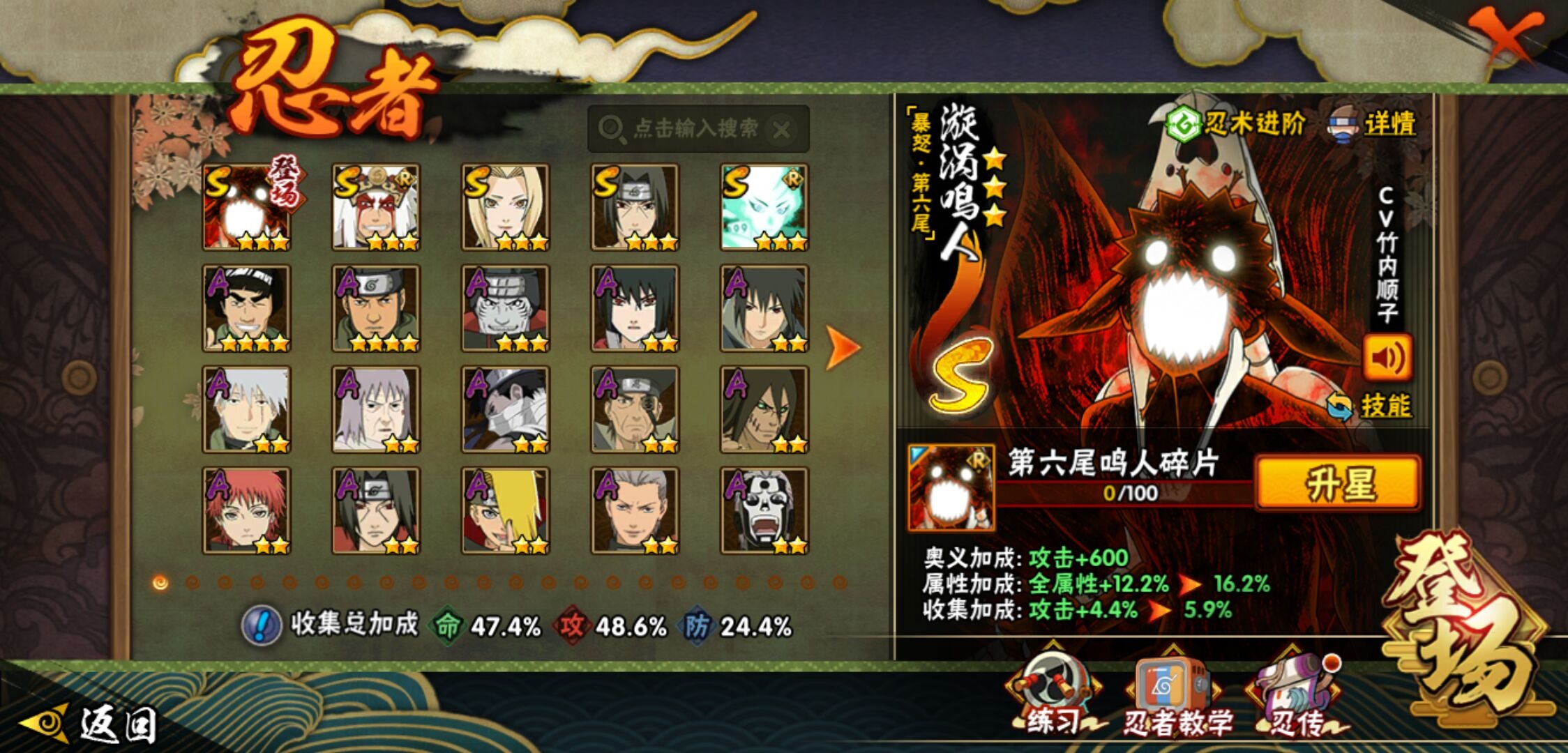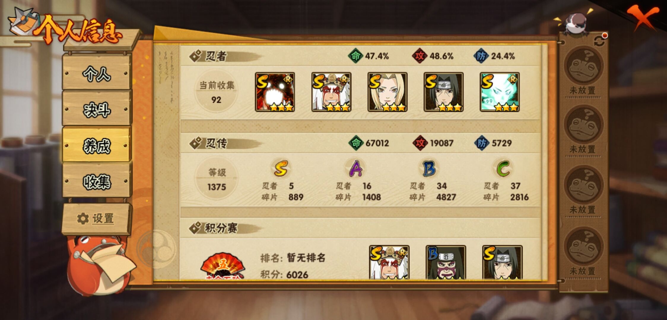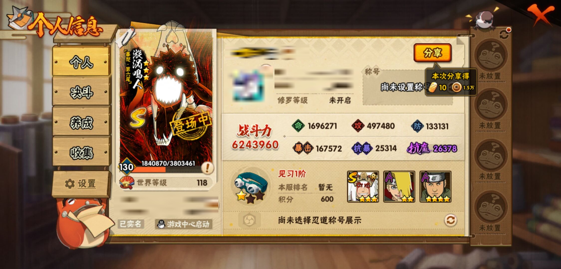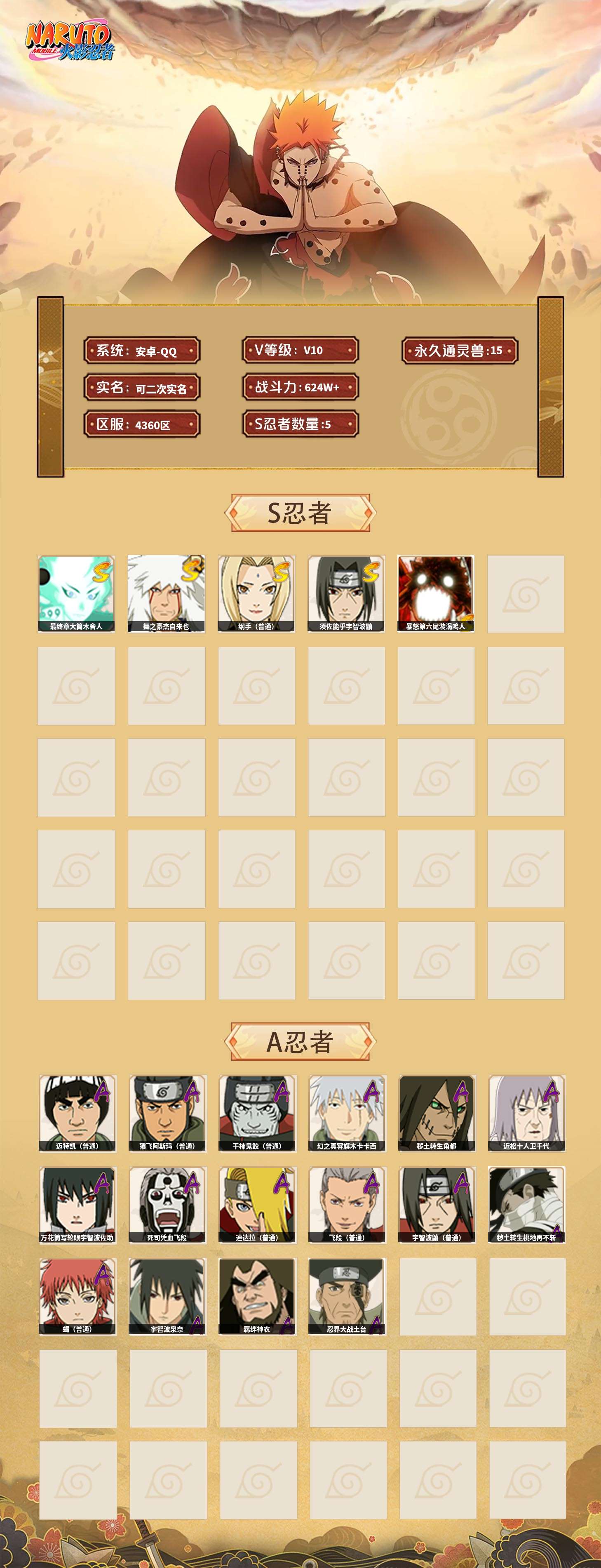 【火影忍者】【lyhy11295】战斗力:624w;段位:见习1阶;本服排名:71;vip:v10级;s忍:5个;a忍:16个;通灵兽:15个,s忍:最终章大筒木舍人|舞之豪杰自来也|纲手(普通)|须佐能乎宇智波鼬|暴怒第六尾漩涡鸣人__a忍:幻之真容旗木卡卡西|秽土转生角都|近松十人卫千代|万花筒写轮眼宇智波佐助|死司凭血飞段|迪达拉(普通)|飞段(普通)|迈特凯(普通) 4星|宇智波鼬(普通)|干柿鬼鲛(普通) 3星|秽土转生桃地再不斩|蝎(普通)|猿飞阿斯玛(普通) 4星|宇智波泉奈|羁绊神农|忍界大战土台__通灵兽:忍犬(普通)|蓝蛇|蛤蟆吉|忍龟|镰鼬|砂之守鹤|猿魔|山椒鱼|蛞蝓(普通)|蜃|蛤蟆仙人|鲛鲨|蛤蟆健|乌鸦(普通)|蛤蟆龙