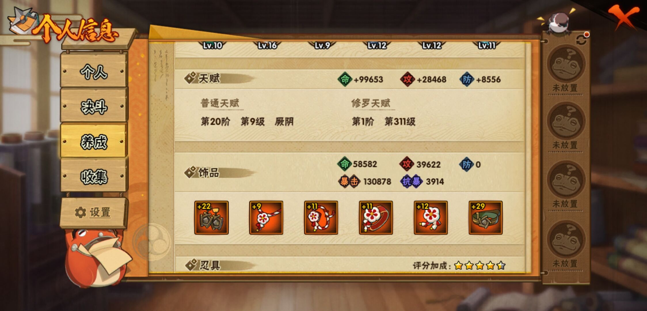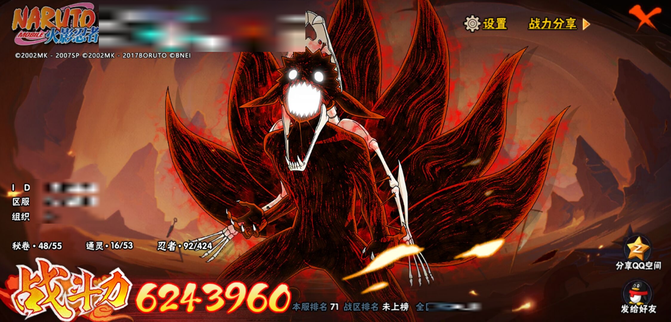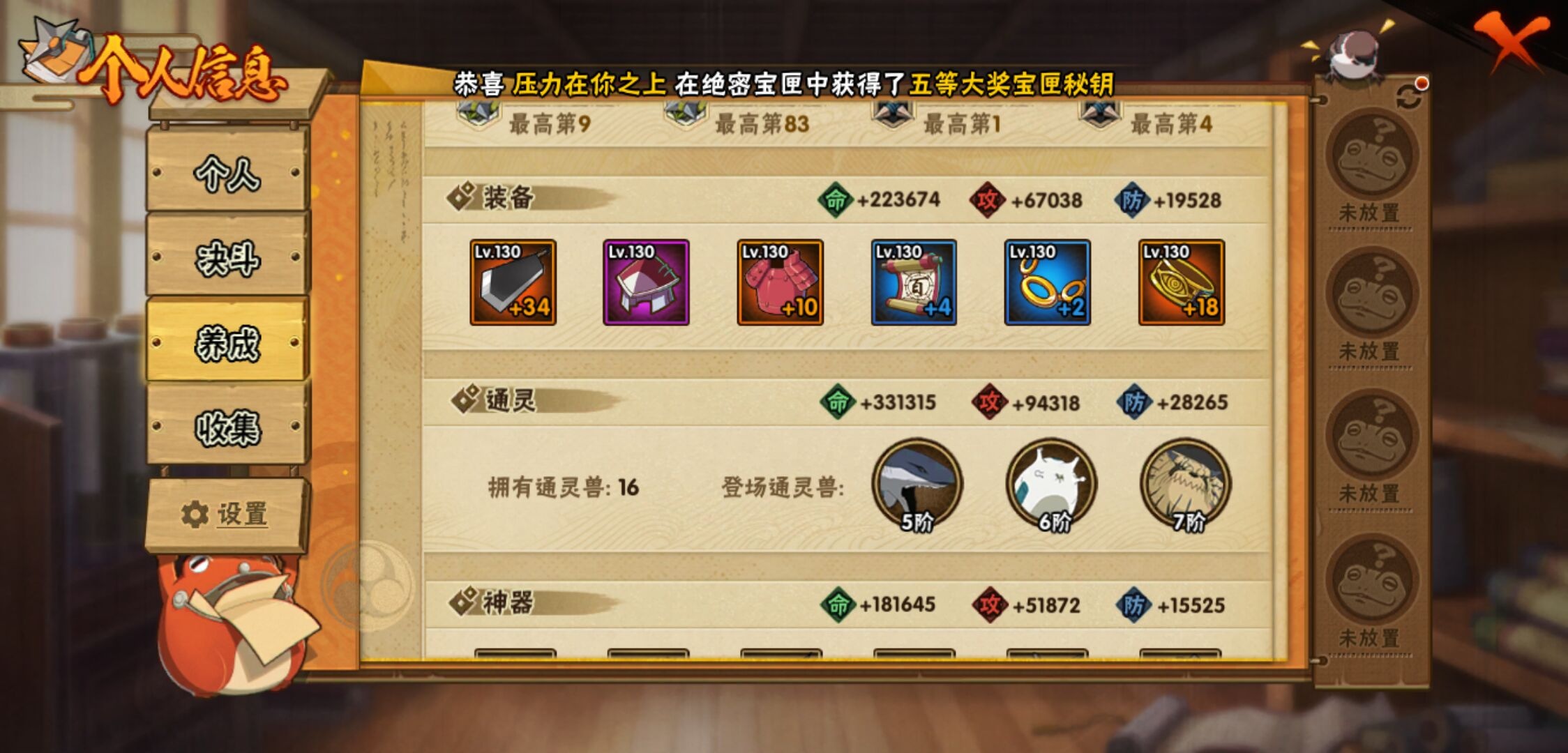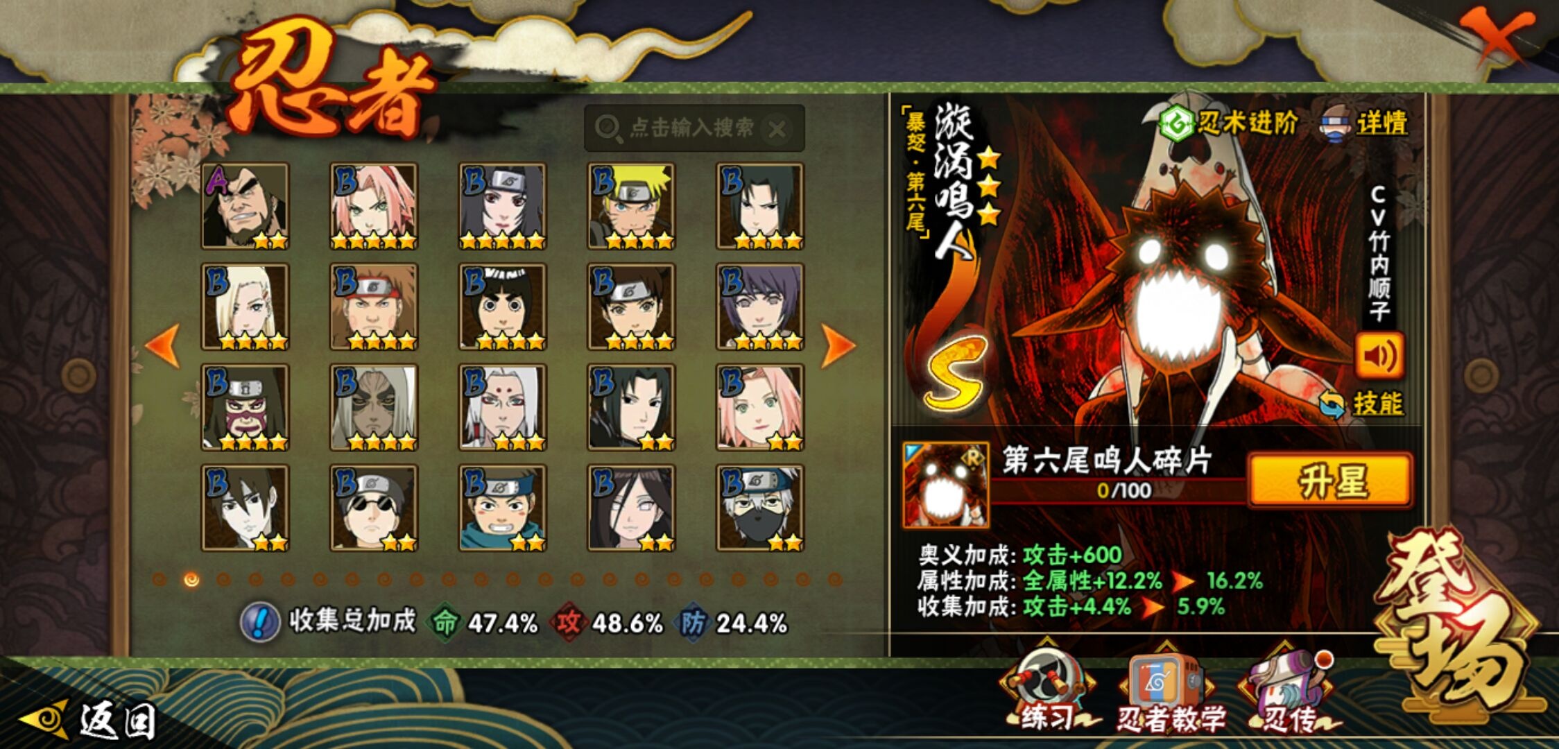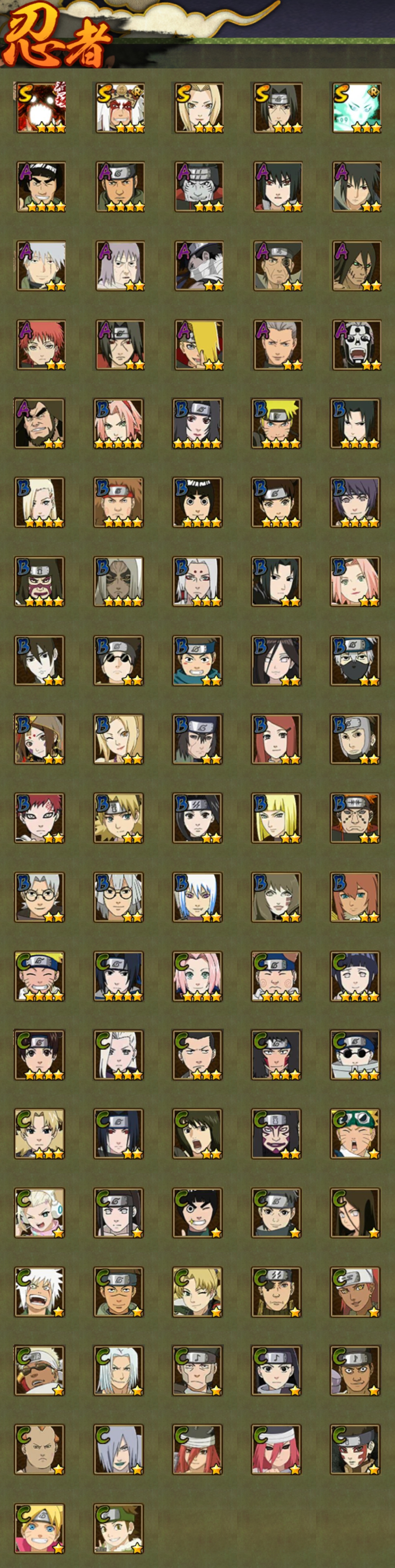【火影忍者】【lyhy11295】战斗力:624w;段位:见习1阶;本服排名:71;vip:v10级;s忍:5个;a忍:16个;通灵兽:15个,s忍:最终章大筒木舍人|舞之豪杰自来也|纲手(普通)|须佐能乎宇智波鼬|暴怒第六尾漩涡鸣人__a忍:幻之真容旗木卡卡西|秽土转生角都|近松十人卫千代|万花筒写轮眼宇智波佐助|死司凭血飞段|迪达拉(普通)|飞段(普通)|迈特凯(普通) 4星|宇智波鼬(普通)|干柿鬼鲛(普通) 3星|秽土转生桃地再不斩|蝎(普通)|猿飞阿斯玛(普通) 4星|宇智波泉奈|羁绊神农|忍界大战土台__通灵兽:忍犬(普通)|蓝蛇|蛤蟆吉|忍龟|镰鼬|砂之守鹤|猿魔|山椒鱼|蛞蝓(普通)|蜃|蛤蟆仙人|鲛鲨|蛤蟆健|乌鸦(普通)|蛤蟆龙