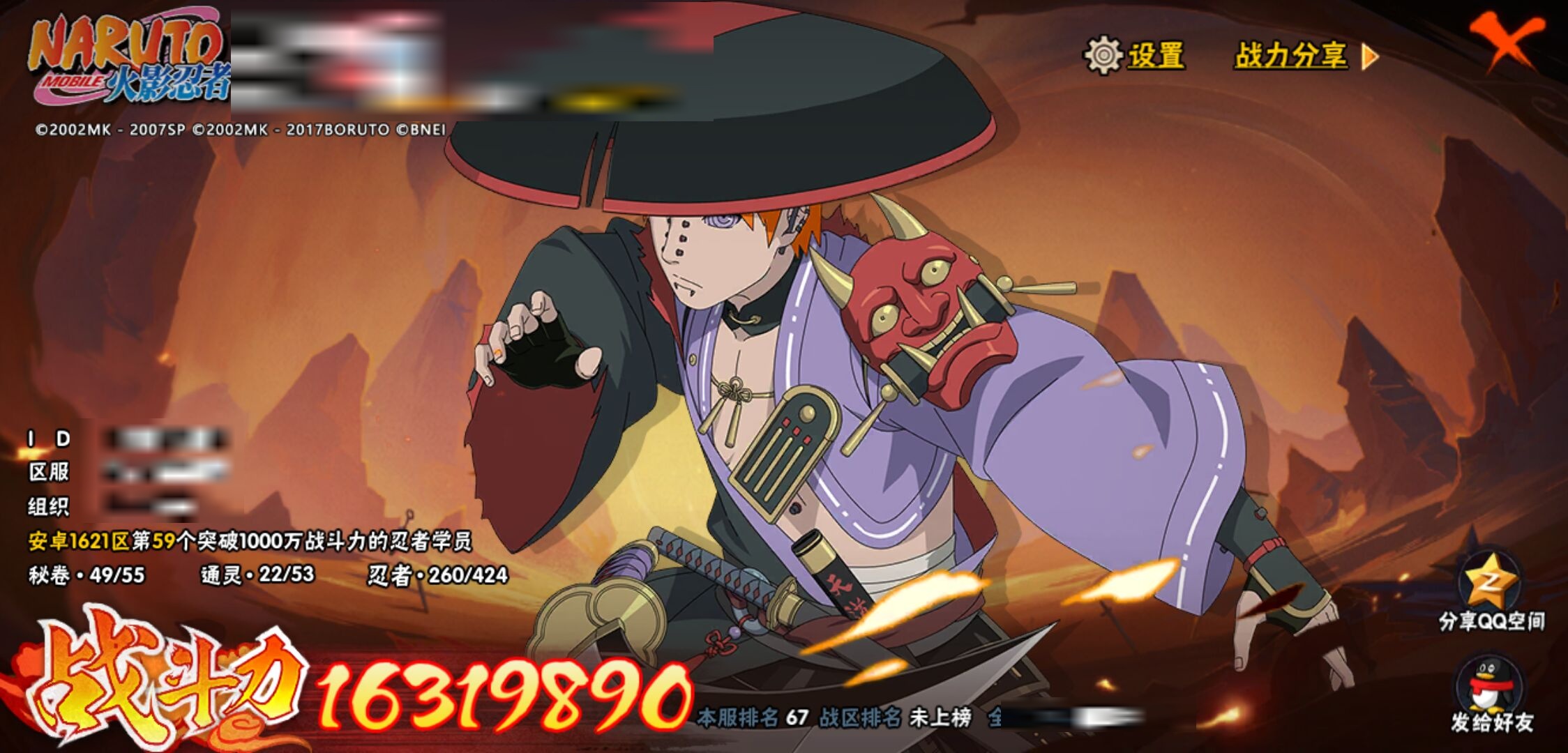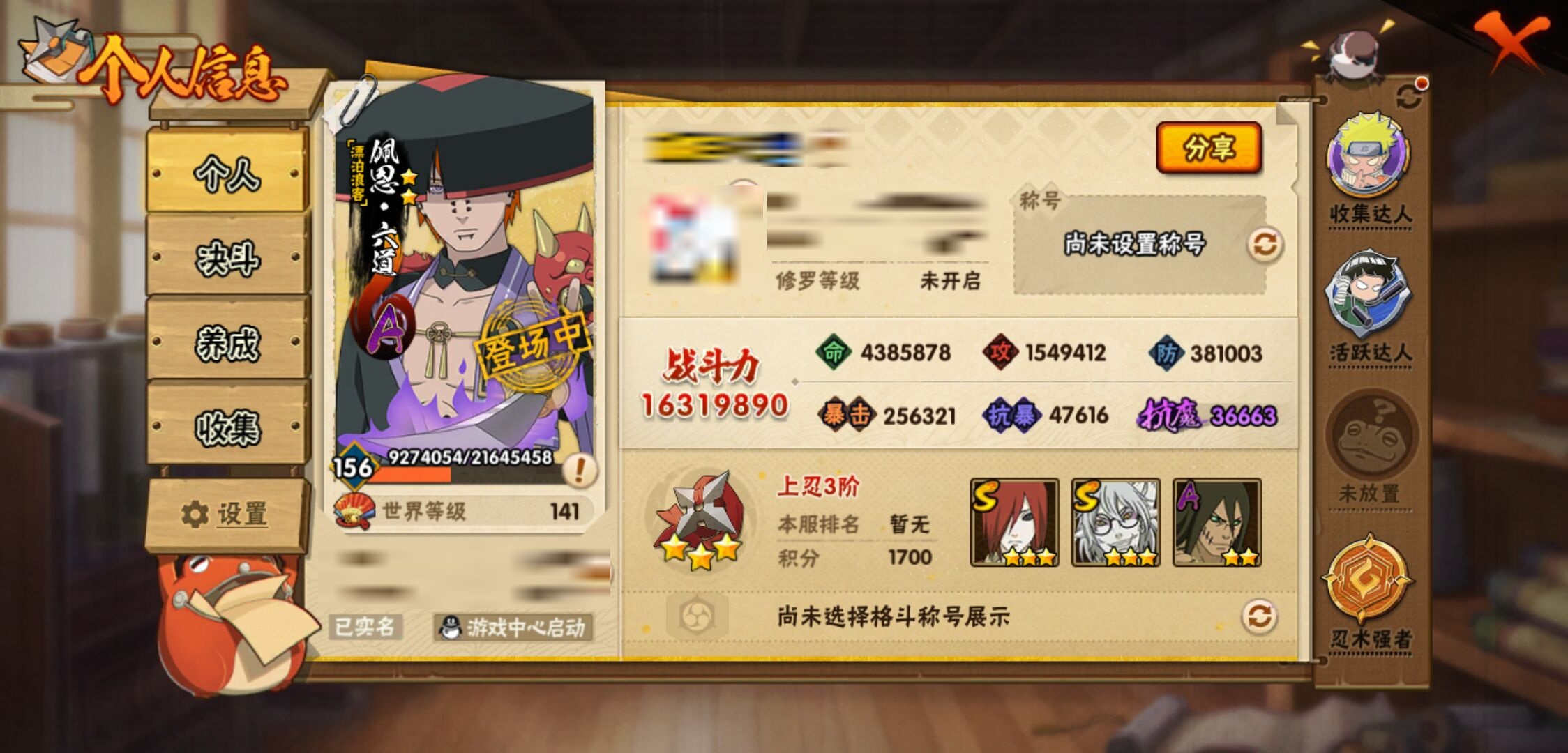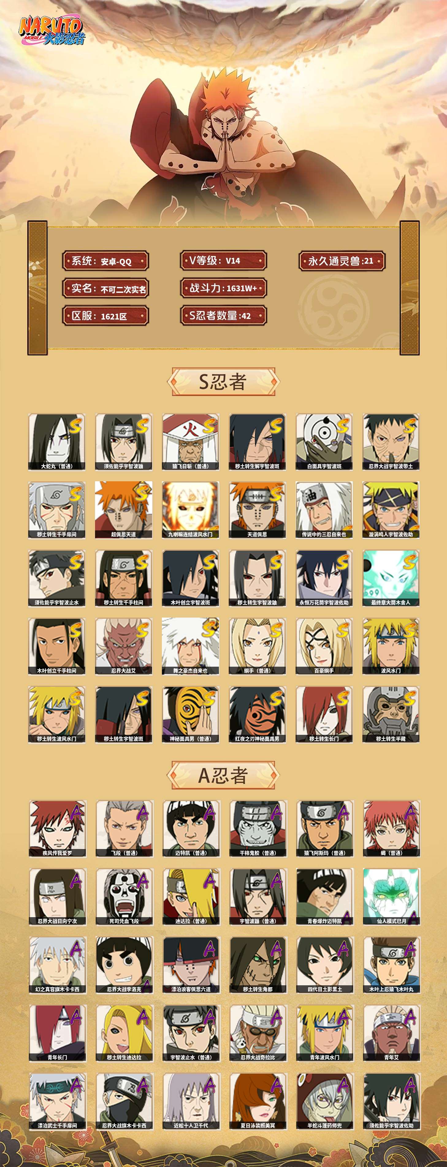 【火影忍者】【lyhy11305】战斗力:1631w;段位:上忍3阶;本服排名:67;vip:v14级;s忍:42个;a忍:52个;通灵兽:21个,s忍:秽土转生解宇智波斑|白面具宇智波斑|忍界大战宇智波带土|秽土转生千手扉间|超佩恩天道|九喇嘛连结波风水门|天道佩恩|传说中的三忍自来也|漩涡鸣人宇智波佐助|须佐能乎宇智波止水|秽土转生千手柱间|木叶创立宇智波斑|秽土转生宇智波鼬|永恒万花筒宇智波佐助|最终章大筒木舍人|木叶创立千手柱间|忍界大战艾|舞之豪杰自来也|大蛇丸(普通) 4星|纲手(普通)|百豪纲手|波风水门|秽土转生波风水门|秽土转生宇智波斑|须佐能乎宇智波鼬 4星|神秘面具男(普通)|红夜之刃神秘面具男|秽土转生长门|秽土转生半藏|二代目水影鬼灯幻月|三代目雷影艾|四代目雷影艾|仙人模式药师兜|死门迈特凯|忍界大战大野木|忍界大战春野樱|九喇嘛连结漩涡鸣人|博人传大筒木金式|大筒木桃式|猿飞日斩(普通) 4星|秽土转生猿飞日斩|自来也(普通)__a忍:青春爆炸迈特凯|仙人模式巳月|幻之真容旗木卡卡西|忍界大战李洛克|漂泊浪客佩恩六道|秽土转生角都|忍界大战日向宁次 3星|四代目土影黑土|木叶上忍猿飞木叶丸|青年长门|秽土转生迪达拉|宇智波止水(普通)|忍界大战奇拉比|青年波风水门|青年艾|漂泊武士千手扉间|忍界大战旗木卡卡西|近松十人卫千代|夏日泳装照美冥|半蛇斗篷药师兜|须佐能乎宇智波佐助|九尾查克拉漩涡鸣人|晓大蛇丸|百豪春野樱|忍界大战秋道丁次|忍界大战我爱罗|新春限定波风水门|万花筒写轮眼宇智波佐助|五代目水影照美冥|五代目雷影达鲁伊|死司凭血飞段 3星|疾风传我爱罗 5星|迪达拉(普通) 3星|飞段(普通) 5星|小南(普通)|仙人模式漩涡鸣人|旗木卡卡西(普通)|迈特凯(普通) 5星|宇智波鼬(普通) 3星|夏日限定宇智波鼬|干柿鬼鲛(普通) 5星|秽土转生桃地再不斩|蝎(普通) 4星|绯流琥蝎|猿飞阿斯玛(普通) 5星|桃式显现漩涡博人|六代目水影长十郎|不缘|新春限定大蛇丸|宇智波泉奈|忍界大战土台|侠隐江湖大野木__通灵兽:忍犬(普通)|蓝蛇|蛤蟆吉|忍龟|镰鼬|猿魔|山椒鱼|蜃|蛞蝓(普通)|蛤蟆仙人|鲛鲨|蛤蟆健|乌鸦(普通)|砂之守鹤|蛤蟆龙|蛤蟆广|梦貘|鹰|熊猫|万蛇|蜘蛛