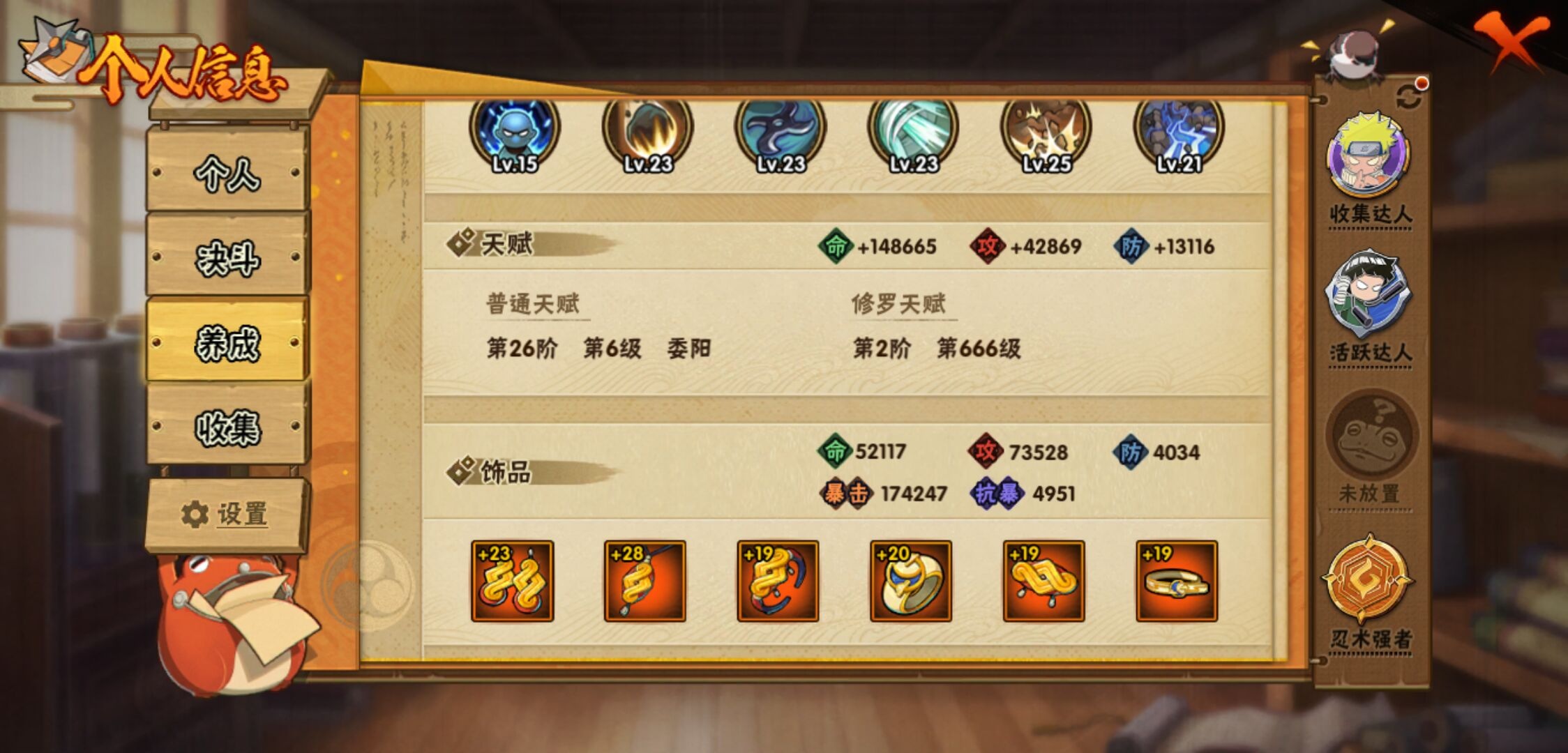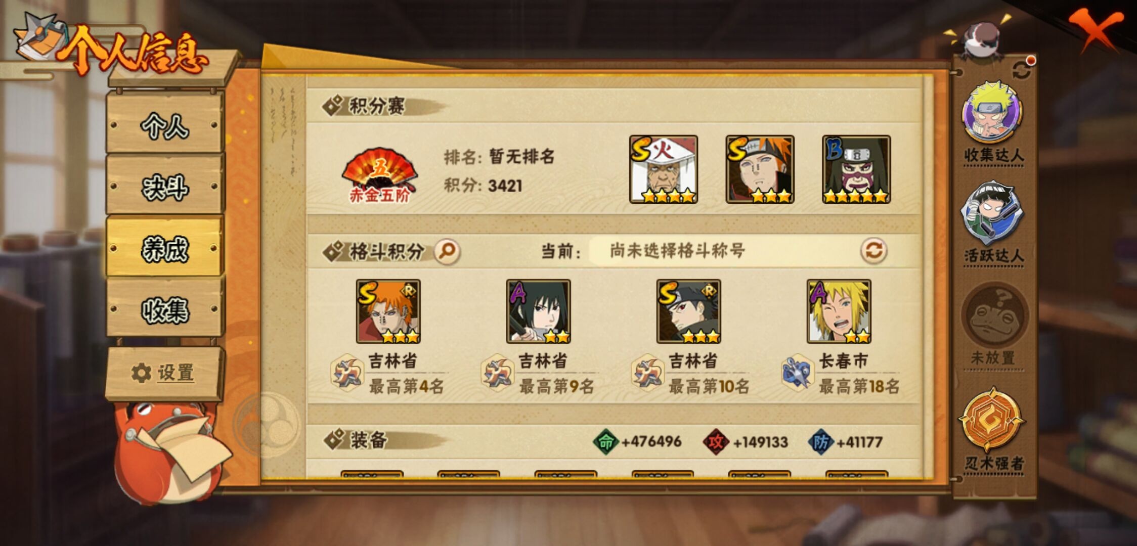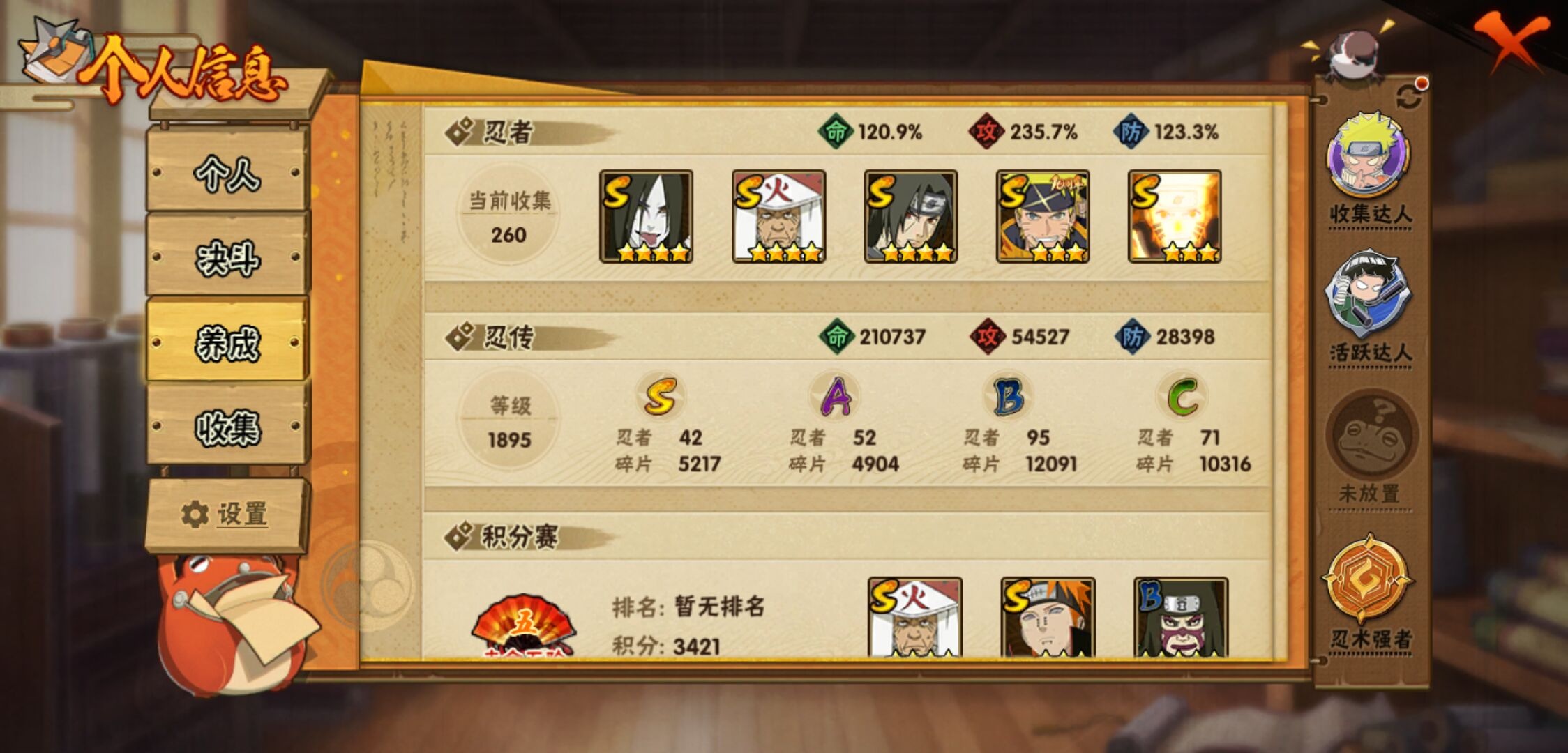 【火影忍者】【lyhy11305】战斗力:1631w;段位:上忍3阶;本服排名:67;vip:v14级;s忍:42个;a忍:52个;通灵兽:21个,s忍:秽土转生解宇智波斑|白面具宇智波斑|忍界大战宇智波带土|秽土转生千手扉间|超佩恩天道|九喇嘛连结波风水门|天道佩恩|传说中的三忍自来也|漩涡鸣人宇智波佐助|须佐能乎宇智波止水|秽土转生千手柱间|木叶创立宇智波斑|秽土转生宇智波鼬|永恒万花筒宇智波佐助|最终章大筒木舍人|木叶创立千手柱间|忍界大战艾|舞之豪杰自来也|大蛇丸(普通) 4星|纲手(普通)|百豪纲手|波风水门|秽土转生波风水门|秽土转生宇智波斑|须佐能乎宇智波鼬 4星|神秘面具男(普通)|红夜之刃神秘面具男|秽土转生长门|秽土转生半藏|二代目水影鬼灯幻月|三代目雷影艾|四代目雷影艾|仙人模式药师兜|死门迈特凯|忍界大战大野木|忍界大战春野樱|九喇嘛连结漩涡鸣人|博人传大筒木金式|大筒木桃式|猿飞日斩(普通) 4星|秽土转生猿飞日斩|自来也(普通)__a忍:青春爆炸迈特凯|仙人模式巳月|幻之真容旗木卡卡西|忍界大战李洛克|漂泊浪客佩恩六道|秽土转生角都|忍界大战日向宁次 3星|四代目土影黑土|木叶上忍猿飞木叶丸|青年长门|秽土转生迪达拉|宇智波止水(普通)|忍界大战奇拉比|青年波风水门|青年艾|漂泊武士千手扉间|忍界大战旗木卡卡西|近松十人卫千代|夏日泳装照美冥|半蛇斗篷药师兜|须佐能乎宇智波佐助|九尾查克拉漩涡鸣人|晓大蛇丸|百豪春野樱|忍界大战秋道丁次|忍界大战我爱罗|新春限定波风水门|万花筒写轮眼宇智波佐助|五代目水影照美冥|五代目雷影达鲁伊|死司凭血飞段 3星|疾风传我爱罗 5星|迪达拉(普通) 3星|飞段(普通) 5星|小南(普通)|仙人模式漩涡鸣人|旗木卡卡西(普通)|迈特凯(普通) 5星|宇智波鼬(普通) 3星|夏日限定宇智波鼬|干柿鬼鲛(普通) 5星|秽土转生桃地再不斩|蝎(普通) 4星|绯流琥蝎|猿飞阿斯玛(普通) 5星|桃式显现漩涡博人|六代目水影长十郎|不缘|新春限定大蛇丸|宇智波泉奈|忍界大战土台|侠隐江湖大野木__通灵兽:忍犬(普通)|蓝蛇|蛤蟆吉|忍龟|镰鼬|猿魔|山椒鱼|蜃|蛞蝓(普通)|蛤蟆仙人|鲛鲨|蛤蟆健|乌鸦(普通)|砂之守鹤|蛤蟆龙|蛤蟆广|梦貘|鹰|熊猫|万蛇|蜘蛛