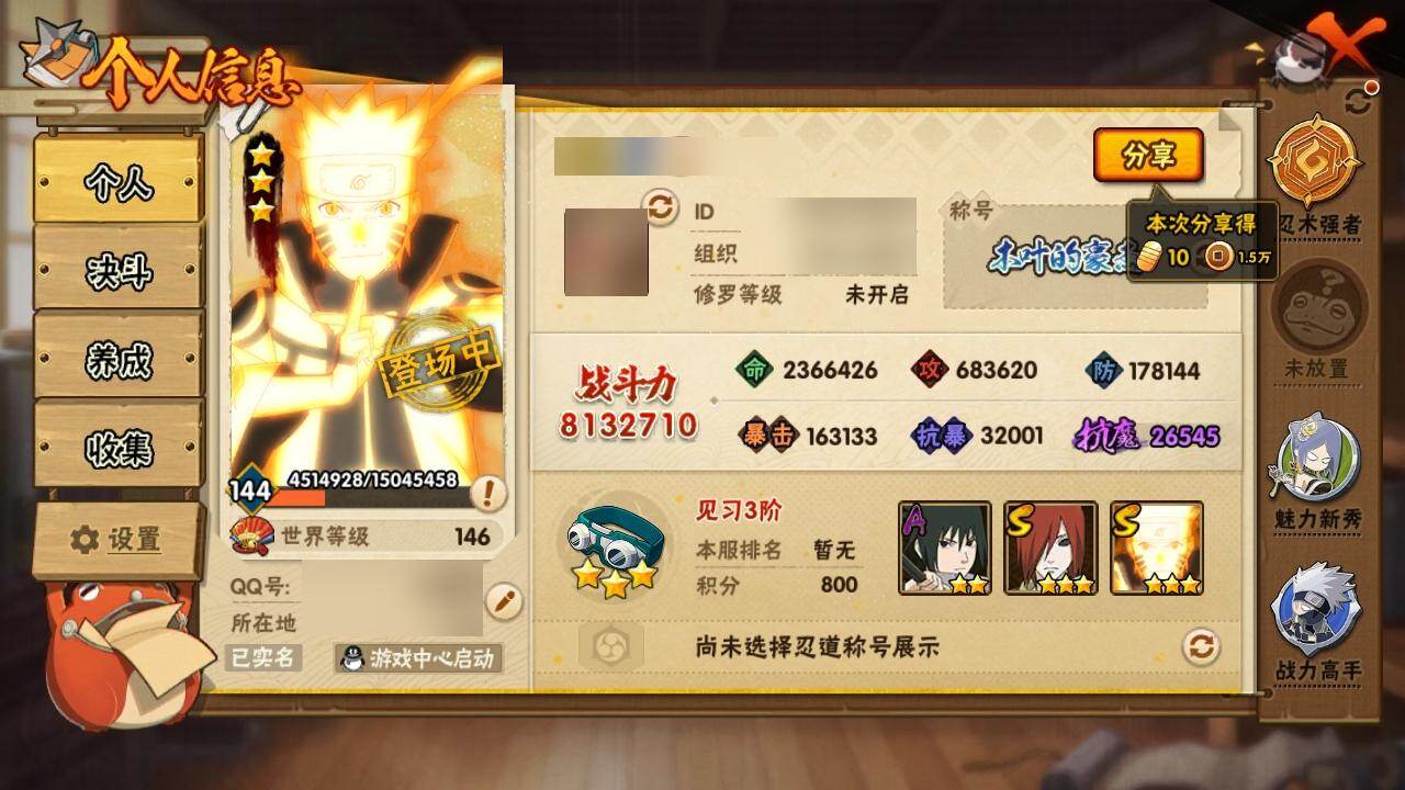 v9/战力813w/s忍12/a忍32 3星宇智波佐助「永恒万花筒」3星宇智波斑「秽土转生·解」3星宇智波斑「白面具」3星波风水门3星漩涡鸣人「九喇嘛连结」3星宇智波斑「秽土转生」3星波风水门「秽土转生」3星宇智波斑3星猿飞日斩「秽土转生」3星长门「秽土转生」3星自来也「舞之豪杰」3星大蛇丸3星我爱罗「疾风传」2星迪达拉3星蝎5星迈特凯4星猿飞阿斯玛4星干柿鬼鲛2星宇智波止水2星小南2星角都「地怨虞」3星飞段2星飞段「死司凭血」2星志村团藏2星日向宁次「忍界大战」2星不缘2星长十郎「六代目水影」2星宇智波鼬2星长门「青年」2星艾「青年」2星波风水门「青年」2星佩恩·六道「漂泊浪客」2星奇拉比2星宇智波佐助「须佐能乎」2星照美冥「夏日泳装」2星角都「晓创生」2星大蛇丸「晓」2星照美冥「五代目水影」2星春野樱「百豪」2星秋道丁次「忍界大战」2星千代「近松十人卫」2星我爱罗「忍界大战」2星药师兜「半蛇斗篷」