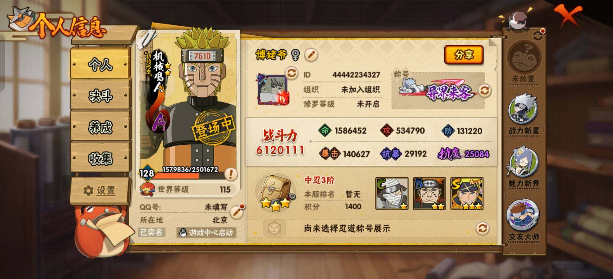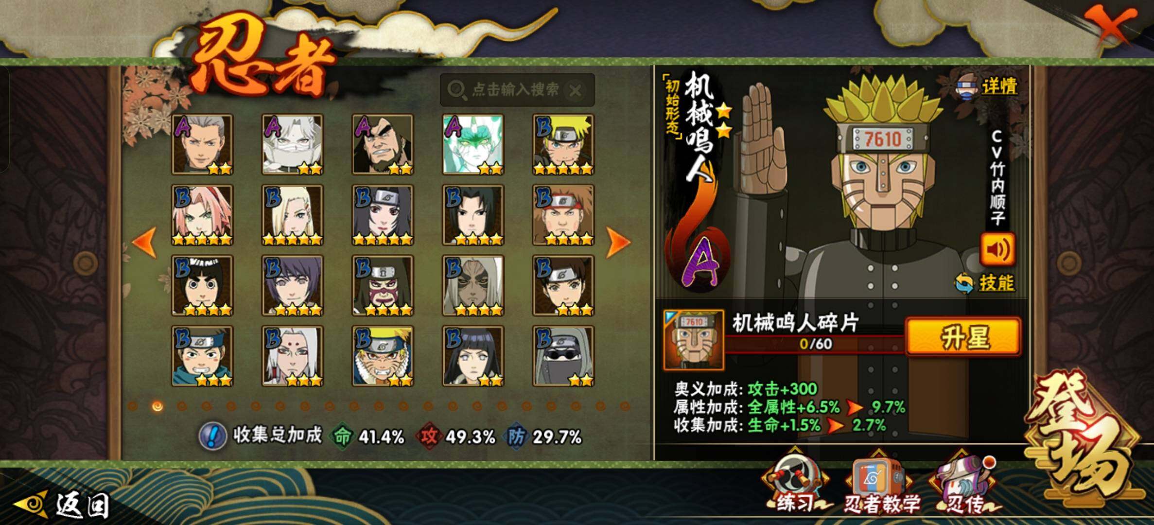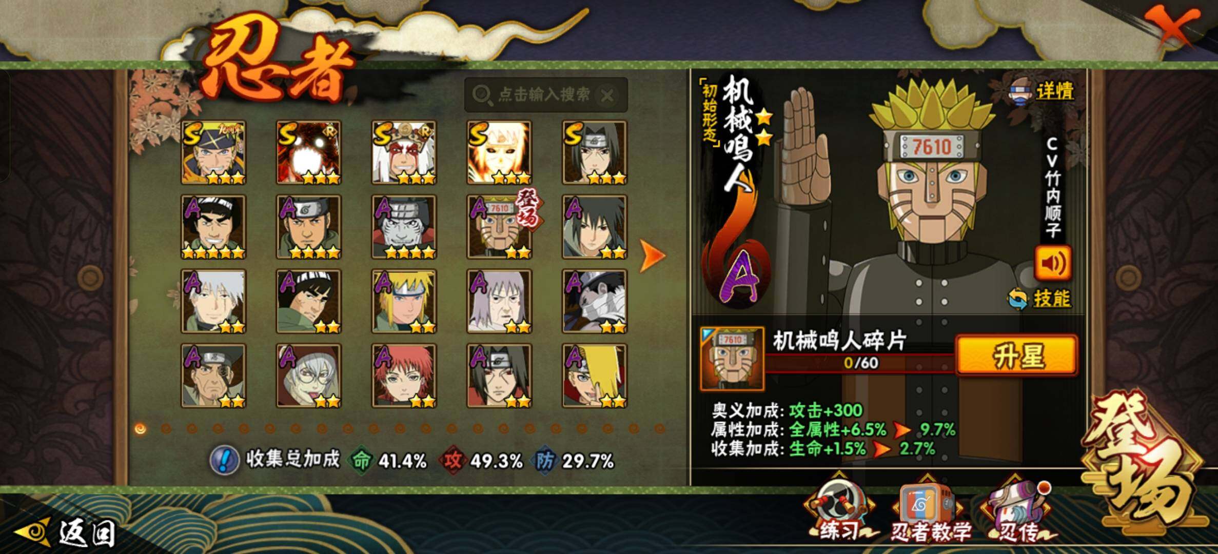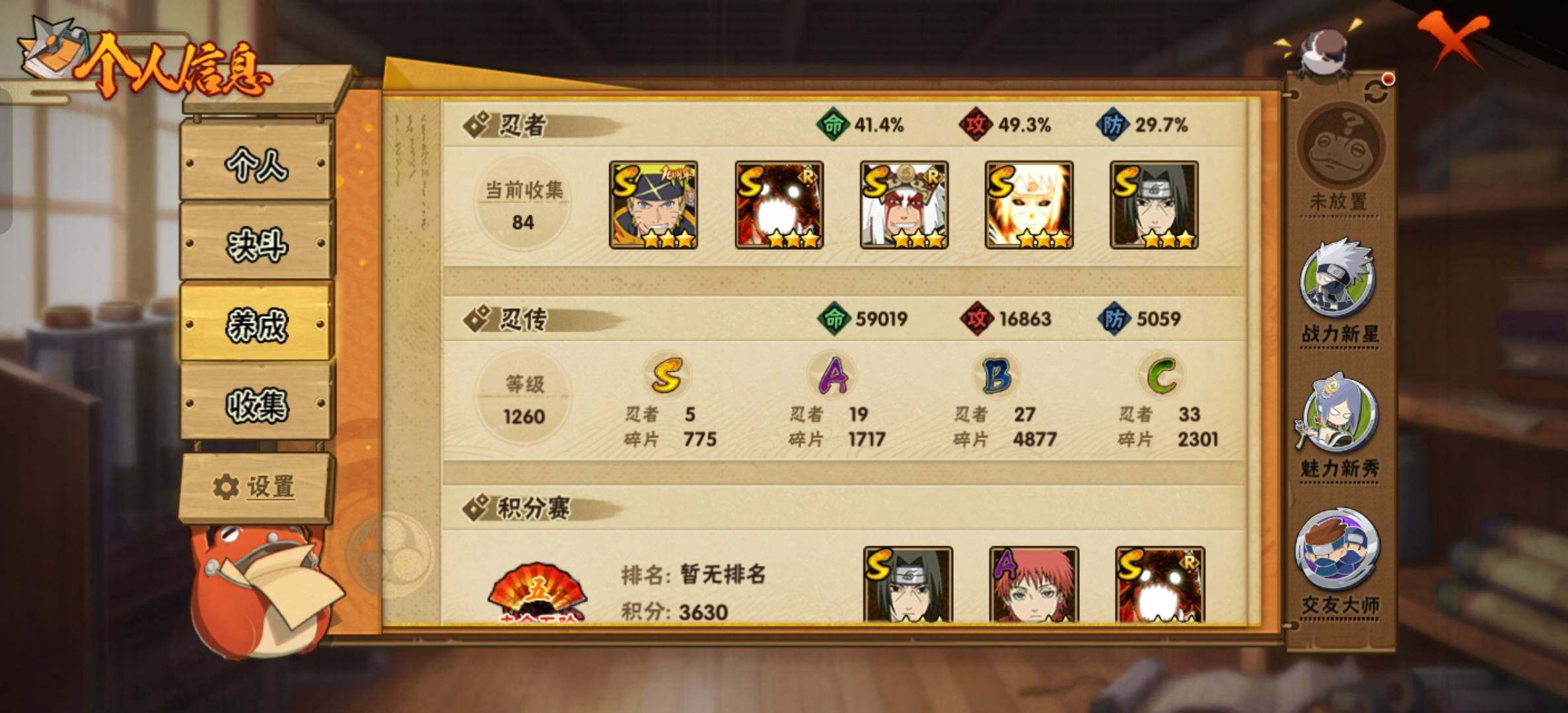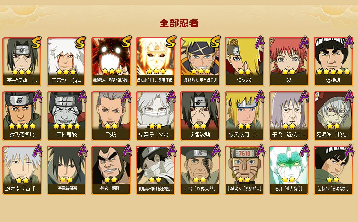 5s级忍者数-19a级忍者数 【s级忍者】:宇智波鼬「须佐能乎」3星,自来也「舞之豪杰」3星,漩涡鸣人「暴怒·第六尾」3星,波风水门「九喇嘛连结」3星,漩涡鸣人·宇智波佐助3星 【a级忍者】:波风水门「青年」2星,迪达拉2星,飞段2星,干柿鬼鲛4星,机械鸣人「初始形态」2星,迈特凯5星,旗木卡卡西「幻之真容」2星,桃地再不斩「秽土转生」2星,蝎2星,猿飞阿斯玛4星,宇智波鼬2星,药师兜「半蛇斗篷」2星,卑留呼「火之意志继承者」2星,千代「近松十人卫」2星,神农「羁绊」2星,土台「忍界大战」2星,宇智波泉奈2星,巳月「仙人模式」2星,迈特凯「青春爆炸」2星